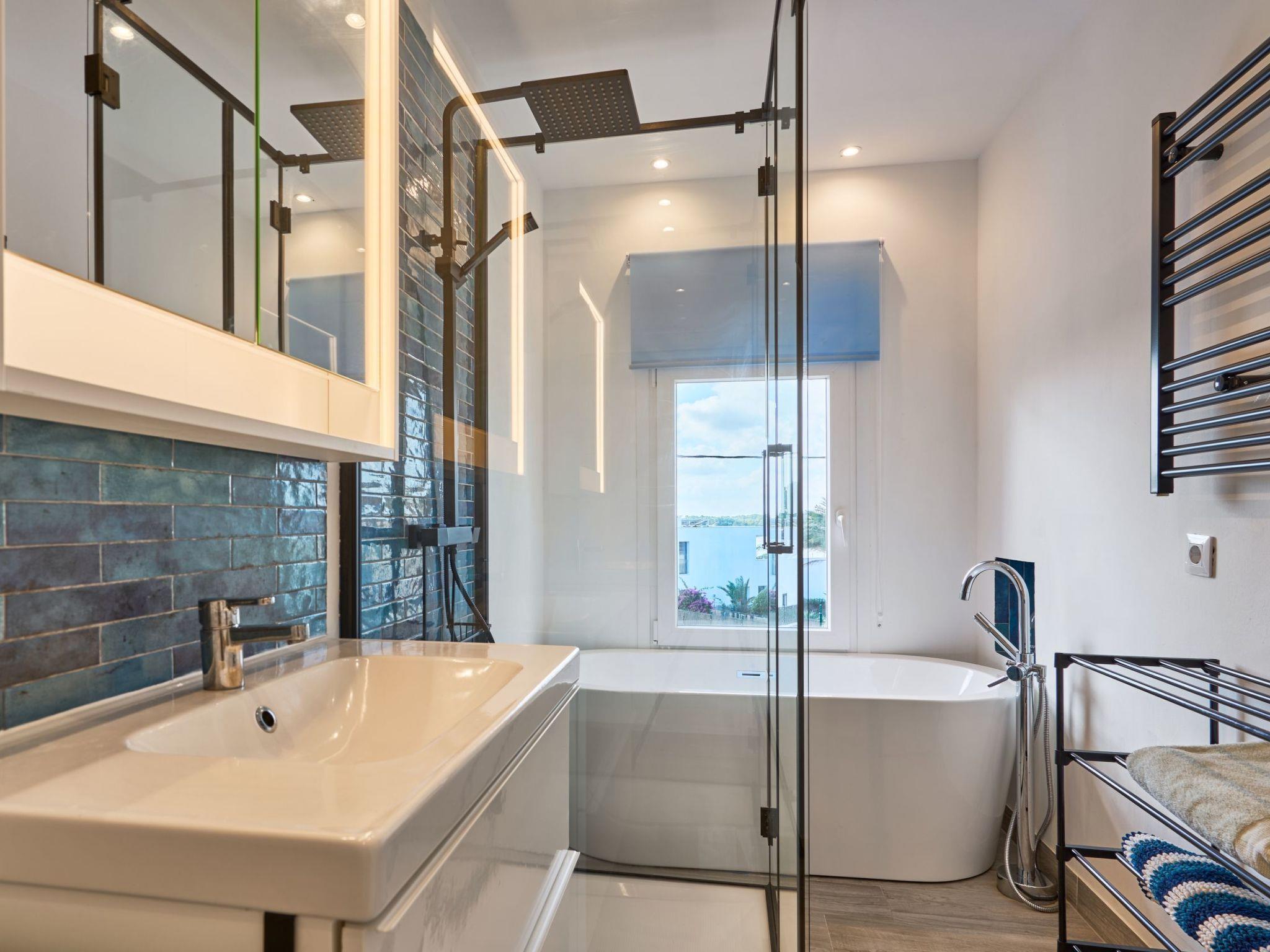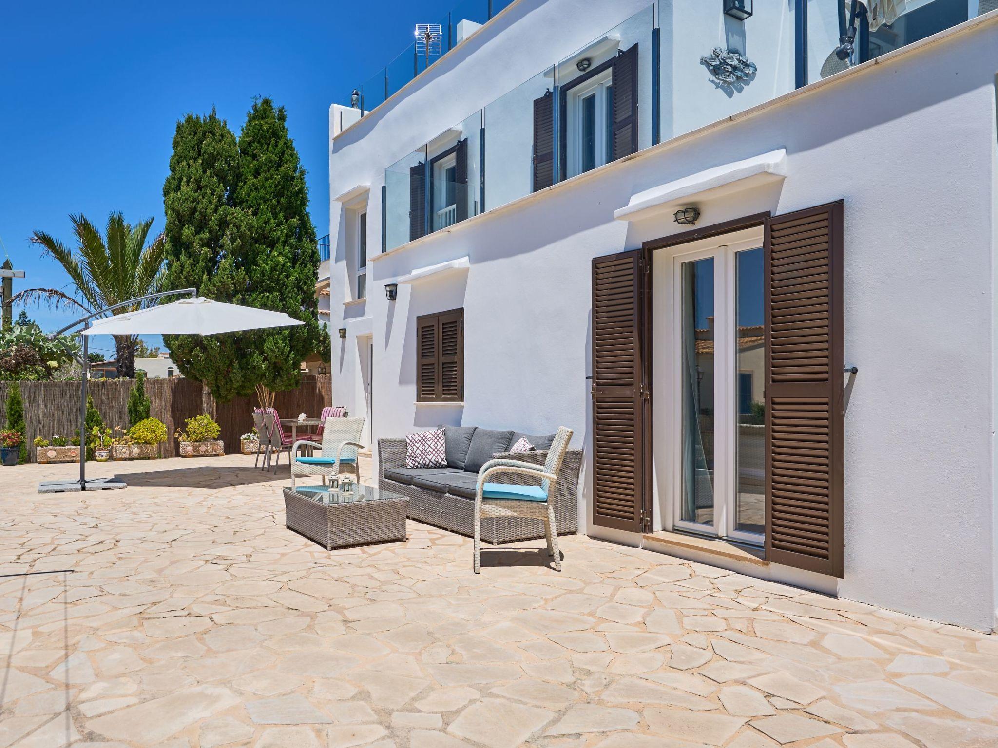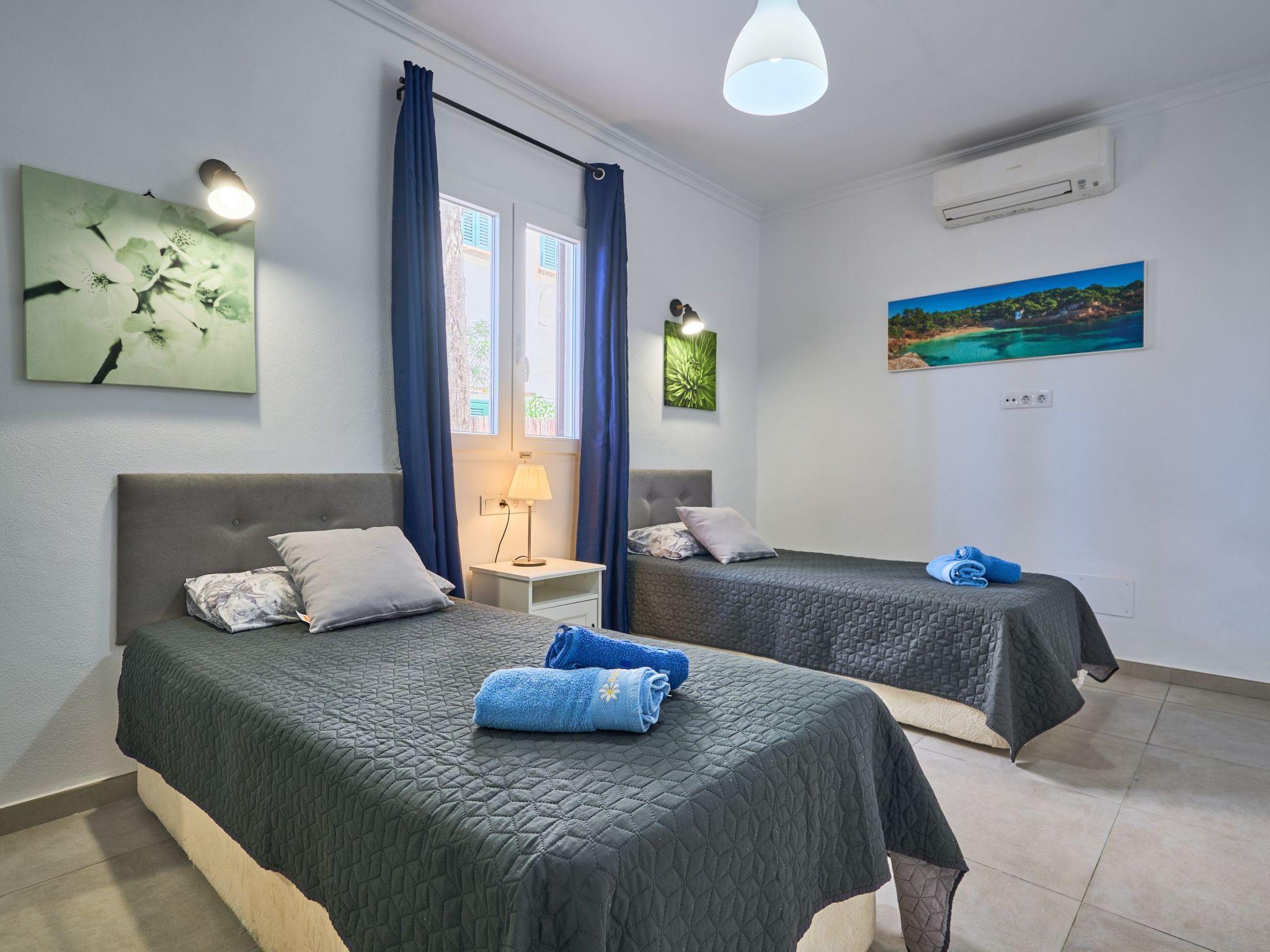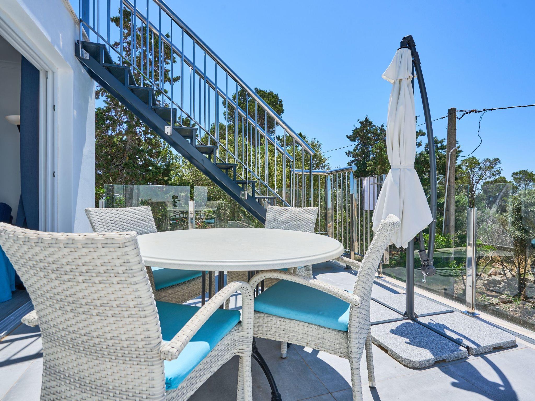 An external staircase leads to the upper floor, where there is a living room with access to a small terrace that offers sweeping views of the harbour of Porto Petro. There are three further bedrooms on this floor. One with two single beds and one with a double bed. Adjacent to these bedrooms is a bathroom with a bathtub and separate shower. The last bedroom has a double bed, a living room, a bathroom with shower and access to a small terrace.