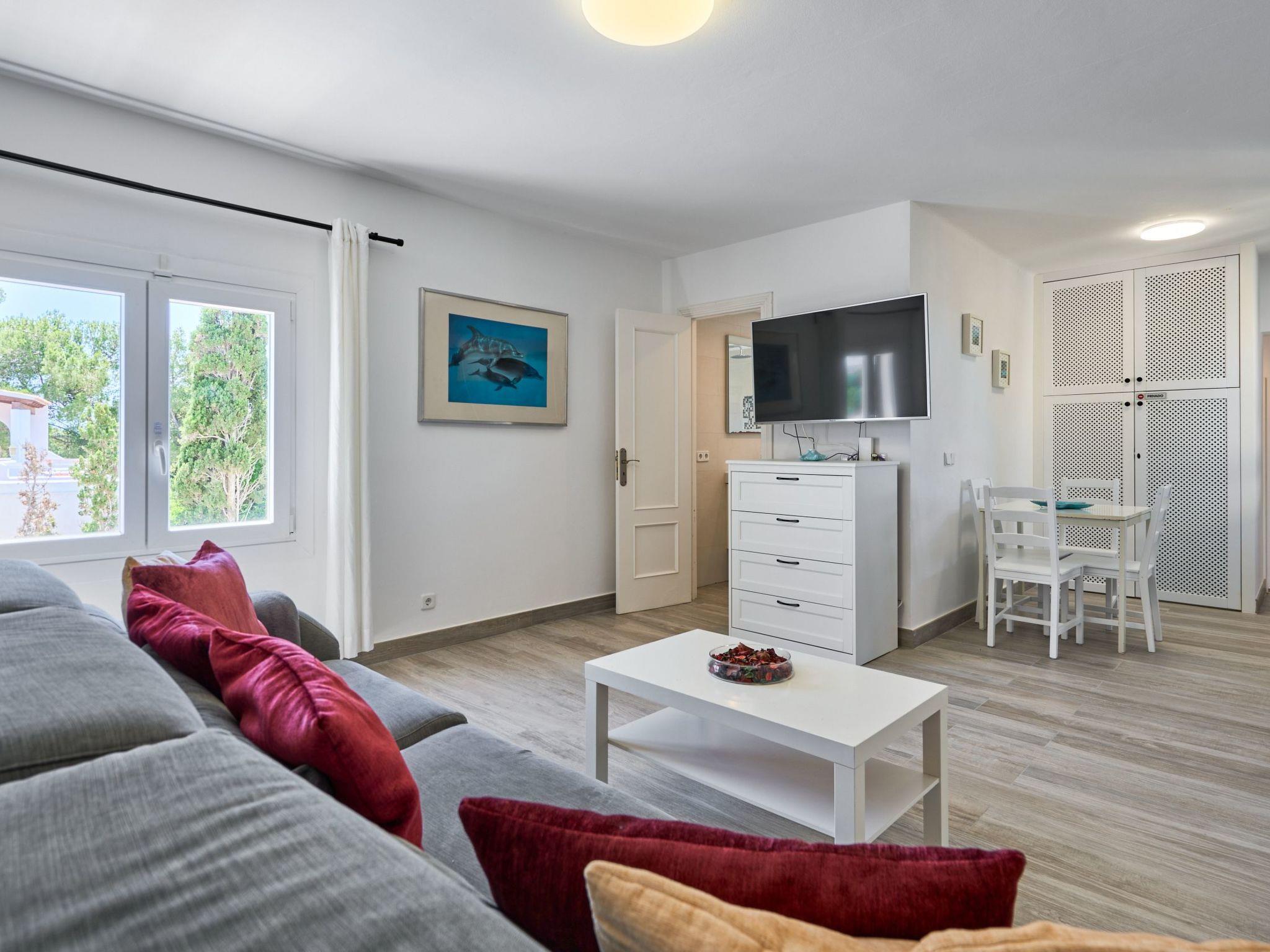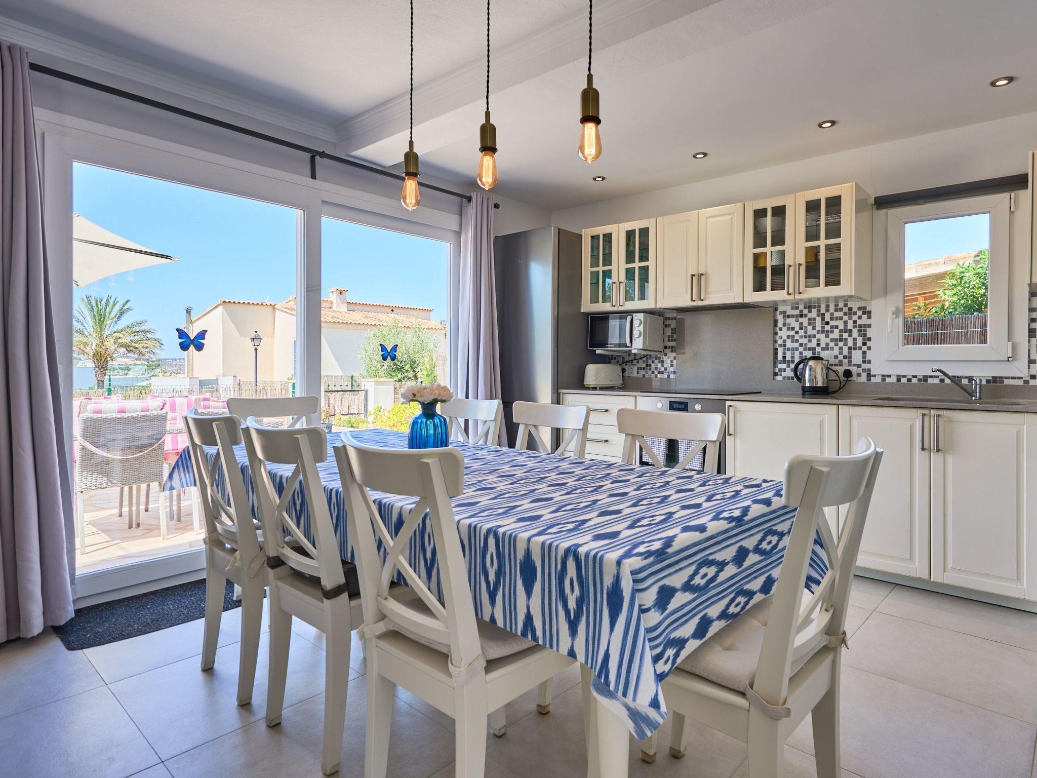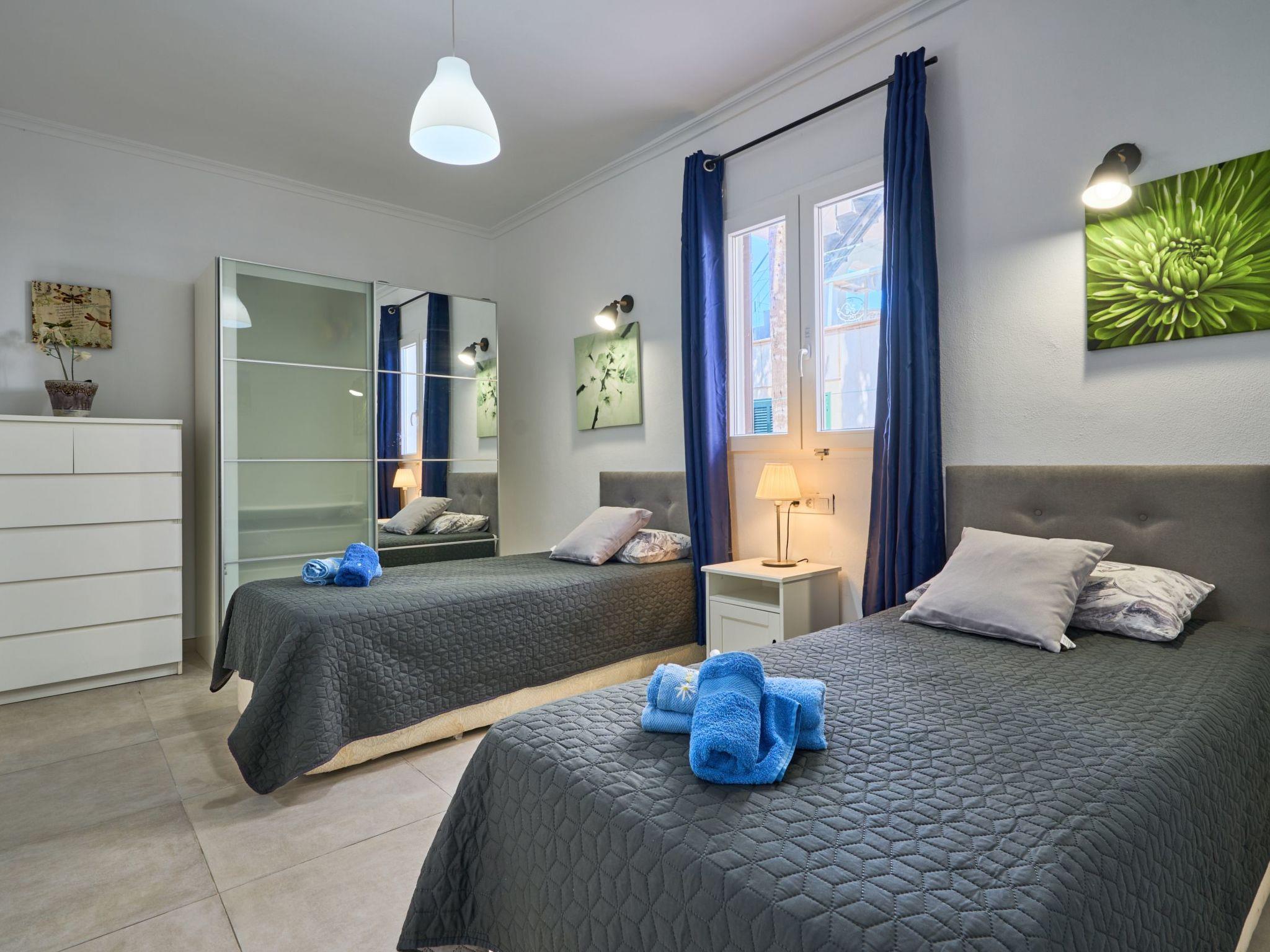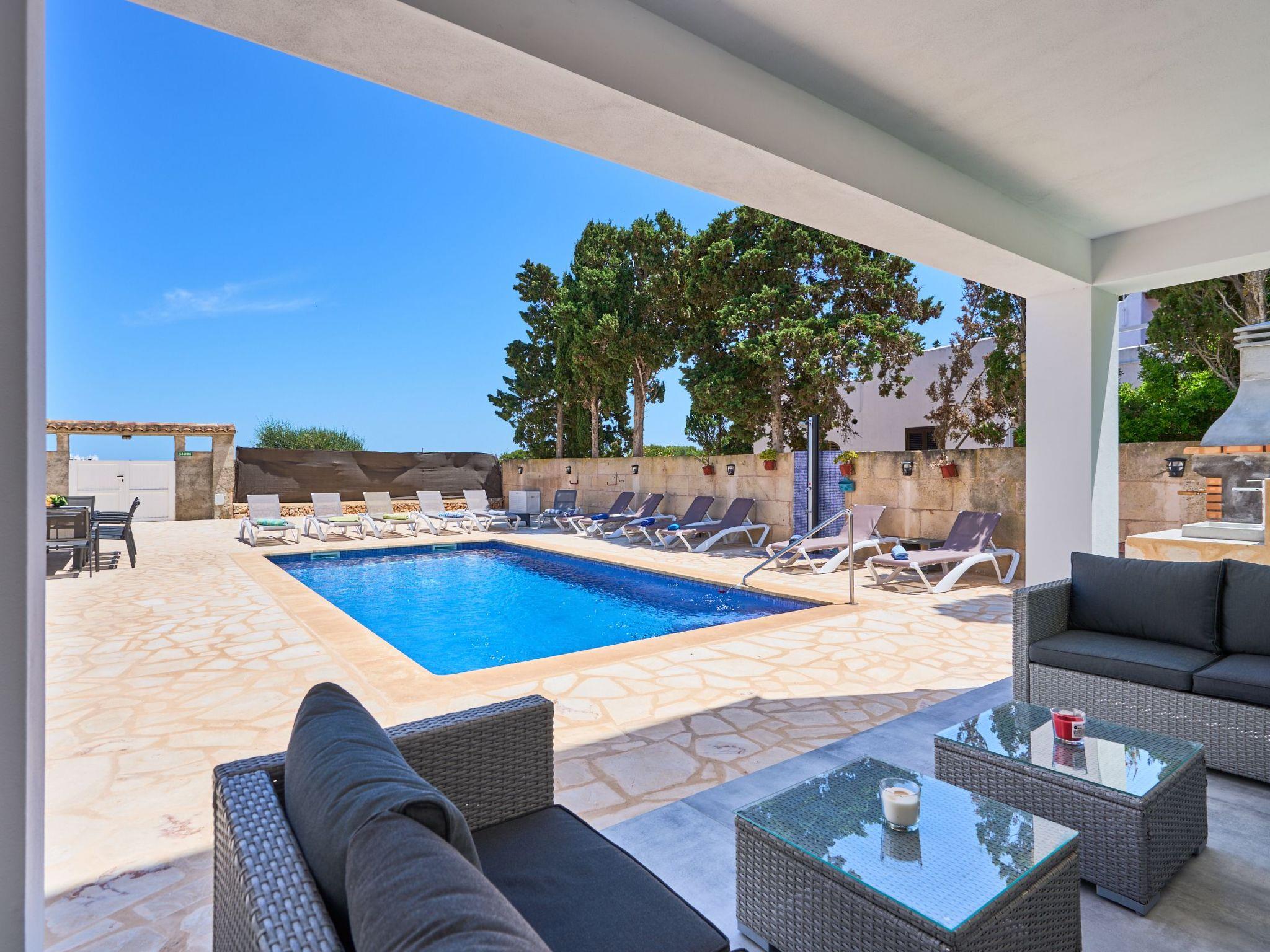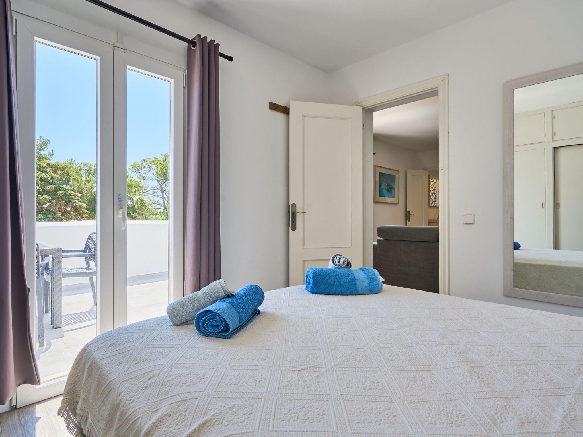 An external staircase leads to the upper floor, where there is a living room with access to a small terrace that offers sweeping views of the harbour of Porto Petro. There are three further bedrooms on this floor. One with two single beds and one with a double bed. Adjacent to these bedrooms is a bathroom with a bathtub and separate shower. The last bedroom has a double bed, a living room, a bathroom with shower and access to a small terrace.