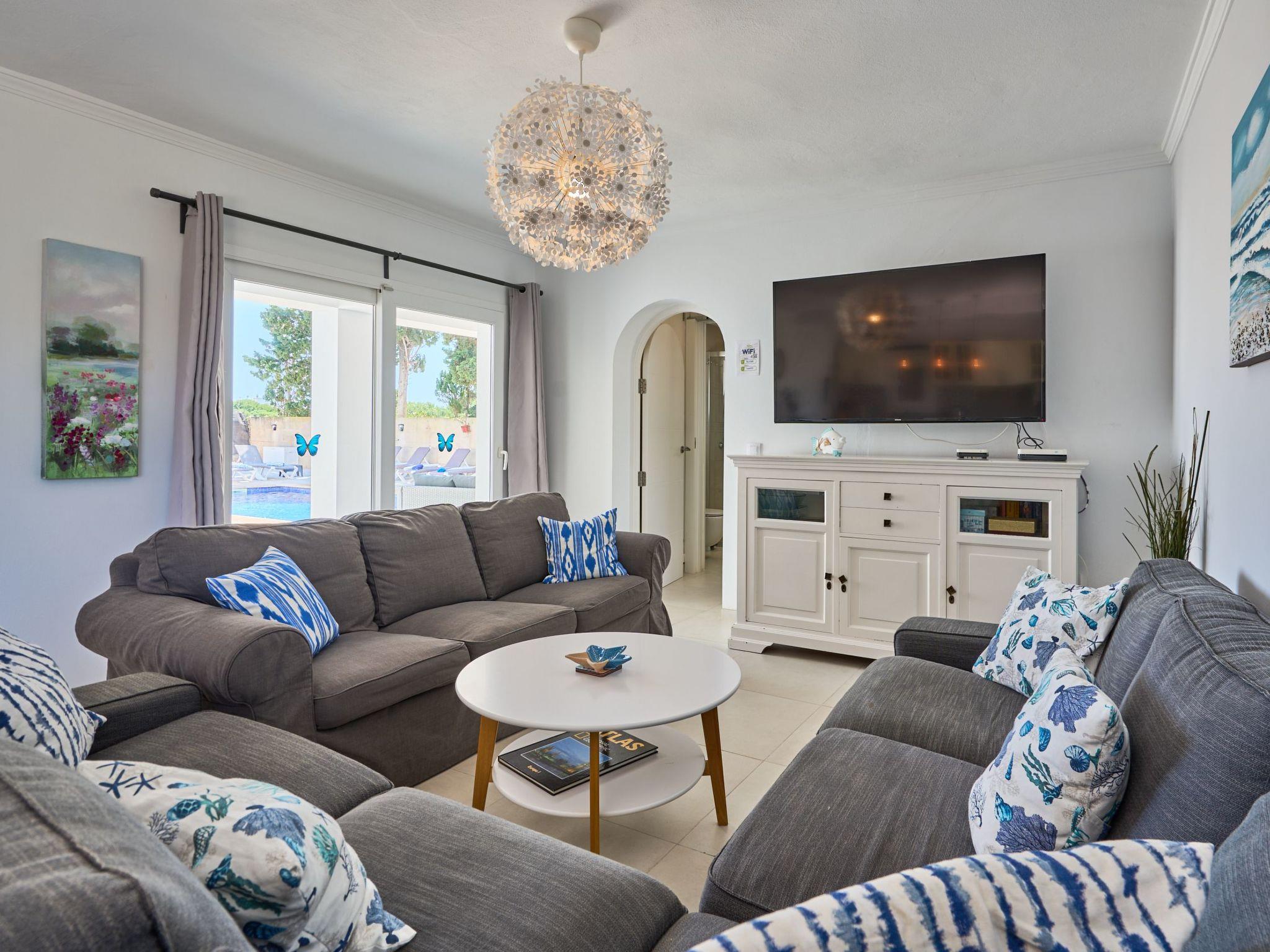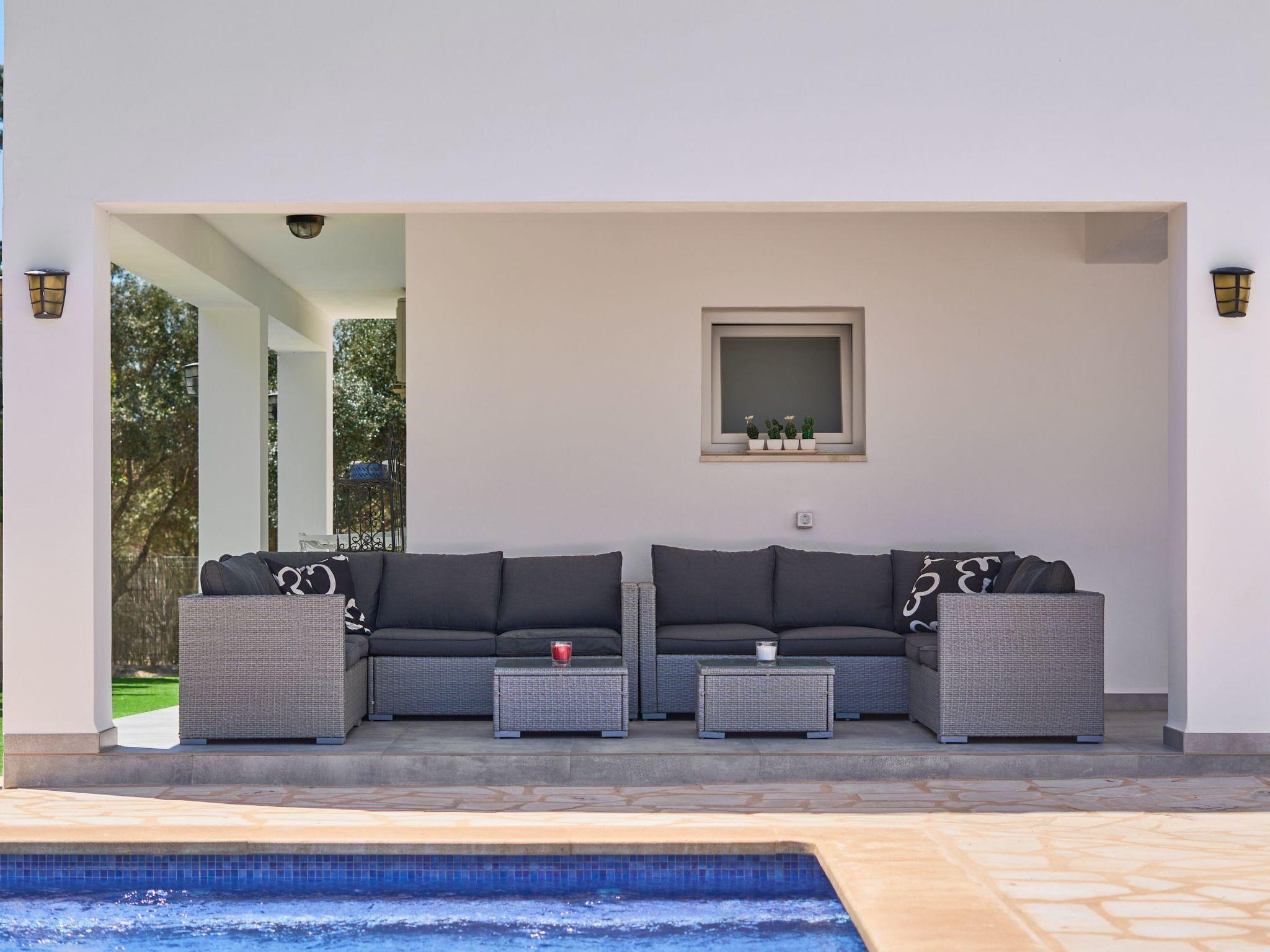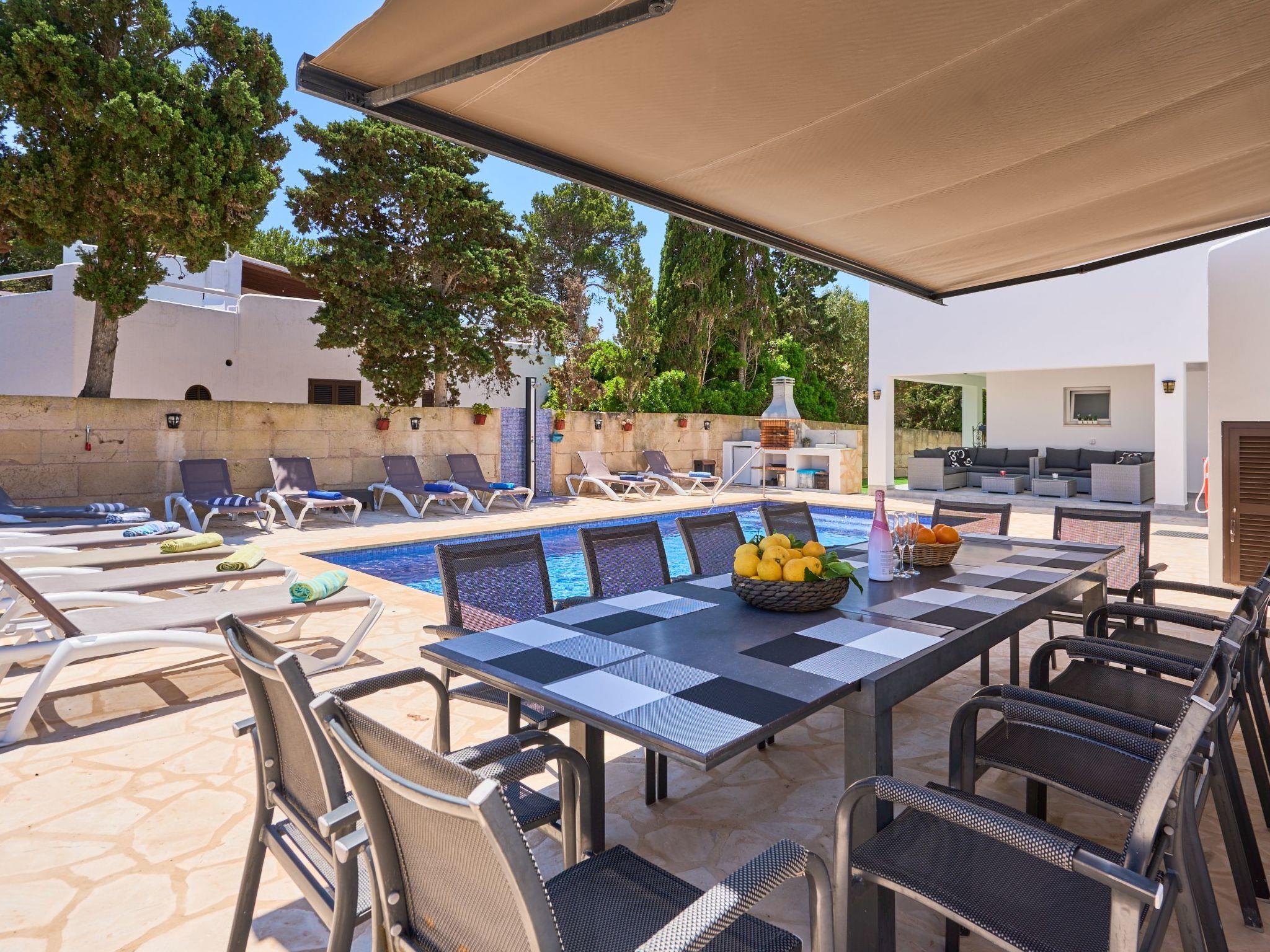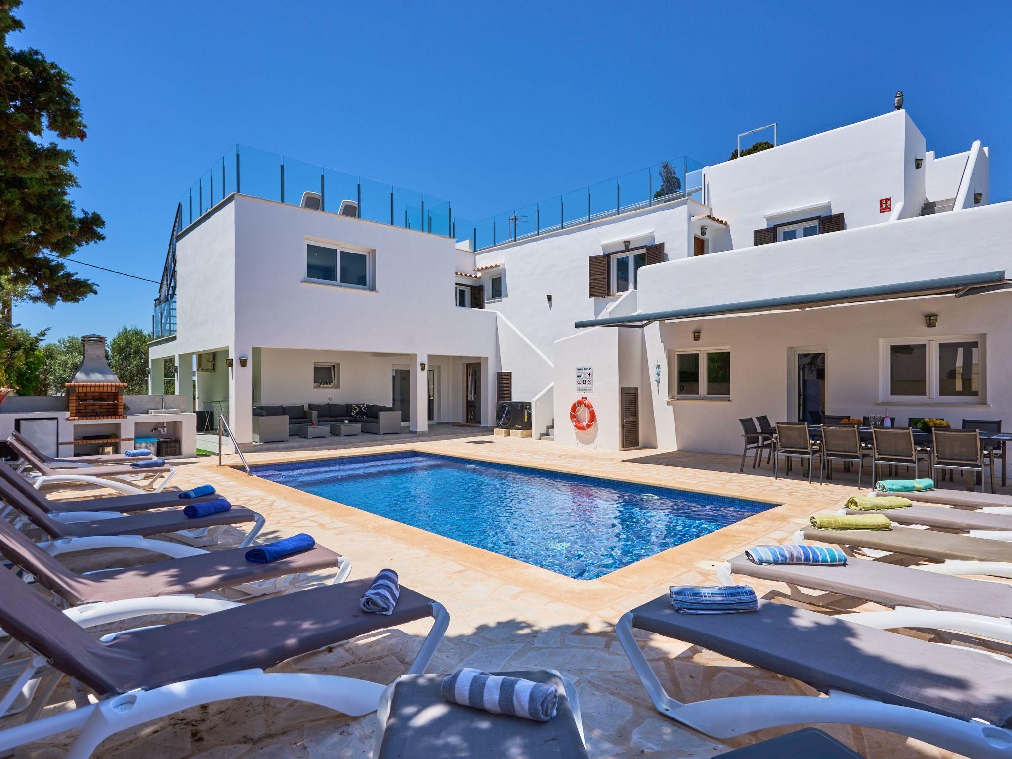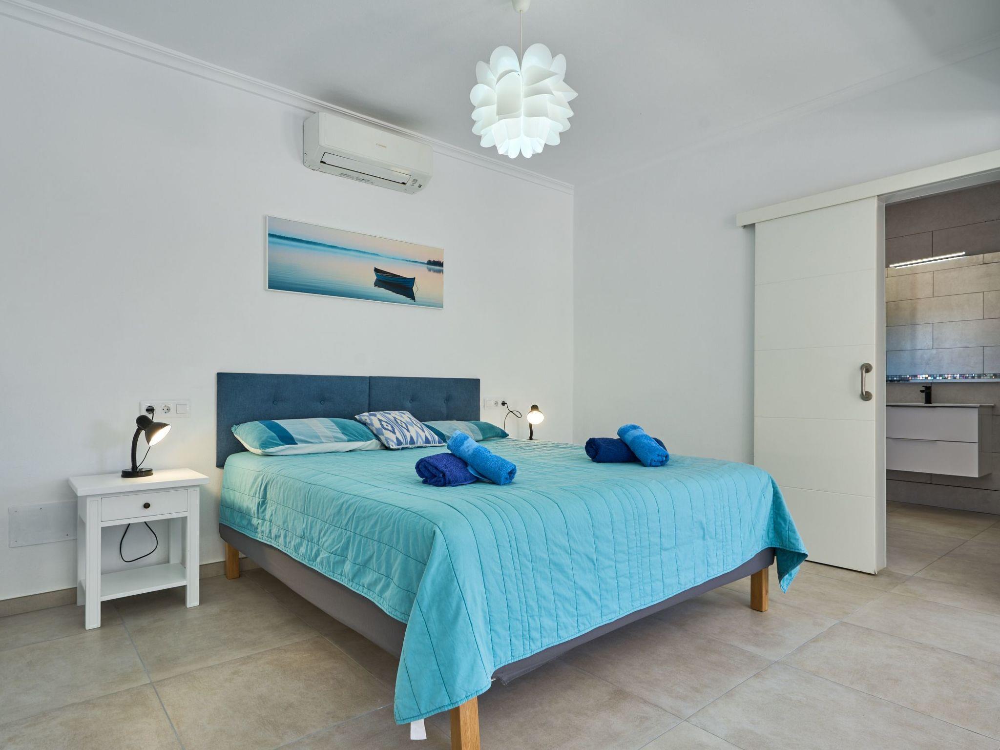 Large house spread over two floors. On the ground floor is the open-plan kitchen with dining area and adjoining living room. Next to the living room there is a bedroom with a double bed and an en suite bathroom with shower. A corridor next to the kitchen leads to two further bedrooms. One of them has two single beds and an adjoining bathroom with bathtub. The other bedroom has a double bed and an en-suite bathroom with shower. These two bedrooms have access to the pool area.