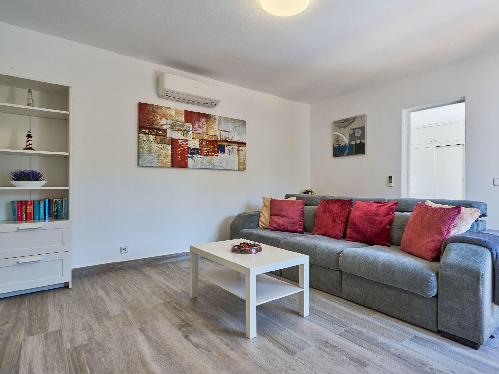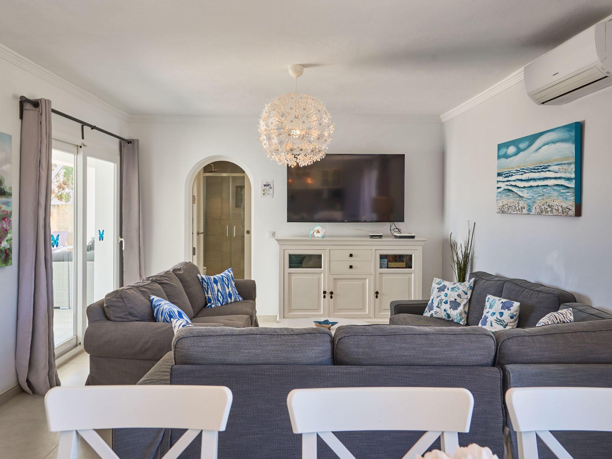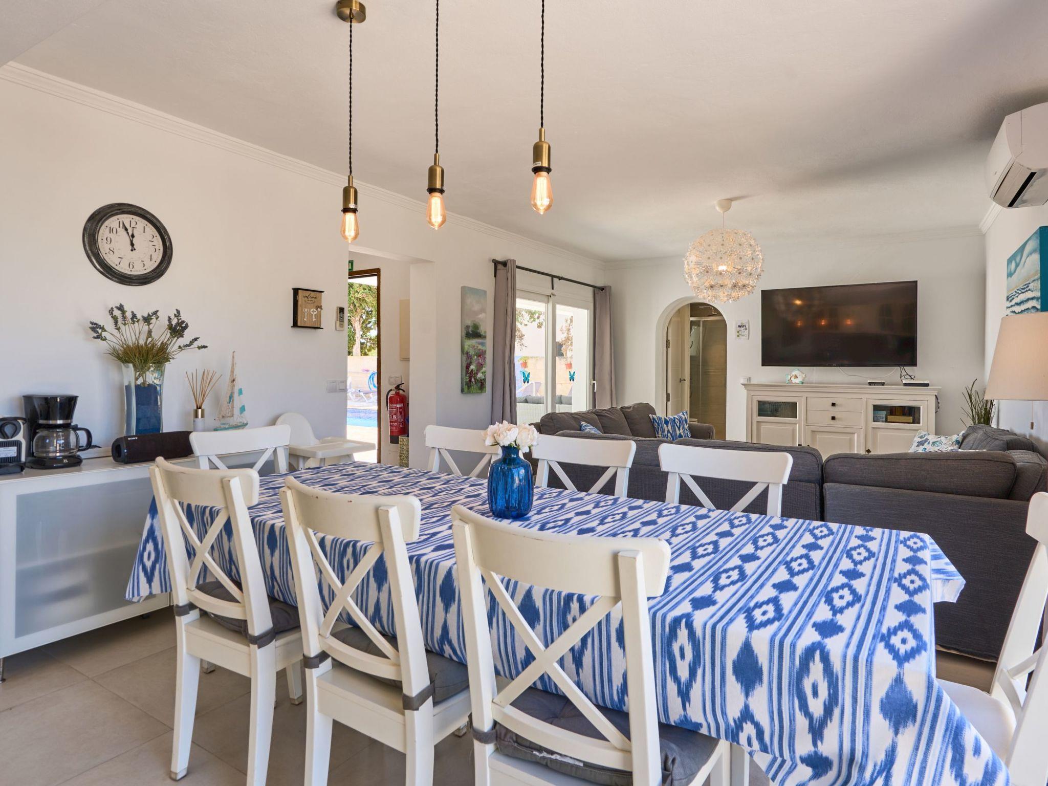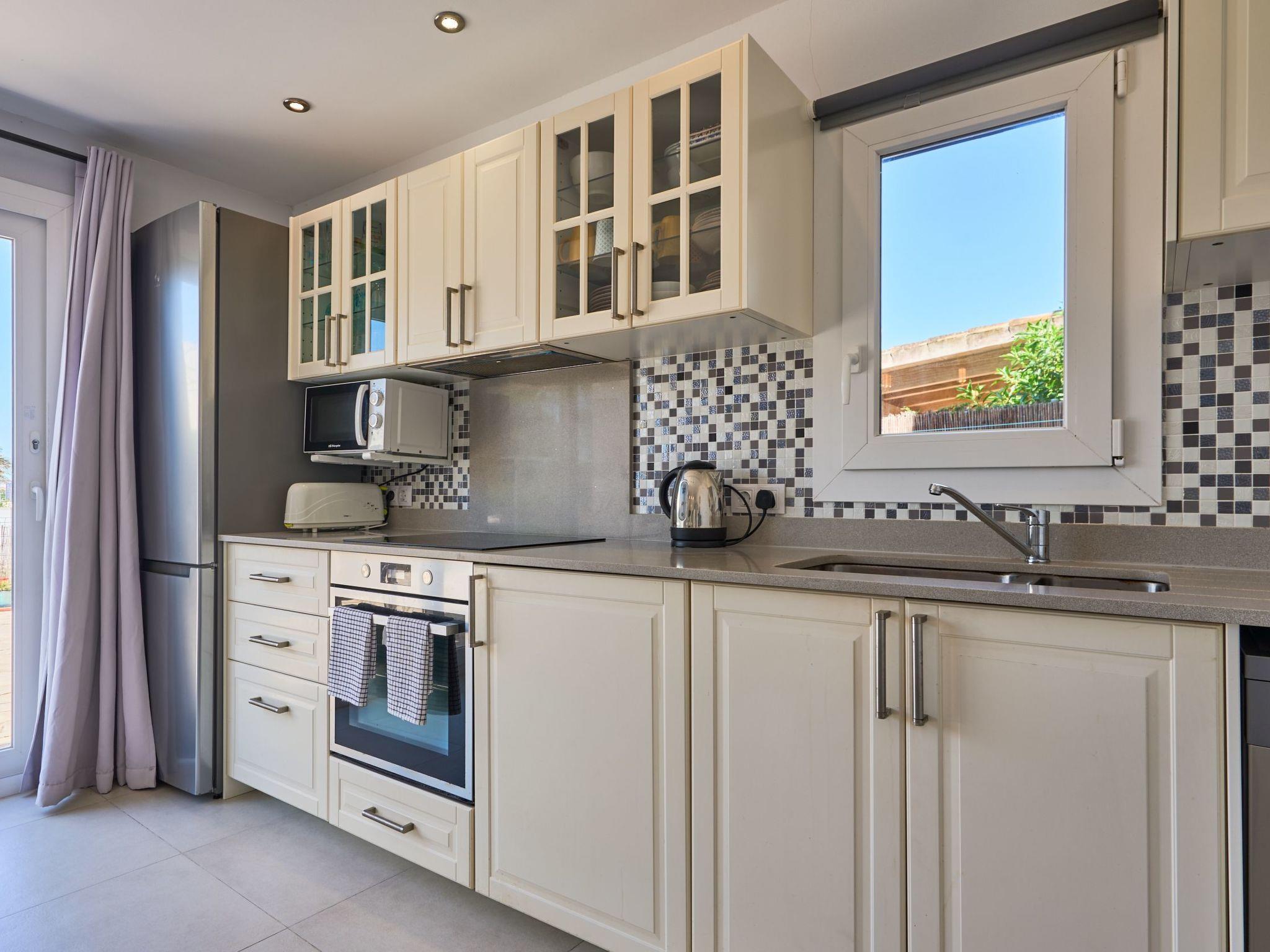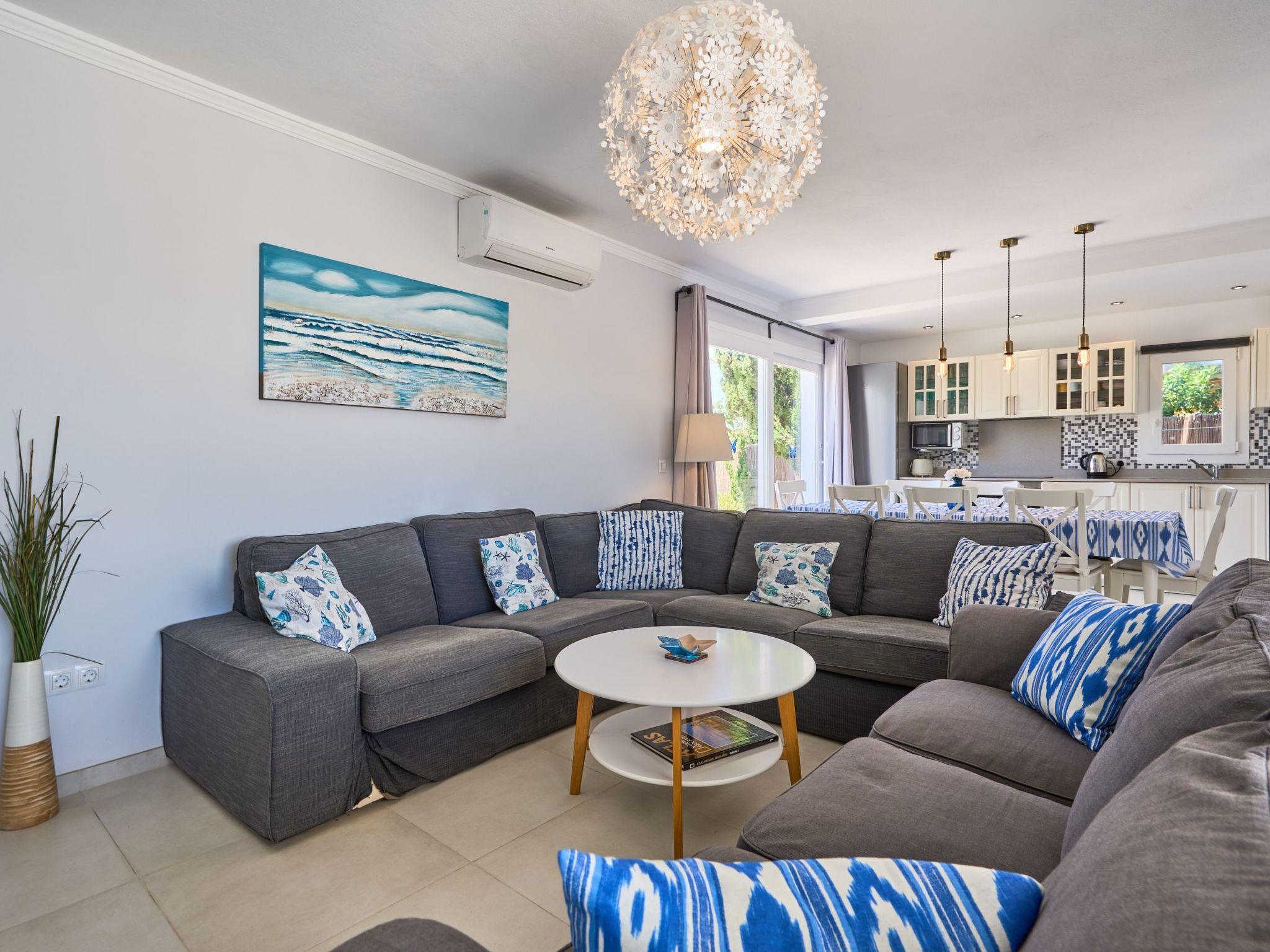 Large house spread over two floors. On the ground floor is the open-plan kitchen with dining area and adjoining living room. Next to the living room there is a bedroom with a double bed and an en suite bathroom with shower. A corridor next to the kitchen leads to two further bedrooms. One of them has two single beds and an adjoining bathroom with bathtub. The other bedroom has a double bed and an en-suite bathroom with shower. These two bedrooms have access to the pool area.