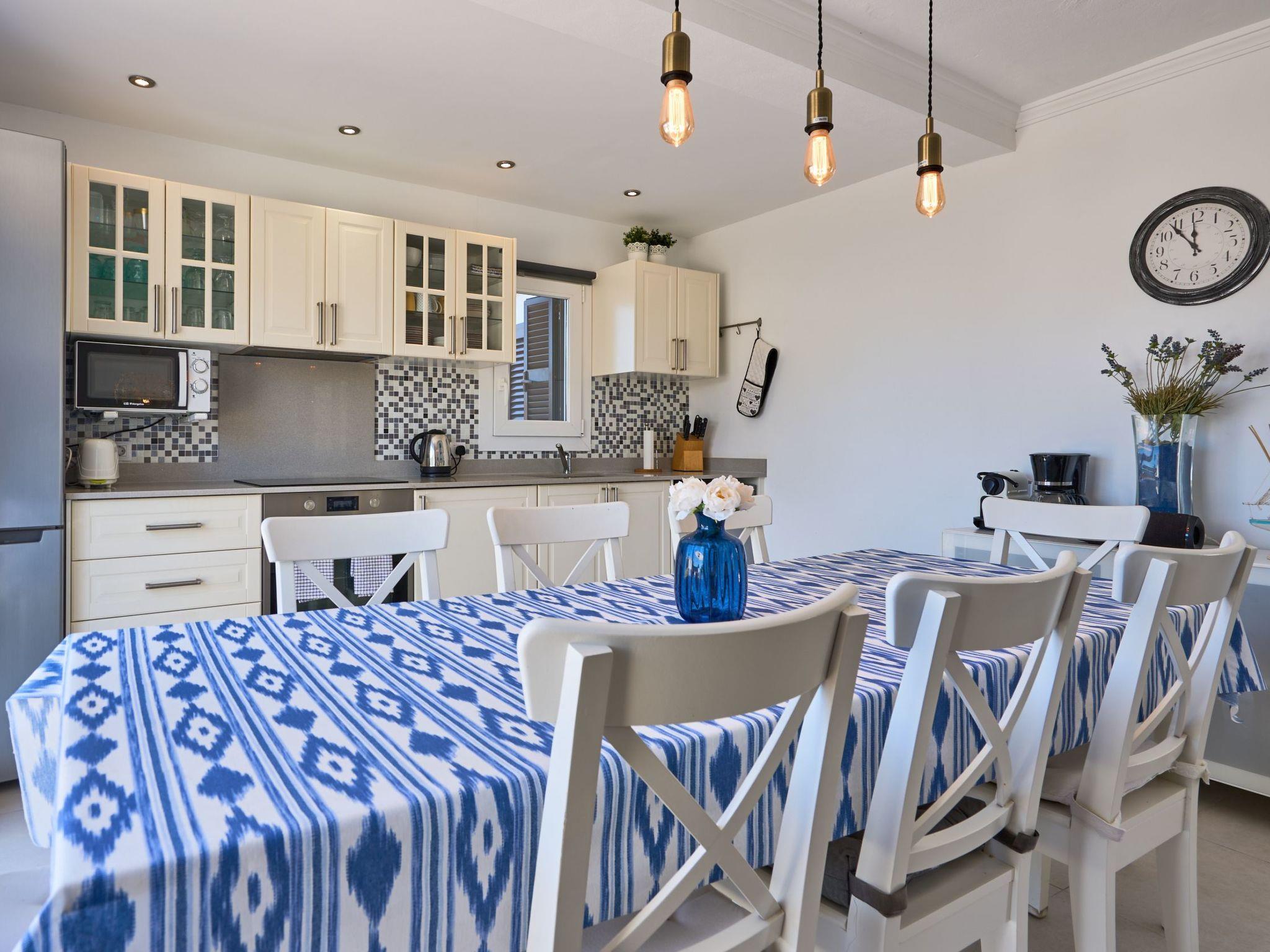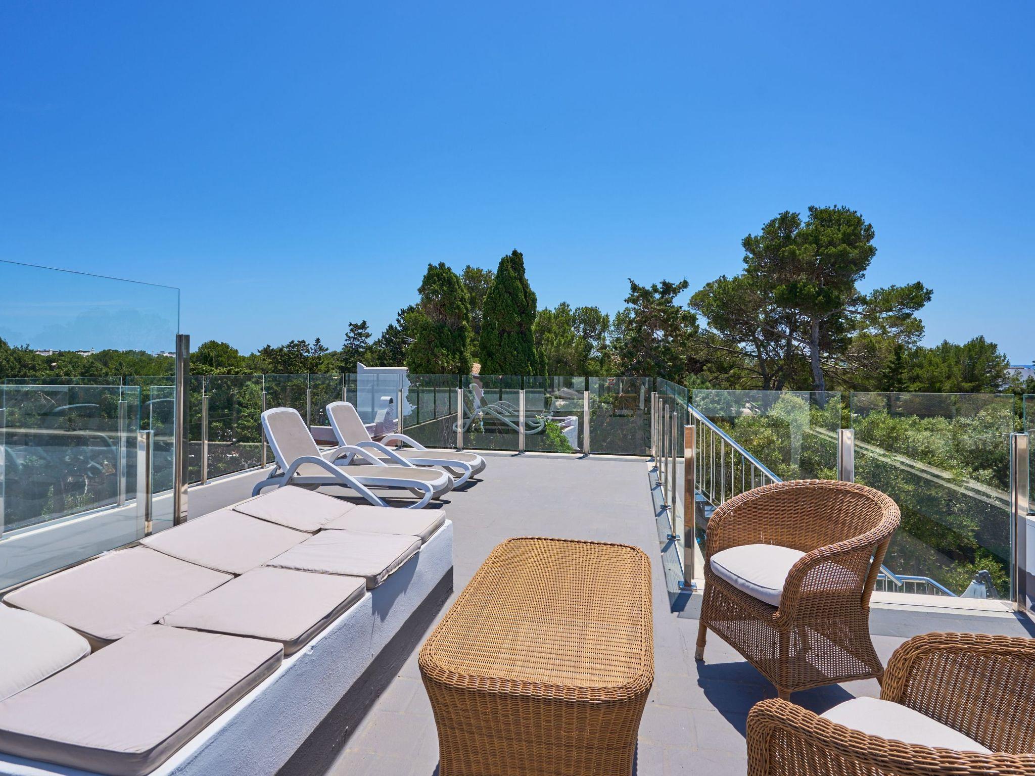 The living room on the first floor has access to a terrace. From this terrace, a staircase leads to the roof terrace with chill-out area and marvellous views of Porto Petro.