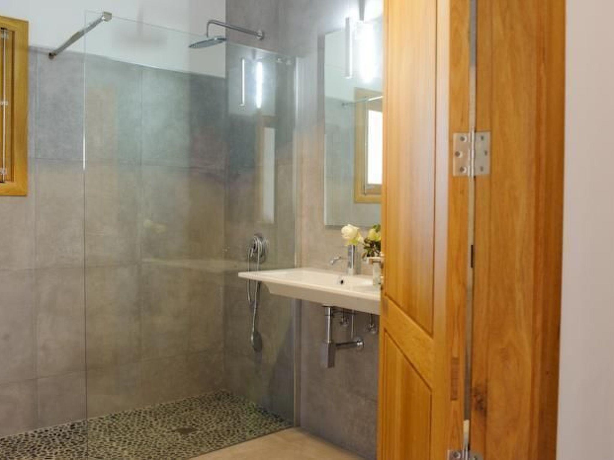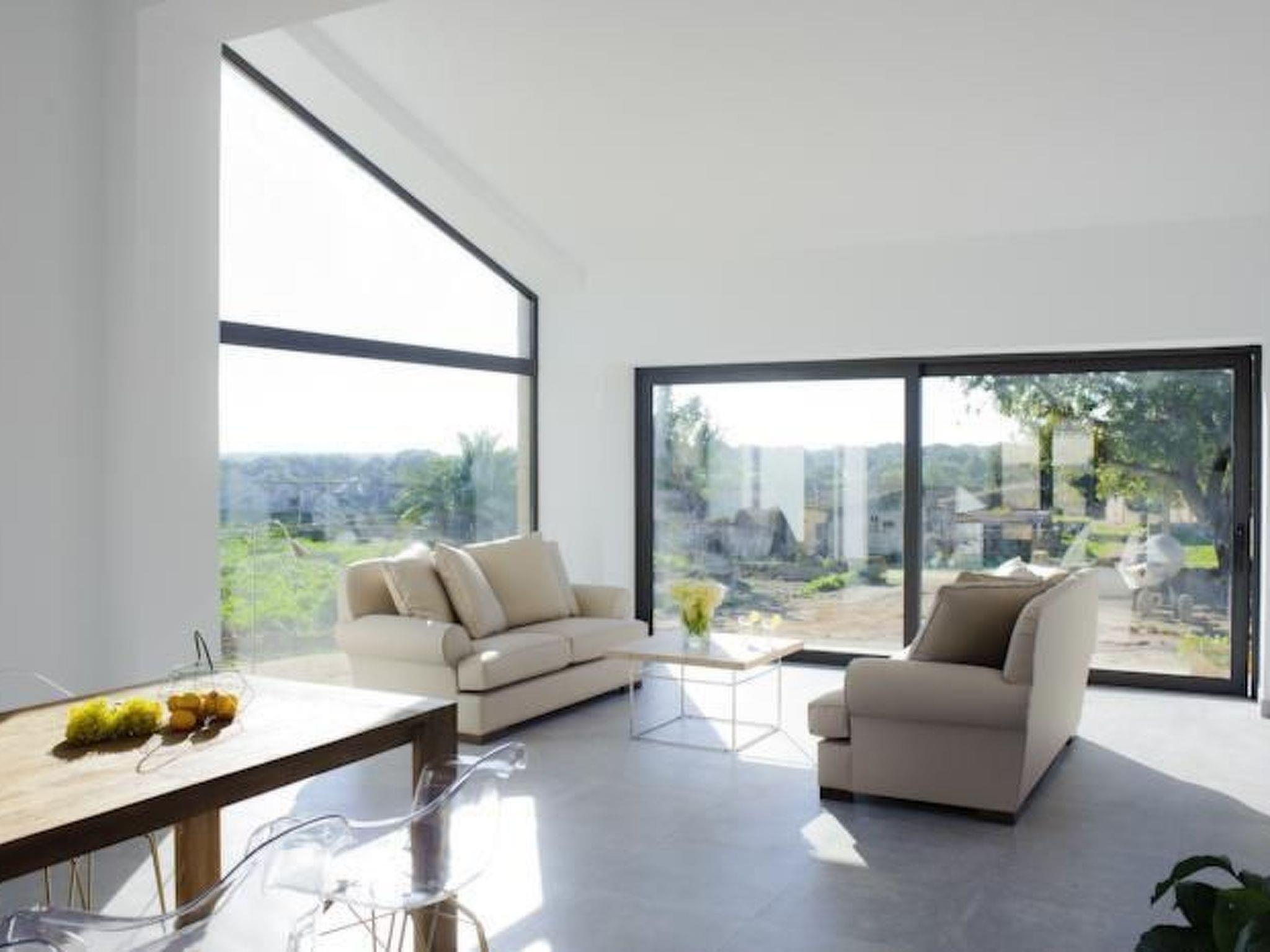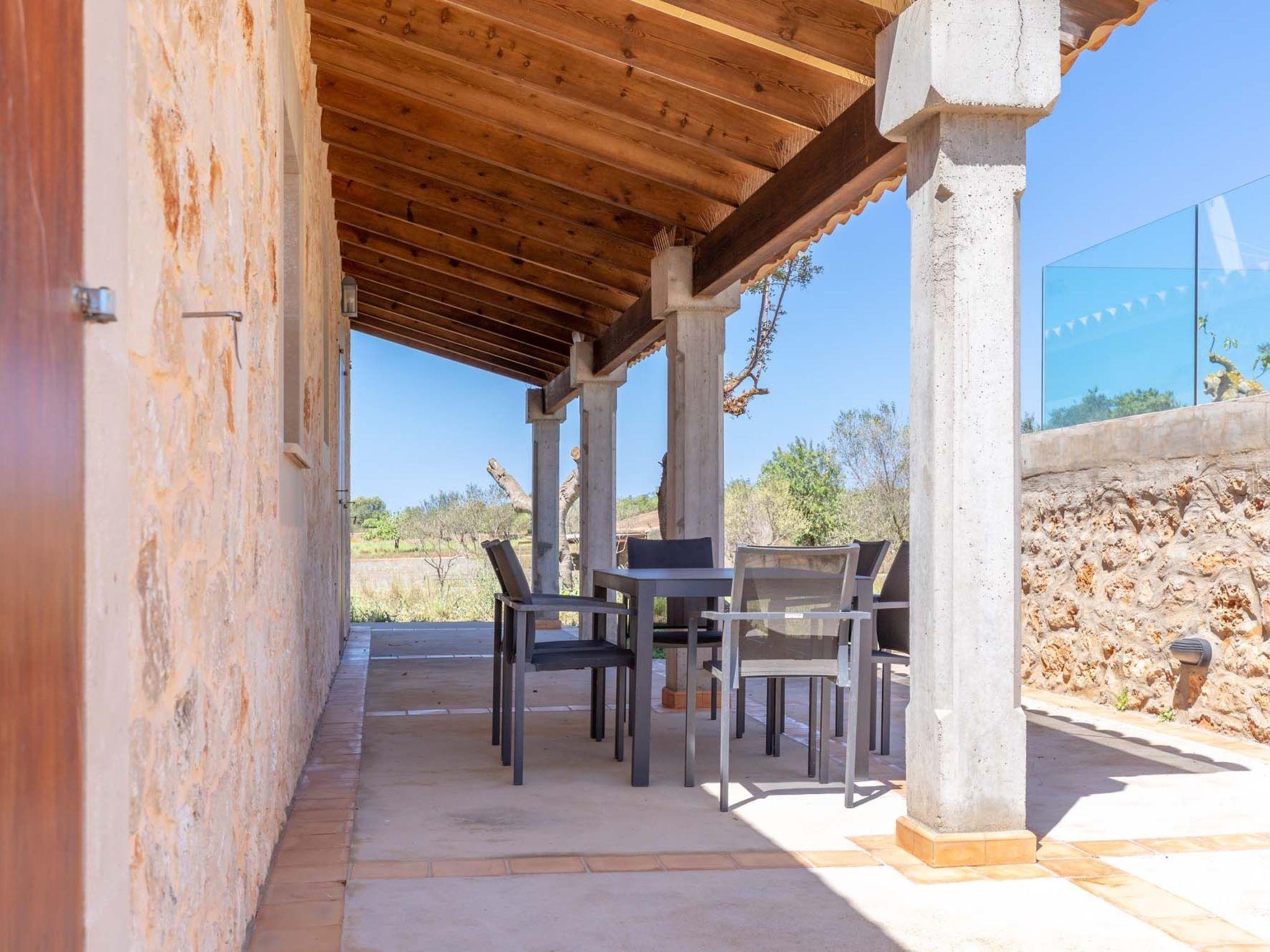 The old farmhouse has been completely renovated and transformed into a modern country house of 130m2. The house is tastefully furnished to a high standard. A door more than 200 years old welcomes the visitor. The entrance area leads to a bright, open-plan living and dining area and an open-plan kitchen. The living and dining area features an Italian teak designer table and cosy sofas. The entire area is flooded with light without being heated by the sunlight (special glazing) and offers a marvellous view of the surrounding area as far as the town of Santanyí in the distance. Large sliding glass doors lead out onto the front terrace. The dining area leads to the open-plan kitchen, which is equipped to a high standard. The house has two double bedrooms. One with walk-in shower en-suite and access to the rear, covered terrace, the other with en-suite bathroom and access to the front terrace.