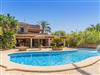 Casa Jardi is a beautiful two-storey country house in classic style with spacious rooms. The outside area is very spacious with a large garden with lawn and tall palm trees. From the main entrance, the entrance hall leads to the lower level with guest toilet and spacious living room with access to the covered terrace overlooking the pool. Next to the living room is the dining room. On the other side is the kitchen with a breakfast table and access to the pool area. The ground floor has two bedrooms; the master bedroom with a nice rustic touch, double bed, en-suite bathroom with bathtub and access to the outside. Close to this bedroom is the laundry room, which also has access to the outside. The second bedroom has two single beds and an en-suite shower room. From the entrance, a staircase leads to the first floor where there are three bedrooms; one with a double bed, en suite bathroom with bathtub and French doors leading to a partially covered terrace with stunning views of the surrounding area and pool area. The other two bedrooms each have two single beds and an en suite shower room. These bedrooms have access to the terrace from the hallway.
