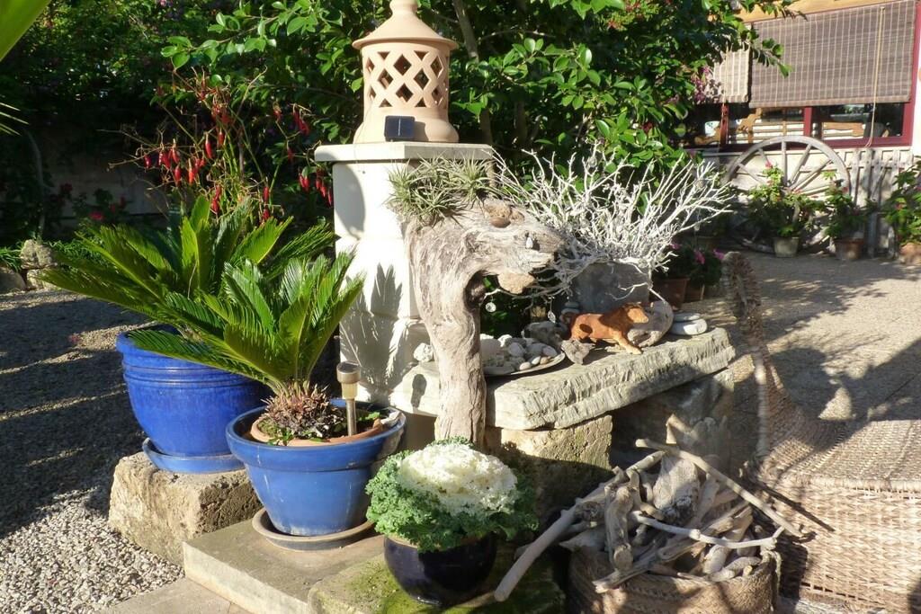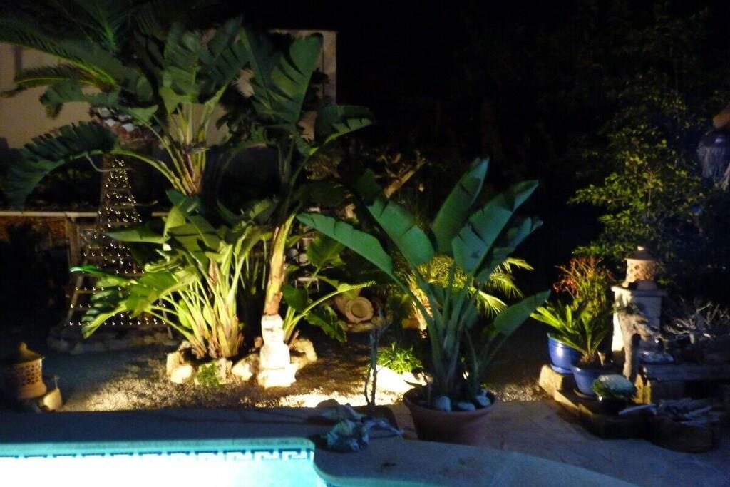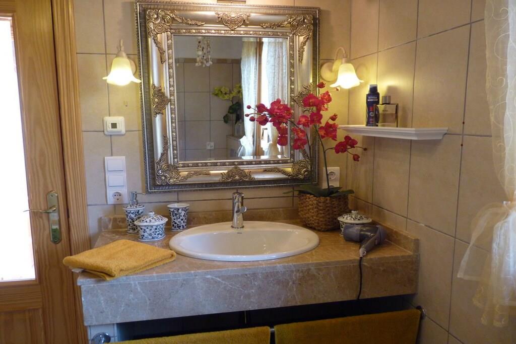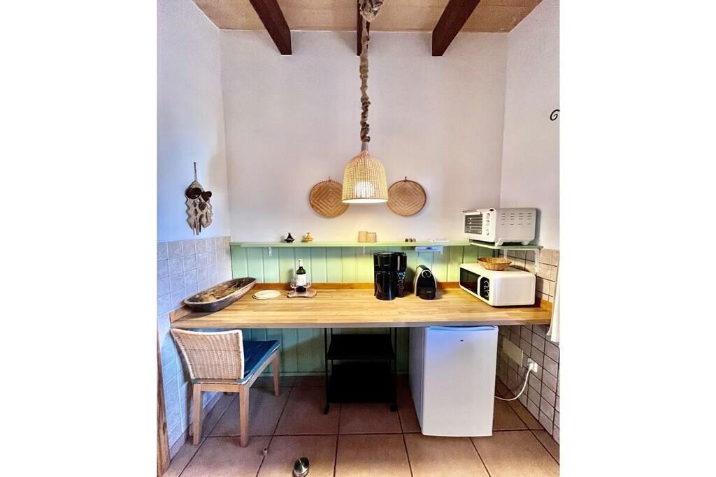 På 1. etage: (entre(, ), Stue(, , , Fjernsyn, stereoanlæg, klimaanlæg, insektnet), åbent køkken(, , tekøkken, radio, kogeplade, elkedel, brødrister, kaffemaskine, ovn, mikrobølgeovn, køleskab, fryser), soveværelse(, , , dobbeltseng, Fjernsyn, radio, klimaanlæg, insektnet), badeværelse(bruser, håndvask, føntørrer, Håndklæder inkl.)) , , Internetadgang, varme, have(outdoor shower, havemøbler, swimmingpool), liggestole(, spisebord, havemøbler, solstole, baldakin), cykler til rådighed, strygebræt, strygejern, tørreskab,