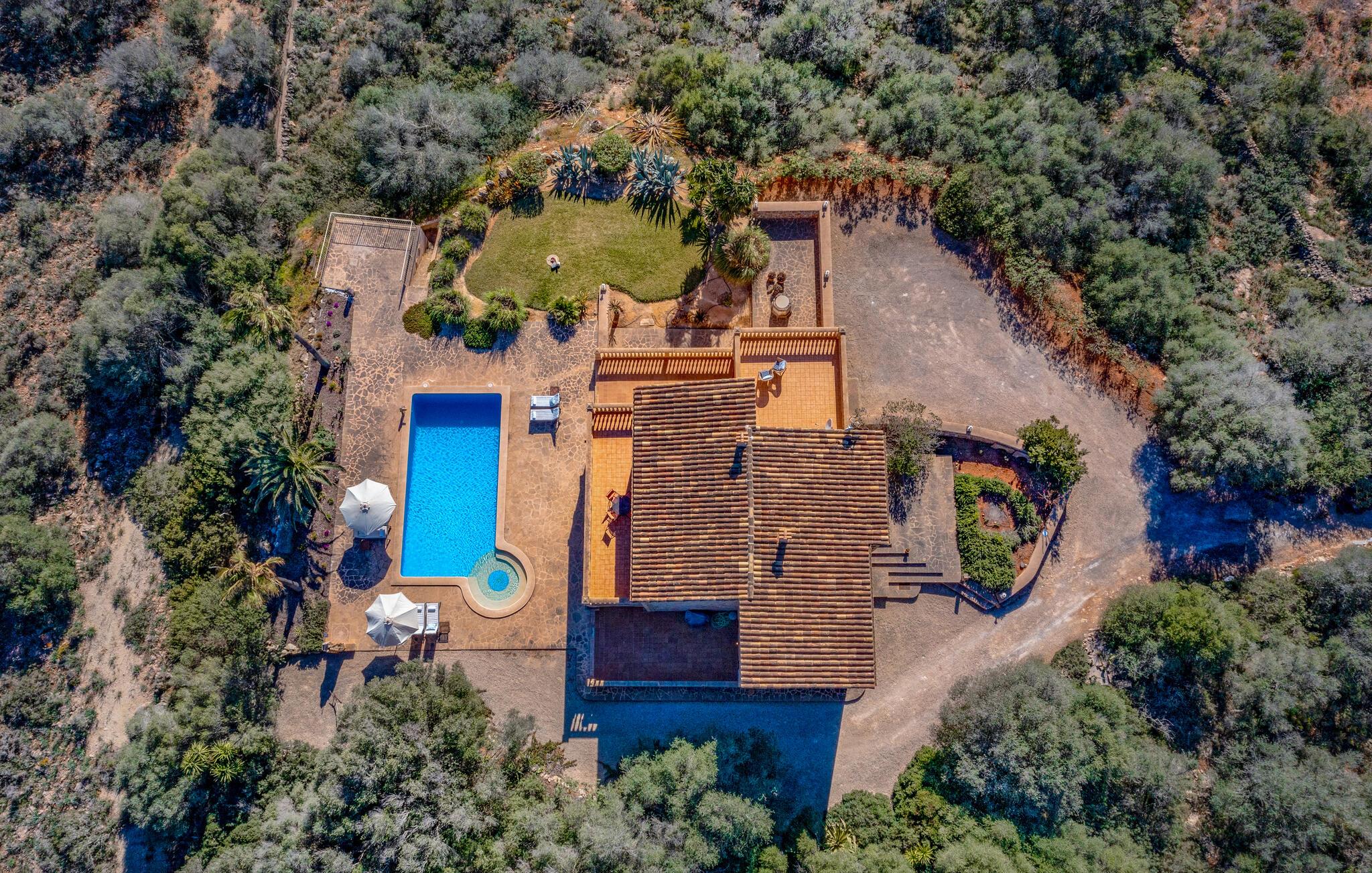 Udeområdet er mindst lige så lækkert. Her venter jer en stor, idyllisk have med en lækker pool, hvor I kan dyppe jer lige så tit, I lyster. Nyd alle dagens måltider i det fri på den rummelige terrasser med en imponerende udsigt over de maleriske omgivelser. Her kan I sidde helt uforstyrret. Den frodige vegetation skaber en oase af fred, som det slet og ret er umuligt ikke at slappe af i.