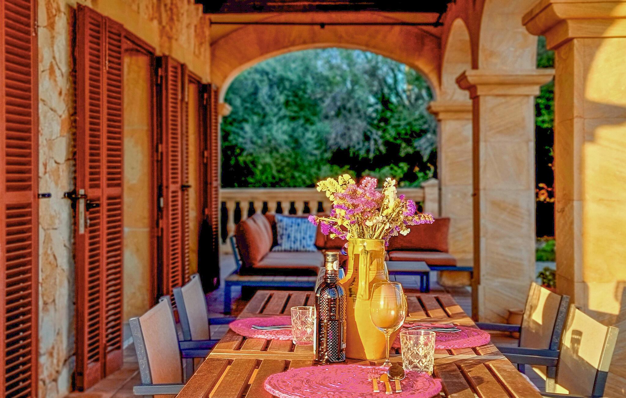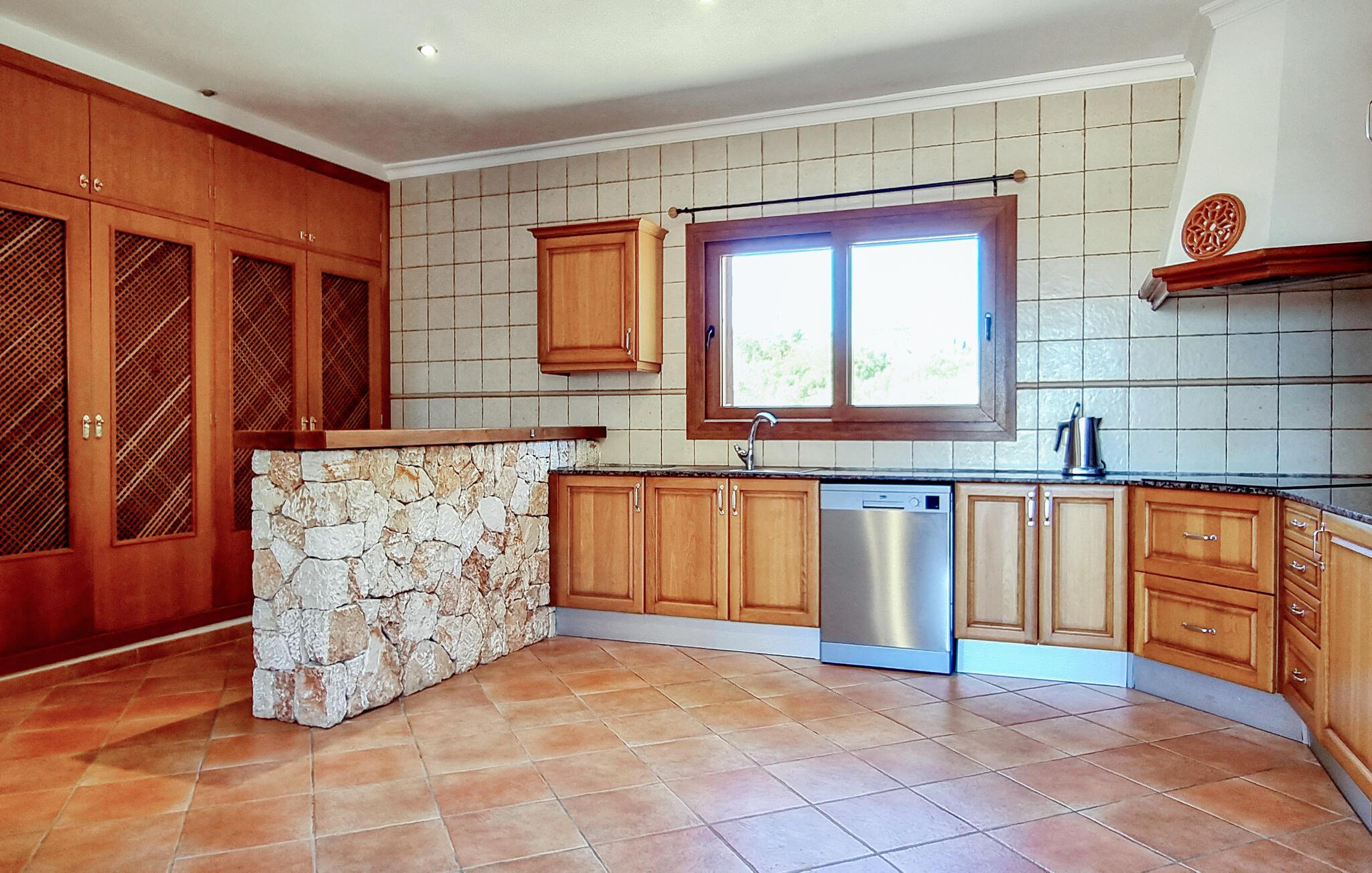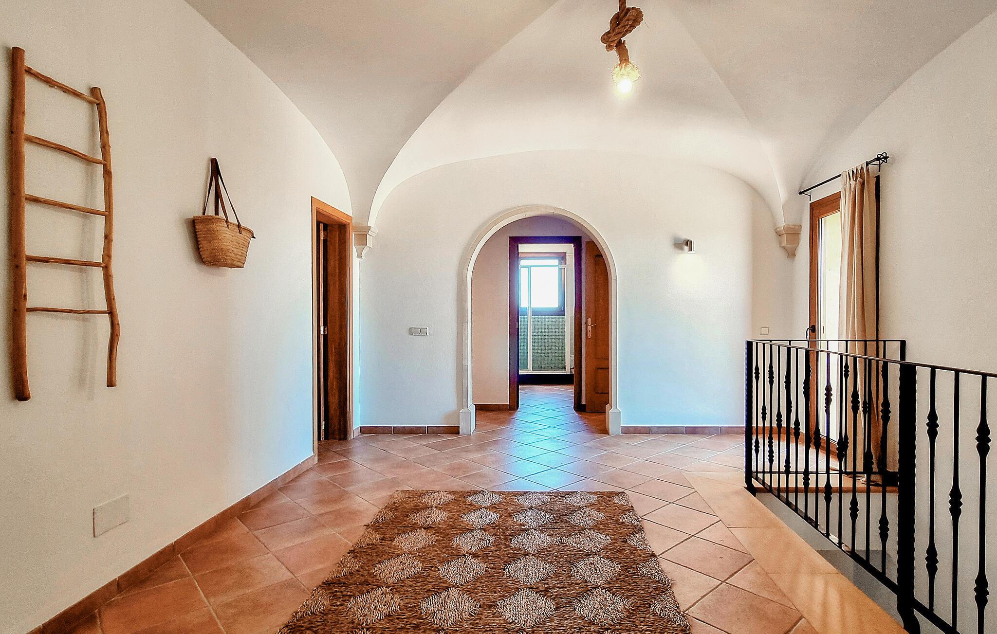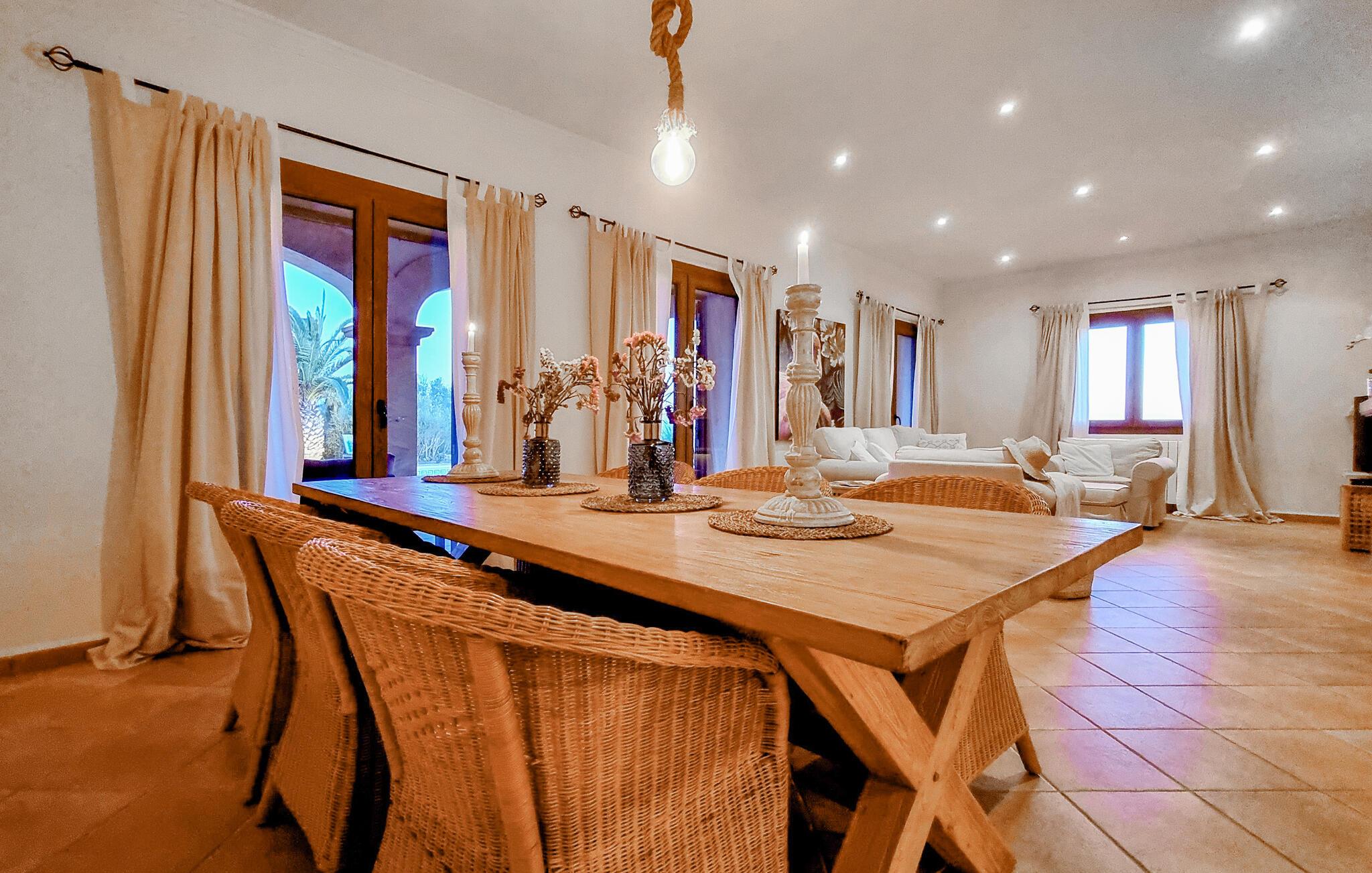 Velkommen til denne flotte og virkelig rummelige finca, der ligger i vidunderlige omgivelser i Sa Teulera og byder på masser af plads og komfort til et ophold med den store familie. Indvendigt emmer det af kvalitet, komfort og autentisk middelhavs-look over hele linjen. Den rummelige stue med store vinduespartier lukker masser af lys ind og byder på en betagende udsigt over det omkringliggende landskab. Køkkenet er stort og veludstyret, så lad blot familiens kokke kræse om livretterne, mens andre flader ud i sofaerne eller dækker op til den helt store festmiddag ved spisebordet.