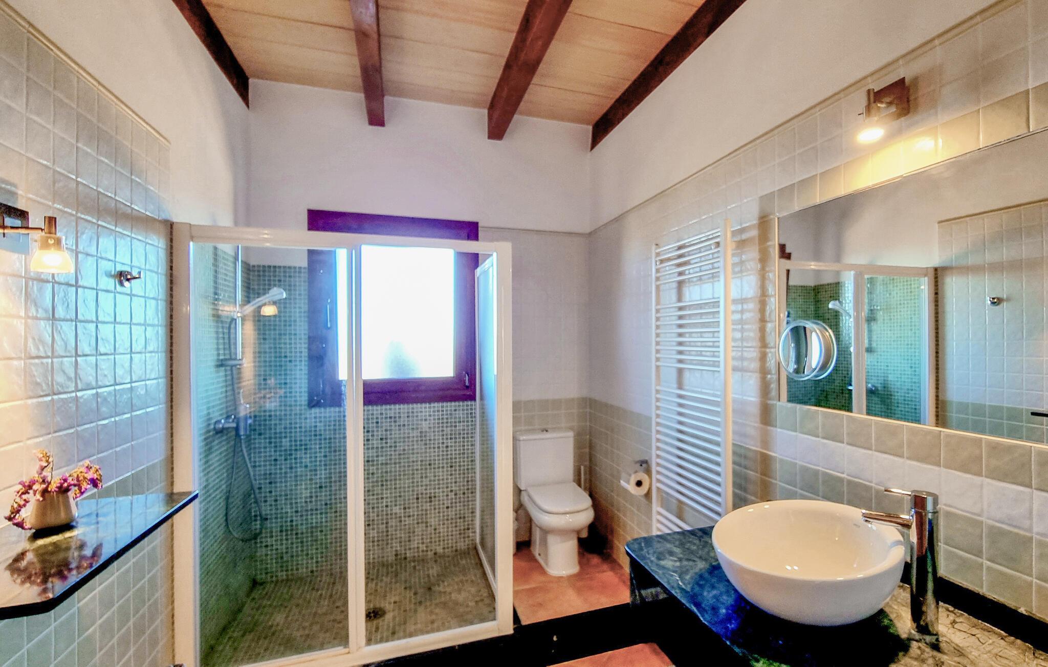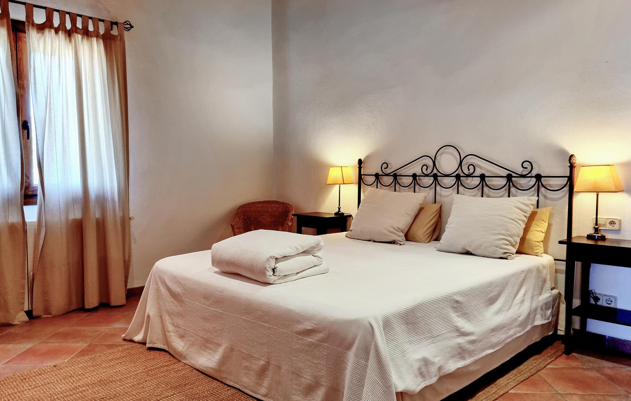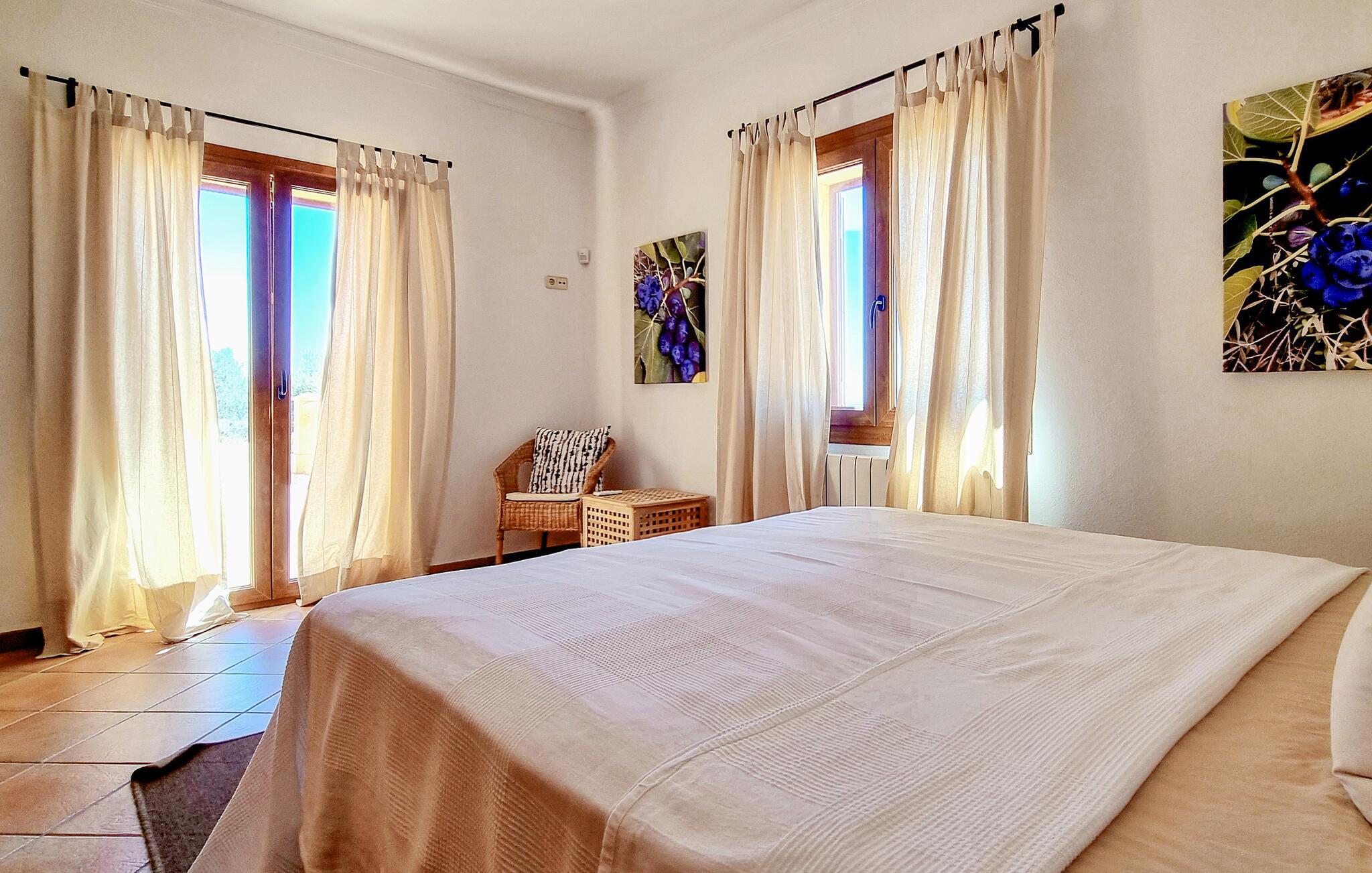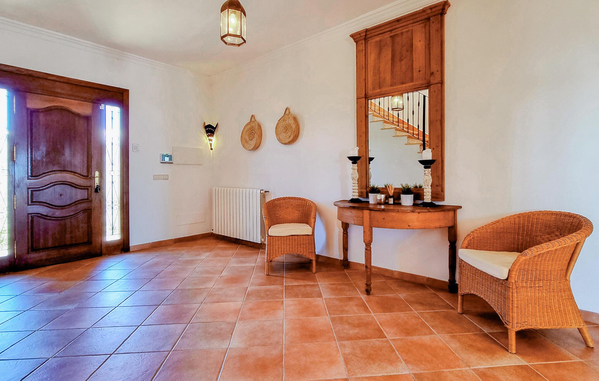 Velkommen til denne flotte og virkelig rummelige finca, der ligger i vidunderlige omgivelser i Sa Teulera og byder på masser af plads og komfort til et ophold med den store familie. Indvendigt emmer det af kvalitet, komfort og autentisk middelhavs-look over hele linjen. Den rummelige stue med store vinduespartier lukker masser af lys ind og byder på en betagende udsigt over det omkringliggende landskab. Køkkenet er stort og veludstyret, så lad blot familiens kokke kræse om livretterne, mens andre flader ud i sofaerne eller dækker op til den helt store festmiddag ved spisebordet.