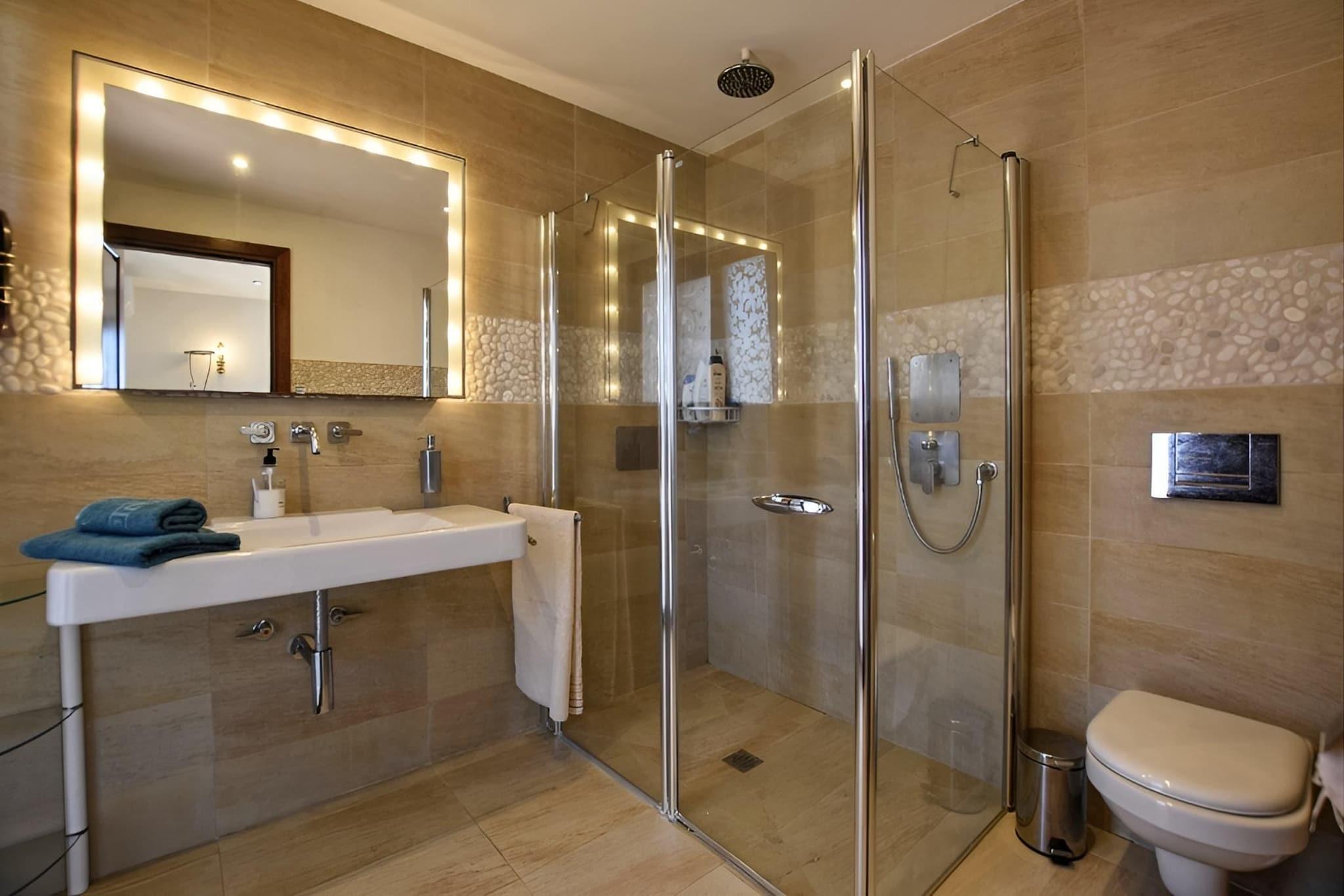 På 1. etage: (Stue(Fjernsyn, spisebord, sofahjørne, klimaanlæg), åbent køkken(brødrister, komfur, ovn, mikrobølgeovn, opvaskemaskine , køle-fryseskab, Saftpresser, , Coffee), veranda(spisebord)) På 2. etage: (Soveværelse med badeværelse(dobbeltseng, bruser, håndvask, toilet, bidet, klimaanlæg), Soveværelse med badeværelse(dobbeltseng, bruser, håndvask, toilet, bidet, balkon eller terrasse, klimaanlæg), Soveværelse med badeværelse(enkeltseng, enkeltseng, bruser, håndvask, toilet, bidet, klimaanlæg)) bruser, grill, swimmingpool(privat), hængekøje