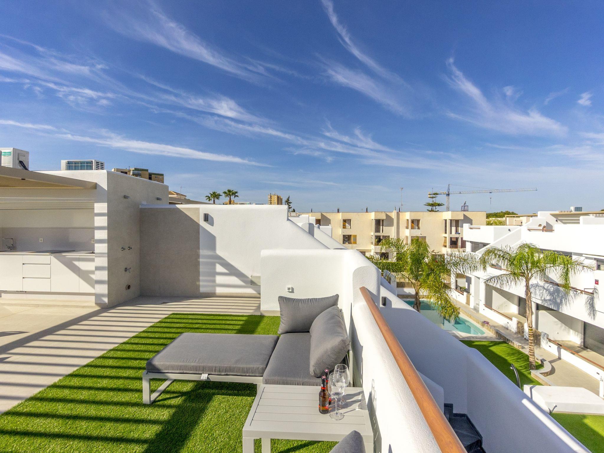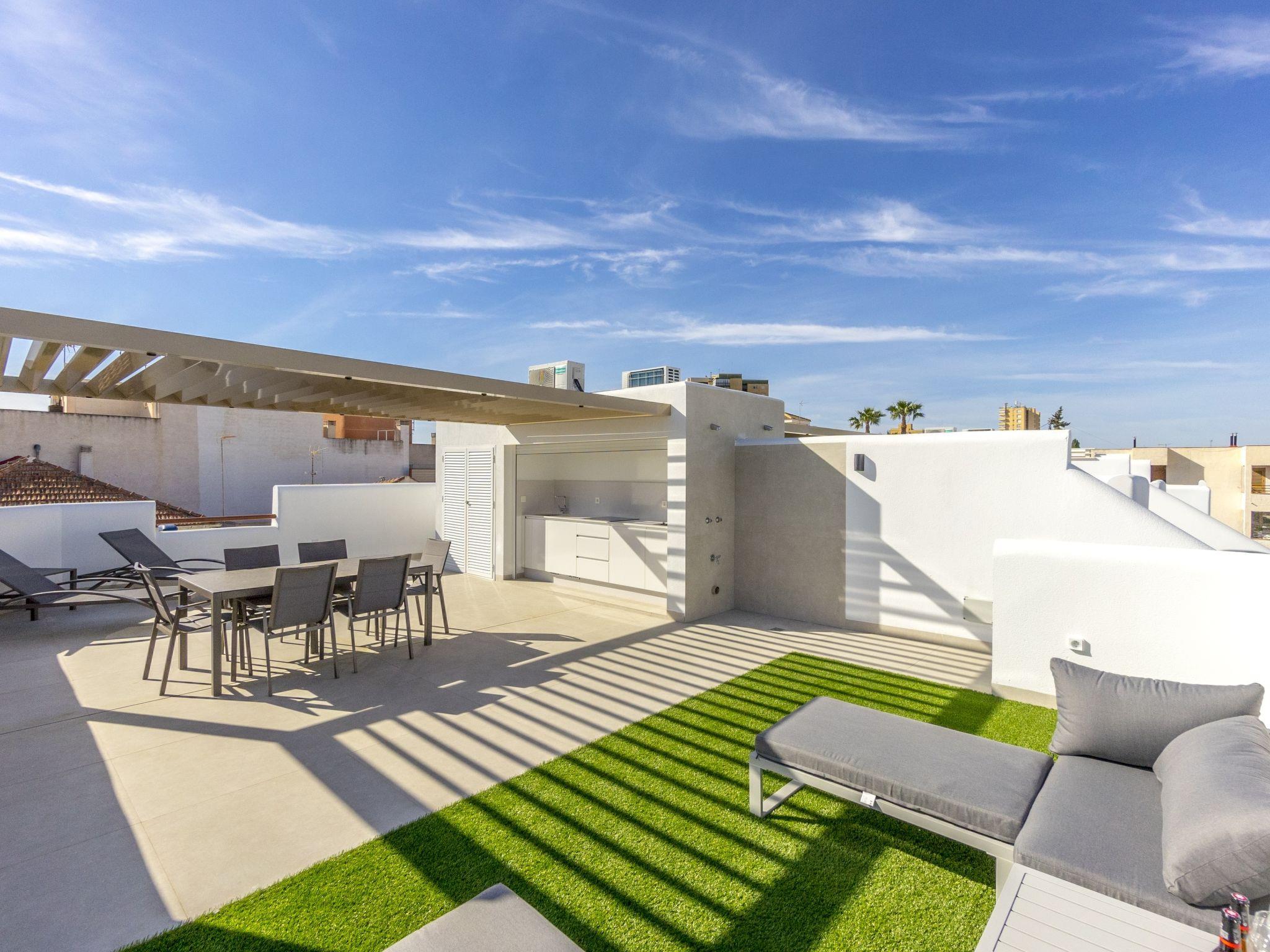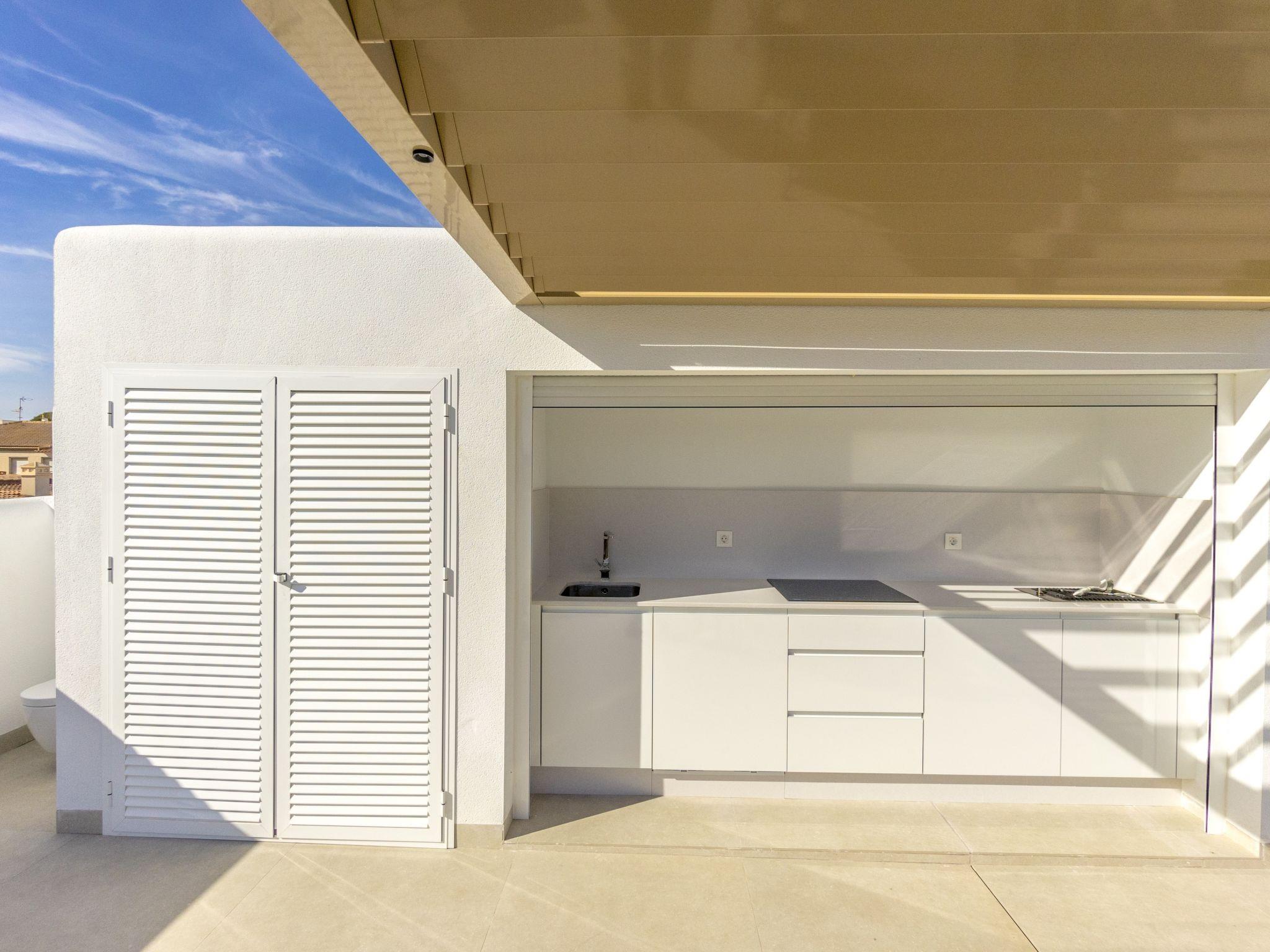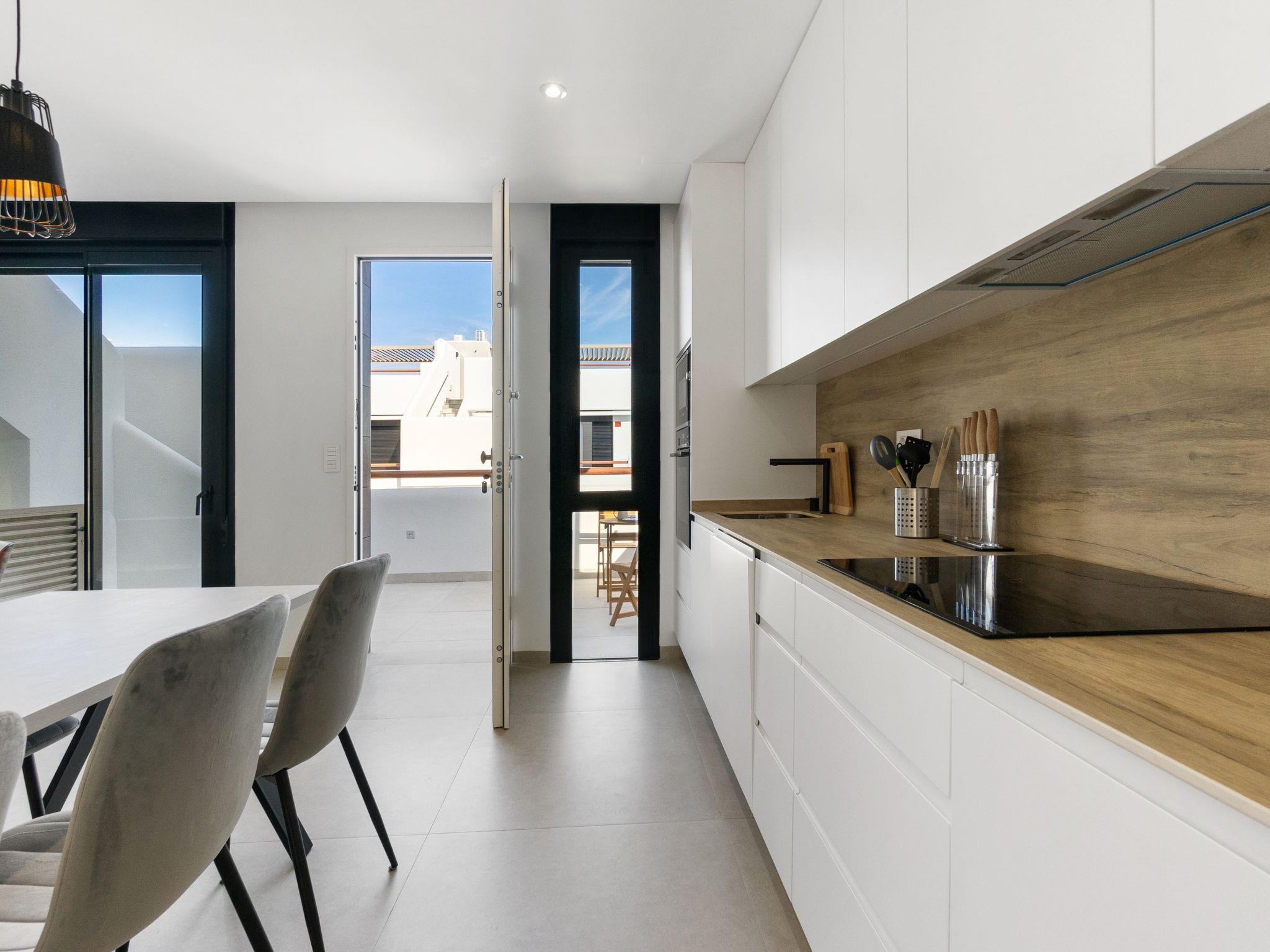 "Tropical Beach Penthouse", 3-room penthouse 64 m2 on 1st floor. Practical and comfortable furnishings: large living/dining room with 1 double sofabed (140 cm, length 190 cm), air conditioning and forced-air heating. Exit to the balcony. 1 room with 1 french bed (150 cm, length 190 cm), shower/WC, air conditioning and forced-air heating. 1 room with 1 french bed (150 cm, length 190 cm), air conditioning and forced-air heating. Open kitchen (oven, dishwasher, 4 ceramic glass hob hotplates, kettle, microwave, freezer, electric coffee machine). Shower/WC. Balcony, large terrace 80 m2. Terrace furniture, deck chairs. View of the resort. Facilities: washing machine, iron, children's high chair, baby cot for up to 2 year olds, hair dryer. Internet (WiFi, free). Please note: suitable for families. Non-smokers only. No lift. Outdoor kitchen, outdoor shower and outdoor WC on the rooftop. VV.MU.4442-1 // Reg. Nr.: ESFCTU0000300320008092230000000000000000VV/MU/4442-10