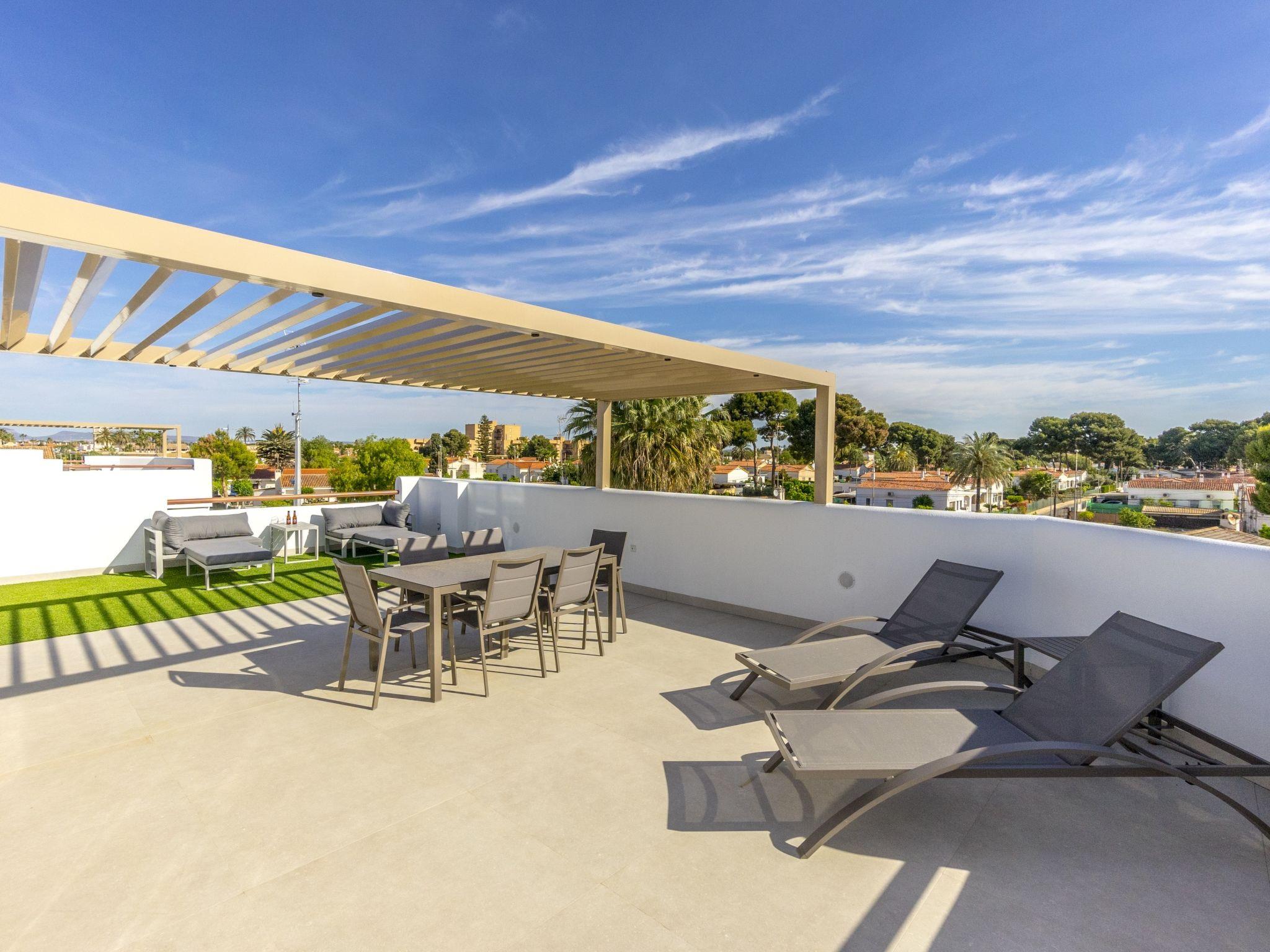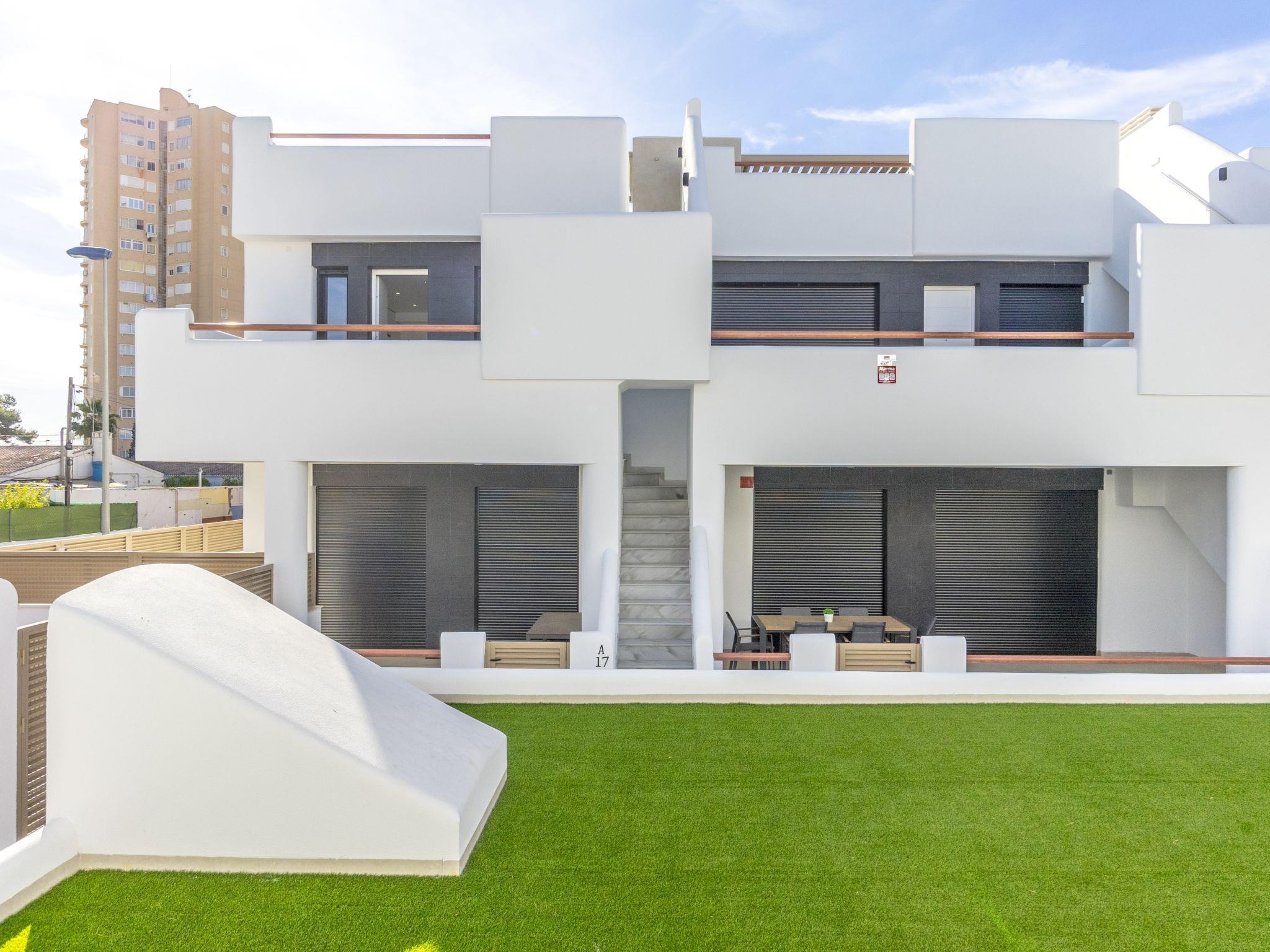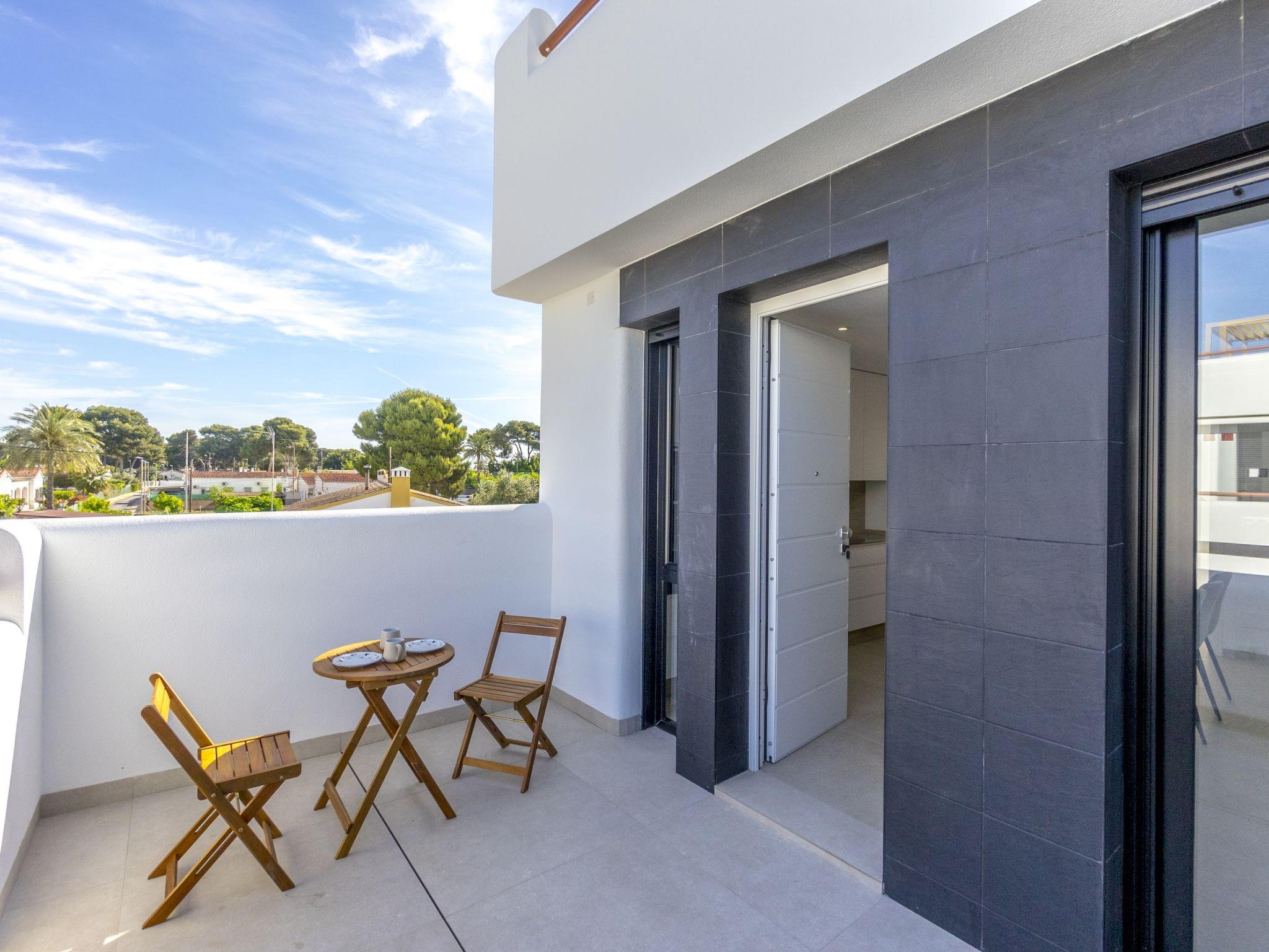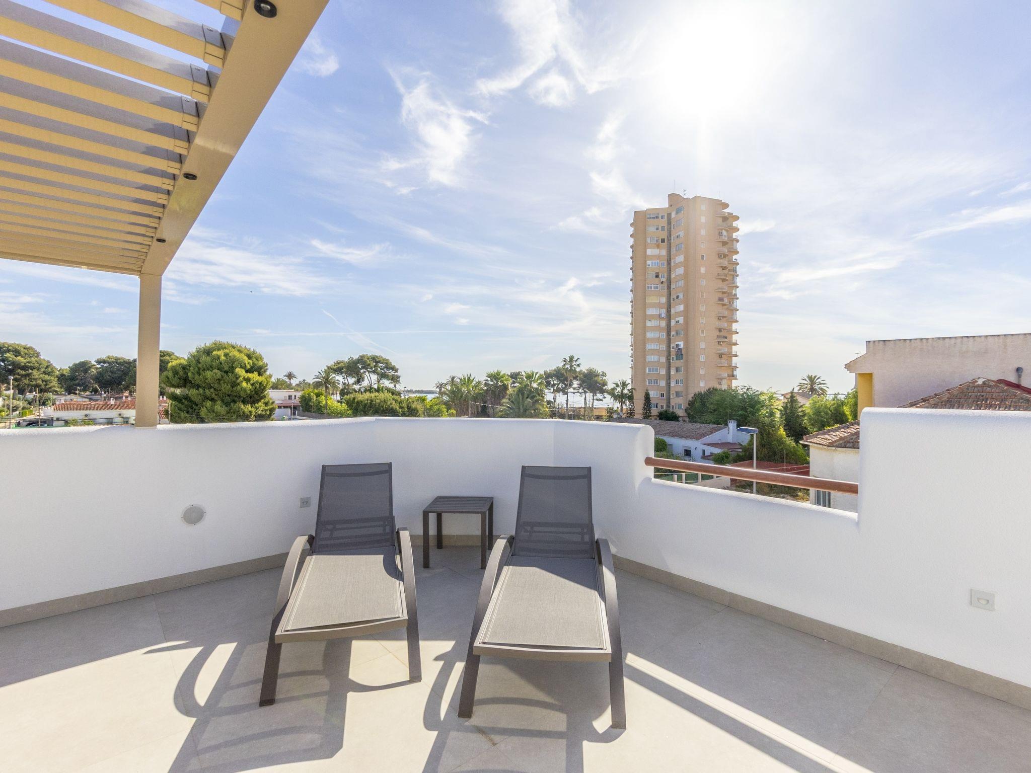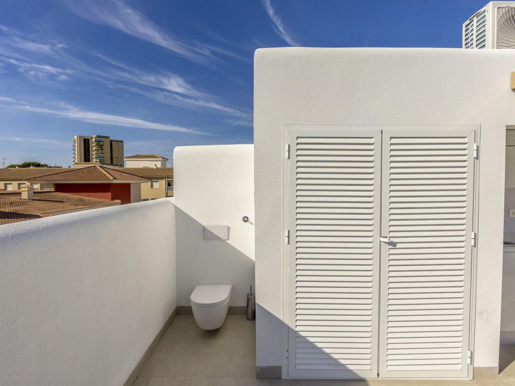 "Tropical Beach Penthouse", 3-room penthouse 64 m2 on 1st floor. Practical and comfortable furnishings: large living/dining room with 1 double sofabed (140 cm, length 190 cm), air conditioning and forced-air heating. Exit to the balcony. 1 room with 1 french bed (150 cm, length 190 cm), shower/WC, air conditioning and forced-air heating. 1 room with 1 french bed (150 cm, length 190 cm), air conditioning and forced-air heating. Open kitchen (oven, dishwasher, 4 ceramic glass hob hotplates, kettle, microwave, freezer, electric coffee machine). Shower/WC. Balcony, large terrace 80 m2. Terrace furniture, deck chairs. View of the resort. Facilities: washing machine, iron, children's high chair, baby cot for up to 2 year olds, hair dryer. Internet (WiFi, free). Please note: suitable for families. Non-smokers only. No lift. Outdoor kitchen, outdoor shower and outdoor WC on the rooftop. VV.MU.4442-1 // Reg. Nr.: ESFCTU0000300320008092230000000000000000VV/MU/4442-10