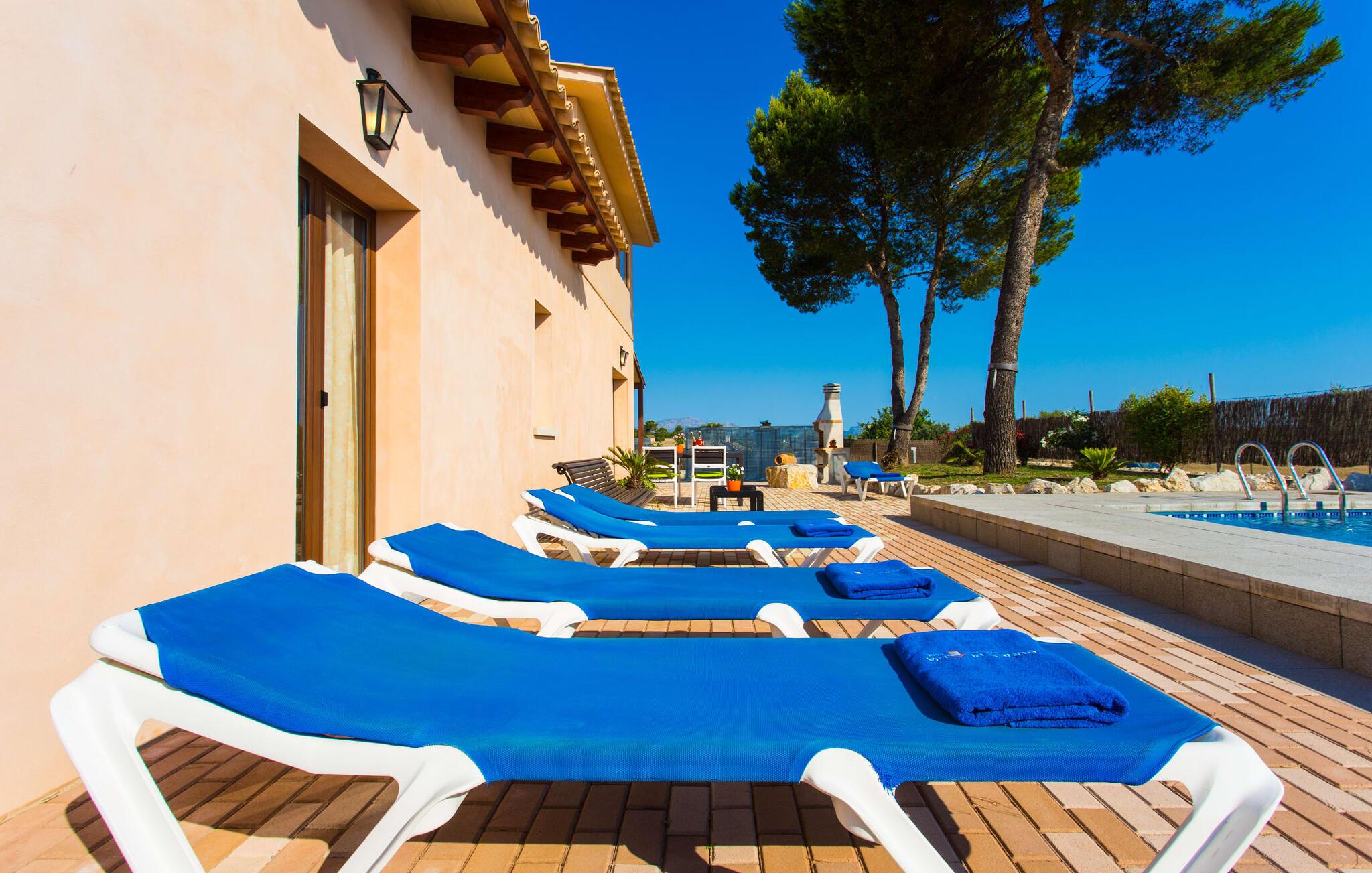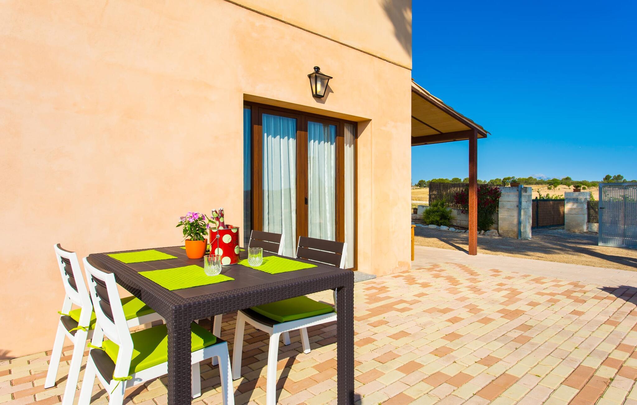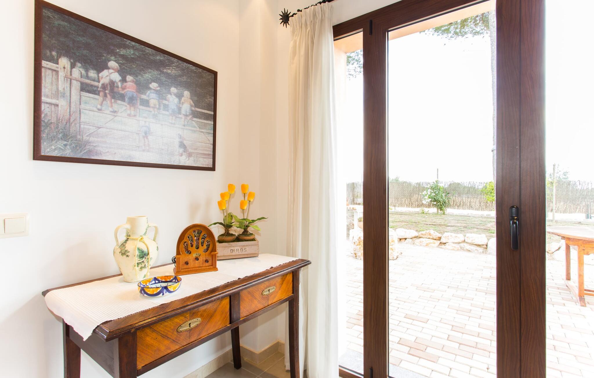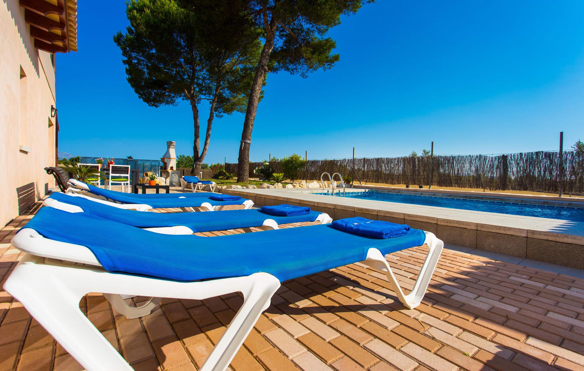 Den traditionelle, sydvendte villa "Saraix" blev fuldstændig restaureret i 2014. Den solbeskinnede villa byder os hjertelig velkommen i en delikat terracotta farve på en ejendom omgivet af fyrretræer. Mellem villaen og poolen er der en solterrasse med i alt 8 liggestole og 1 parasol. Efter svømning kan I nyde den varme sydlige sol på liggestolene eller se jeres børn lege i poolen. En træbænk og et polyrattanbord med komfortable stole og æblegrønne hynder giver mulighed for at tilbringe sociale stunder. Under en overdækket terrasse på siden af huset er der endnu en udendørs siddeplads med træmøbler og de samme spændende grønne hynder, samt endnu en træbænk i skyggen. Sætter I begge ensembler sammen, kan I nyde en underholdende grillaften, da hver af de to terrasser har en muret grill. En udvendig trappe på siden af huset fører jer til øverste etage. Over tagterrassen er der adgang til en slags tårnværelse, der er indrettet som en ekstra opholdsstue til afslapning eller som læsesal og byder på en smuk udsigt over den landlige struktur i det omkringliggende område og grunden. Et særligt højdepunkt for os er villaen "Saraix". Ejendommen, der hører til villaen, er faktisk meget mere rummelig, så I kan tage lange ture rundt i ejendommen. Får, grise og høns holdes stadig i en vis afstand fra huset, men de kan selvfølgelig ikke nå Villa “Saraix”. I kan nyde freden og rummet i den landlige beliggenhed. Med undtagelse af tårnrummet ligger alle andre rum i villaen i stueetagen, som er tilgængelig via flere gulv-til-loft terrassedøre. Dette gælder også delvist for soveværelser, hvor man kan få adgang til haven direkte om morgenen. Villaens indretning er meget ny og har en tidløs smag. Hvide, glatte vægge med store gulvfliser i lys jordfarve suppleres af lyspunkter indlejret i lofterne og sikrer en moderne standard. Det fritlagte bjælkeloft og de antikke træstole giver lidt mallorcansk hygge i stuen, som er indrettet med en orange og en chokoladebrun sofa. Perfekt til en hyggelig aften med fjernsyn eller en social aften. Det separate køkken er meget stilfuldt udstyret. Et langt tekøkken med ønskværdig teknisk komfort og fuldt udstyr, som I ikke vil undvære, når I er på ferie, imponerer med træfronter, der suppleres af marmor af høj kvalitet. Her er også monteret loftspots; Spisebordet kan trækkes ud og giver alle gæster plads nok til fælles måltider. De 4 soveværelser har enten dobbeltsenge eller separate enkeltsenge; Brugen eller distributionen kan ændres af gæsterne efter behov. Der er plads nok til jeres ferietøj i de indbyggede skabe. De to højkvalitetsbadeværelser med brusekabine er yderst moderne. Bruserne er designet med sten af høj kvalitet. De indmurede bruseområders mørke marmor danner en elegant kontrast til den lyse, højglans natursten, der blev lagt på de øvrige vægge. Uanset om I rejser med venner eller med to familier - villaen byder på plads nok til alle gæster til en yderst moderat pris i en vidunderlig landlig beliggenhed og alligevel tæt på stranden og byen. Placeringen af den ukomplicerede villa "Saraix" er et overbevisende argument for os. Det tager cirka 7 minutter at komme til den smukke kystby Can Picafort, mens der kun er cirka 4 km til Santa Margalida. Den attraktive villa ligger cirka 450 m fra vejen, der forbinder begge populære byer. Begge byer er nemme at nå for shopping. Der er et fantastisk ugentligt marked i Santa Margalida om tirsdagen og lørdagen, og om fredagen kan I køre til Can Picafort-markedet. Can Picafort er en del af Bahiá de Alcúdia, som forbinder kilometervis af meget smukke sandstrande som en perlehalskæde. I Can Picafort finder I adskillige barer og restauranter samt et pulserende natteliv i de lokale klubber. I får en helt anden oplevelse i smukke Santa Margalida, en af de smukkeste og mest maleriske landsbyer på øen, hvor I stadig kan opleve det originale Mallorca. På grund af den bekvemme beliggenhed har I valget mellem mange forskellige ting på ferien og på Villa “Saraix” kan I forvente begivenhedsrige dagsture, hvor I kan runde en afslappende dag af med en afslappende grill. Vi hos Fincallorca ønsker jer en varieret, afslappende og behagelig ferie. Villaen “Saraix” blev restaureret i 2014 og er beliggende i landlige omgivelser mellem byerne Santa Margalida og Can Picafort. Santa Margalida ligger kun 4 km væk, og Can Picafort ligger også kun 7 km væk. Her kan I gøre jeres indkøb og gå til markederne på forskellige dage i ugen, hvor I kan finde frisk frugt og grøntsager. Strandene i Alcúdia-bugten, som alle er opstillet som en perlerække, ligger kun få minutter væk i bil.