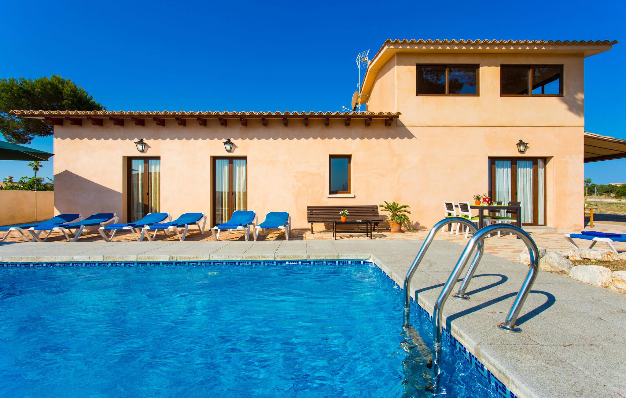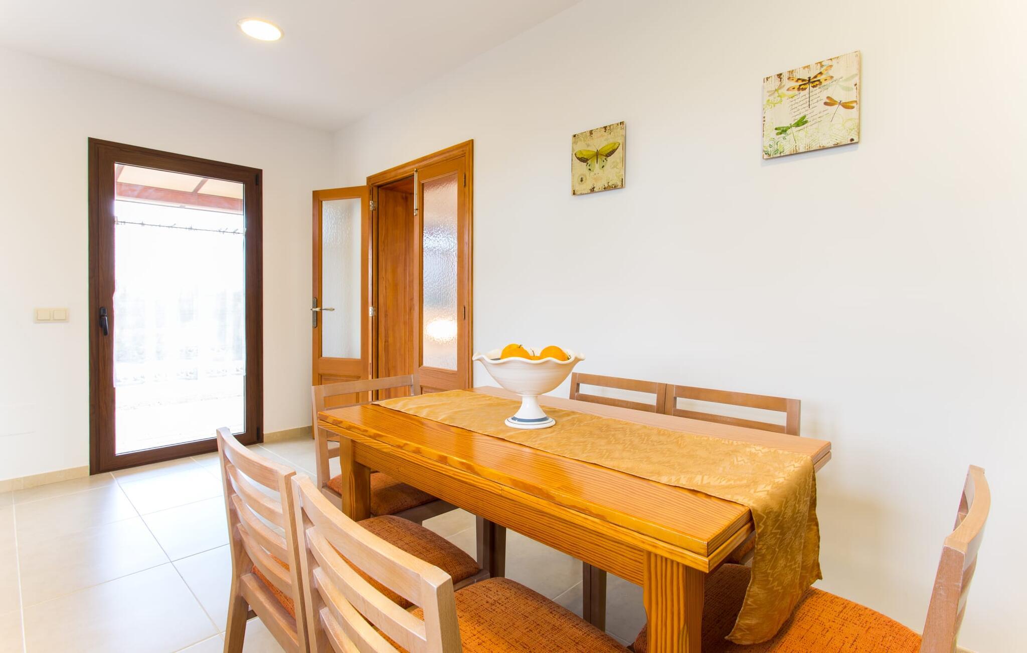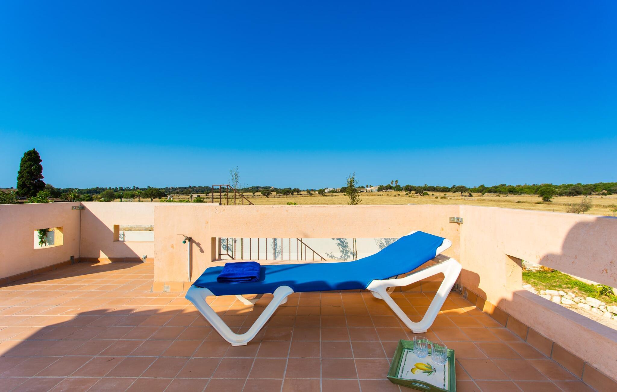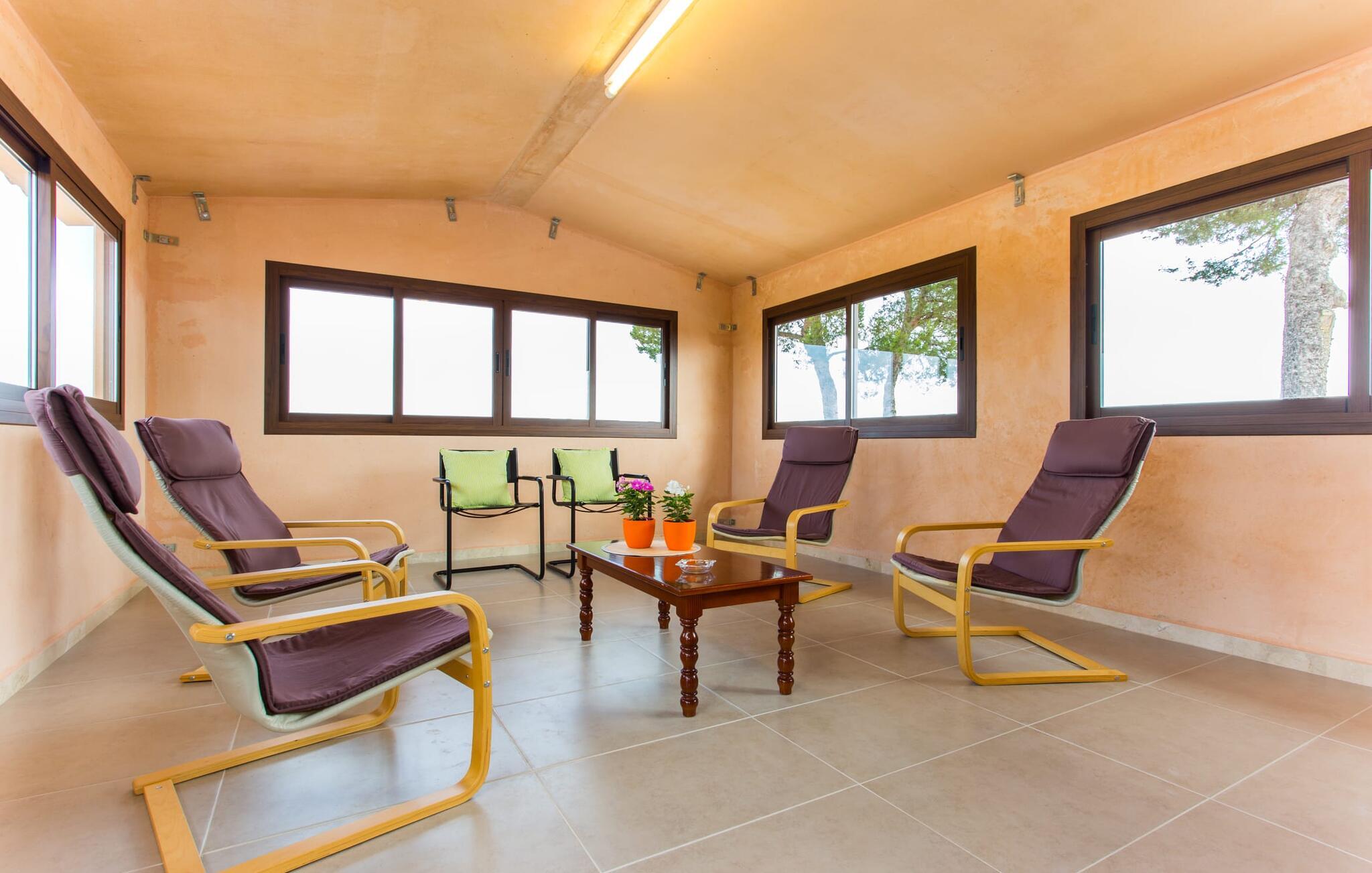 Den traditionelle, sydvendte villa "Saraix" blev fuldstændig restaureret i 2014. Den solbeskinnede villa byder os hjertelig velkommen i en delikat terracotta farve på en ejendom omgivet af fyrretræer. Mellem villaen og poolen er der en solterrasse med i alt 8 liggestole og 1 parasol. Efter svømning kan I nyde den varme sydlige sol på liggestolene eller se jeres børn lege i poolen. En træbænk og et polyrattanbord med komfortable stole og æblegrønne hynder giver mulighed for at tilbringe sociale stunder. Under en overdækket terrasse på siden af huset er der endnu en udendørs siddeplads med træmøbler og de samme spændende grønne hynder, samt endnu en træbænk i skyggen. Sætter I begge ensembler sammen, kan I nyde en underholdende grillaften, da hver af de to terrasser har en muret grill. En udvendig trappe på siden af huset fører jer til øverste etage. Over tagterrassen er der adgang til en slags tårnværelse, der er indrettet som en ekstra opholdsstue til afslapning eller som læsesal og byder på en smuk udsigt over den landlige struktur i det omkringliggende område og grunden. Et særligt højdepunkt for os er villaen "Saraix". Ejendommen, der hører til villaen, er faktisk meget mere rummelig, så I kan tage lange ture rundt i ejendommen. Får, grise og høns holdes stadig i en vis afstand fra huset, men de kan selvfølgelig ikke nå Villa “Saraix”. I kan nyde freden og rummet i den landlige beliggenhed. Med undtagelse af tårnrummet ligger alle andre rum i villaen i stueetagen, som er tilgængelig via flere gulv-til-loft terrassedøre. Dette gælder også delvist for soveværelser, hvor man kan få adgang til haven direkte om morgenen. Villaens indretning er meget ny og har en tidløs smag. Hvide, glatte vægge med store gulvfliser i lys jordfarve suppleres af lyspunkter indlejret i lofterne og sikrer en moderne standard. Det fritlagte bjælkeloft og de antikke træstole giver lidt mallorcansk hygge i stuen, som er indrettet med en orange og en chokoladebrun sofa. Perfekt til en hyggelig aften med fjernsyn eller en social aften. Det separate køkken er meget stilfuldt udstyret. Et langt tekøkken med ønskværdig teknisk komfort og fuldt udstyr, som I ikke vil undvære, når I er på ferie, imponerer med træfronter, der suppleres af marmor af høj kvalitet. Her er også monteret loftspots; Spisebordet kan trækkes ud og giver alle gæster plads nok til fælles måltider. De 4 soveværelser har enten dobbeltsenge eller separate enkeltsenge; Brugen eller distributionen kan ændres af gæsterne efter behov. Der er plads nok til jeres ferietøj i de indbyggede skabe. De to højkvalitetsbadeværelser med brusekabine er yderst moderne. Bruserne er designet med sten af høj kvalitet. De indmurede bruseområders mørke marmor danner en elegant kontrast til den lyse, højglans natursten, der blev lagt på de øvrige vægge. Uanset om I rejser med venner eller med to familier - villaen byder på plads nok til alle gæster til en yderst moderat pris i en vidunderlig landlig beliggenhed og alligevel tæt på stranden og byen. Placeringen af den ukomplicerede villa "Saraix" er et overbevisende argument for os. Det tager cirka 7 minutter at komme til den smukke kystby Can Picafort, mens der kun er cirka 4 km til Santa Margalida. Den attraktive villa ligger cirka 450 m fra vejen, der forbinder begge populære byer. Begge byer er nemme at nå for shopping. Der er et fantastisk ugentligt marked i Santa Margalida om tirsdagen og lørdagen, og om fredagen kan I køre til Can Picafort-markedet. Can Picafort er en del af Bahiá de Alcúdia, som forbinder kilometervis af meget smukke sandstrande som en perlehalskæde. I Can Picafort finder I adskillige barer og restauranter samt et pulserende natteliv i de lokale klubber. I får en helt anden oplevelse i smukke Santa Margalida, en af de smukkeste og mest maleriske landsbyer på øen, hvor I stadig kan opleve det originale Mallorca. På grund af den bekvemme beliggenhed har I valget mellem mange forskellige ting på ferien og på Villa “Saraix” kan I forvente begivenhedsrige dagsture, hvor I kan runde en afslappende dag af med en afslappende grill. Vi hos Fincallorca ønsker jer en varieret, afslappende og behagelig ferie. Villaen “Saraix” blev restaureret i 2014 og er beliggende i landlige omgivelser mellem byerne Santa Margalida og Can Picafort. Santa Margalida ligger kun 4 km væk, og Can Picafort ligger også kun 7 km væk. Her kan I gøre jeres indkøb og gå til markederne på forskellige dage i ugen, hvor I kan finde frisk frugt og grøntsager. Strandene i Alcúdia-bugten, som alle er opstillet som en perlerække, ligger kun få minutter væk i bil.
