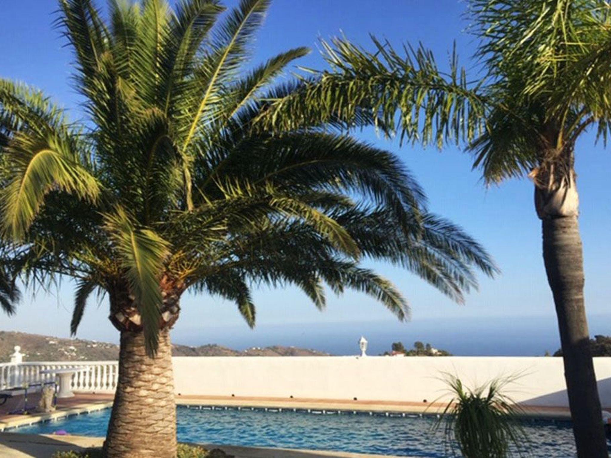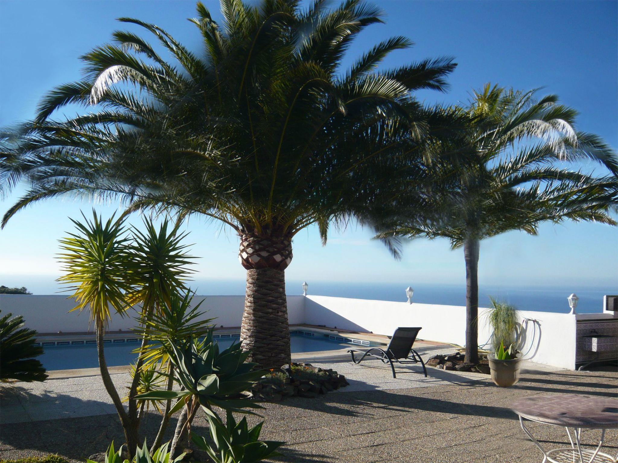 Country mansion with stunning views of the mountains and the ocean on a spacious property with palm trees offering privacy; with a private pool, a garden, a patio, a sauna and a fireplace