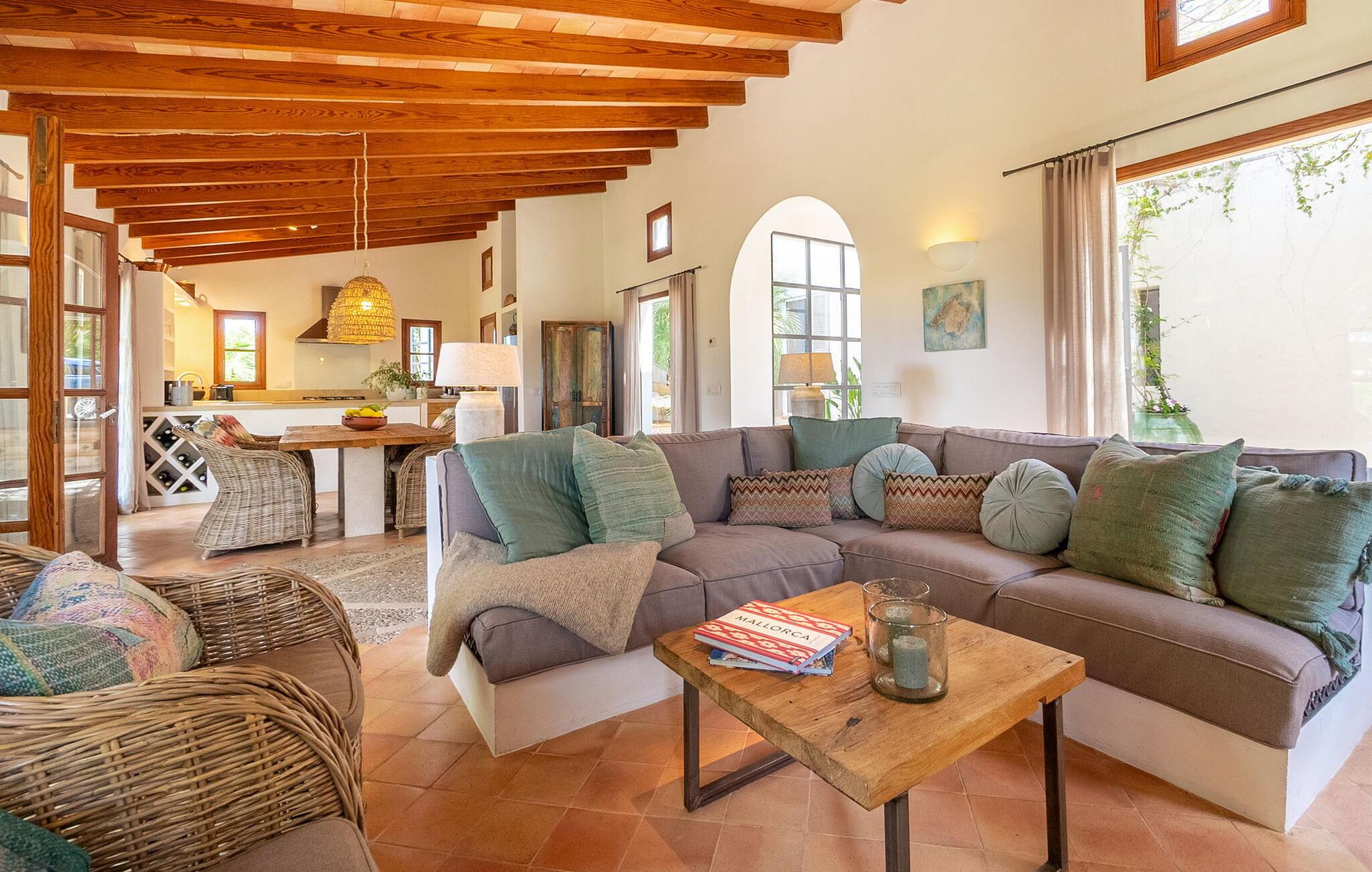 Fincaen "Ses Eretes" ligger midt i en særlig idyllisk have med alle slags hyggelige steder - det gør den til en ideel destination for alle, der søger fred og ro, og som ønsker en all-round æstetisk stemning til deres ferie på Mallorca. I den delvise skygge af ejendommen er der mandel- og oliventræer og små springvand, høje palmer og cypresser giver en typisk ø-stemning. Små stier lavet af natursten løber gennem den rummelige have, som er rig på middelhavsbuske, kaktusarter og blomstrende planter. Føl jer godt tilpas på den stilfulde daybed og nyd den fantastiske udsigt over det omkringliggende landskab med dets grønne, bølgende bakker. Måske får I selskab af de to søde katte, der hører til fincaen. Så snart I har lyst til at køle af, kan I glide ned i den smukke pool, som er så lang, at selv sportslige svømmere vil blive begejstrede. Senere er den overdækkede terrasse det ideelle sted at nyde alle de kulinariske lækkerier, der kan findes på Artàs ugentlige marked. Et glas vin fra en mallorcansk bodega passer vidunderligt til.