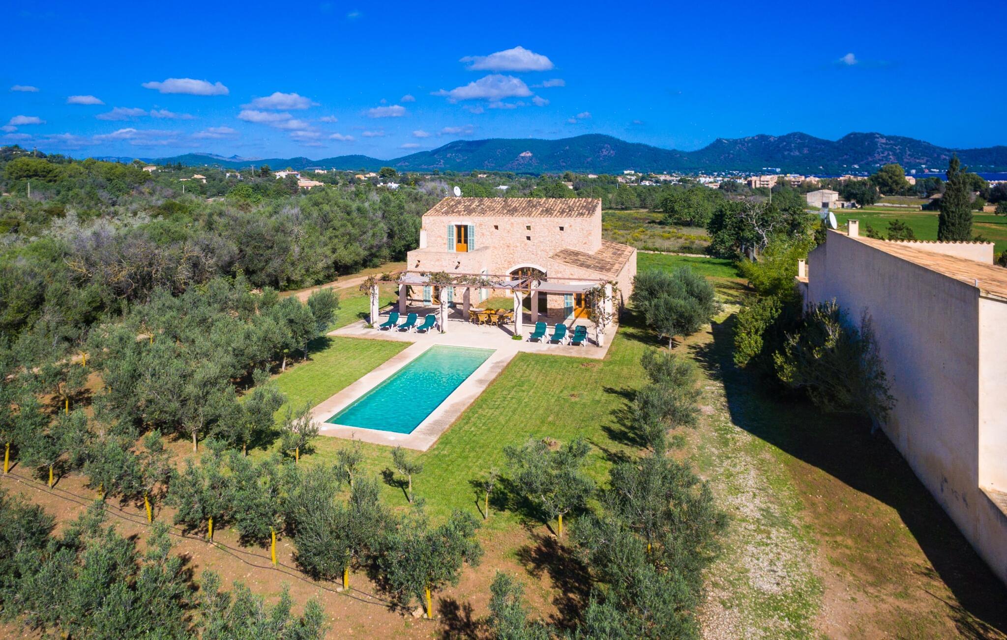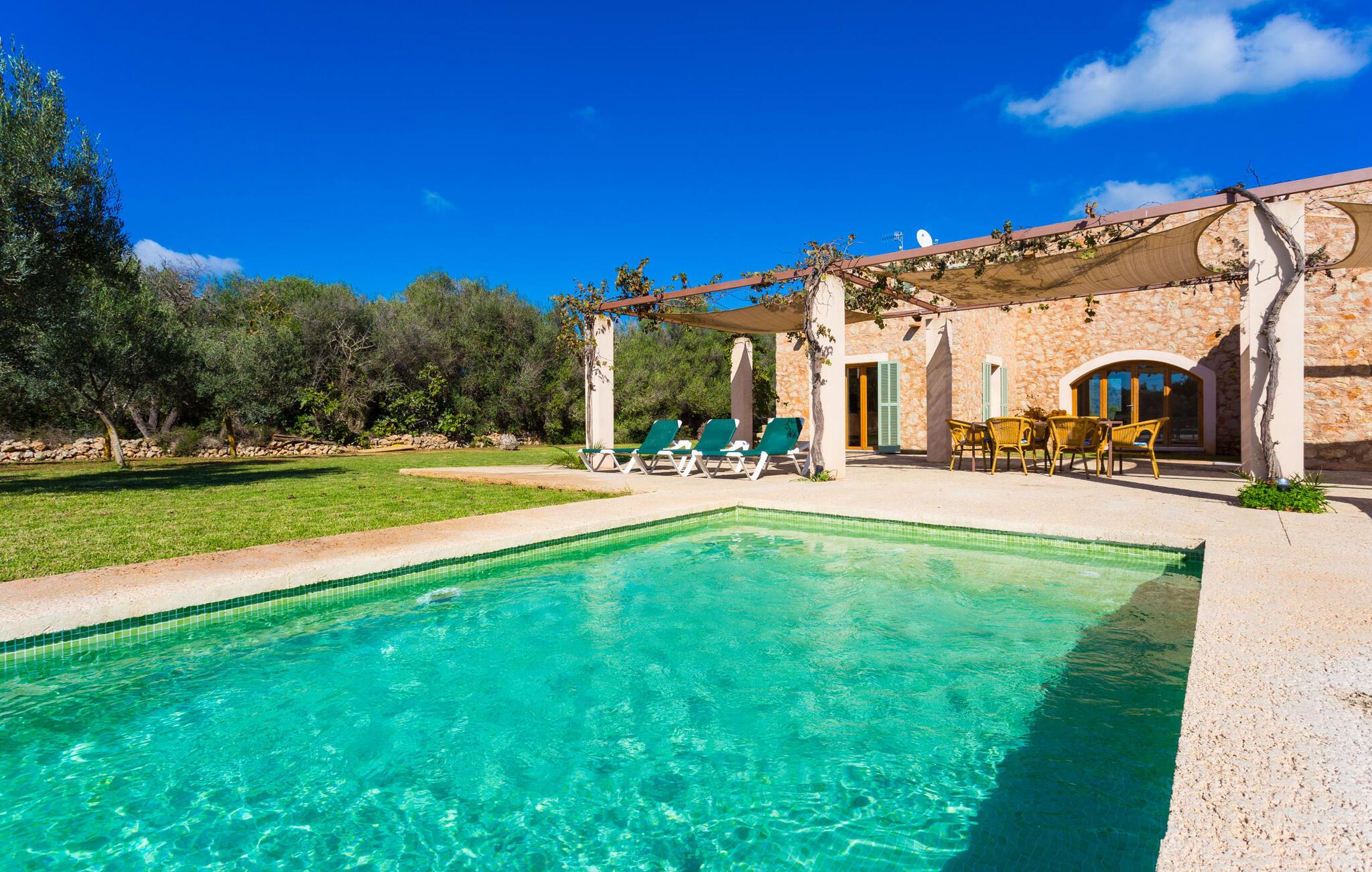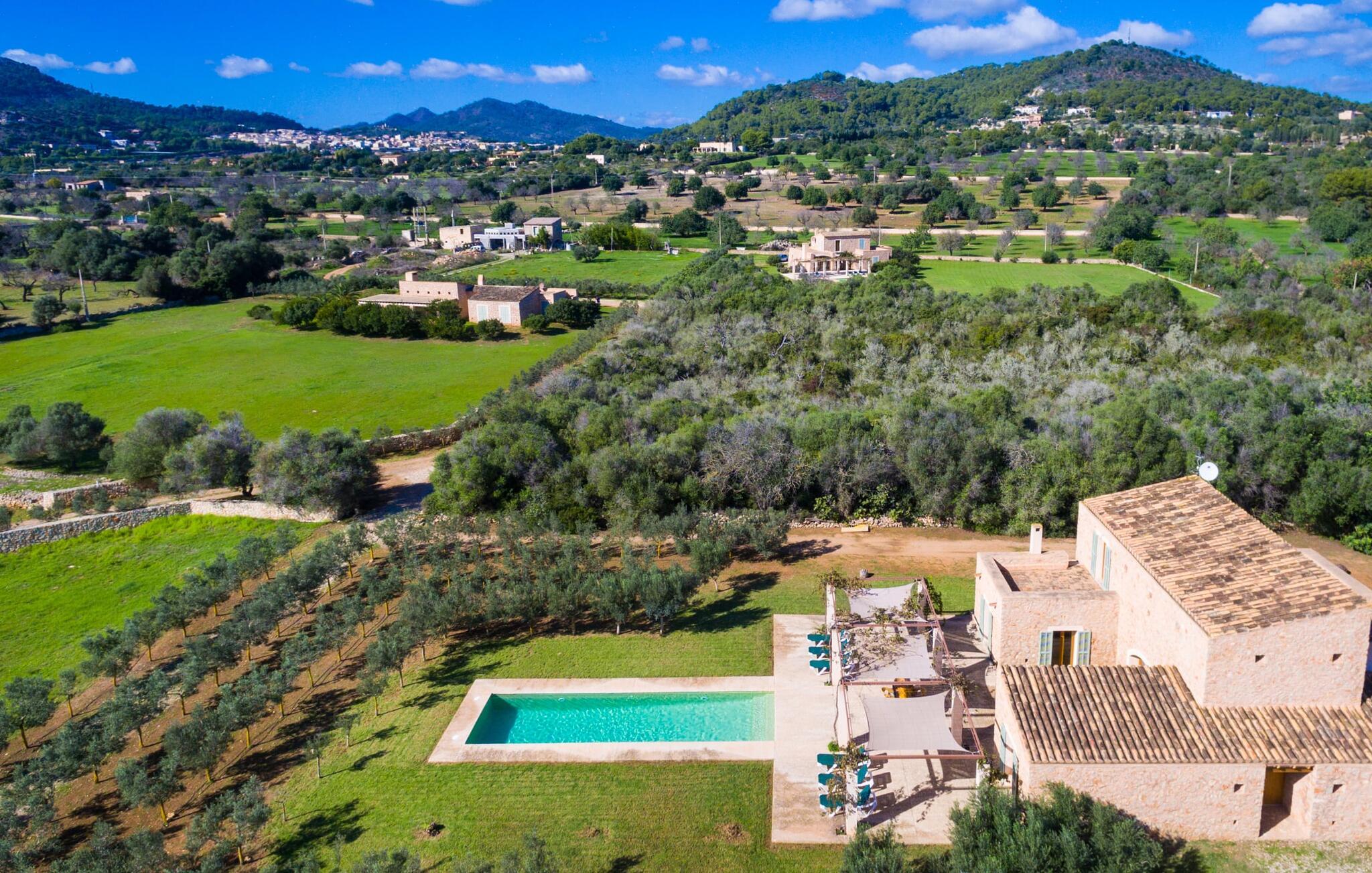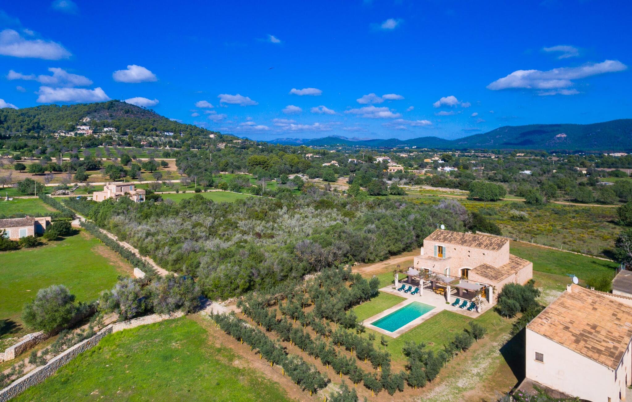 Malerisk indlejret i det grønne landskab i kystsamfundet Son Servera, tilbyder denne moderne villa det ideelle tilflugtssted for feriegæster, der søger fred og afslapning i landlige omgivelser, men også ønsker at køre ad sideveje til de smukke badebyer på østkysten med deres mange forskellige aktiviteter. Den yderst velbevarede ejendom er beklædt med oliventræer, som understreger middelhavsstemningen i naturstensfincaen. Den smukke, åbne plads fungerer også som en græsplæne til at fange solen, samt et godt sted for børn at løbe rundt. Udeområdets store højdepunkt er naturligvis den glitrende turkise pool, som ligger perfekt på den store solterrasse (10 m lang, tilgængelig via brede trin, maksimal dybde mellem 0,60 m og 1,60 m). Her kan I lægge hverdagen langt bag jer, tage et par forfriskende svømmeture og derefter slappe af i den mallorcanske sol på en af liggestolene ved poolen. For at læse lidt ferielæsning eller have en lille snack efter at have brugt tid ved poolen, kan I gøre jer rigtig godt tilpas på terrassen under markiserne draperet med vinstokke. Til siden af huset er der endnu en halvåben terrasse med spisebord og en fantastisk udsigt over de bølgende bakker i det fjerne. Udover køkkenet og med en stor grill er dette et dejligt rum, perfekt til udendørs spisning sammen. Interiøret i villaen "Ses Fonolleres" har et harmonisk rumligt design - moderne og alligevel varmt. Villaen er oversvømmet med lys gennem de mange gulv-til-loft vinduer og adgangsdøre til haven. Rummet i stueetagen er særligt imponerende. Høje hvælvede lofter understreger den rummelige følelse, mens runde buer giver indtryk af en flydende kombination af ophold, spisning og madlavning. Hylder og belysningselementer indbygget i væggene tjener et praktisk og æstetisk formål i hele villaen. Det fuldt udstyrede køkken med ø og disk giver plads til alle til at hjælpe med at tilberede måltider. Har I lyst til at underholde, eller vejret ikke er godt, kan I slappe af i sofaen foran fladskærms-tv'et eller se en spændende dvd sammen. Tre soveværelser (1 x med dobbeltseng, 2 x med to enkeltsenge, masser af opbevaringsplads) tilbyder en afslappende, fredelig søvn. Værelserne har typisk mallorcansk indretning med kridhvide vægge og traditionelle bjælkelofter. Det ene af de to badeværelser med naturligt lys i stueplan er adskilt og er derfor praktisk som gæstebadeværelse. En bred trappe fører fra indgangspartiet til øverste etage. I et lille galleri er der en sofa, hvor I kan nyde en bog. Bag galleriet ligger det tredje soveværelse med tilhørende badeværelse og direkte udgang til altanen, som byder på en vidunderlig, uhindret udsigt over det omkringliggende landskab. Havde I tid nok til at nyde komforten i villaen? Vil I have lidt strandsjov? I er kun 12 minutters gang fra Cala Bona, hvor adskillige aktiviteter og faciliteter er tilgængelige. Den nærliggende bugt er velegnet til familier med små børn - bølgebrydere markerer et eksklusivt badeområde med en svag skråning, der fører til dybere vand. Er større bølger og mindre travlhed mere jeres ting? Derefter tager vi til Sa Marjal strand med en smuk udsigt over det grønne landskab. Det lokkende turiststed Cala Millor, med en attraktiv shoppingpromenade og et bredt udvalg af barer, caféer og restauranter, ligger kun 5 minutter fra villaen. For at lære stedet lidt bedre at kende og nyde helt friske produkter og mallorcanske specialiteter, anbefaler vi, at I tager et kig på det ugentlige marked i Son Servera, som finder sted fredag eftermiddag. Denne smukke villa ligger på en 8.000 m² stor grund i en solrig, sydvendt beliggenhed i et landligt område på den sydlige del af øen. På grund af de landlige omgivelser nyder dette sted absolut fred, selvom det kun ligger et stenkast fra badebugter som Cala Bona og andre smukke sandstrande. Den lille by Son Servera og den nærliggende kystby Cala Millor ligger kun 5 minutter væk i bil og byder på shopping og restauranter.