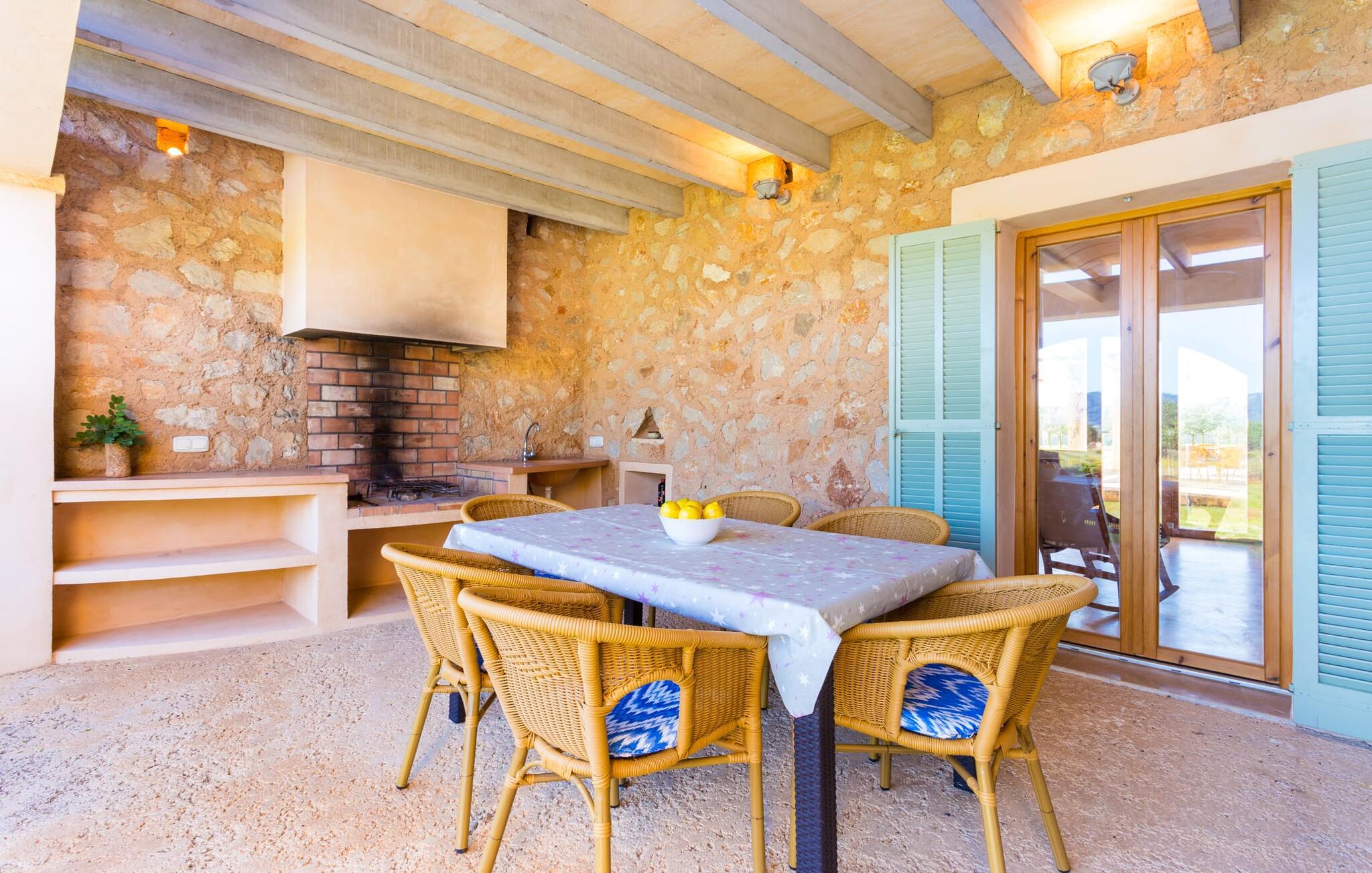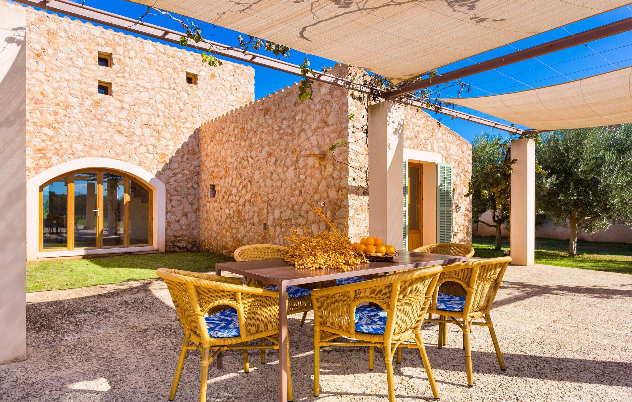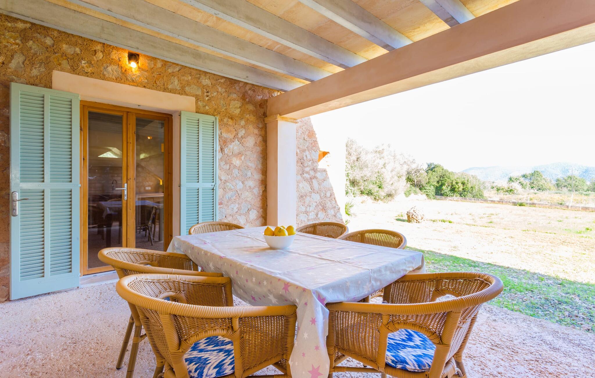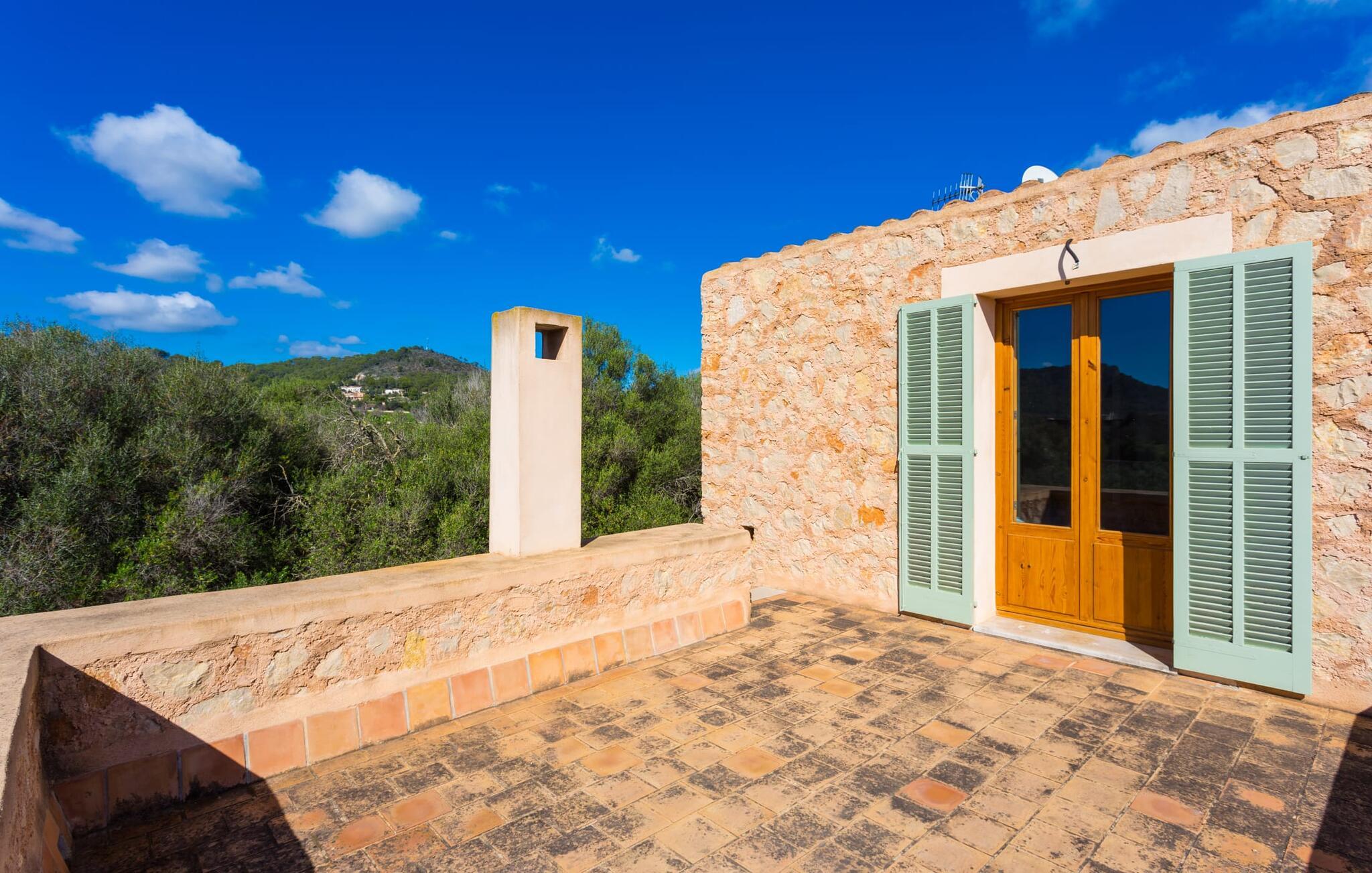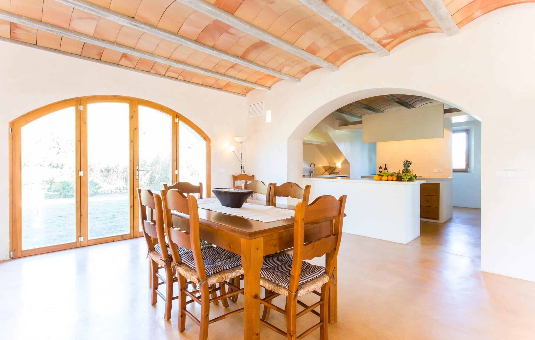 Malerisk indlejret i det grønne landskab i kystsamfundet Son Servera, tilbyder denne moderne villa det ideelle tilflugtssted for feriegæster, der søger fred og afslapning i landlige omgivelser, men også ønsker at køre ad sideveje til de smukke badebyer på østkysten med deres mange forskellige aktiviteter. Den yderst velbevarede ejendom er beklædt med oliventræer, som understreger middelhavsstemningen i naturstensfincaen. Den smukke, åbne plads fungerer også som en græsplæne til at fange solen, samt et godt sted for børn at løbe rundt. Udeområdets store højdepunkt er naturligvis den glitrende turkise pool, som ligger perfekt på den store solterrasse (10 m lang, tilgængelig via brede trin, maksimal dybde mellem 0,60 m og 1,60 m). Her kan I lægge hverdagen langt bag jer, tage et par forfriskende svømmeture og derefter slappe af i den mallorcanske sol på en af liggestolene ved poolen. For at læse lidt ferielæsning eller have en lille snack efter at have brugt tid ved poolen, kan I gøre jer rigtig godt tilpas på terrassen under markiserne draperet med vinstokke. Til siden af huset er der endnu en halvåben terrasse med spisebord og en fantastisk udsigt over de bølgende bakker i det fjerne. Udover køkkenet og med en stor grill er dette et dejligt rum, perfekt til udendørs spisning sammen. Interiøret i villaen "Ses Fonolleres" har et harmonisk rumligt design - moderne og alligevel varmt. Villaen er oversvømmet med lys gennem de mange gulv-til-loft vinduer og adgangsdøre til haven. Rummet i stueetagen er særligt imponerende. Høje hvælvede lofter understreger den rummelige følelse, mens runde buer giver indtryk af en flydende kombination af ophold, spisning og madlavning. Hylder og belysningselementer indbygget i væggene tjener et praktisk og æstetisk formål i hele villaen. Det fuldt udstyrede køkken med ø og disk giver plads til alle til at hjælpe med at tilberede måltider. Har I lyst til at underholde, eller vejret ikke er godt, kan I slappe af i sofaen foran fladskærms-tv'et eller se en spændende dvd sammen. Tre soveværelser (1 x med dobbeltseng, 2 x med to enkeltsenge, masser af opbevaringsplads) tilbyder en afslappende, fredelig søvn. Værelserne har typisk mallorcansk indretning med kridhvide vægge og traditionelle bjælkelofter. Det ene af de to badeværelser med naturligt lys i stueplan er adskilt og er derfor praktisk som gæstebadeværelse. En bred trappe fører fra indgangspartiet til øverste etage. I et lille galleri er der en sofa, hvor I kan nyde en bog. Bag galleriet ligger det tredje soveværelse med tilhørende badeværelse og direkte udgang til altanen, som byder på en vidunderlig, uhindret udsigt over det omkringliggende landskab. Havde I tid nok til at nyde komforten i villaen? Vil I have lidt strandsjov? I er kun 12 minutters gang fra Cala Bona, hvor adskillige aktiviteter og faciliteter er tilgængelige. Den nærliggende bugt er velegnet til familier med små børn - bølgebrydere markerer et eksklusivt badeområde med en svag skråning, der fører til dybere vand. Er større bølger og mindre travlhed mere jeres ting? Derefter tager vi til Sa Marjal strand med en smuk udsigt over det grønne landskab. Det lokkende turiststed Cala Millor, med en attraktiv shoppingpromenade og et bredt udvalg af barer, caféer og restauranter, ligger kun 5 minutter fra villaen. For at lære stedet lidt bedre at kende og nyde helt friske produkter og mallorcanske specialiteter, anbefaler vi, at I tager et kig på det ugentlige marked i Son Servera, som finder sted fredag eftermiddag. Denne smukke villa ligger på en 8.000 m² stor grund i en solrig, sydvendt beliggenhed i et landligt område på den sydlige del af øen. På grund af de landlige omgivelser nyder dette sted absolut fred, selvom det kun ligger et stenkast fra badebugter som Cala Bona og andre smukke sandstrande. Den lille by Son Servera og den nærliggende kystby Cala Millor ligger kun 5 minutter væk i bil og byder på shopping og restauranter.