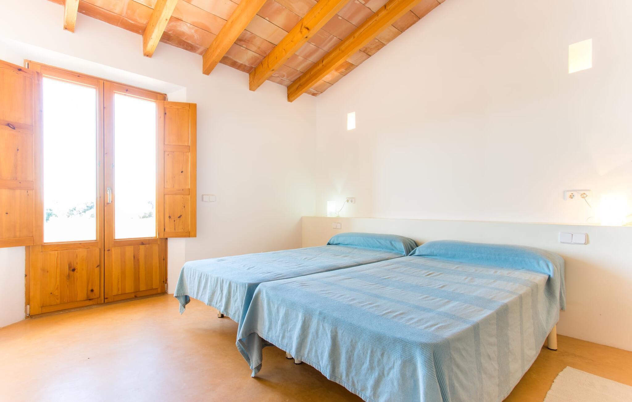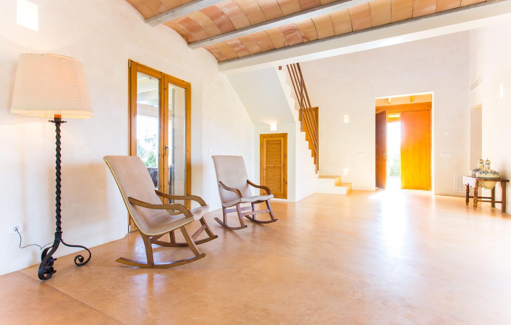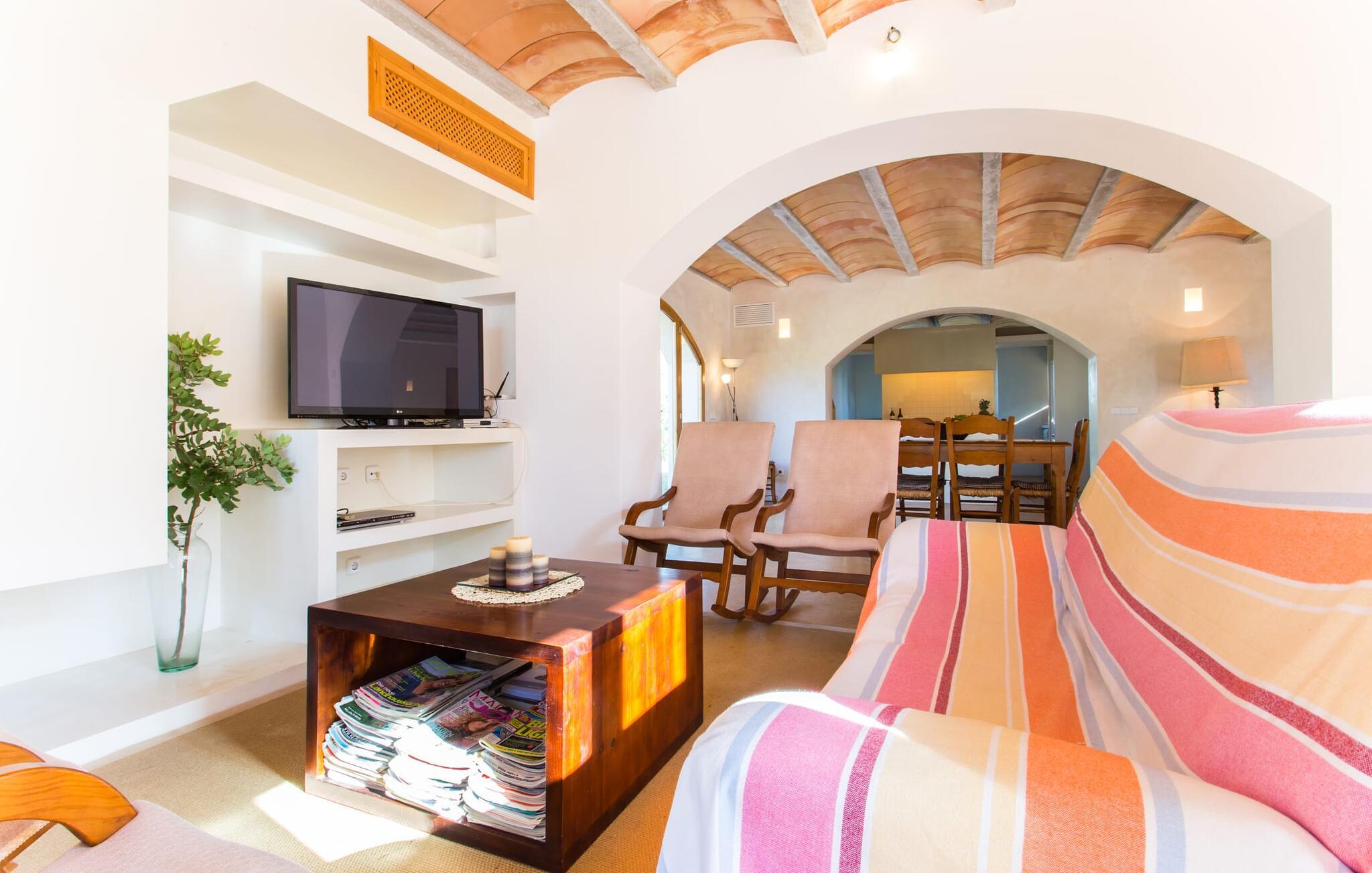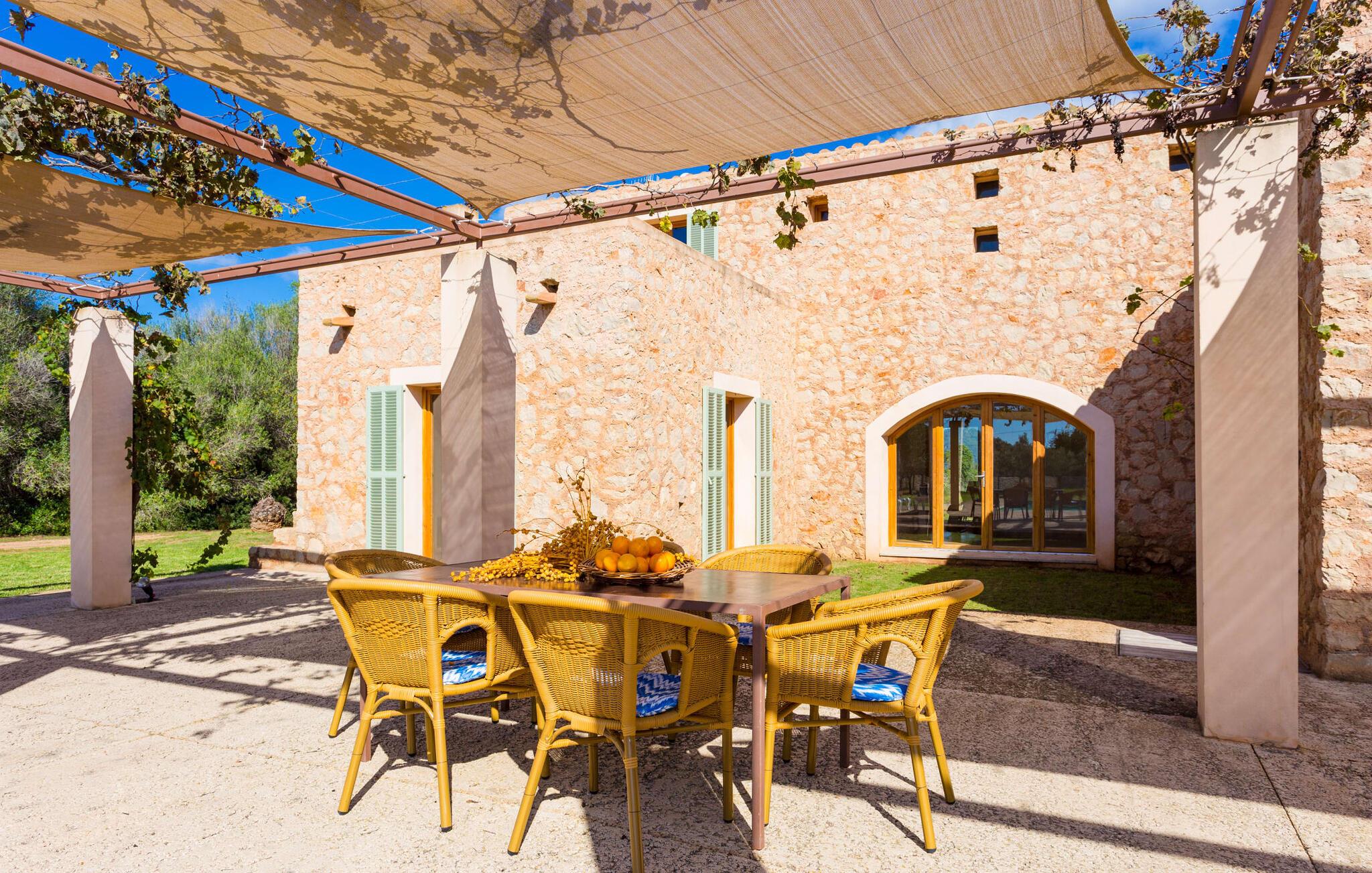 Malerisk indlejret i det grønne landskab i kystsamfundet Son Servera, tilbyder denne moderne villa det ideelle tilflugtssted for feriegæster, der søger fred og afslapning i landlige omgivelser, men også ønsker at køre ad sideveje til de smukke badebyer på østkysten med deres mange forskellige aktiviteter. Den yderst velbevarede ejendom er beklædt med oliventræer, som understreger middelhavsstemningen i naturstensfincaen. Den smukke, åbne plads fungerer også som en græsplæne til at fange solen, samt et godt sted for børn at løbe rundt. Udeområdets store højdepunkt er naturligvis den glitrende turkise pool, som ligger perfekt på den store solterrasse (10 m lang, tilgængelig via brede trin, maksimal dybde mellem 0,60 m og 1,60 m). Her kan I lægge hverdagen langt bag jer, tage et par forfriskende svømmeture og derefter slappe af i den mallorcanske sol på en af liggestolene ved poolen. For at læse lidt ferielæsning eller have en lille snack efter at have brugt tid ved poolen, kan I gøre jer rigtig godt tilpas på terrassen under markiserne draperet med vinstokke. Til siden af huset er der endnu en halvåben terrasse med spisebord og en fantastisk udsigt over de bølgende bakker i det fjerne. Udover køkkenet og med en stor grill er dette et dejligt rum, perfekt til udendørs spisning sammen. Interiøret i villaen "Ses Fonolleres" har et harmonisk rumligt design - moderne og alligevel varmt. Villaen er oversvømmet med lys gennem de mange gulv-til-loft vinduer og adgangsdøre til haven. Rummet i stueetagen er særligt imponerende. Høje hvælvede lofter understreger den rummelige følelse, mens runde buer giver indtryk af en flydende kombination af ophold, spisning og madlavning. Hylder og belysningselementer indbygget i væggene tjener et praktisk og æstetisk formål i hele villaen. Det fuldt udstyrede køkken med ø og disk giver plads til alle til at hjælpe med at tilberede måltider. Har I lyst til at underholde, eller vejret ikke er godt, kan I slappe af i sofaen foran fladskærms-tv'et eller se en spændende dvd sammen. Tre soveværelser (1 x med dobbeltseng, 2 x med to enkeltsenge, masser af opbevaringsplads) tilbyder en afslappende, fredelig søvn. Værelserne har typisk mallorcansk indretning med kridhvide vægge og traditionelle bjælkelofter. Det ene af de to badeværelser med naturligt lys i stueplan er adskilt og er derfor praktisk som gæstebadeværelse. En bred trappe fører fra indgangspartiet til øverste etage. I et lille galleri er der en sofa, hvor I kan nyde en bog. Bag galleriet ligger det tredje soveværelse med tilhørende badeværelse og direkte udgang til altanen, som byder på en vidunderlig, uhindret udsigt over det omkringliggende landskab. Havde I tid nok til at nyde komforten i villaen? Vil I have lidt strandsjov? I er kun 12 minutters gang fra Cala Bona, hvor adskillige aktiviteter og faciliteter er tilgængelige. Den nærliggende bugt er velegnet til familier med små børn - bølgebrydere markerer et eksklusivt badeområde med en svag skråning, der fører til dybere vand. Er større bølger og mindre travlhed mere jeres ting? Derefter tager vi til Sa Marjal strand med en smuk udsigt over det grønne landskab. Det lokkende turiststed Cala Millor, med en attraktiv shoppingpromenade og et bredt udvalg af barer, caféer og restauranter, ligger kun 5 minutter fra villaen. For at lære stedet lidt bedre at kende og nyde helt friske produkter og mallorcanske specialiteter, anbefaler vi, at I tager et kig på det ugentlige marked i Son Servera, som finder sted fredag eftermiddag. Denne smukke villa ligger på en 8.000 m² stor grund i en solrig, sydvendt beliggenhed i et landligt område på den sydlige del af øen. På grund af de landlige omgivelser nyder dette sted absolut fred, selvom det kun ligger et stenkast fra badebugter som Cala Bona og andre smukke sandstrande. Den lille by Son Servera og den nærliggende kystby Cala Millor ligger kun 5 minutter væk i bil og byder på shopping og restauranter.