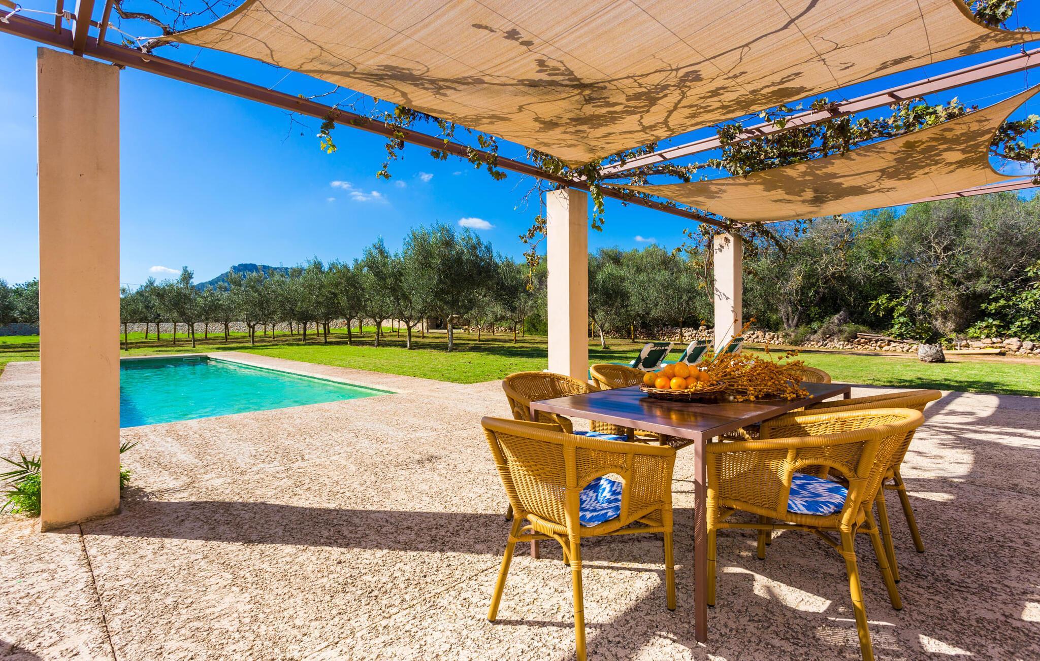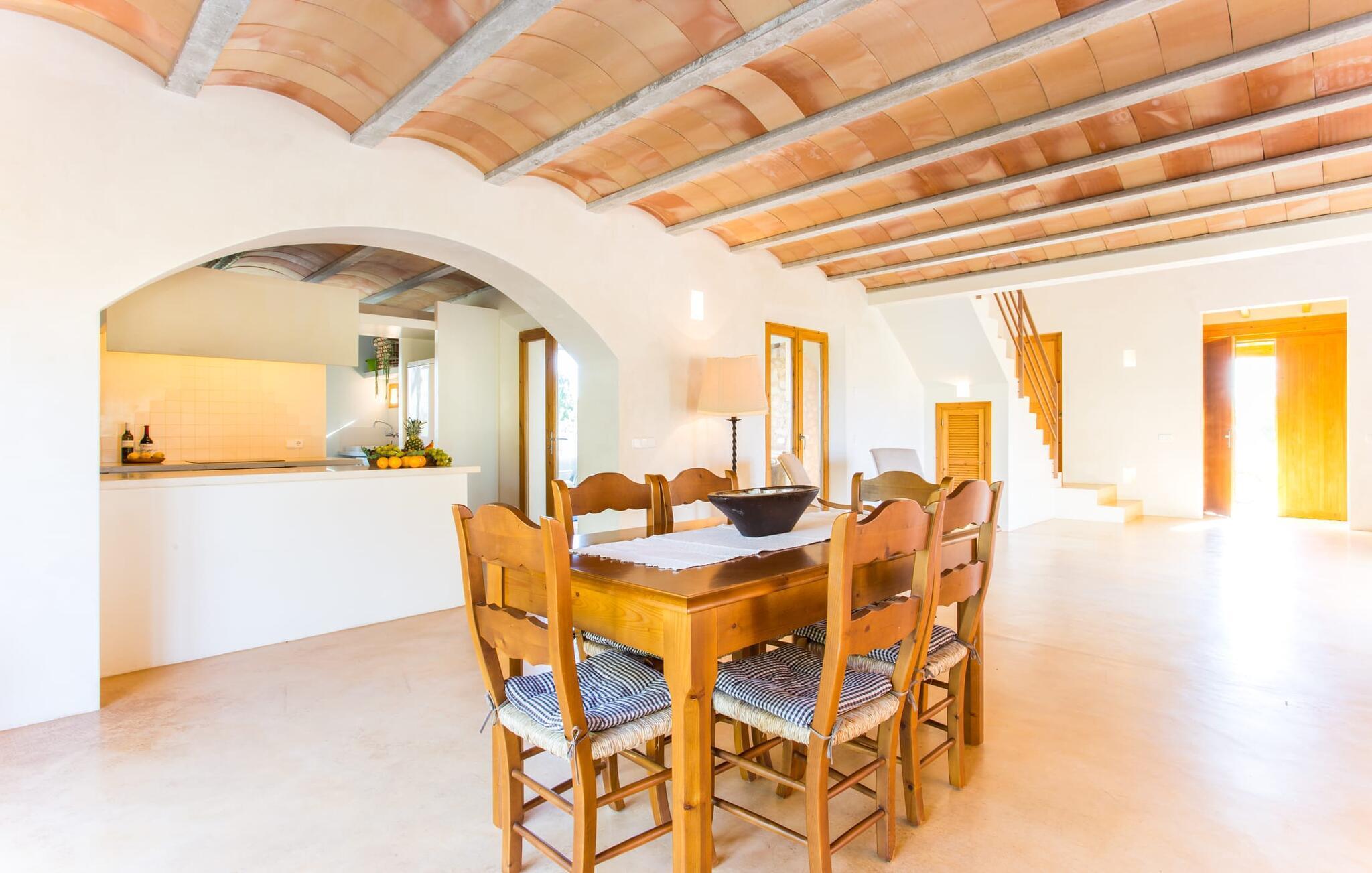 Malerisk indlejret i det grønne landskab i kystsamfundet Son Servera, tilbyder denne moderne villa det ideelle tilflugtssted for feriegæster, der søger fred og afslapning i landlige omgivelser, men også ønsker at køre ad sideveje til de smukke badebyer på østkysten med deres mange forskellige aktiviteter. Den yderst velbevarede ejendom er beklædt med oliventræer, som understreger middelhavsstemningen i naturstensfincaen. Den smukke, åbne plads fungerer også som en græsplæne til at fange solen, samt et godt sted for børn at løbe rundt. Udeområdets store højdepunkt er naturligvis den glitrende turkise pool, som ligger perfekt på den store solterrasse (10 m lang, tilgængelig via brede trin, maksimal dybde mellem 0,60 m og 1,60 m). Her kan du lægge hverdagen langt bag dig, tage et par forfriskende svømmeture og derefter slappe af i den mallorcanske sol på en af liggestolene ved poolen. For at læse lidt ferielæsning eller have en lille snack efter at have brugt tid ved poolen, kan du gøre dig rigtig godt tilpas på terrassen under markiserne draperet med vinstokke. Til siden af huset er der endnu en halvåben terrasse med spisebord og en fantastisk udsigt over de bølgende bakker i det fjerne. Udover køkkenet og med en stor grill er dette et dejligt rum, perfekt til udendørs spisning sammen. Interiøret i villaen "Ses Fonolleres" har et harmonisk rumligt design - moderne og alligevel varmt. Villaen er oversvømmet med lys gennem de mange gulv-til-loft vinduer og adgangsdøre til haven. Rummet i stueetagen er særligt imponerende. Høje hvælvede lofter understreger den rummelige følelse, mens runde buer giver indtryk af en flydende kombination af ophold, spisning og madlavning. Hylder og belysningselementer indbygget i væggene tjener et praktisk og æstetisk formål i hele villaen. Det fuldt udstyrede køkken med ø og disk giver plads til alle til at hjælpe med at tilberede måltider. Har du lyst til at underholde, eller vejret ikke er godt, kan du slappe af i sofaen foran fladskærms-tv'et eller se en spændende dvd sammen. Tre soveværelser (1 x med dobbeltseng, 2 x med to enkeltsenge, masser af opbevaringsplads) tilbyder en afslappende, fredelig søvn. Værelserne har typisk mallorcansk indretning med kridhvide vægge og traditionelle bjælkelofter. Det ene af de to badeværelser med naturligt lys i stueplan er adskilt og er derfor praktisk som gæstebadeværelse. En bred trappe fører fra indgangspartiet til øverste etage. I et lille galleri er der en sofa, hvor du kan nyde en bog. Bag galleriet ligger det tredje soveværelse med tilhørende badeværelse og direkte udgang til altanen, som byder på en vidunderlig, uhindret udsigt over det omkringliggende landskab. Havde du tid nok til at nyde komforten i villaen? Vil du have lidt strandsjov? Du er kun 12 minutters gang fra Cala Bona, hvor adskillige aktiviteter og faciliteter er tilgængelige. Den nærliggende bugt er velegnet til familier med små børn - bølgebrydere markerer et eksklusivt badeområde med en svag skråning, der fører til dybere vand. Er større bølger og mindre travlhed mere din ting? Derefter tager vi til Sa Marjal strand med en smuk udsigt over det grønne landskab. Det lokkende turiststed Cala Millor, med en attraktiv shoppingpromenade og et bredt udvalg af barer, caféer og restauranter, ligger kun 5 minutter fra villaen. For at lære stedet lidt bedre at kende og nyde helt friske produkter og mallorcanske specialiteter, anbefaler vi, at du tager et kig på det ugentlige marked i Son Servera, som finder sted fredag eftermiddag. Denne smukke villa ligger på en 8.000 m² stor grund i en solrig, sydvendt beliggenhed i et landligt område på den sydlige del af øen. På grund af de landlige omgivelser nyder dette sted absolut fred, selvom det kun ligger et stenkast fra badebugter som Cala Bona og andre smukke sandstrande. Den lille by Son Servera og den nærliggende kystby Cala Millor ligger kun 5 minutter væk i bil og byder på shopping og restauranter. Dette er et Fincallorca feriehus.