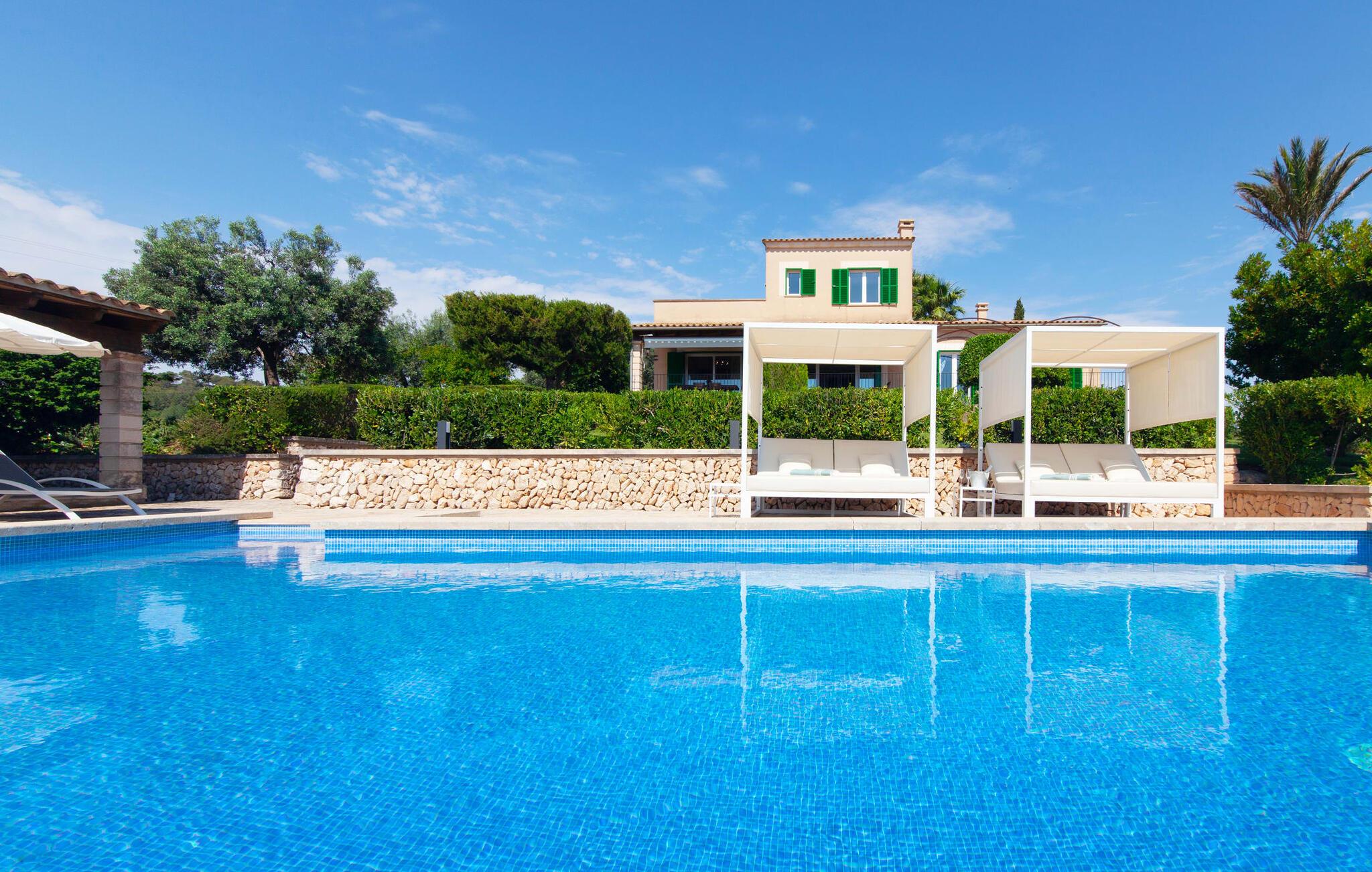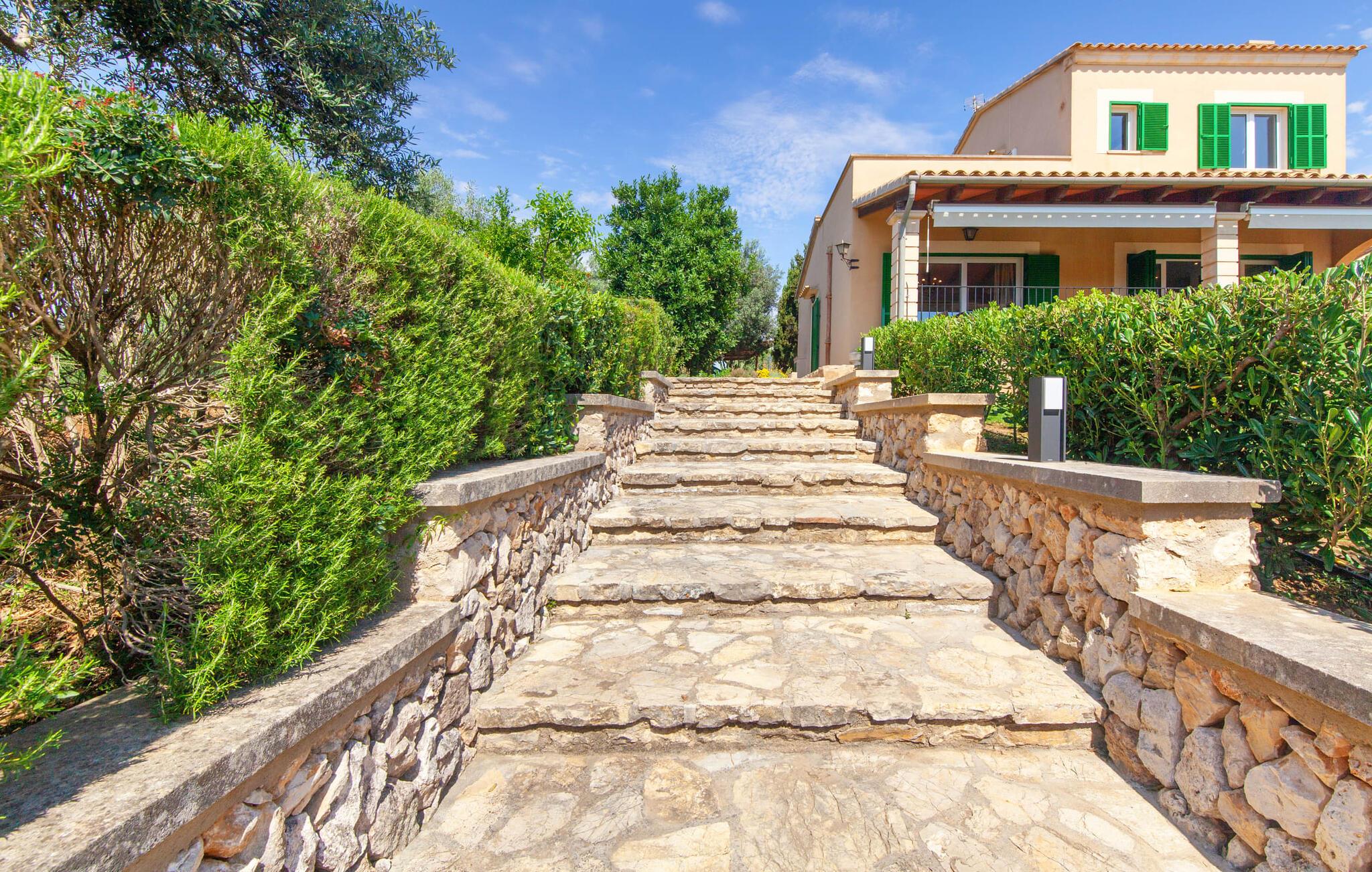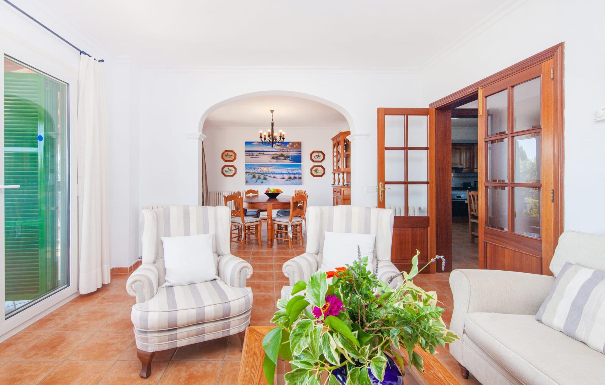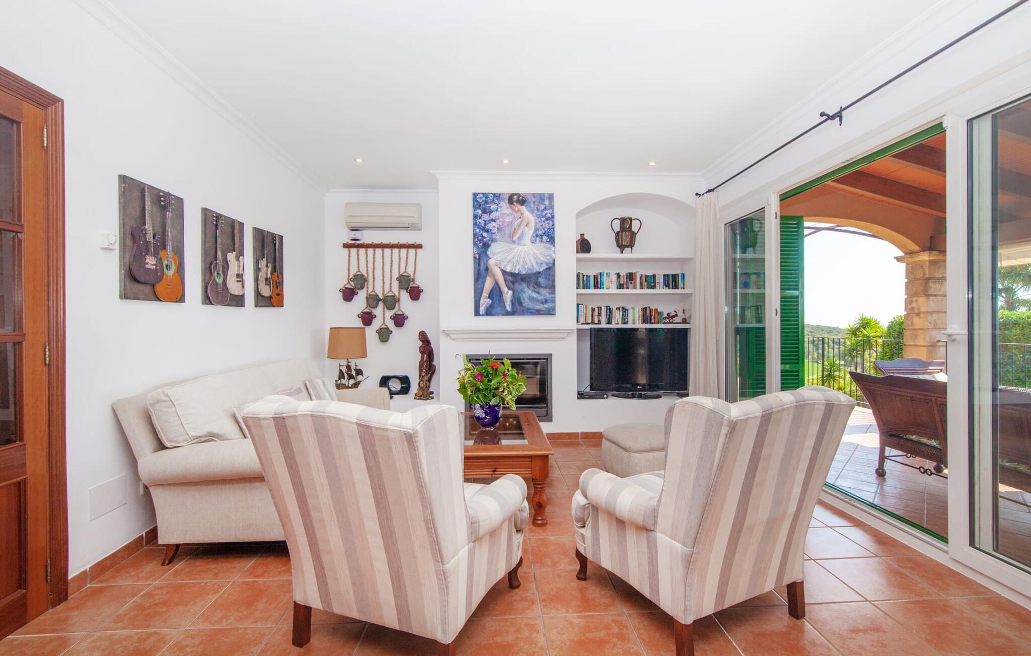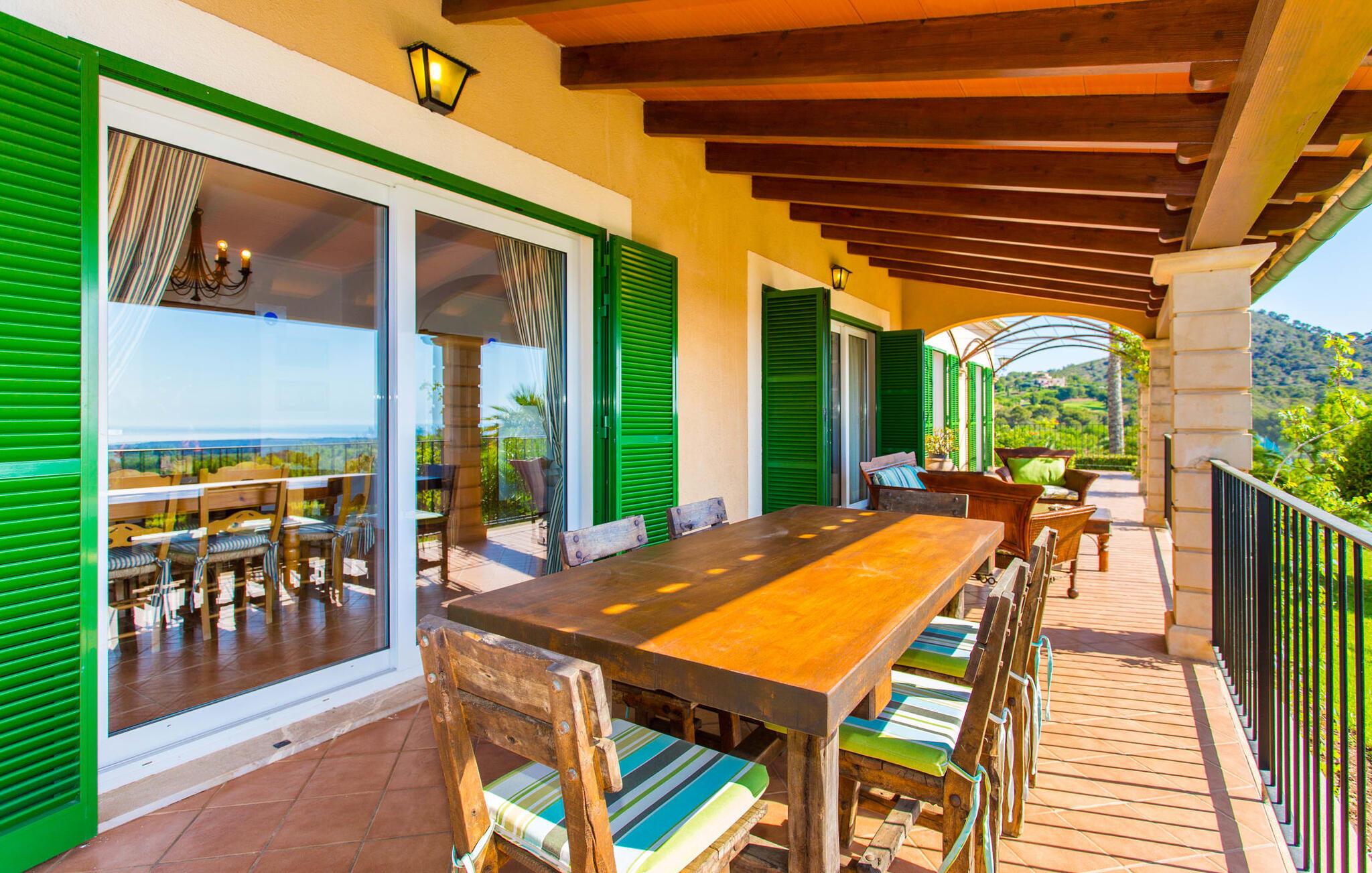 Takket være sin højde over det omkringliggende landskab tilbyder Villa "Ses Mamellas" en vidunderlig panoramaudsigt over havet, som I kan nyde fra den brede veranda foran huset med en kølig drink i hånden. Med komfortable udendørsmøbler og masser af skygge er det et fantastisk sted at sidde og slappe af eller dele måltider sammen. Nær poolen er der endnu en overdækket terrasse med udendørs køkken, grill og spiseplads, perfekt til livlige aftener omkring grillen. Dette overdækkede område har også et bordtennisbord, hvis I har lyst til at dyrke sport uden for poolen. Herfra og fra de komfortable liggestole ved poolen har I en betagende udsigt hele vejen til havet. Den rummelige og ugenerte ejendom omfatter en kærligt vedligeholdt have med palmer og blomster af enhver art, som vil glæde naturelskere. I kan parkere biler på indkørslen, som giver masser af skygge på solrige dage. Den to-etagers villa er indrettet i en smagfuld, klassisk stil. Fra foyeren kommer man ind i stuen, som er meget hyggelig og oversvømmet med lys. Det er et godt sted at afslutte dagen foran det store fladskærms-tv eller slappe af med en af bøgerne fra bogreolen. Og hvis I ikke har lyst til at være fuldstændig isoleret fra omverdenen, kan I gå online via DSL internetforbindelsen. Stuen er dekoreret med kunst, der skaber en varm og indbydende atmosfære. Både stuen og den tilhørende spiseplads har store panoramavinduer, hvilket giver en fantastisk udsigt over det spektakulære landskab udenfor. Det rummelige køkken er fuldt udstyret med komfur, opvaskemaskine, kaffemaskine, køleskab, elkedel og mikroovn. I stueetagen er der også to af de tre indbydende og komfortabelt indrettede dobbeltværelser og to badeværelser, hvoraf det ene er en-suite. Hver seng, med elegant udskårne trærammer, giver et smukt rum til en eftermiddagssiesta eller en afslappende nats søvn. Villaen "Ses Mamellas" ligger lige ved siden af Vall d'Or golfbanen og er derfor et perfekt sted for golfspillere. Men hvis I kan lide at bruge jeres ferie på at udforske, er I kommet til det rigtige sted: i de små byer Cala Murada og Cala Marçal samt de smukke strande i Cala Marçal, Platja de s'Arenal og Cala Brafi, er alt let tilgængelig i bil. Et sted I bestemt ikke bør gå glip af er Santuari de San Salvador, kun 15 km væk. Med sine 509 m ligger dette middelalderkloster på det højeste punkt af Serra de Llevant og er stadig et valfartssted i dag. Blandt de mere interessante seværdigheder er det betagende smukke kapel og dets alabastalter. Og det er kun 20 minutters kørsel til Parc Natural de Mondragó. Denne charmerende villa i den sydøstlige del af øen byder på en vidunderlig panoramaudsigt. Den afsondrede bakketop ejendom er meget indbydende med sin velplejede have fuld af palmer, blomster og frodige grønne områder. Villaen ligger meget tæt på Vall d'Or golfbanen og de tre smukke strande Cala Marçal, Platja de s'Arenal og Cala Brafi. Det er kun omkring fem minutter i bil til den rolige by Portocolom.
