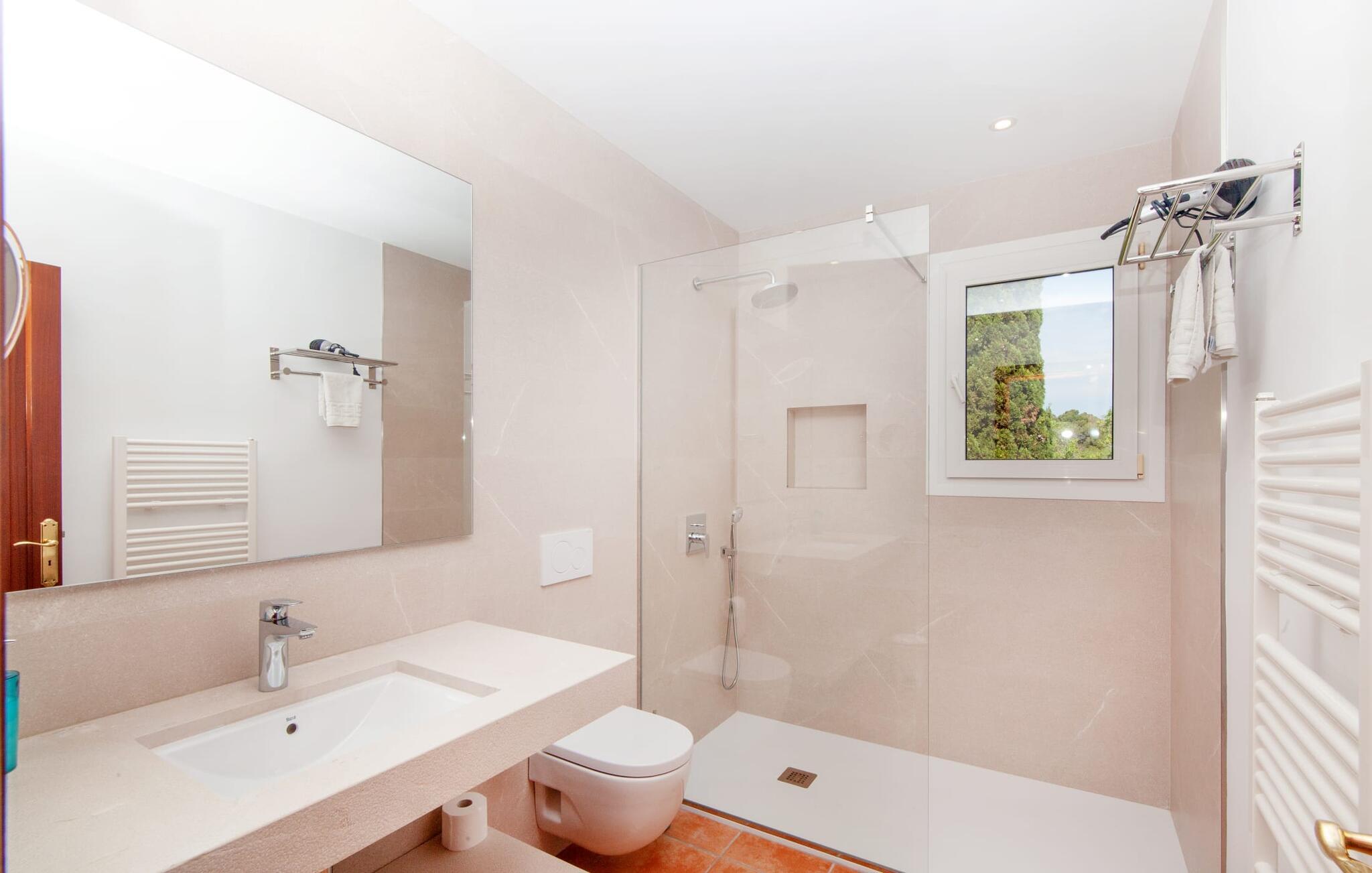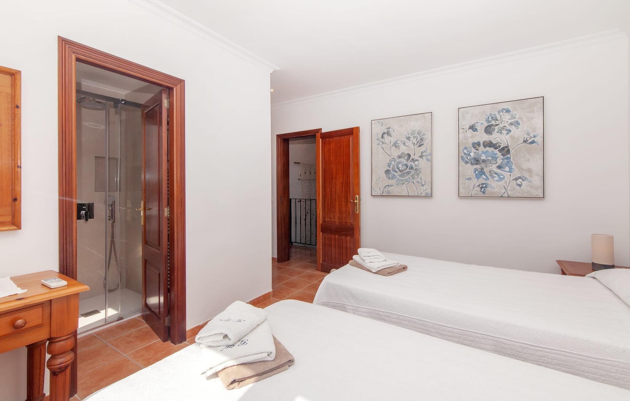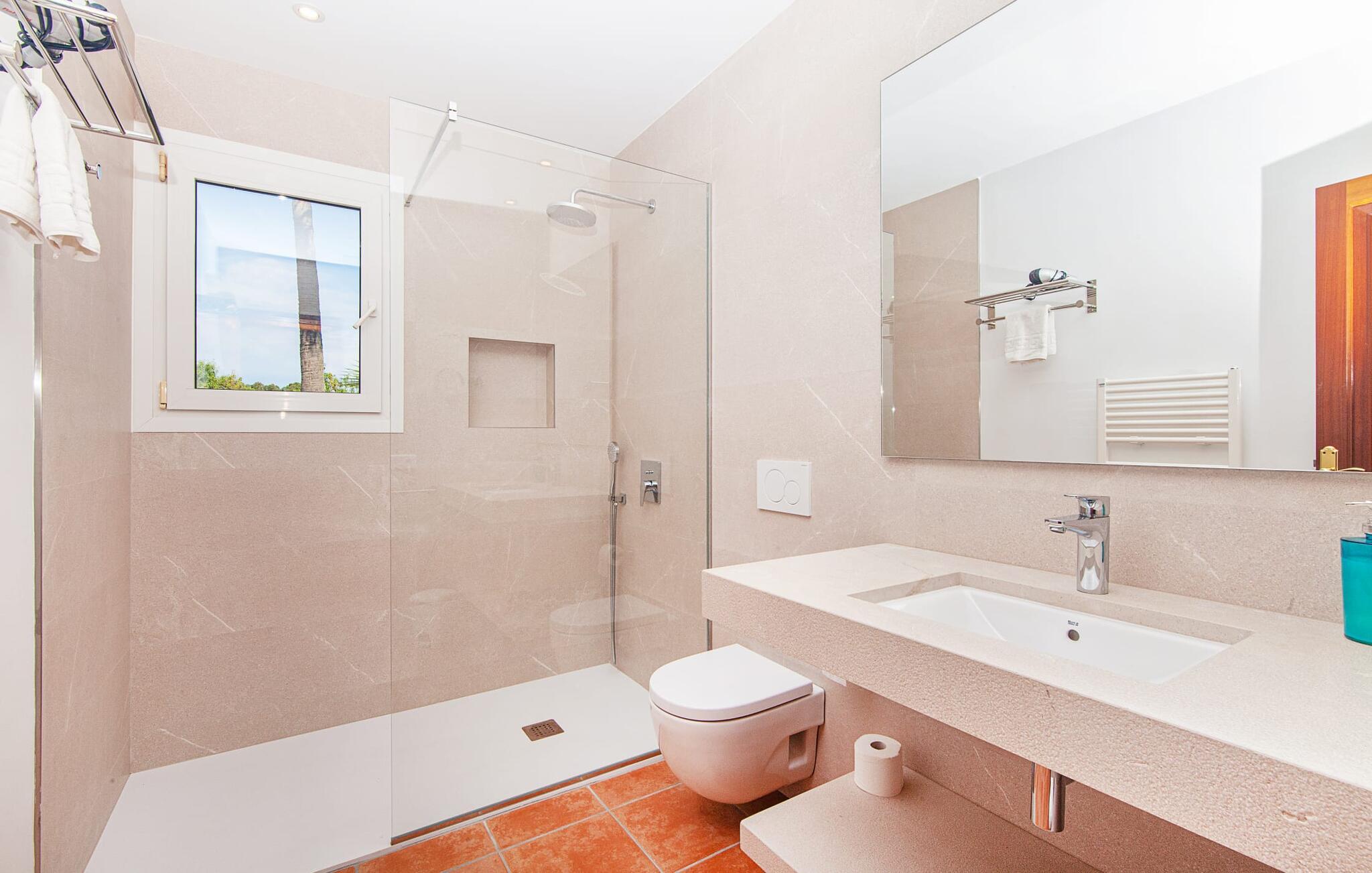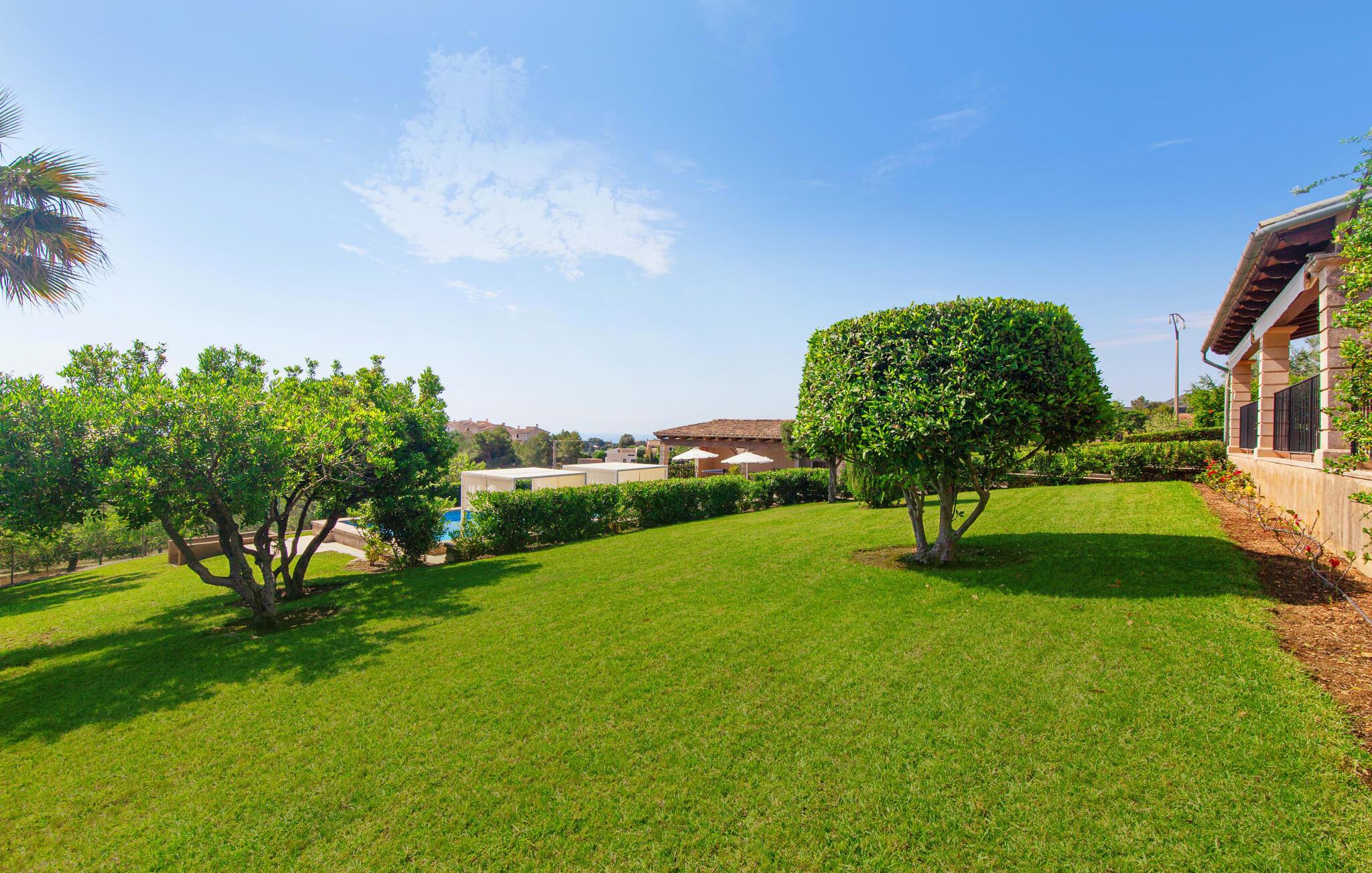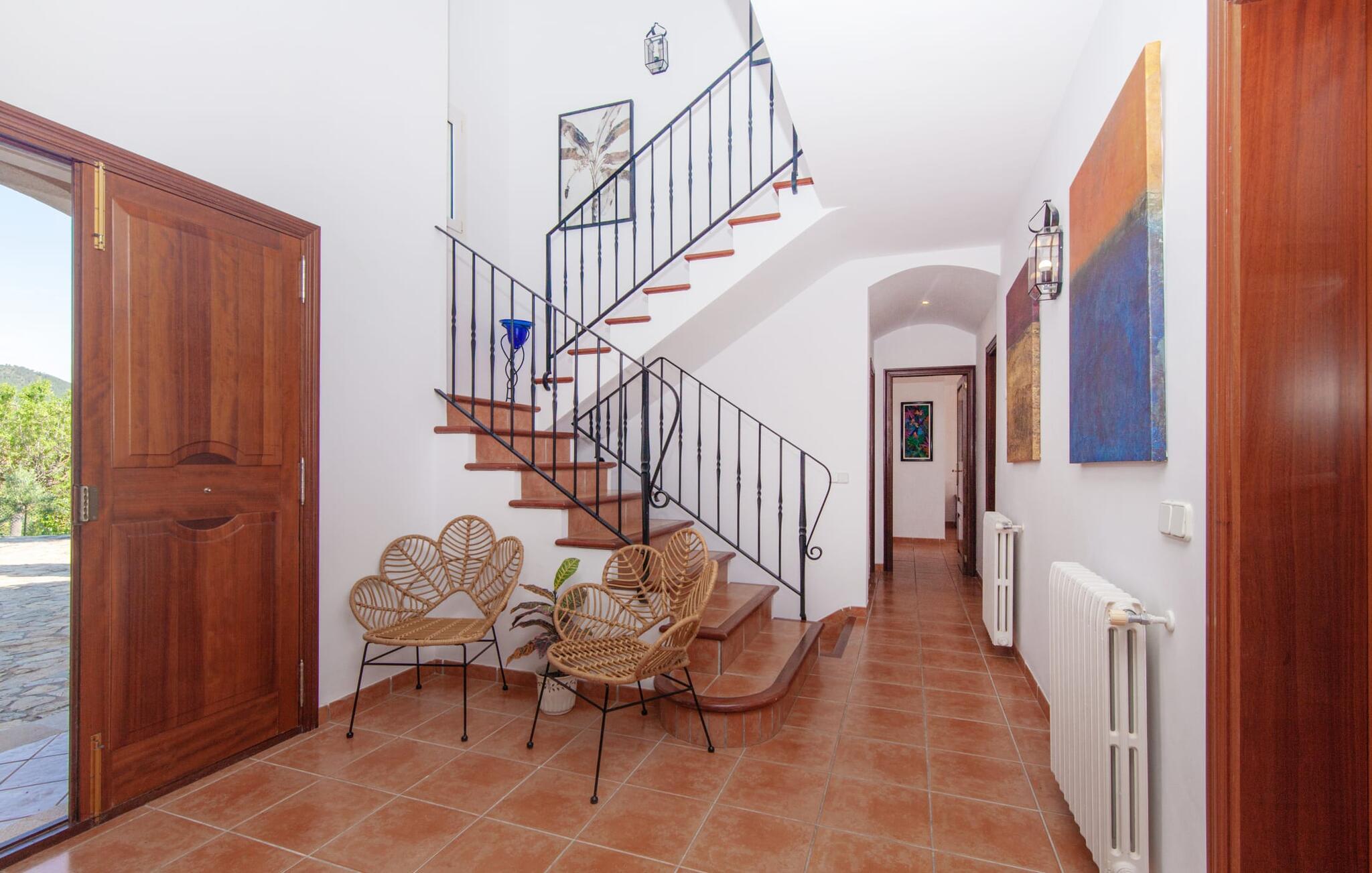 Takket være sin højde over det omkringliggende landskab tilbyder Villa "Ses Mamellas" en vidunderlig panoramaudsigt over havet, som I kan nyde fra den brede veranda foran huset med en kølig drink i hånden. Med komfortable udendørsmøbler og masser af skygge er det et fantastisk sted at sidde og slappe af eller dele måltider sammen. Nær poolen er der endnu en overdækket terrasse med udendørs køkken, grill og spiseplads, perfekt til livlige aftener omkring grillen. Dette overdækkede område har også et bordtennisbord, hvis I har lyst til at dyrke sport uden for poolen. Herfra og fra de komfortable liggestole ved poolen har I en betagende udsigt hele vejen til havet. Den rummelige og ugenerte ejendom omfatter en kærligt vedligeholdt have med palmer og blomster af enhver art, som vil glæde naturelskere. I kan parkere biler på indkørslen, som giver masser af skygge på solrige dage. Den to-etagers villa er indrettet i en smagfuld, klassisk stil. Fra foyeren kommer man ind i stuen, som er meget hyggelig og oversvømmet med lys. Det er et godt sted at afslutte dagen foran det store fladskærms-tv eller slappe af med en af bøgerne fra bogreolen. Og hvis I ikke har lyst til at være fuldstændig isoleret fra omverdenen, kan I gå online via DSL internetforbindelsen. Stuen er dekoreret med kunst, der skaber en varm og indbydende atmosfære. Både stuen og den tilhørende spiseplads har store panoramavinduer, hvilket giver en fantastisk udsigt over det spektakulære landskab udenfor. Det rummelige køkken er fuldt udstyret med komfur, opvaskemaskine, kaffemaskine, køleskab, elkedel og mikroovn. I stueetagen er der også to af de tre indbydende og komfortabelt indrettede dobbeltværelser og to badeværelser, hvoraf det ene er en-suite. Hver seng, med elegant udskårne trærammer, giver et smukt rum til en eftermiddagssiesta eller en afslappende nats søvn. Villaen "Ses Mamellas" ligger lige ved siden af Vall d'Or golfbanen og er derfor et perfekt sted for golfspillere. Men hvis I kan lide at bruge jeres ferie på at udforske, er I kommet til det rigtige sted: i de små byer Cala Murada og Cala Marçal samt de smukke strande i Cala Marçal, Platja de s'Arenal og Cala Brafi, er alt let tilgængelig i bil. Et sted I bestemt ikke bør gå glip af er Santuari de San Salvador, kun 15 km væk. Med sine 509 m ligger dette middelalderkloster på det højeste punkt af Serra de Llevant og er stadig et valfartssted i dag. Blandt de mere interessante seværdigheder er det betagende smukke kapel og dets alabastalter. Og det er kun 20 minutters kørsel til Parc Natural de Mondragó. Denne charmerende villa i den sydøstlige del af øen byder på en vidunderlig panoramaudsigt. Den afsondrede bakketop ejendom er meget indbydende med sin velplejede have fuld af palmer, blomster og frodige grønne områder. Villaen ligger meget tæt på Vall d'Or golfbanen og de tre smukke strande Cala Marçal, Platja de s'Arenal og Cala Brafi. Det er kun omkring fem minutter i bil til den rolige by Portocolom.