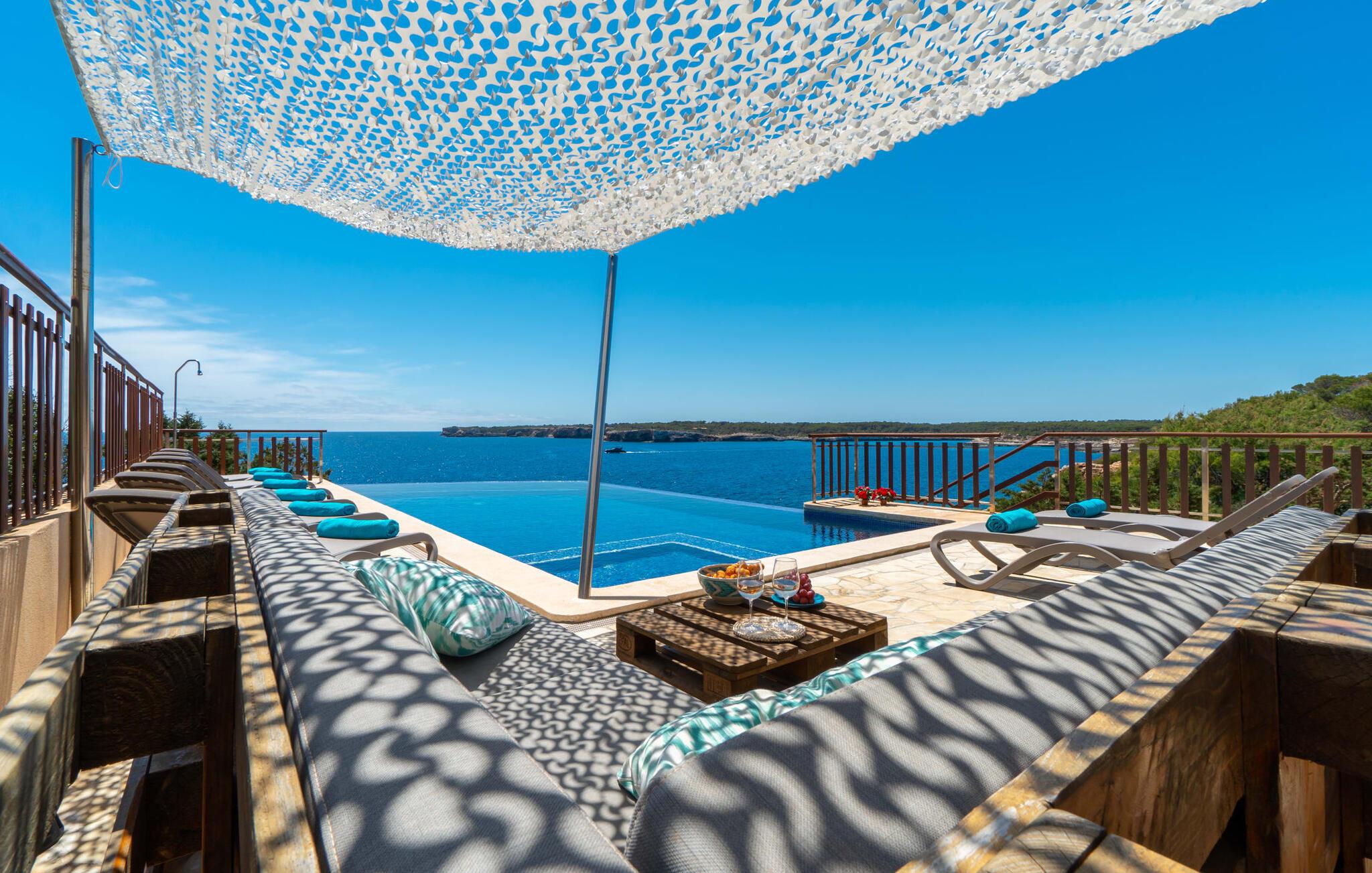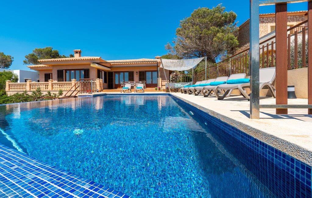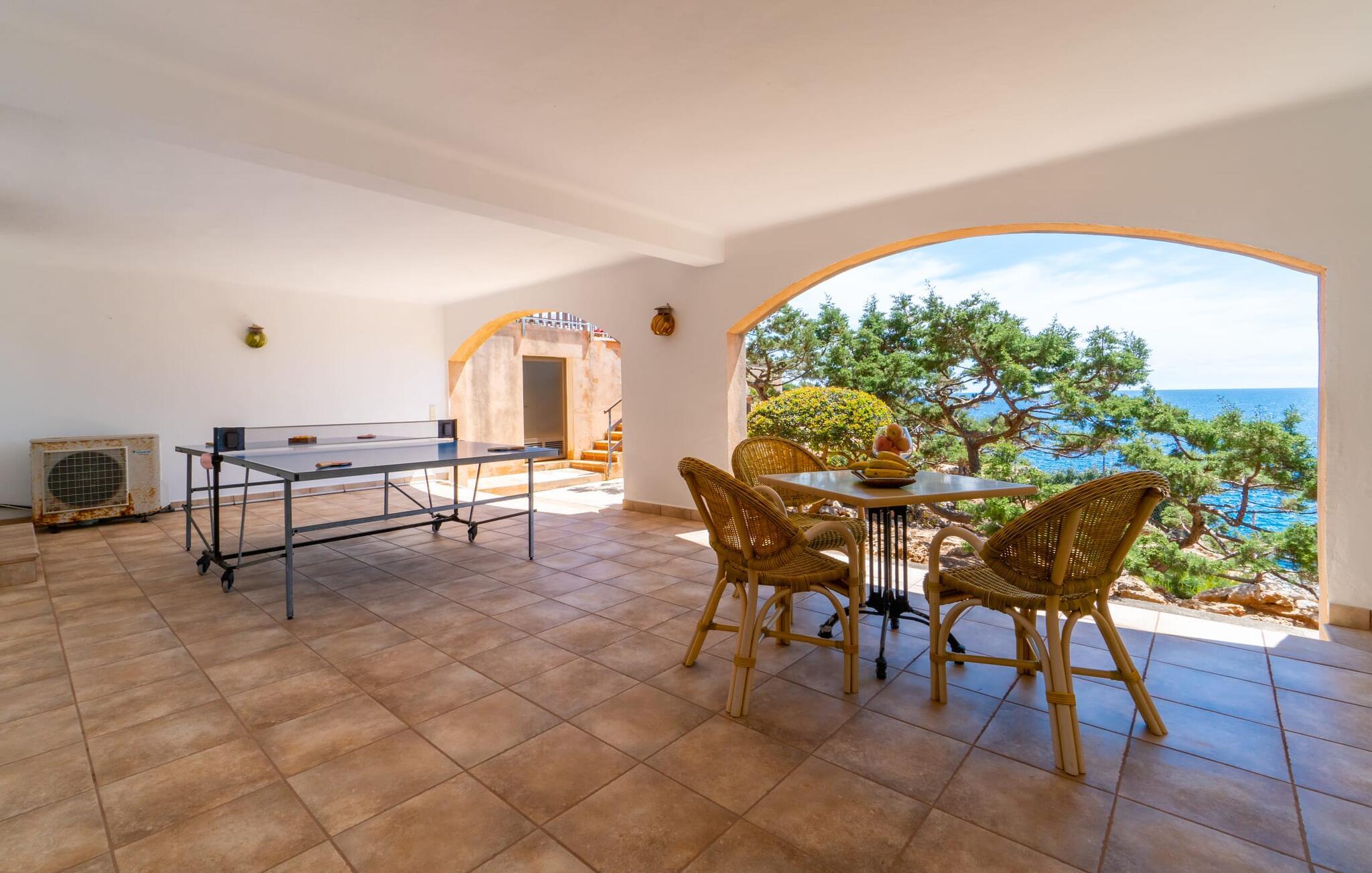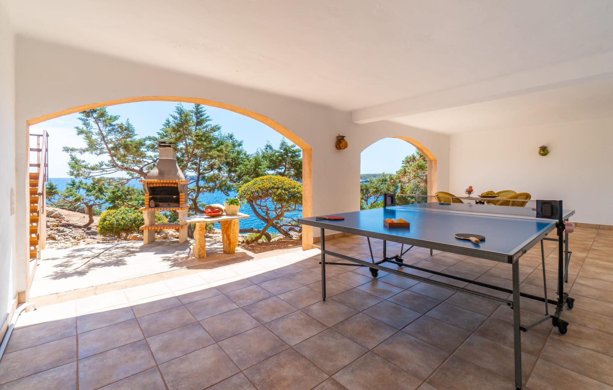 Med sit slående navn refererer den drømmeagtige villa "Ses Penyes Rotges" til et bemærkelsesværdigt naturskue - fordi det ligger direkte på de berømte røde klipper i den sydlige kystsektion mellem Portopetro og Mondragó Naturpark. Som ejendom i en eksklusiv urbanisering med lidt gennemkørende trafik, nyder I godt af en virkelig førsteklasses beliggenhed med kun få naboer. En smal sti og trin hugget ind i klipperne fører jer direkte til jeres private indgang til havet. Fra sommerhuset kan I nyde den frie udsigt til det funklende blå fra morgen til aften - enten fra en af de talrige altaner eller fra de rummelige overdækkede terrassearealer, hvor I kan opleve bordtennis og grill på en helt ny måde. Den kølige infinity-pool ser ud til at flyde direkte ud i Middelhavet og sikrer eksklusiv badeglæde. For de yngre gæster er der en ekstra børnepool, der erstatter soppebassinet. På trods af placeringen over klippeklipperne er hele området behageligt grønt. Denne typiske kystflora går igen i haveområdet med fyrretræer og kaktusser. Bemærk venligst, at adgang til havet ikke kan garanteres i tilfælde af dårligt vejr eller kraftig vind og ujævn hav. Ejerne vil så ikke bygge trappen. Hvis I gerne vil selvforplejning i dette vidunderlige sommerhus, så tag til fiskerlandsbyen Portopetro eller til de ugentlige markeder i den beboelige sydlige del af øen. I kan lave mad i det fuldt udstyrede køkken med et tidløst design og servere middelhavskøkkenets delikatesser via lugen direkte i den smarte spisestue. Den lyse og rummelige rumindretning med åben stue og spiseplads samt fire rummelige soveværelser understreges af et harmonisk farvevalg. Det lyse design med grå gulvfliser er kombineret med varme trætoner. Den moderne stil kombinerer den kølige adel af en maritim villa med typisk mallorcansk pragmatisme. Takket være de fuldt klimatiserede soveværelser kan I ikke bare håbe på en kølig brise fra havet. Tre moderne badeværelser, to af dem en suite, inviterer jer til at tage et brusebad. En af dem med et dobbeltværelse kan kun nås via den spanske terrasse med et ekstra loungehjørne. Flyd væk i dette perfekte sommerhus med op til otte personer, eller vær aktiv med båd- eller kajakudlejning, tag på fisketur eller tag en dukkert i havet. Spil bordtennis eller, hvis I foretrækker noget lidt mere generøst, besøg den nærliggende tennisbane - "Ses Penyes Rotges" tilbyder jer fantastiske rammer for jeres individuelle ferie! Den eksklusive villa "Ses Penyes Rotges" med pool og talrige terrasser er en sand juvel blandt mallorcanske feriehuse. Det ligger på den første kystlinje i den sydlige del af øen nær fiskerbyen Portopetro. Beliggende på kanten af en udsøgt urbanisering, vil I nyde en spektakulær udsigt over havet. I kan gøre jeres indkøb i de omkringliggende landsbyer eller tage på udflugter til de smukkeste steder i syd som Santanyí eller Cala D'Or. For at svømme i havet går I ned ad en privat sti med et par trin til badestigen indlejret i klippen. Aircondition i soveværelserne er inkluderet i prisen, men brugen er begrænset til mellem kl. 22.00 og kl. Gebyret afregnes herefter kontant på stedet.