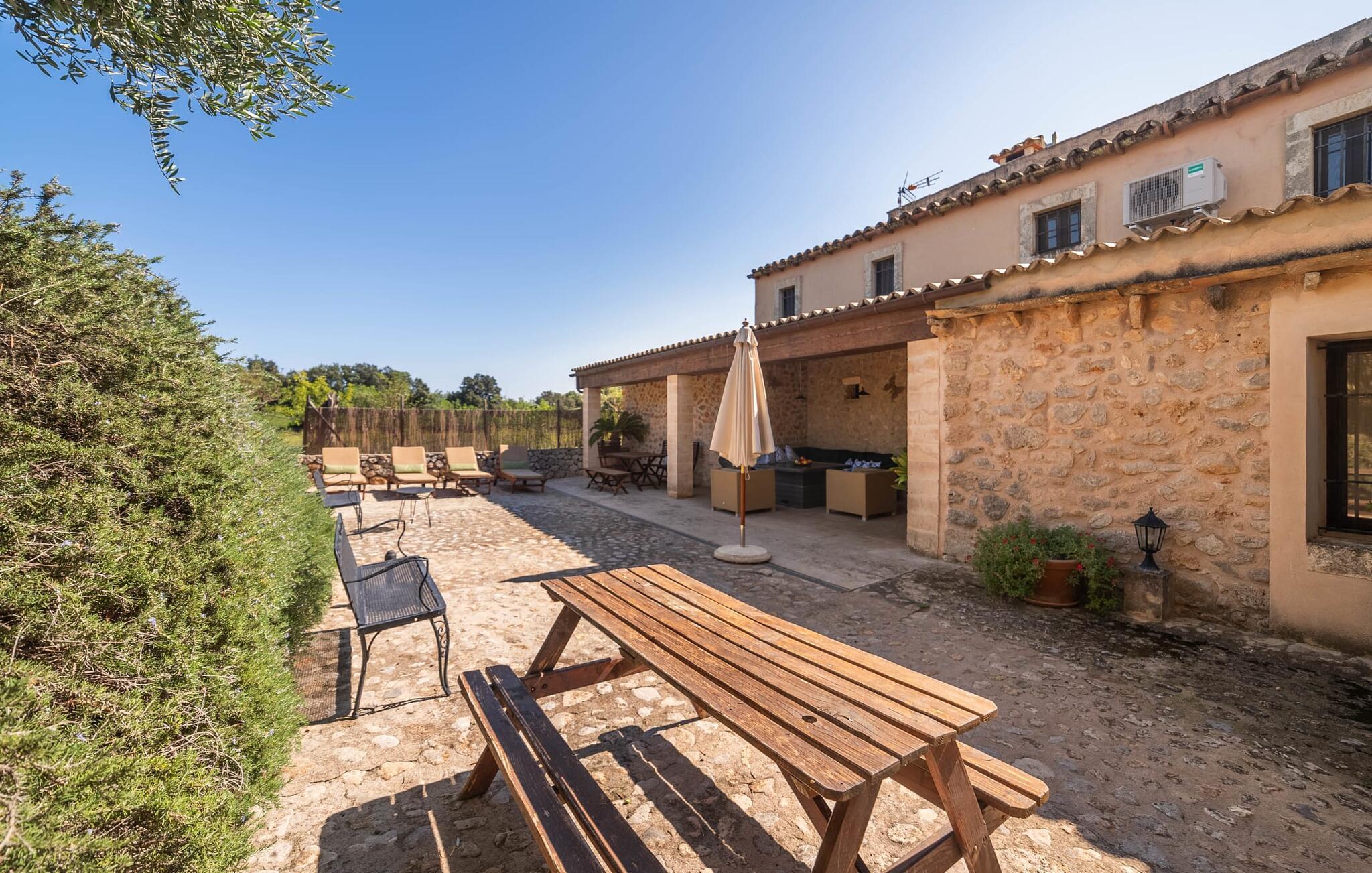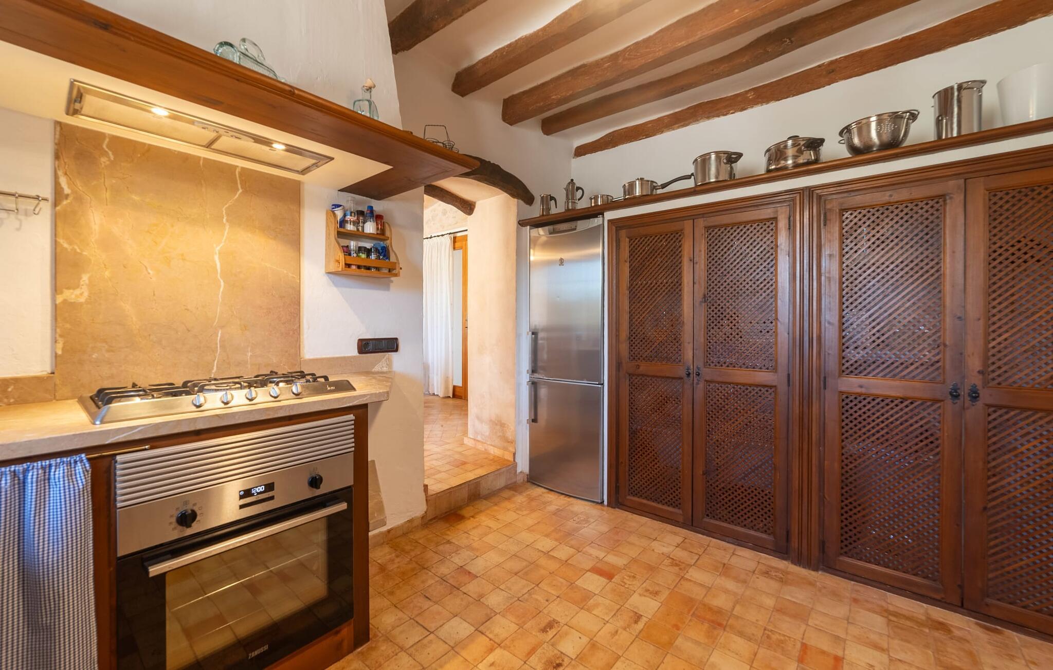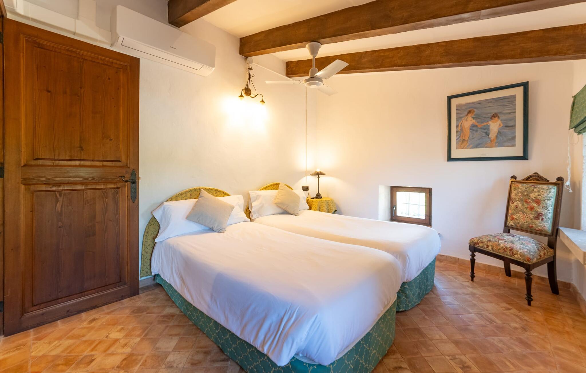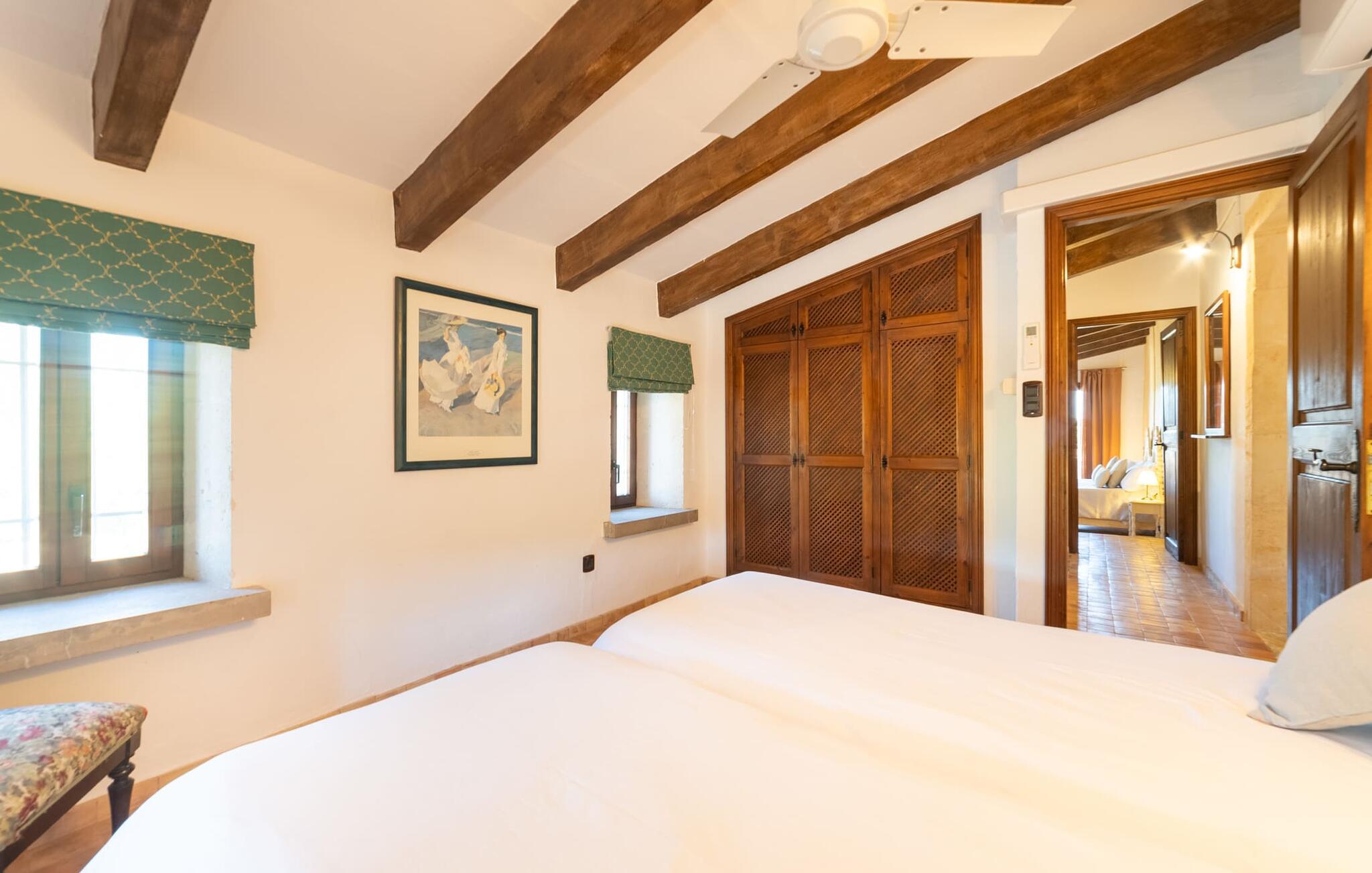 Ud for en lille gade på en vidunderlig idyllisk ejendom finder I den smukt restaurerede villa "Ses Planes". Her kan I opleve en helt afslappende ferie i en vidunderlig rolig, ugeneret beliggenhed langt væk fra stress og jag. I dette hjørne af verden bor I fuldstændig isoleret og uden nogen direkte naboer. Da de restaurerede den 600 år gamle ejendom, forblev ejerne tro mod den mallorcanske stil og var i stand til at bevare den originale flair uden at skulle give afkald på moderne bekvemmeligheder. Omgivet af oliven-, citron- og mandeltræer er der en række smukke steder at opdage uden for villaen. Siddeområdet ser meget hyggeligt ud og har et tiltalende rustik-romantisk look takket være det frodige grønne. Lige ved siden af huset, med udsigt over poolen, kan I tilbringe timevis under stråtaget, hvor træsæder giver jer et fortryllende rum. Men det er ikke alt, der venter jer her: Tag plads under en af parasollerne eller nyd middelhavslyset i en af de andre møblerede siddepladser. Elegante stole og bænke samt komfortable liggestole er tilgængelige i dette gårdlignende område til jeres meget personlige stunder. Hvis I har lyst til noget action, kan I spille et spil bordtennis på det overdækkede bordtennisbord. Der er ingen tvivl om det: I skal bruge tid ved poolen. Især på varme mallorcanske dage vil I sætte pris på det kølige vand og måske bruge tiden mellem liggestolen og vandet. Den 8 m store pool, designet med blå mosaiksten, kan nemt nås via en hjørnetrappe og varierer i dybden mellem 1,10 og 1,80 m. Den omgivende naturstensterrasse og de smukke halmparasoller giver dette område en autentisk og original stemning. Der er plads nok foran huset til flere lejebiler. Så snart I træder ind i det mallorcanske hus, er der en meget hyggelig atmosfære, og enhver, der elsker autenticitet og traditionel charme, vil straks blive imponeret. Masser af natursten, tykke vægge, klassiske bjælkelofter og spanske dekorationer bidrager til denne individuelle flair, hvor I hurtigt vil føle jer hjemme. I kan stadig se den århundreder gamle mølle og det tidligere fodertrug! I stueetagen er der et soveværelse og to badeværelser (det ene en-suite) samt en elegant spisestue, hvor I kan spise indendørs omgivet af naturstensvægge. I det originale, gamle køkken finder I en hyggelig plads ved pejsen - her kan I sidde sammen til en romantisk aften og kigge ind i de knitrende flammer. I det andet køkken kan I tilberede jeres måltider og er fuldt udstyret, så I nemt kan fortsætte med at passe jer selv. Stenvasken er et rigtigt blikfang! Lige ved siden af den imponerende kornmølle er der endnu et stort spisebord, der komfortabelt kan rumme alle. På øverste etage er der en stue med endnu en pejs. Her kan I se tv, læse en god bog eller hygge jer. Derudover er der tre soveværelser og et tredje badeværelse på denne etage. Soveværelset byder på gode afslapningsområder i klassisk design til natten eller til en siesta; I alt kan I vælge mellem en 1,50 x 1,90 seng og fire 0,90 x 1,90 m senge. Den meget autentiske villa "Ses Planes" er beliggende i en vidunderlig afsondret beliggenhed på en 17.000 m² stor grund kun 2 km syd for Búger, hvor der er mindre supermarkeder, barer og restauranter. Om søndagen kan I tage til det ugentlige marked i Sa Pobla (6 km). De populære strande ved Alcúdia-bugten, herunder Can Picafort og Platja de Muro, ligger kun en kort køretur derfra med udlejningsbil. Bemærk venligst, at denne ejendom ikke accepterer ungdomsgrupper eller polterabender. En ungdomsgruppe på denne ejendom består af personer under 30 år. Book ikke denne ejendom, hvis I er en ungdomsgruppe eller polterabend, da jeres reservation vil blive afvist, når den er booket, hvilket også kan være tilfældet ved ankomst til ejendommen eller under jeres ophold, og I vil ikke modtage en refusion
