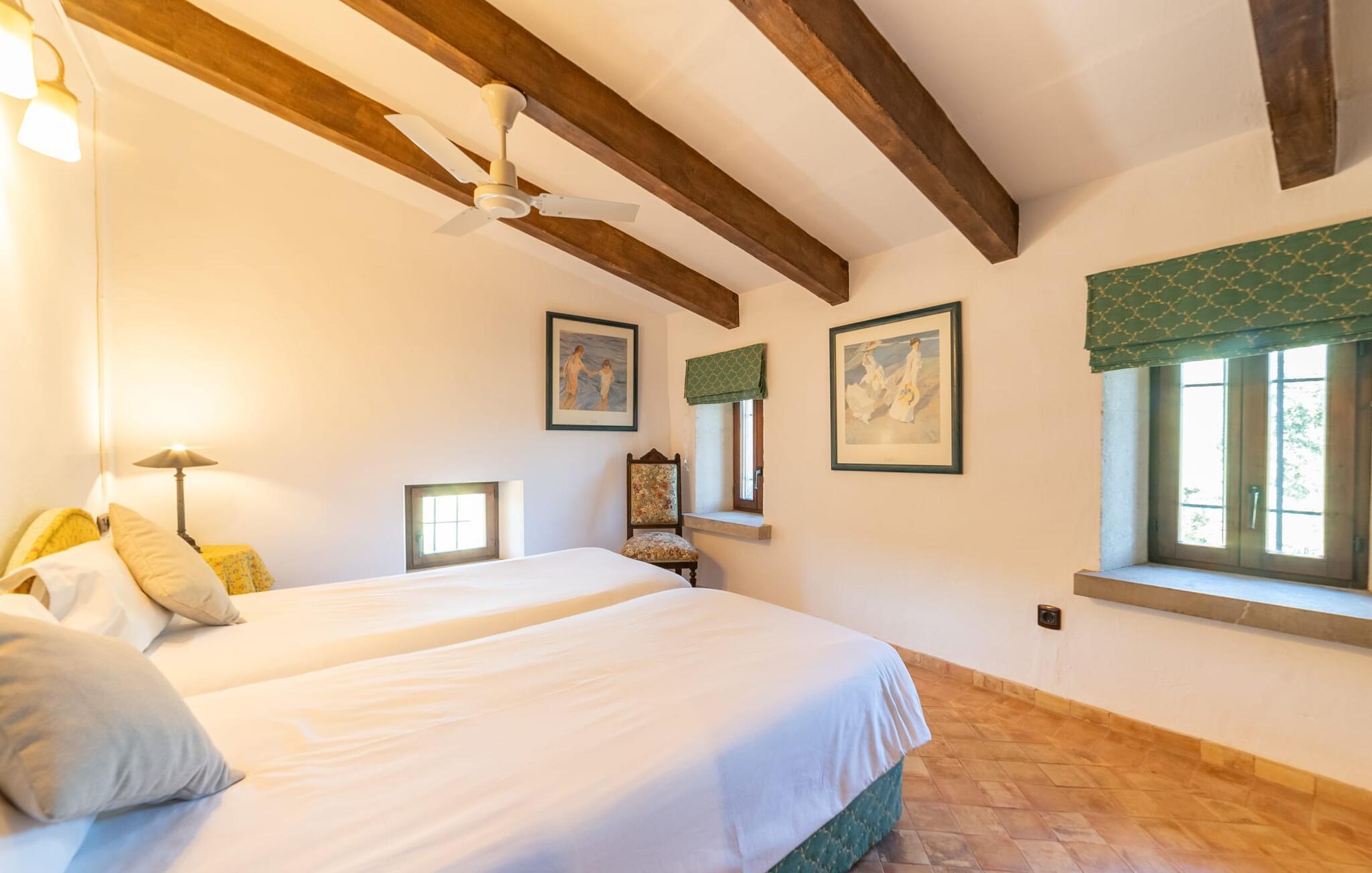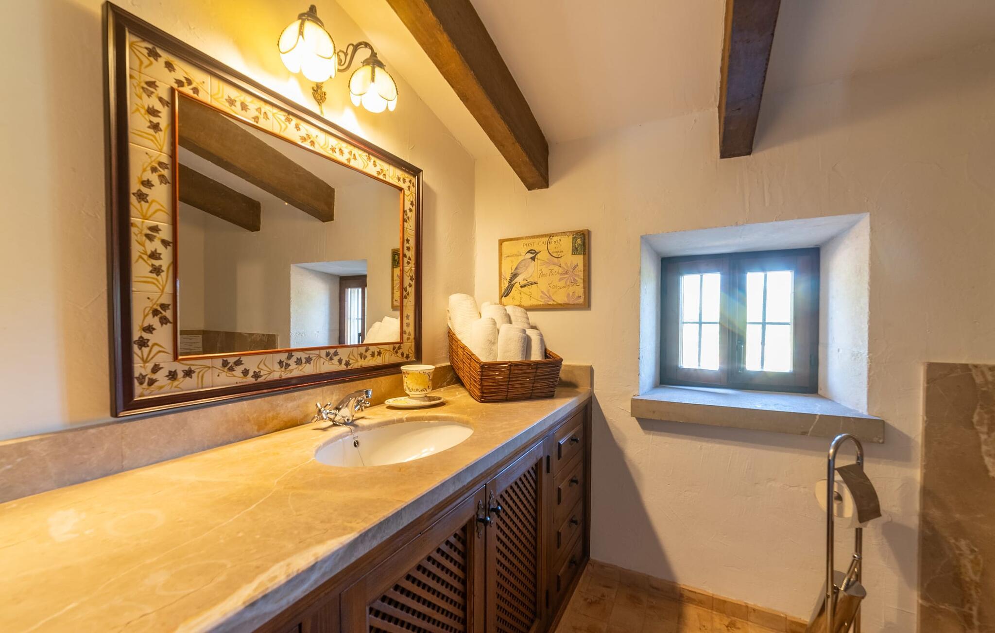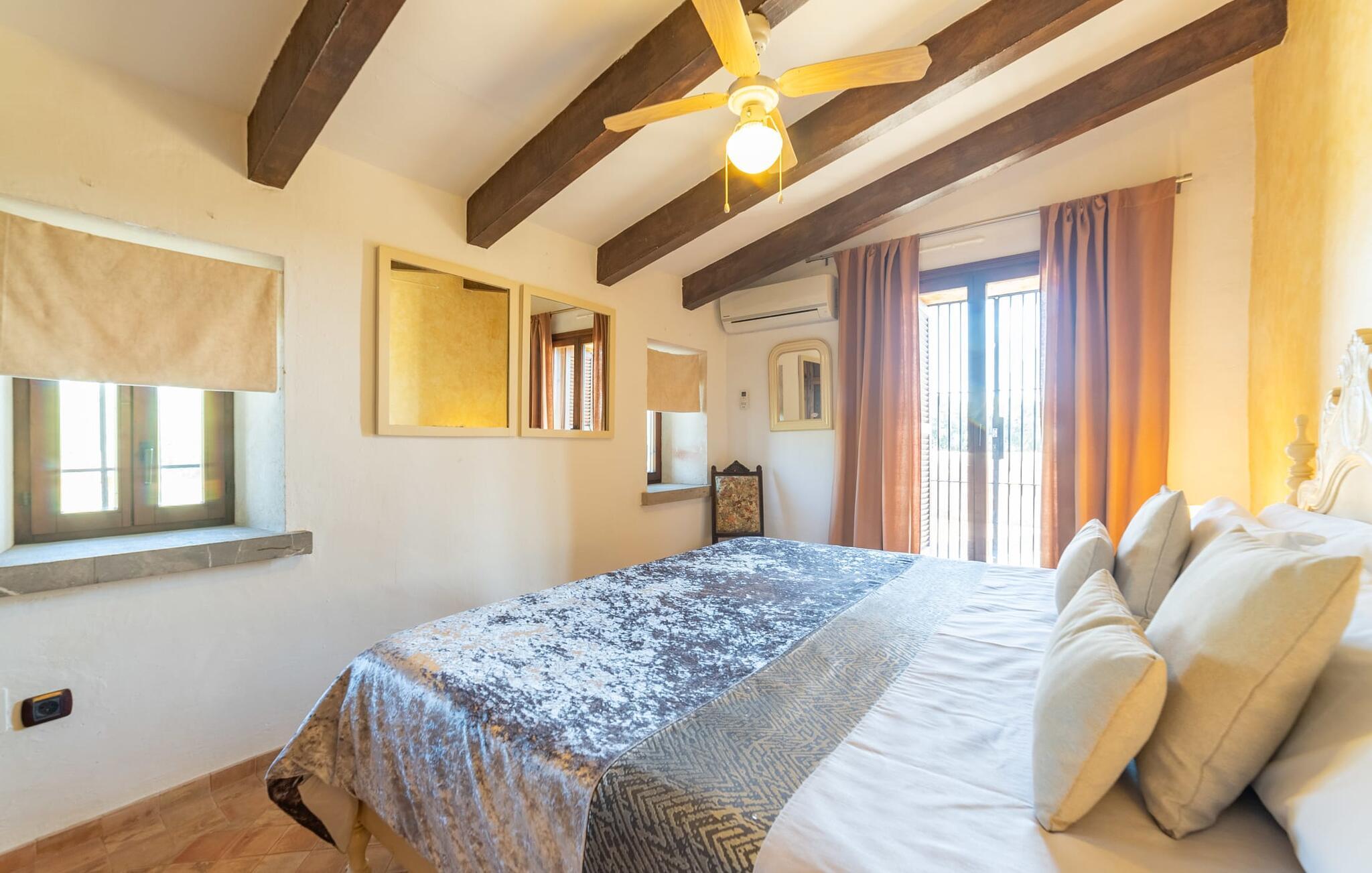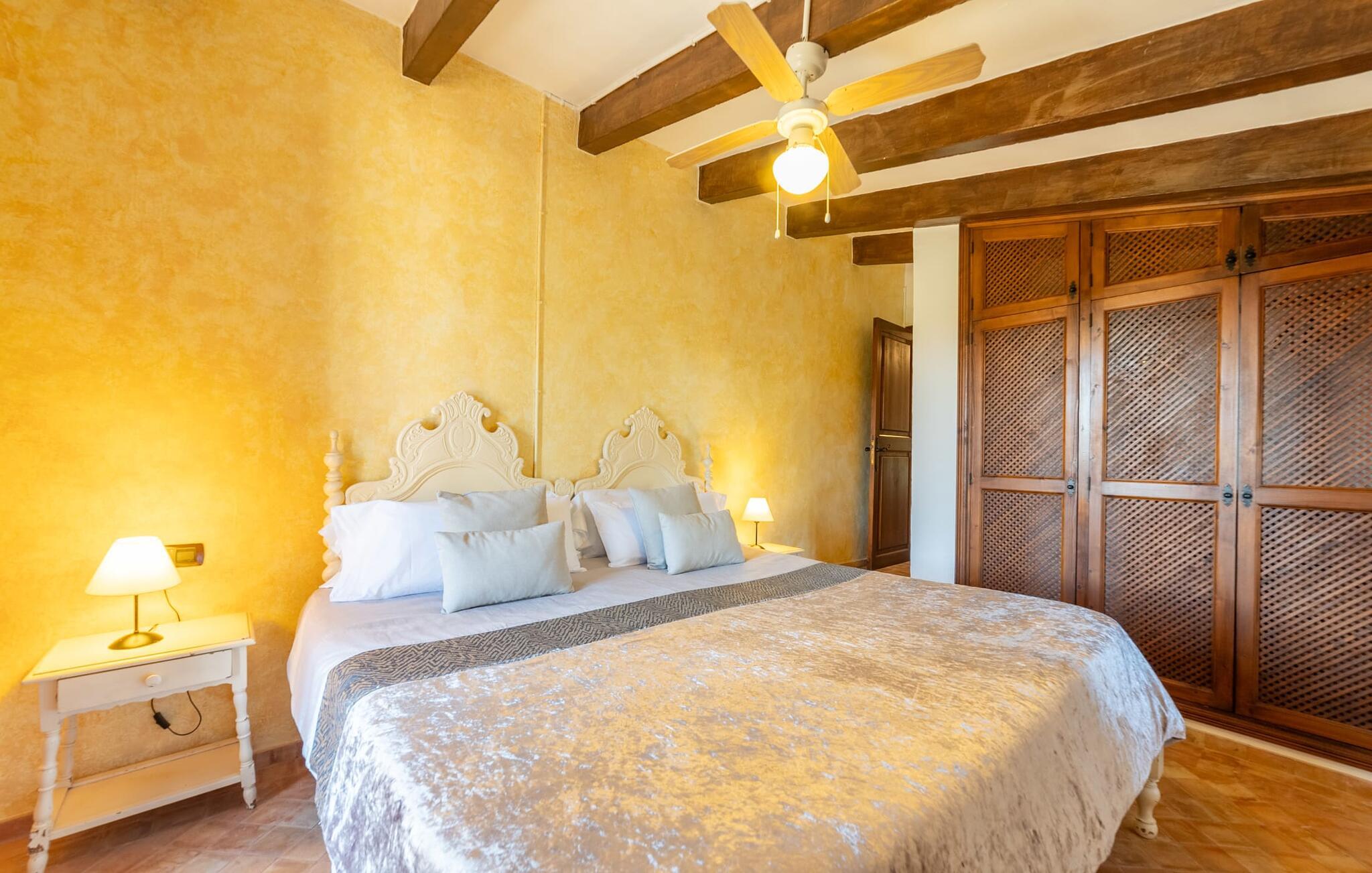 Ud for en lille gade på en vidunderlig idyllisk ejendom finder I den smukt restaurerede villa "Ses Planes". Her kan I opleve en helt afslappende ferie i en vidunderlig rolig, ugeneret beliggenhed langt væk fra stress og jag. I dette hjørne af verden bor I fuldstændig isoleret og uden nogen direkte naboer. Da de restaurerede den 600 år gamle ejendom, forblev ejerne tro mod den mallorcanske stil og var i stand til at bevare den originale flair uden at skulle give afkald på moderne bekvemmeligheder. Omgivet af oliven-, citron- og mandeltræer er der en række smukke steder at opdage uden for villaen. Siddeområdet ser meget hyggeligt ud og har et tiltalende rustik-romantisk look takket være det frodige grønne. Lige ved siden af huset, med udsigt over poolen, kan I tilbringe timevis under stråtaget, hvor træsæder giver jer et fortryllende rum. Men det er ikke alt, der venter jer her: Tag plads under en af parasollerne eller nyd middelhavslyset i en af de andre møblerede siddepladser. Elegante stole og bænke samt komfortable liggestole er tilgængelige i dette gårdlignende område til jeres meget personlige stunder. Hvis I har lyst til noget action, kan I spille et spil bordtennis på det overdækkede bordtennisbord. Der er ingen tvivl om det: I skal bruge tid ved poolen. Især på varme mallorcanske dage vil I sætte pris på det kølige vand og måske bruge tiden mellem liggestolen og vandet. Den 8 m store pool, designet med blå mosaiksten, kan nemt nås via en hjørnetrappe og varierer i dybden mellem 1,10 og 1,80 m. Den omgivende naturstensterrasse og de smukke halmparasoller giver dette område en autentisk og original stemning. Der er plads nok foran huset til flere lejebiler. Så snart I træder ind i det mallorcanske hus, er der en meget hyggelig atmosfære, og enhver, der elsker autenticitet og traditionel charme, vil straks blive imponeret. Masser af natursten, tykke vægge, klassiske bjælkelofter og spanske dekorationer bidrager til denne individuelle flair, hvor I hurtigt vil føle jer hjemme. I kan stadig se den århundreder gamle mølle og det tidligere fodertrug! I stueetagen er der et soveværelse og to badeværelser (det ene en-suite) samt en elegant spisestue, hvor I kan spise indendørs omgivet af naturstensvægge. I det originale, gamle køkken finder I en hyggelig plads ved pejsen - her kan I sidde sammen til en romantisk aften og kigge ind i de knitrende flammer. I det andet køkken kan I tilberede jeres måltider og er fuldt udstyret, så I nemt kan fortsætte med at passe jer selv. Stenvasken er et rigtigt blikfang! Lige ved siden af den imponerende kornmølle er der endnu et stort spisebord, der komfortabelt kan rumme alle. På øverste etage er der en stue med endnu en pejs. Her kan I se tv, læse en god bog eller hygge jer. Derudover er der tre soveværelser og et tredje badeværelse på denne etage. Soveværelset byder på gode afslapningsområder i klassisk design til natten eller til en siesta; I alt kan I vælge mellem en 1,50 x 1,90 seng og fire 0,90 x 1,90 m senge. Den meget autentiske villa "Ses Planes" er beliggende i en vidunderlig afsondret beliggenhed på en 17.000 m² stor grund kun 2 km syd for Búger, hvor der er mindre supermarkeder, barer og restauranter. Om søndagen kan I tage til det ugentlige marked i Sa Pobla (6 km). De populære strande ved Alcúdia-bugten, herunder Can Picafort og Platja de Muro, ligger kun en kort køretur derfra med udlejningsbil. Bemærk venligst, at denne ejendom ikke accepterer ungdomsgrupper eller polterabender. En ungdomsgruppe på denne ejendom består af personer under 30 år. Book ikke denne ejendom, hvis I er en ungdomsgruppe eller polterabend, da jeres reservation vil blive afvist, når den er booket, hvilket også kan være tilfældet ved ankomst til ejendommen eller under jeres ophold, og I vil ikke modtage en refusion