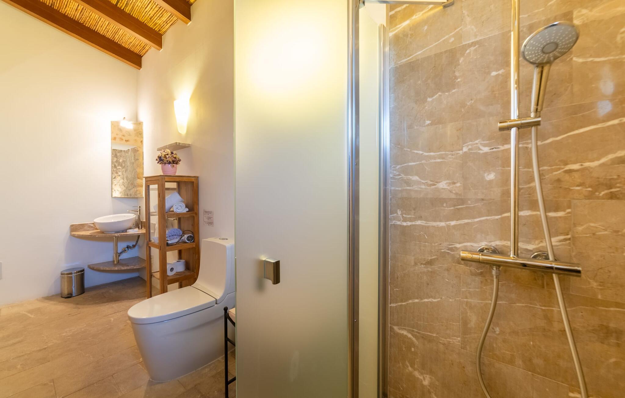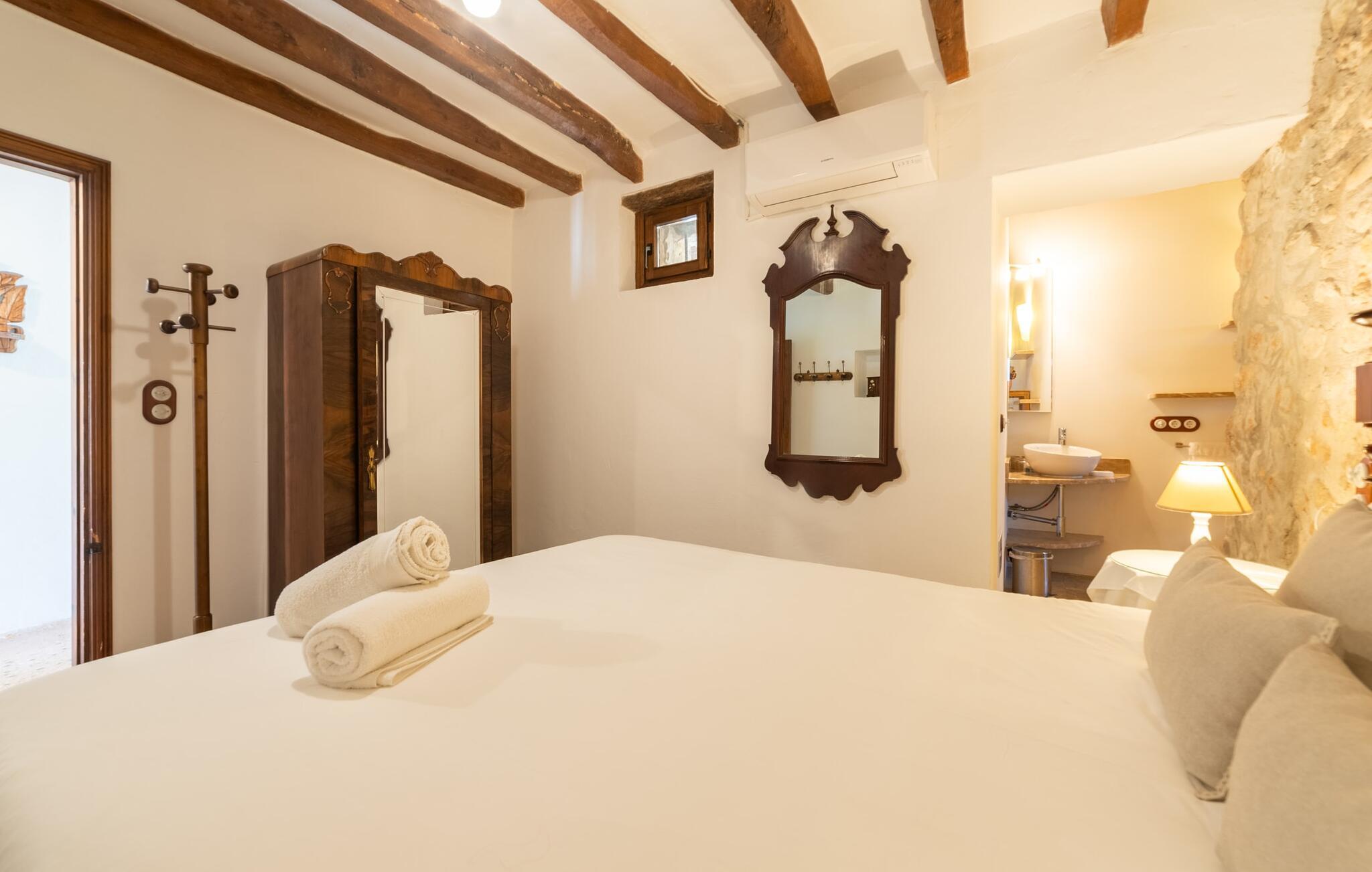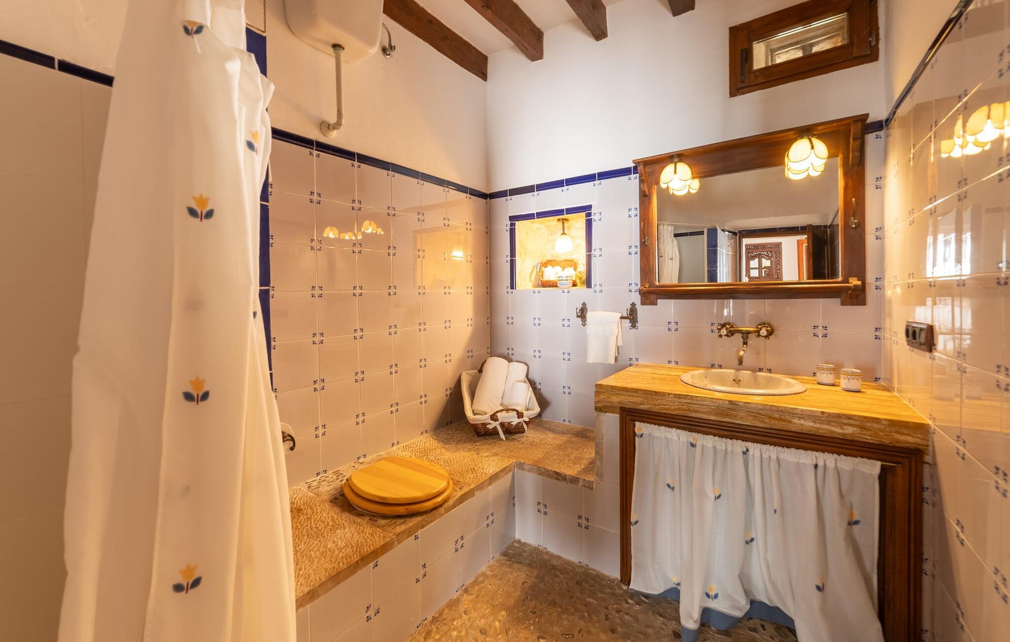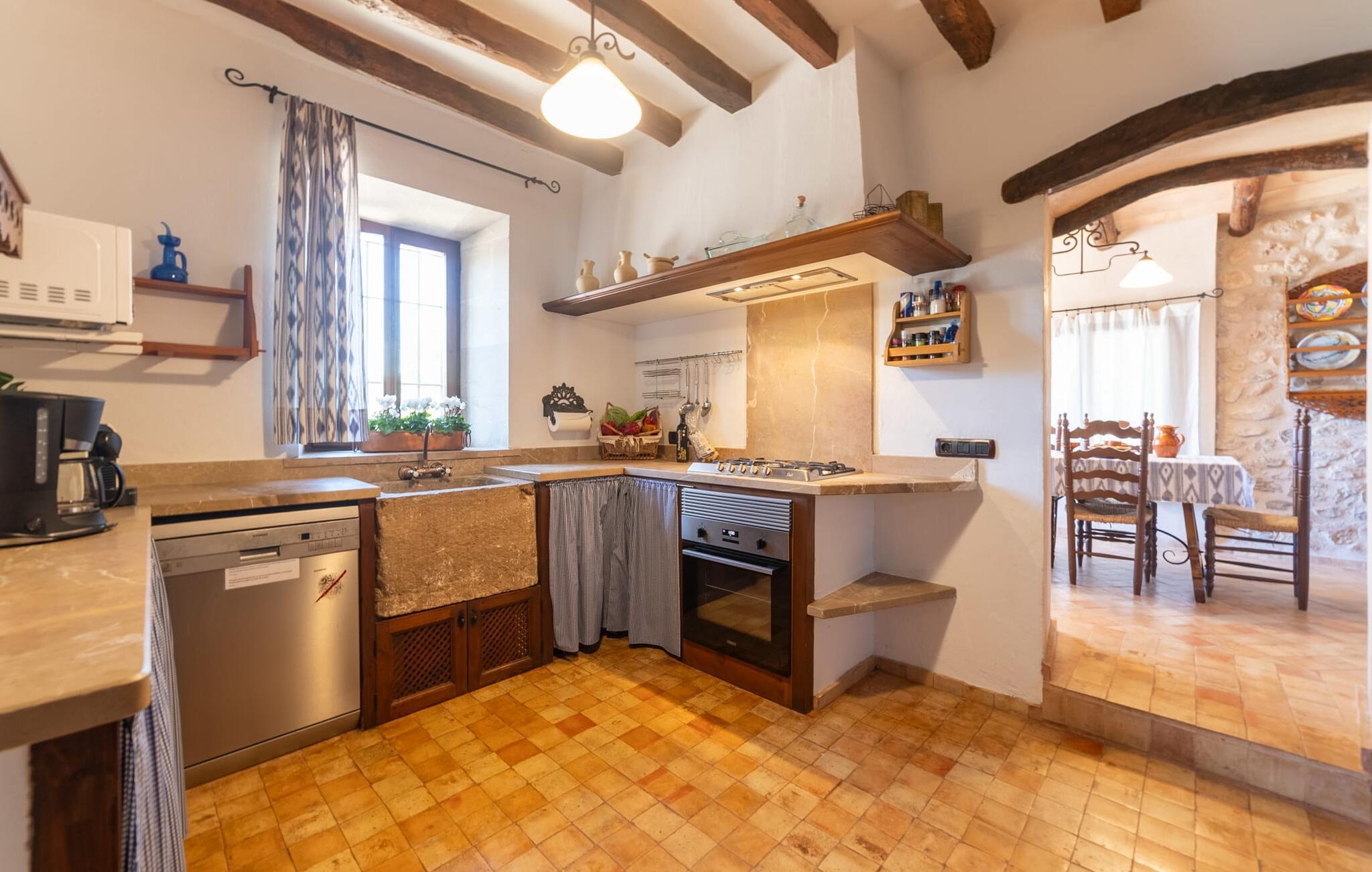 Ud for en lille gade på en vidunderlig idyllisk ejendom finder I den smukt restaurerede villa "Ses Planes". Her kan I opleve en helt afslappende ferie i en vidunderlig rolig, ugeneret beliggenhed langt væk fra stress og jag. I dette hjørne af verden bor I fuldstændig isoleret og uden nogen direkte naboer. Da de restaurerede den 600 år gamle ejendom, forblev ejerne tro mod den mallorcanske stil og var i stand til at bevare den originale flair uden at skulle give afkald på moderne bekvemmeligheder. Omgivet af oliven-, citron- og mandeltræer er der en række smukke steder at opdage uden for villaen. Siddeområdet ser meget hyggeligt ud og har et tiltalende rustik-romantisk look takket være det frodige grønne. Lige ved siden af huset, med udsigt over poolen, kan I tilbringe timevis under stråtaget, hvor træsæder giver jer et fortryllende rum. Men det er ikke alt, der venter jer her: Tag plads under en af parasollerne eller nyd middelhavslyset i en af de andre møblerede siddepladser. Elegante stole og bænke samt komfortable liggestole er tilgængelige i dette gårdlignende område til jeres meget personlige stunder. Hvis I har lyst til noget action, kan I spille et spil bordtennis på det overdækkede bordtennisbord. Der er ingen tvivl om det: I skal bruge tid ved poolen. Især på varme mallorcanske dage vil I sætte pris på det kølige vand og måske bruge tiden mellem liggestolen og vandet. Den 8 m store pool, designet med blå mosaiksten, kan nemt nås via en hjørnetrappe og varierer i dybden mellem 1,10 og 1,80 m. Den omgivende naturstensterrasse og de smukke halmparasoller giver dette område en autentisk og original stemning. Der er plads nok foran huset til flere lejebiler. Så snart I træder ind i det mallorcanske hus, er der en meget hyggelig atmosfære, og enhver, der elsker autenticitet og traditionel charme, vil straks blive imponeret. Masser af natursten, tykke vægge, klassiske bjælkelofter og spanske dekorationer bidrager til denne individuelle flair, hvor I hurtigt vil føle jer hjemme. I kan stadig se den århundreder gamle mølle og det tidligere fodertrug! I stueetagen er der et soveværelse og to badeværelser (det ene en-suite) samt en elegant spisestue, hvor I kan spise indendørs omgivet af naturstensvægge. I det originale, gamle køkken finder I en hyggelig plads ved pejsen - her kan I sidde sammen til en romantisk aften og kigge ind i de knitrende flammer. I det andet køkken kan I tilberede jeres måltider og er fuldt udstyret, så I nemt kan fortsætte med at passe jer selv. Stenvasken er et rigtigt blikfang! Lige ved siden af den imponerende kornmølle er der endnu et stort spisebord, der komfortabelt kan rumme alle. På øverste etage er der en stue med endnu en pejs. Her kan I se tv, læse en god bog eller hygge jer. Derudover er der tre soveværelser og et tredje badeværelse på denne etage. Soveværelset byder på gode afslapningsområder i klassisk design til natten eller til en siesta; I alt kan I vælge mellem en 1,50 x 1,90 seng og fire 0,90 x 1,90 m senge. Den meget autentiske villa "Ses Planes" er beliggende i en vidunderlig afsondret beliggenhed på en 17.000 m² stor grund kun 2 km syd for Búger, hvor der er mindre supermarkeder, barer og restauranter. Om søndagen kan I tage til det ugentlige marked i Sa Pobla (6 km). De populære strande ved Alcúdia-bugten, herunder Can Picafort og Platja de Muro, ligger kun en kort køretur derfra med udlejningsbil. Bemærk venligst, at denne ejendom ikke accepterer ungdomsgrupper eller polterabender. En ungdomsgruppe på denne ejendom består af personer under 30 år. Book ikke denne ejendom, hvis I er en ungdomsgruppe eller polterabend, da jeres reservation vil blive afvist, når den er booket, hvilket også kan være tilfældet ved ankomst til ejendommen eller under jeres ophold, og I vil ikke modtage en refusion