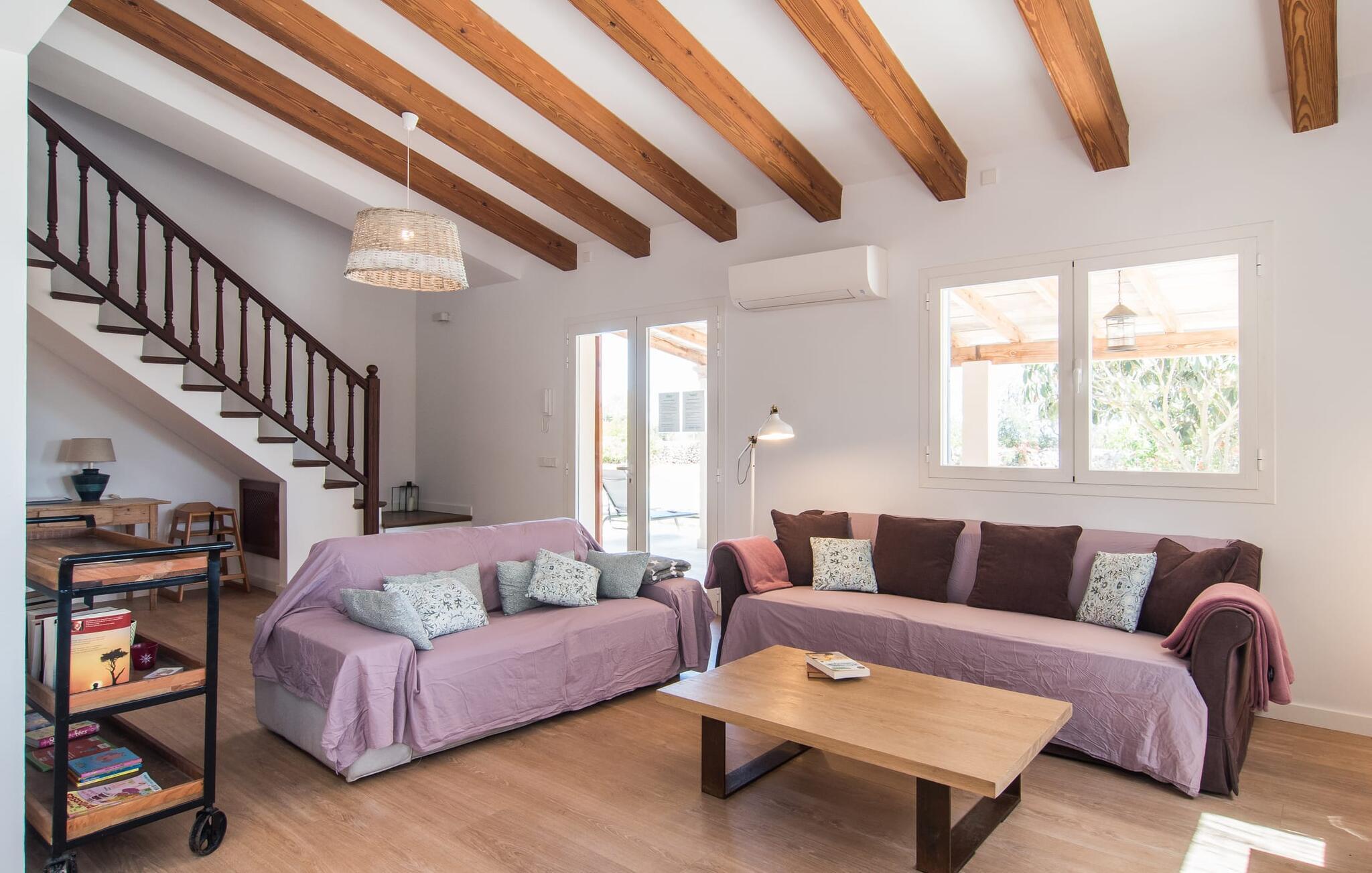 Den moderne villaejendom, kendt som "Ses Set Tanques de Son Fosquet", tilbyder en indbydende atmosfære med sine azurblå skodder og smukt anlagte middelhavshave. Dette er et Fincallorca feriehus. Ejendommen har en firkantet pool, perfekt til en forfriskende svømmetur. Gæsterne kan slappe af på aluminiums liggestole og liggestole, med vægt på afslapning på de tre overdækkede terrasser. På terrassen ud mod poolen inviterer en polyrattan lounge til at nyde kølige drinks, og der er et langt spisebord på en anden terrasse i skyggen af en markise. En iøjnefaldende funktion er det fuldt udstyrede udendørs køkken med grill, ovn og vask, hvilket gør al fresco spisning til en vidunderlig oplevelse. Det indendørs køkken er bekvemt tilgængeligt gennem et gulv til loft-vindue, hvilket giver mulighed for nem tilberedning af måltider. Villaens arkitektur fremmer åbenhed: Store åbninger sikrer en rummelig følelse og tilbyder samtidig hyggelige nicher til den smarte indretning i landlig stil. Hvert af de fem soveværelser har aircondition for komfort på varme sommerdage og har en-suite badeværelse for privatlivets fred. Med sin blanding af moderne bekvemmeligheder og charmerende design er denne villa ideel til nydelse året rundt og sikrer en uforglemmelig ferieoplevelse. "Ses Set Tanques de Son Fosquet" ligger i en vidunderlig landlig beliggenhed mellem øens hovedstad og det autentiske Llucmajor. Du kan nemt kombinere din shopping med et besøg på det ugentlige marked kun få kilometer væk. Markedet finder sted tre dage om ugen på Plaça Major. Ture til strandene i Palma-bugten eller til drømmestranden Es Trenc kan nemt tages på kort tid i bil.
