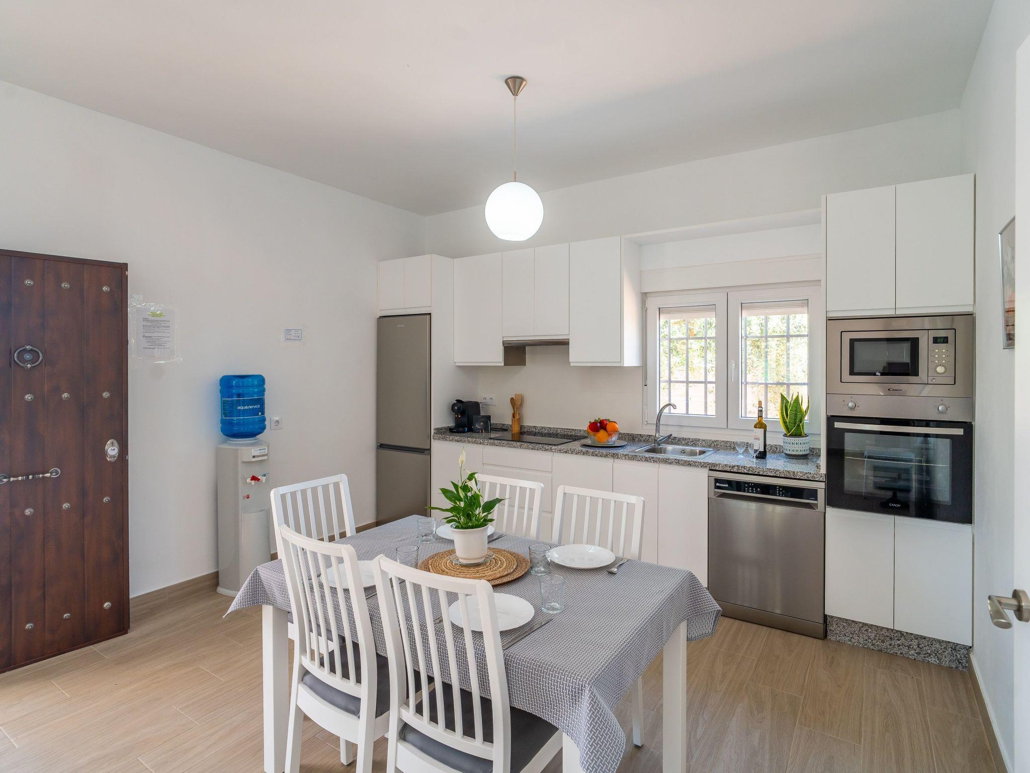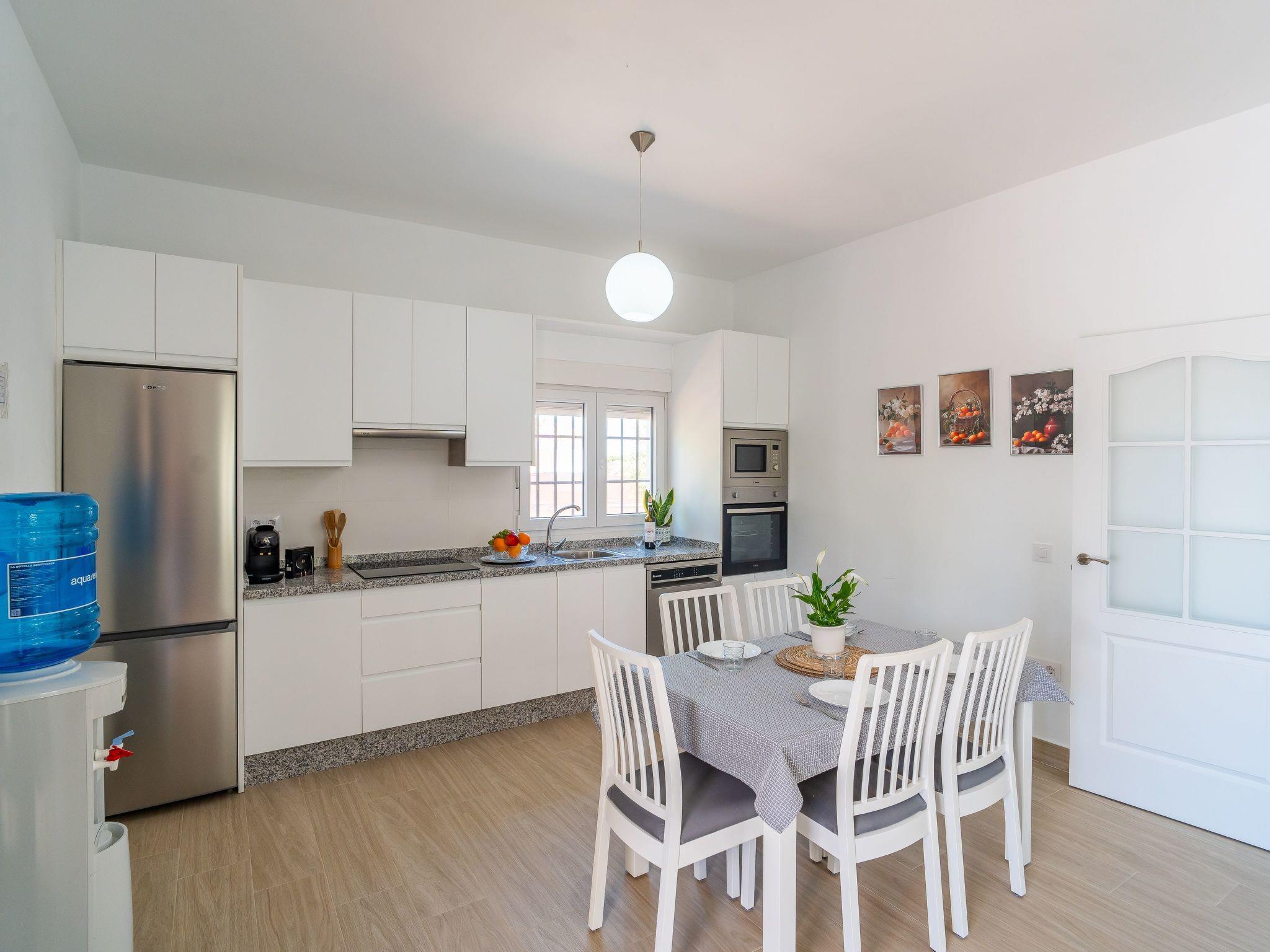 Kitchen open to the living room with 3-ring ceramic hob, oven, microwave, toaster, coffee machine, fridge, dishwasher...