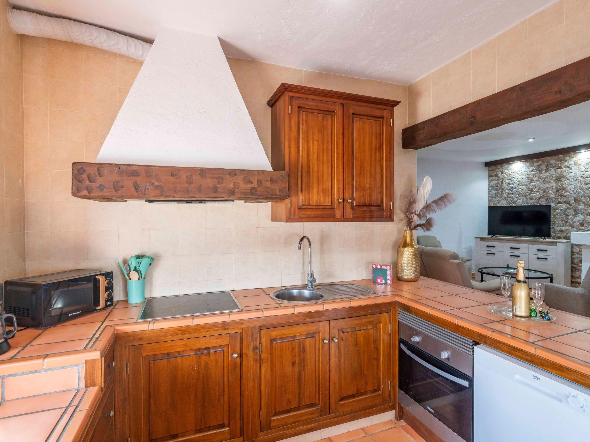 Kitchen open to the living room with ceramic hob, dishwasher, toaster, fridge, coffee maker, microwave....