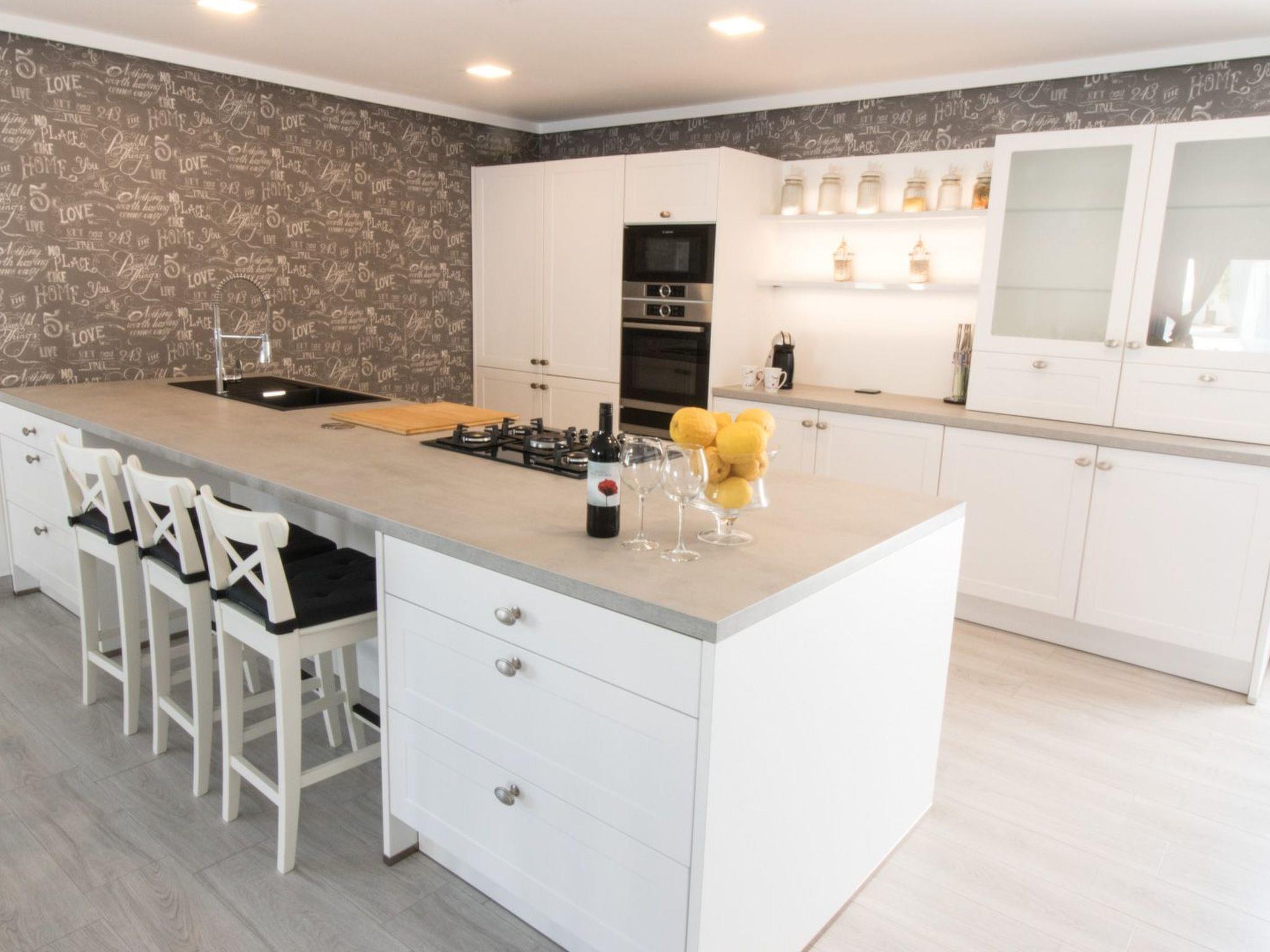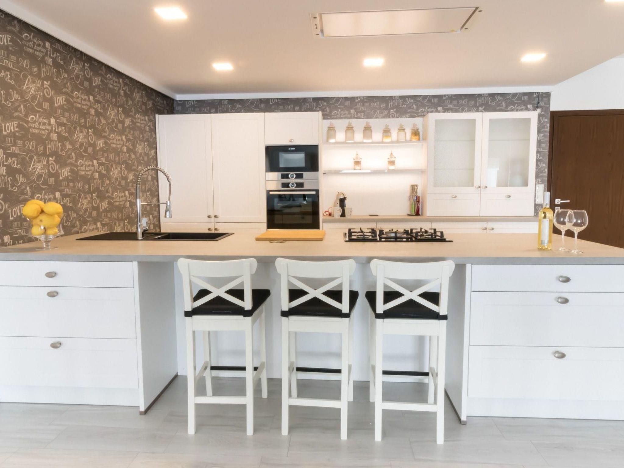Kitchen open to the living room with central island. It has a 5 burner cooker, oven, microwave, capsule coffee machine, toaster, fridge, dishwasher,...