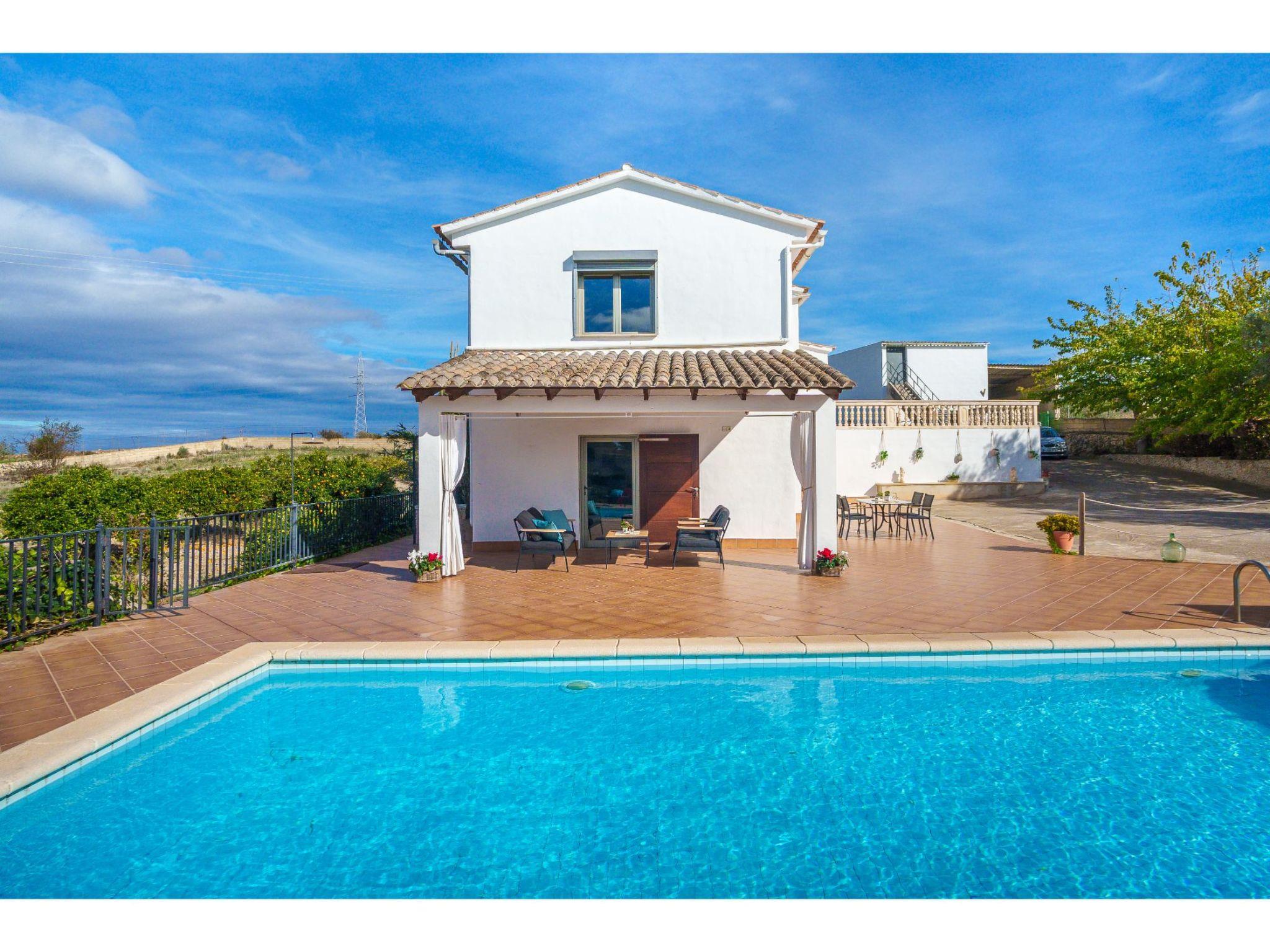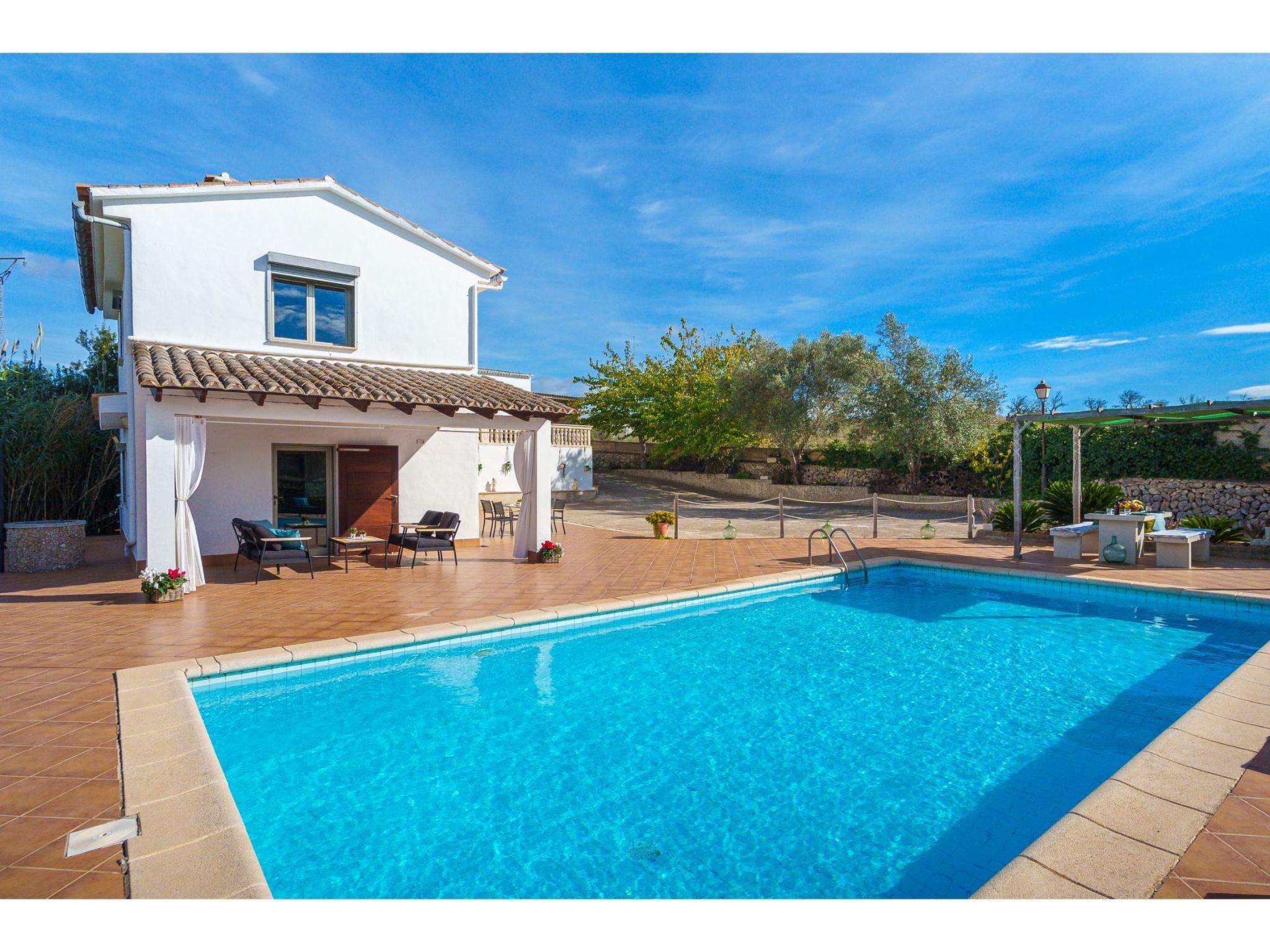 Son Alcaines 6 km from Sineu: Beautiful, comfortable single-family house "Son Alcaines Sineu", surrounded by fields. Outside the resort, 6 km from the centre of Sineu, in a quiet, sunny position, 2 km from the edge of the forest, 18 km from the sea, 18 km from the beach, in the countryside, north-west facing position. Private: orchard (fenced), swimming pool angular (5 x 10 m, depth 100 - 200 cm, seasonal availability: 01.Mar. - 31.Oct.) with alarm system. Outdoor shower, terrace (100 m2), barbecue, pool maintenance by the owner/gardener. Parking on the premises. Shop 6 km, grocery 6 km, supermarket 6 km, restaurant 1 km, bar 1 km, bakery 6 km, café 6 km, bicycle rental 18 km, tram "Sineu" 6 km, bus stop "Sineu" 6 km, railway station "Sineu" 6 km, ferry "Puerto de Alcudia" 30 km, sandy beach "Playa de Muro" 22 km. Sports harbour 18 km, marina 30 km, golf course (18 hole) 40 km, surf school 22 km, sailing school 22 km, tennis 18 km, riding stable 20 km, sports centre 18 km, walking paths from the house 10 km, cycle lane 5 km. Nearby attractions: Rafa Nadal Tennis Academy 10 km, Cuevas del Drach 18 km, Talaiots de Son Fornés 14 km, Museu Etnològic dels Calderers 11 km. Please note: car recommended. Suitable for families. Object suitable for 4 adults. The owner does not accept any groups. The owner does not accept any youth groups. Motorway 14 km from the property. Railway line 6 km from the property. Airfield 35 km from the property. Neighbourhood highly sensitive to noise. Quietness and good behaviour expected.