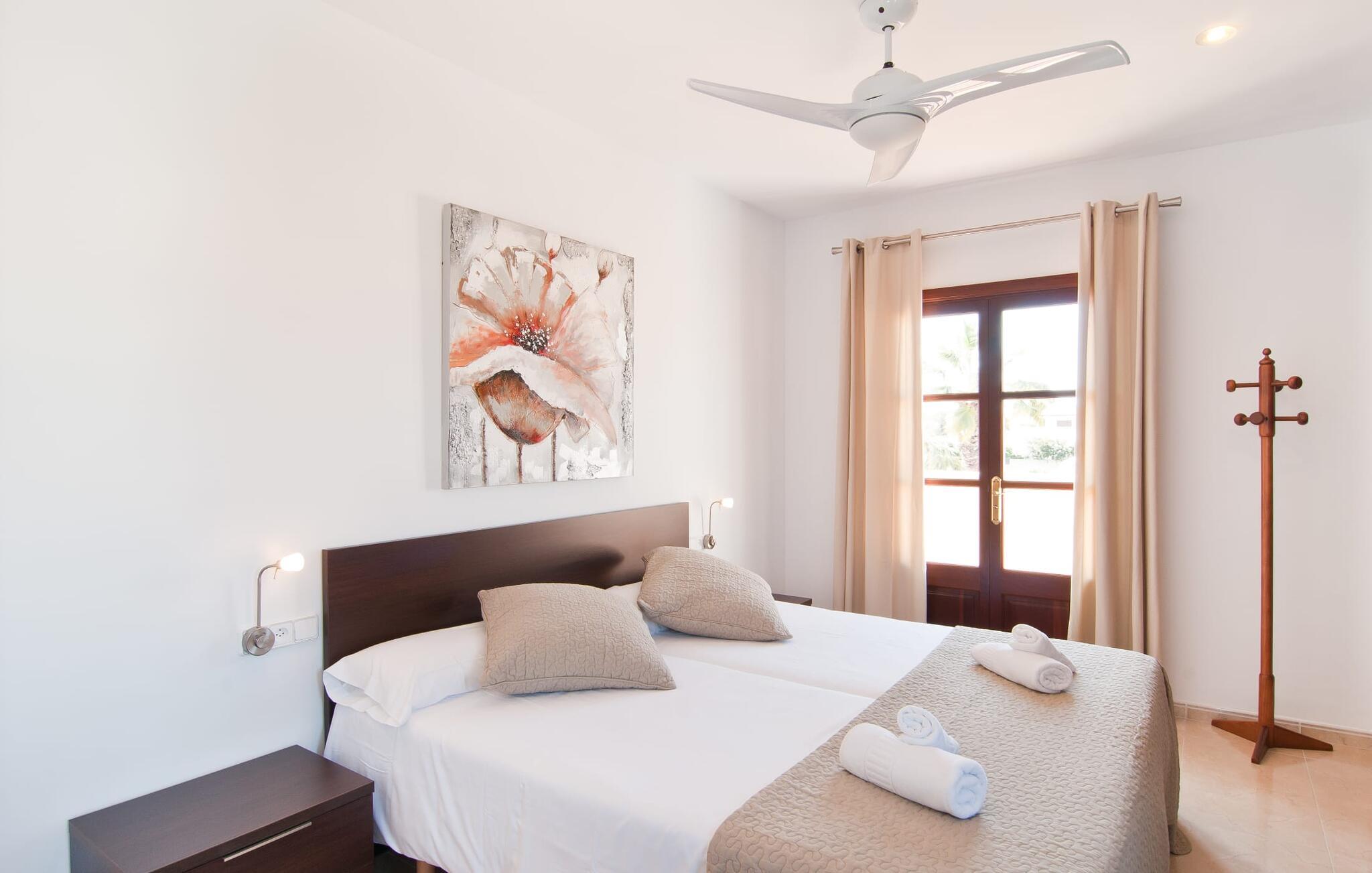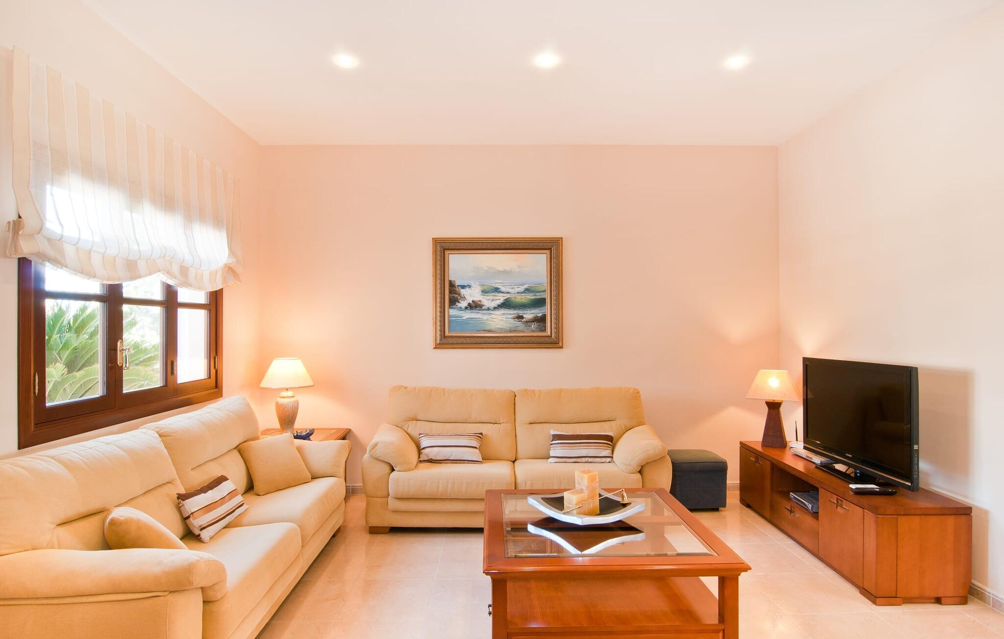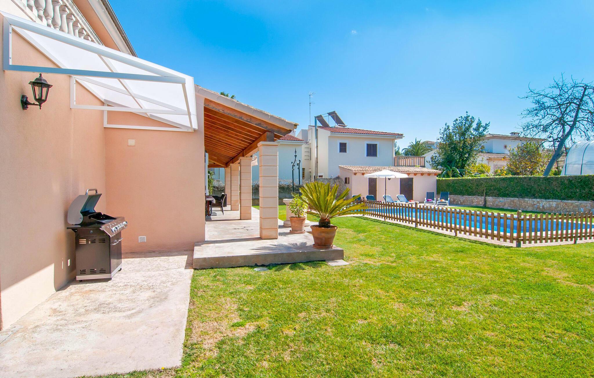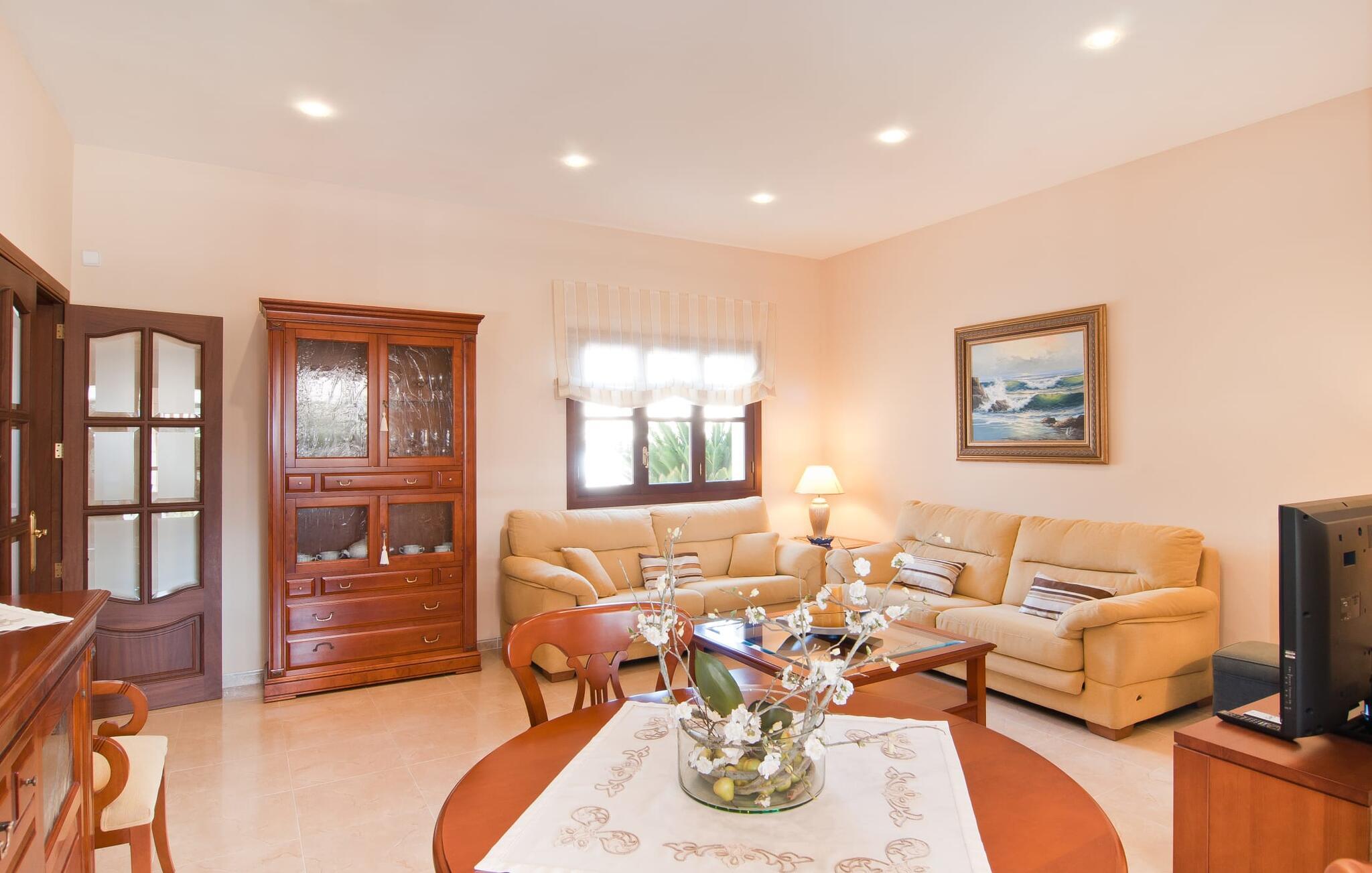 Villa "Sofia" er et charmerende, familievenligt tilflugtssted. Ved ankomsten bliver I mødt af to store bukser, mens en stille vej fører næsten direkte til huset til aflæsning og parkering. Den store græsplæne omkranser villaen og giver et skønt legeområde, mens et plankeværk sikrer poolen og sikrer tryghed. Nyd udendørslivet på den store skyggefulde veranda med en moderne elektrisk grill. Inde i villaen er der et lyst, moderne køkken med et langt spisebord, ideelt til sammenkomster. Den hyggelige stue byder på en rustik charme, mens tre elegant indrettede soveværelser deler badeværelse. Et ekstra soveværelse og badeværelse er placeret i stueetagen, hvilket gør det til et alsidigt rum for familier. Den smukke “Sofia” ligger nær strand og indkøbsmuligheder, midt i en rolig bebyggelse i Sa Coma. Beliggende på østkysten - mellem det sofistikerede Cala Millor og det maleriske Porto Cristo med dens havn og interessante kalkstensgrotter. To strande, Reserva Africa Safari Park og vidunderlige vandremuligheder på Punta de n'Amer-halvøen er i umiddelbar nærhed, og den nærmeste købmand er heller ikke langt væk. Elektricitet er inkluderet i prisen, hvis den anvendes hensigtsmæssigt. Gebyret afregnes herefter kontant på stedet. Bemærk venligst, at denne ejendom ikke accepterer ungdomsgrupper eller polterabender. En ungdomsgruppe på denne ejendom består af personer på 25 år eller derunder. Book ikke denne ejendom, hvis I er en ungdomsgruppe eller polterabend, da jeres reservation vil blive afvist, når den er booket, hvilket også kan være tilfældet ved ankomst til ejendommen eller under jeres ophold, og I vil ikke modtage en refusion
