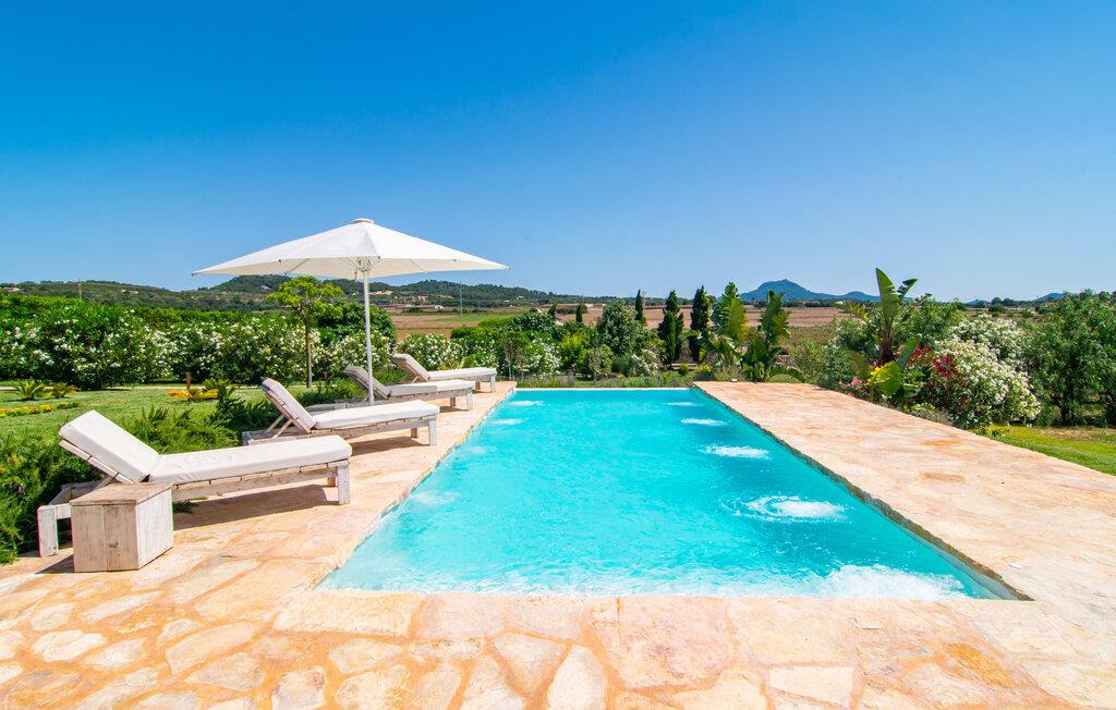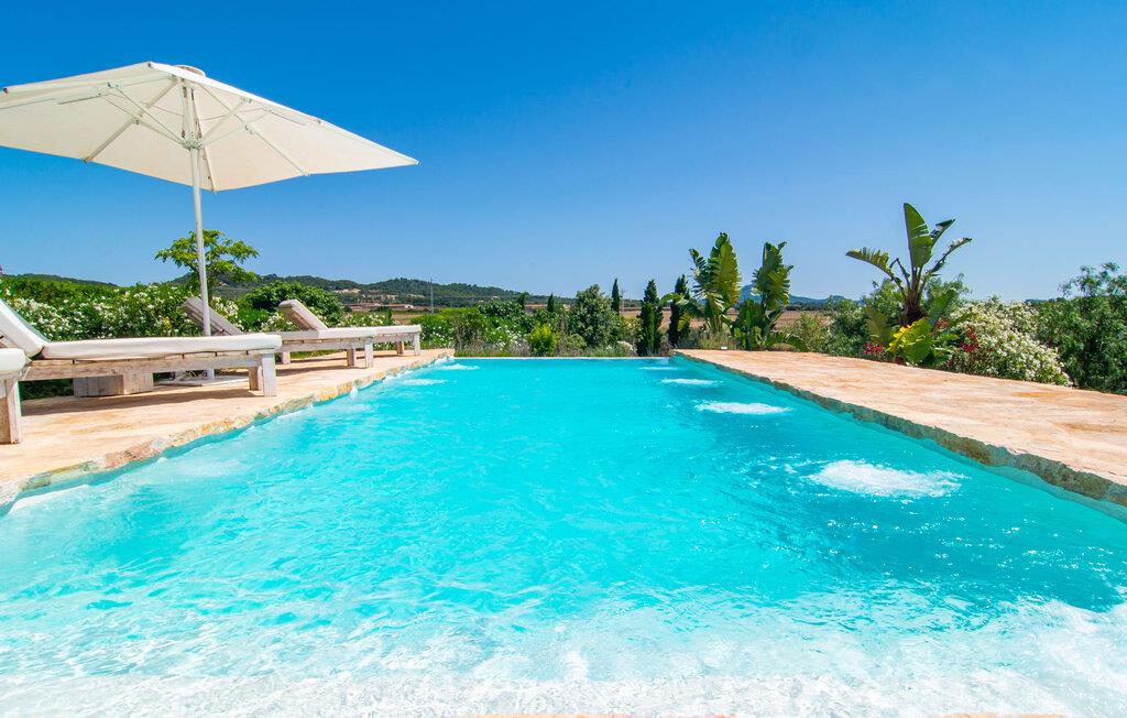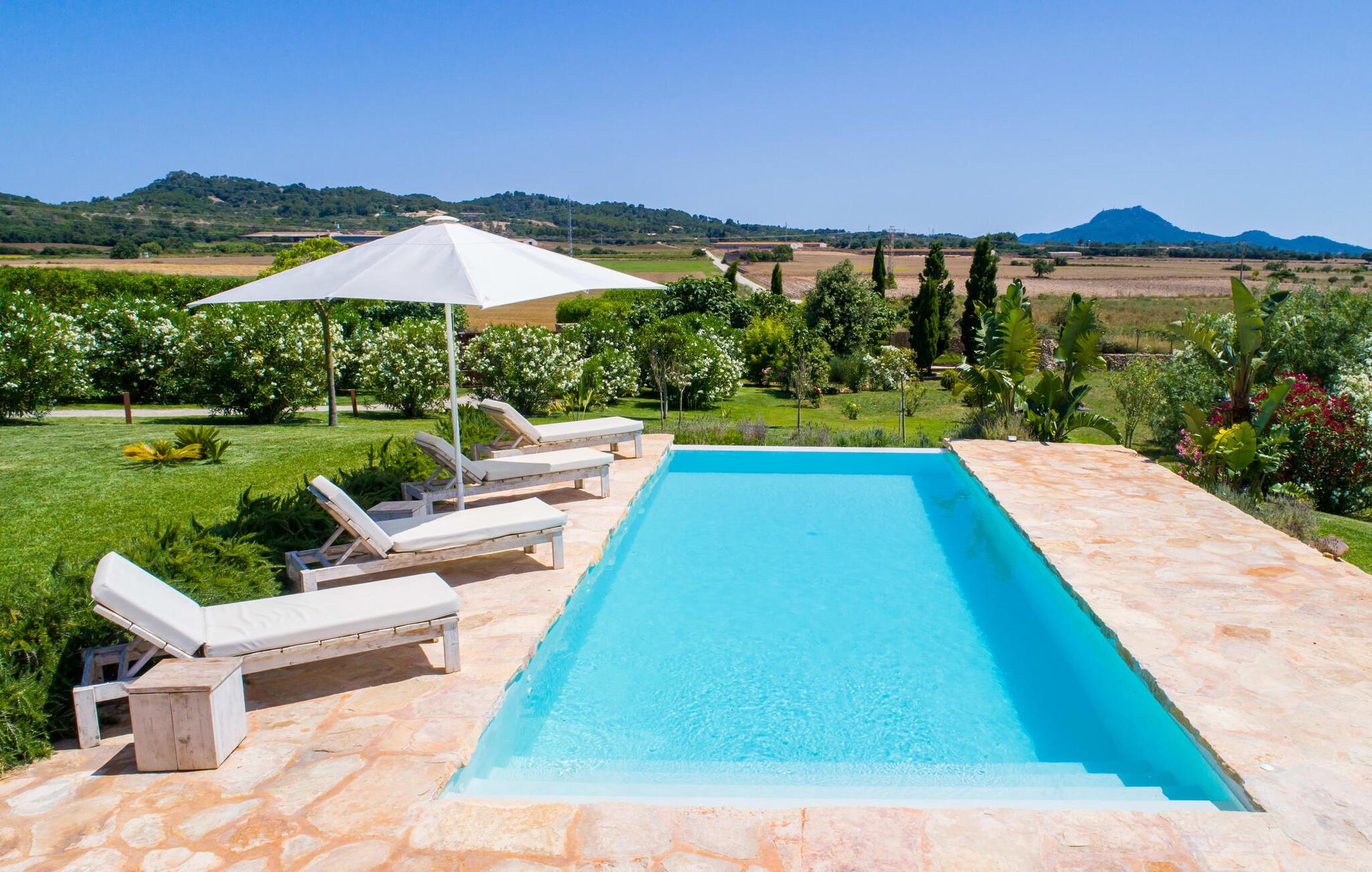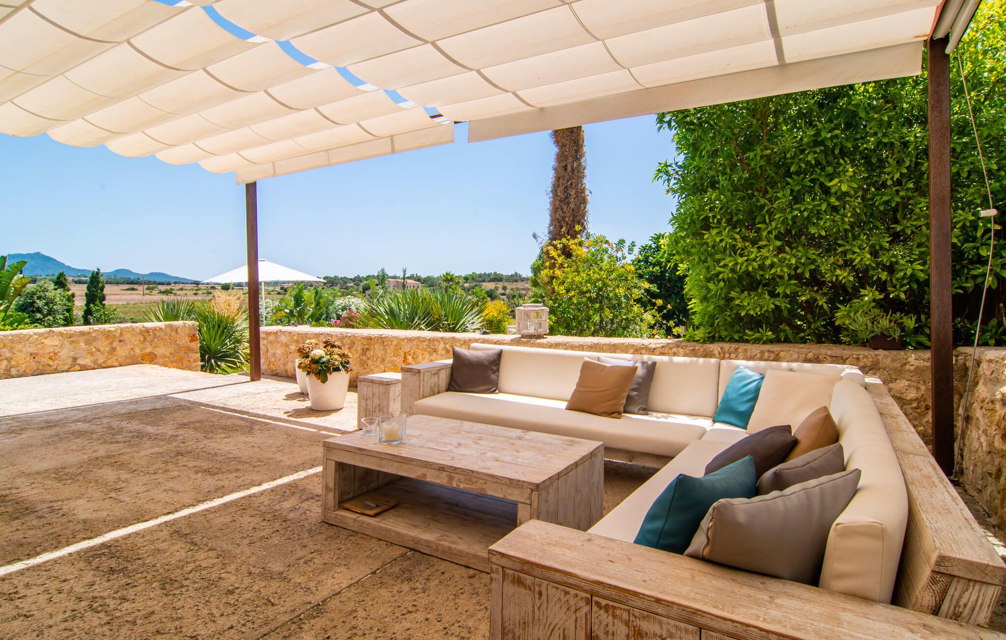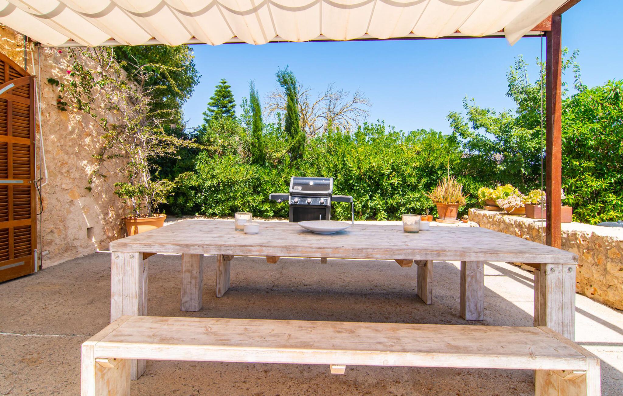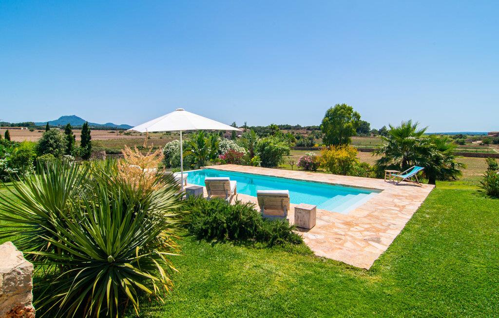 Naturstensvillaen "Son Artigues" er det helt rigtige for jer, hvis I leder efter en hjemmebase af oase-agtig skønhed til jeres udforskninger på den varierede østkyst. Den landlige beliggenhed giver mulighed for en befriende 360° udsigt over det smukke, for det meste flade område. I baggrunden kan man se de bølgende bakker, foran dem fører gårdvejene hen over markerne. Et stilleben, der ville få mange malere til at ville trække penslen frem, når de ser den. Inden I går til den store skærm, kan I nyde de andre muligheder på denne helt igennem afslappende ejendom. Efter en lang svømmetur i poolen kan I så lade tankerne få frit løb på den solrige terrasse. Eller I kan flytte ind i en af de udendørs himmelsenge. På varme sommernætter er de det ideelle sted at se op på de smukke stjerner. Spredte palmer, buske og andre træer giver ejendommen en parkagtig atmosfære. Fire stentrappe fører jer til en overdækket terrasse, som giver skygge ved frokosttid, og på hvis loungesofa I kan nyde en cocktail om aftenen. Eller I kan tænde for gasgrillen og tilberede noget lækkert. På den modsatte side, ved indgangen, er der et fortelt, så man kan trække sig tilbage her om dagen til et festmåltid. De brede glasbuer lader masser af naturligt lys strømme ind i opholdsrum og køkken, så de lyse, venlige farver er synlige og ser godt ud. I indgangspartiet inviterer en behagelig lænestol jer til at blive hængende. I kan også sætte jer ned i stuen på den enorme chaiselong-sofa eller to brune lænestole og fordybe jer i eventyrlige verdener foran fladskærms-tv'et eller læse rejseguider og planlægge jeres kommende ferie ved pejsen. Ideelt set vil en anden begynde at lave mad i mellemtiden, så I på et tidspunkt vil høre det længe ventede kald: "Middagen er klar." Så kan I samles i den smarte spisestue, tage plads ved langbordet under tropen -looking lamp og få et socialt måltid start aftenen. Begge soveværelser er på øverste etage, som I kan nå via den særligt oplyste trappe. Den ene har en stilfuld træseng og direkte udgang til tagterrassen, hvorfra udsigten strækker sig endnu længere. Vi var særligt imponerede over husets kompakte arkitektur og indretning, og vi er sikre på, at I ved at vælge denne ejendom vil få en helt afslappende og vellykket ferie. Derudover er beliggenheden på øen meget attraktiv. Villaen er godt forbundet med øens vejnet, selvom landevejen af og til kan høres afhængig af vindretningen. I kan hurtigt nå det smarte Manacor, som kun ligger 8 km væk. Navnet på øens næststørste by betyder "hånden på hjertet"; og byens særlige charme kan virkelig røre folk. Udover perler er byen også berømt for sit udsøgte keramik, lækre vine og meget mere. I er sikker på at finde en passende souvenir her. Der er et frugt- og grøntsagsmarked hver dag (undtagen søndage) på Placa Constitucio. Landsbyen Son Macia, som ligger lidt tættere på, er også et besøg værd. Derudover bør I prøve havneatmosfæren i Porto Christo og prøve de maritime forlystelser i Porto Colom (begge omkring 19 km væk). Til stranddage anbefaler vi Cala Varques, 17 km væk, med fint sand og behagelig lavvandet adgang til havet. Naturstensvillaen "Son Artigues" er omgivet af grønne områder, men ligger også kun 5 km fra den smukke by Son Macia. Der kan I gøre alle jeres indkøb og se byens travlhed fra en café. For en shoppingtur er det også værd at besøge Manacor, 8 km væk, som er kendt for sine fortryllende smukke perler. Fantastiske naturlige strande som Cala Varques ligger kun 17 km væk.