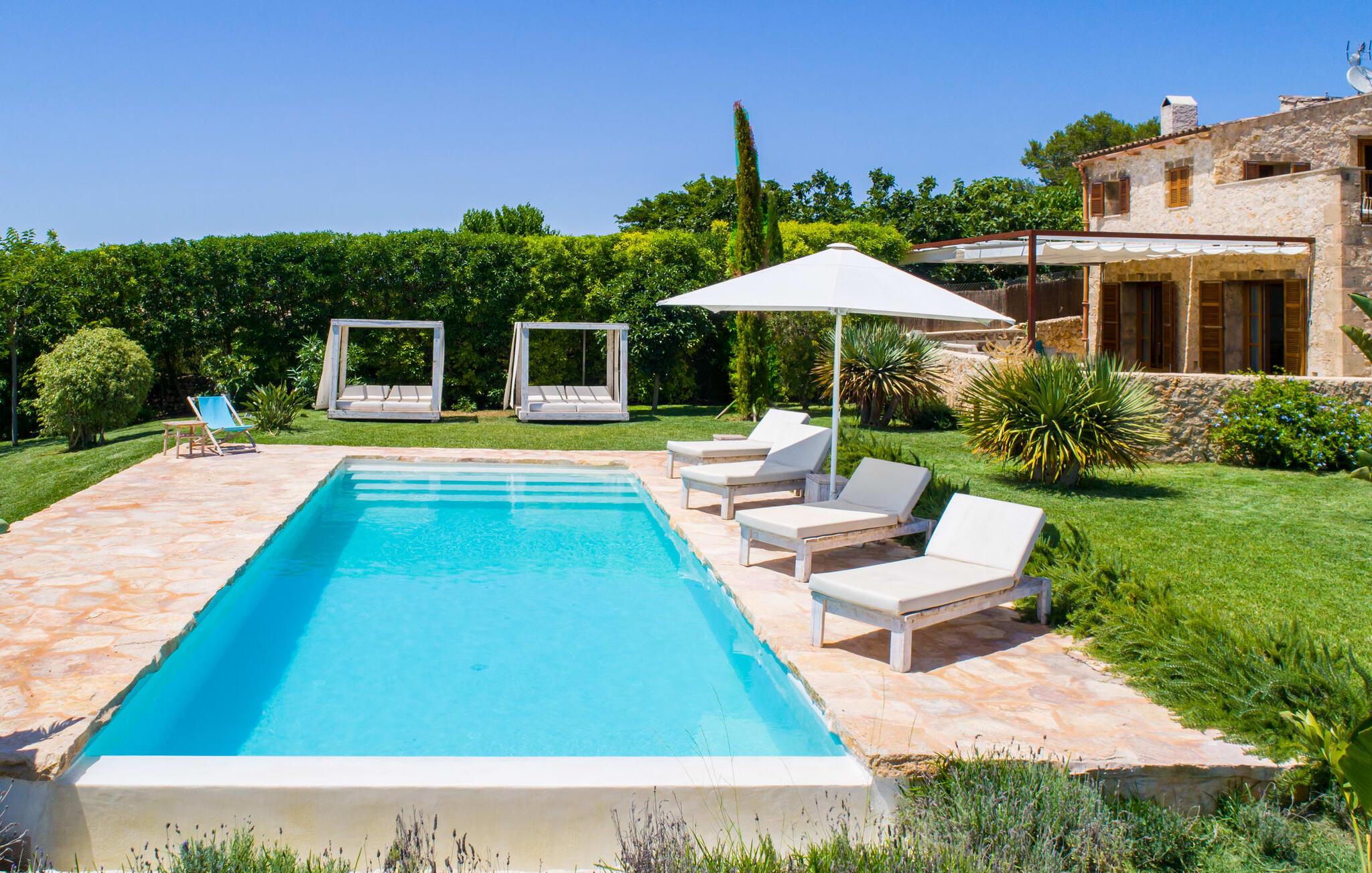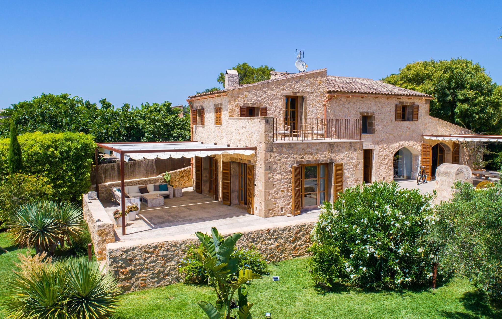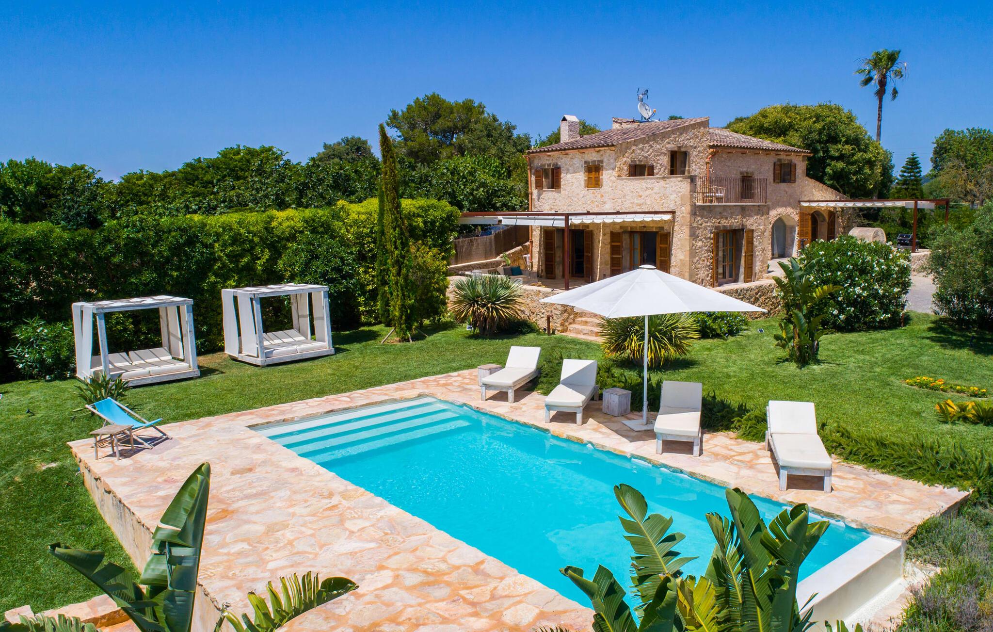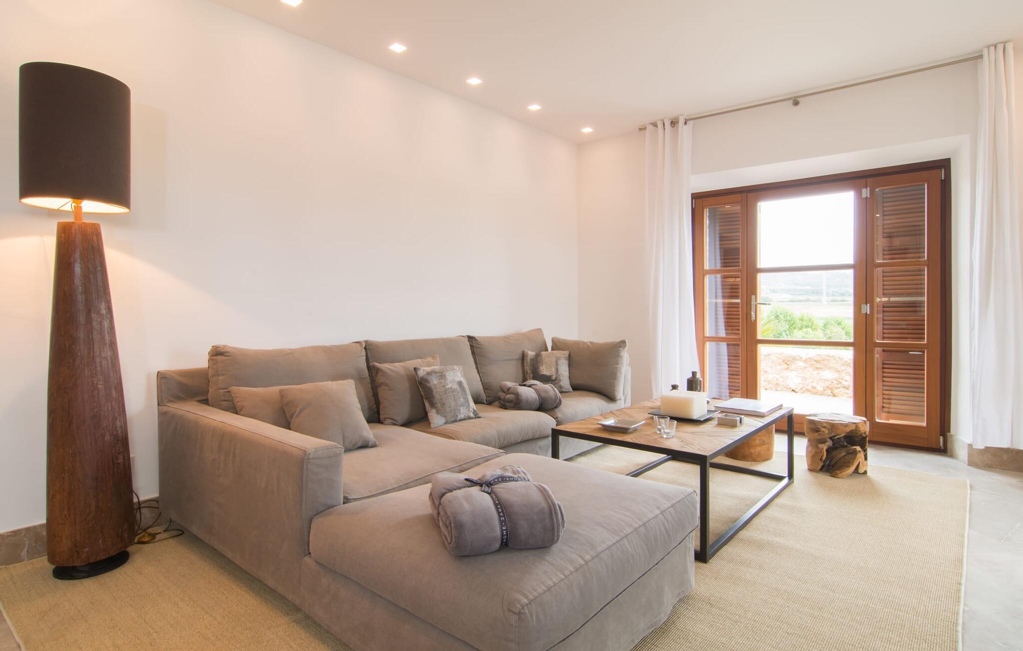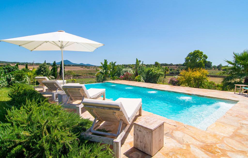 Naturstensvillaen "Son Artigues" er det helt rigtige for jer, hvis I leder efter en hjemmebase af oase-agtig skønhed til jeres udforskninger på den varierede østkyst. Den landlige beliggenhed giver mulighed for en befriende 360° udsigt over det smukke, for det meste flade område. I baggrunden kan man se de bølgende bakker, foran dem fører gårdvejene hen over markerne. Et stilleben, der ville få mange malere til at ville trække penslen frem, når de ser den. Inden I går til den store skærm, kan I nyde de andre muligheder på denne helt igennem afslappende ejendom. Efter en lang svømmetur i poolen kan I så lade tankerne få frit løb på den solrige terrasse. Eller I kan flytte ind i en af de udendørs himmelsenge. På varme sommernætter er de det ideelle sted at se op på de smukke stjerner. Spredte palmer, buske og andre træer giver ejendommen en parkagtig atmosfære. Fire stentrappe fører jer til en overdækket terrasse, som giver skygge ved frokosttid, og på hvis loungesofa I kan nyde en cocktail om aftenen. Eller I kan tænde for gasgrillen og tilberede noget lækkert. På den modsatte side, ved indgangen, er der et fortelt, så man kan trække sig tilbage her om dagen til et festmåltid. De brede glasbuer lader masser af naturligt lys strømme ind i opholdsrum og køkken, så de lyse, venlige farver er synlige og ser godt ud. I indgangspartiet inviterer en behagelig lænestol jer til at blive hængende. I kan også sætte jer ned i stuen på den enorme chaiselong-sofa eller to brune lænestole og fordybe jer i eventyrlige verdener foran fladskærms-tv'et eller læse rejseguider og planlægge jeres kommende ferie ved pejsen. Ideelt set vil en anden begynde at lave mad i mellemtiden, så I på et tidspunkt vil høre det længe ventede kald: "Middagen er klar." Så kan I samles i den smarte spisestue, tage plads ved langbordet under tropen -looking lamp og få et socialt måltid start aftenen. Begge soveværelser er på øverste etage, som I kan nå via den særligt oplyste trappe. Den ene har en stilfuld træseng og direkte udgang til tagterrassen, hvorfra udsigten strækker sig endnu længere. Vi var særligt imponerede over husets kompakte arkitektur og indretning, og vi er sikre på, at I ved at vælge denne ejendom vil få en helt afslappende og vellykket ferie. Derudover er beliggenheden på øen meget attraktiv. Villaen er godt forbundet med øens vejnet, selvom landevejen af og til kan høres afhængig af vindretningen. I kan hurtigt nå det smarte Manacor, som kun ligger 8 km væk. Navnet på øens næststørste by betyder "hånden på hjertet"; og byens særlige charme kan virkelig røre folk. Udover perler er byen også berømt for sit udsøgte keramik, lækre vine og meget mere. I er sikker på at finde en passende souvenir her. Der er et frugt- og grøntsagsmarked hver dag (undtagen søndage) på Placa Constitucio. Landsbyen Son Macia, som ligger lidt tættere på, er også et besøg værd. Derudover bør I prøve havneatmosfæren i Porto Christo og prøve de maritime forlystelser i Porto Colom (begge omkring 19 km væk). Til stranddage anbefaler vi Cala Varques, 17 km væk, med fint sand og behagelig lavvandet adgang til havet. Naturstensvillaen "Son Artigues" er omgivet af grønne områder, men ligger også kun 5 km fra den smukke by Son Macia. Der kan I gøre alle jeres indkøb og se byens travlhed fra en café. For en shoppingtur er det også værd at besøge Manacor, 8 km væk, som er kendt for sine fortryllende smukke perler. Fantastiske naturlige strande som Cala Varques ligger kun 17 km væk.