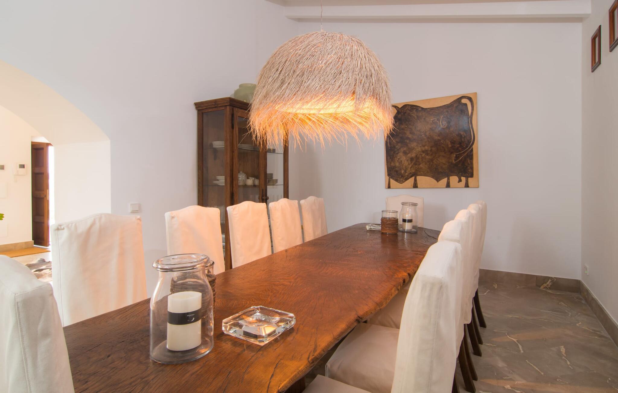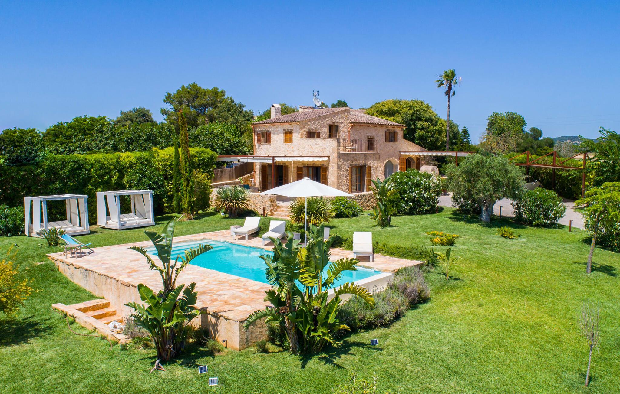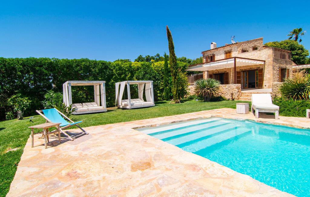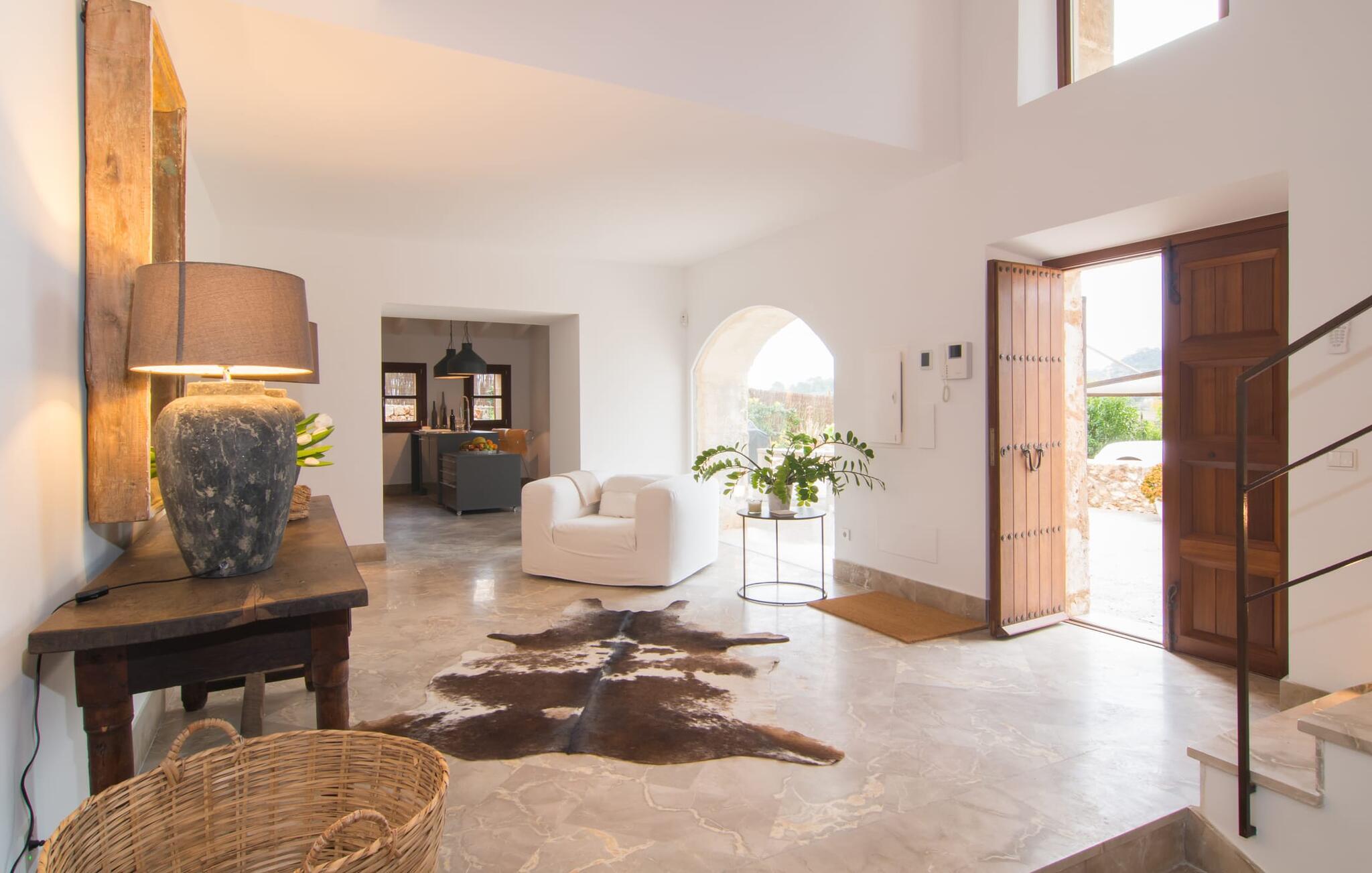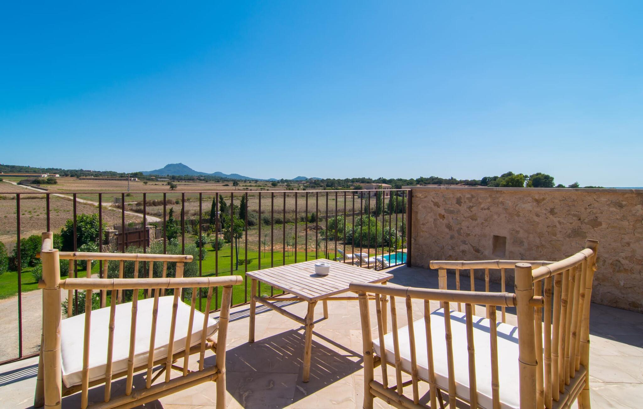Naturstensvillaen "Son Artigues" er det helt rigtige for jer, hvis I leder efter en hjemmebase af oase-agtig skønhed til jeres udforskninger på den varierede østkyst. Den landlige beliggenhed giver mulighed for en befriende 360° udsigt over det smukke, for det meste flade område. I baggrunden kan man se de bølgende bakker, foran dem fører gårdvejene hen over markerne. Et stilleben, der ville få mange malere til at ville trække penslen frem, når de ser den. Inden I går til den store skærm, kan I nyde de andre muligheder på denne helt igennem afslappende ejendom. Efter en lang svømmetur i poolen kan I så lade tankerne få frit løb på den solrige terrasse. Eller I kan flytte ind i en af de udendørs himmelsenge. På varme sommernætter er de det ideelle sted at se op på de smukke stjerner. Spredte palmer, buske og andre træer giver ejendommen en parkagtig atmosfære. Fire stentrappe fører jer til en overdækket terrasse, som giver skygge ved frokosttid, og på hvis loungesofa I kan nyde en cocktail om aftenen. Eller I kan tænde for gasgrillen og tilberede noget lækkert. På den modsatte side, ved indgangen, er der et fortelt, så man kan trække sig tilbage her om dagen til et festmåltid. De brede glasbuer lader masser af naturligt lys strømme ind i opholdsrum og køkken, så de lyse, venlige farver er synlige og ser godt ud. I indgangspartiet inviterer en behagelig lænestol jer til at blive hængende. I kan også sætte jer ned i stuen på den enorme chaiselong-sofa eller to brune lænestole og fordybe jer i eventyrlige verdener foran fladskærms-tv'et eller læse rejseguider og planlægge jeres kommende ferie ved pejsen. Ideelt set vil en anden begynde at lave mad i mellemtiden, så I på et tidspunkt vil høre det længe ventede kald: "Middagen er klar." Så kan I samles i den smarte spisestue, tage plads ved langbordet under tropen -looking lamp og få et socialt måltid start aftenen. Begge soveværelser er på øverste etage, som I kan nå via den særligt oplyste trappe. Den ene har en stilfuld træseng og direkte udgang til tagterrassen, hvorfra udsigten strækker sig endnu længere. Vi var særligt imponerede over husets kompakte arkitektur og indretning, og vi er sikre på, at I ved at vælge denne ejendom vil få en helt afslappende og vellykket ferie. Derudover er beliggenheden på øen meget attraktiv. Villaen er godt forbundet med øens vejnet, selvom landevejen af og til kan høres afhængig af vindretningen. I kan hurtigt nå det smarte Manacor, som kun ligger 8 km væk. Navnet på øens næststørste by betyder "hånden på hjertet"; og byens særlige charme kan virkelig røre folk. Udover perler er byen også berømt for sit udsøgte keramik, lækre vine og meget mere. I er sikker på at finde en passende souvenir her. Der er et frugt- og grøntsagsmarked hver dag (undtagen søndage) på Placa Constitucio. Landsbyen Son Macia, som ligger lidt tættere på, er også et besøg værd. Derudover bør I prøve havneatmosfæren i Porto Christo og prøve de maritime forlystelser i Porto Colom (begge omkring 19 km væk). Til stranddage anbefaler vi Cala Varques, 17 km væk, med fint sand og behagelig lavvandet adgang til havet. Naturstensvillaen "Son Artigues" er omgivet af grønne områder, men ligger også kun 5 km fra den smukke by Son Macia. Der kan I gøre alle jeres indkøb og se byens travlhed fra en café. For en shoppingtur er det også værd at besøge Manacor, 8 km væk, som er kendt for sine fortryllende smukke perler. Fantastiske naturlige strande som Cala Varques ligger kun 17 km væk.
