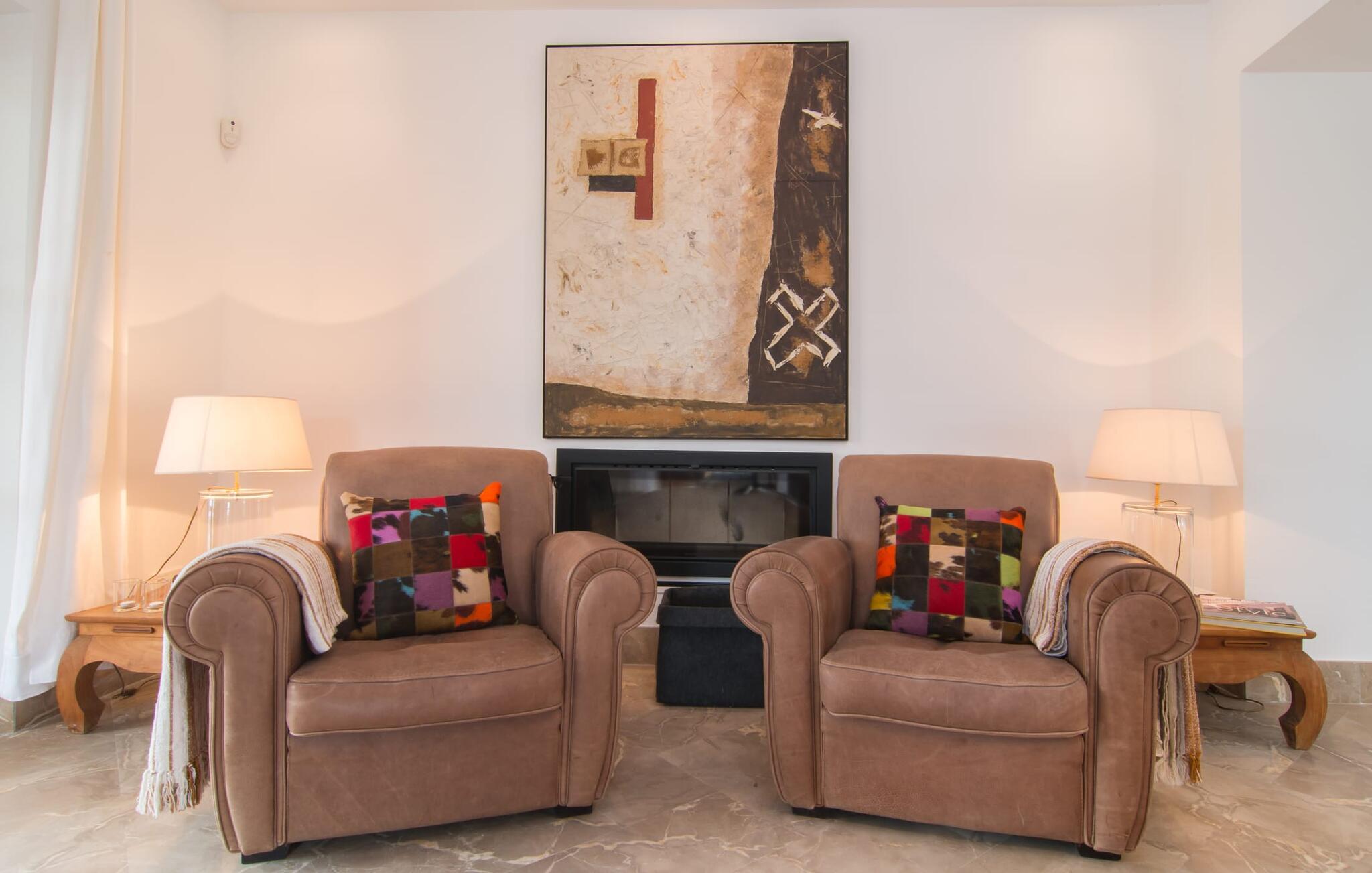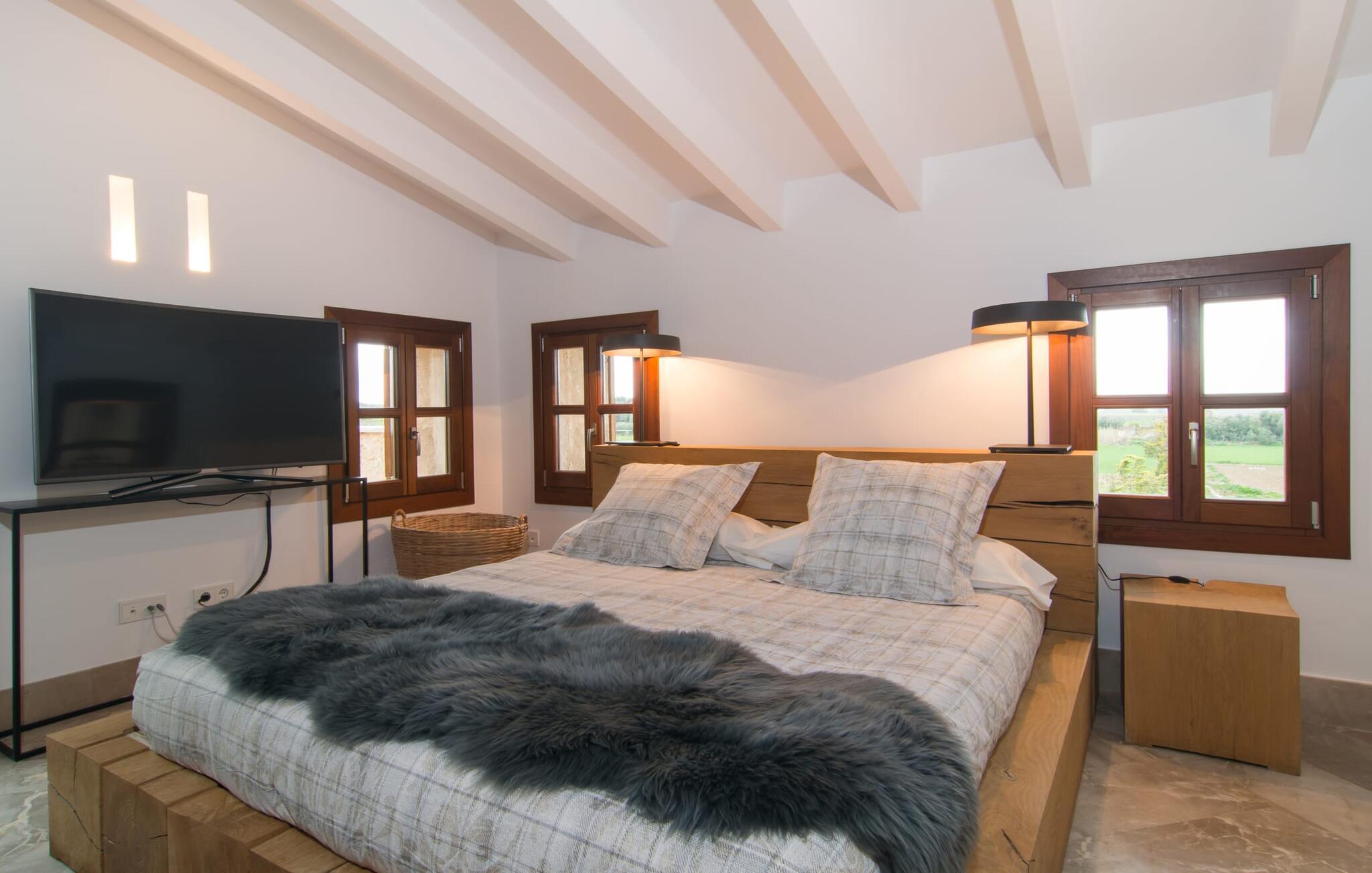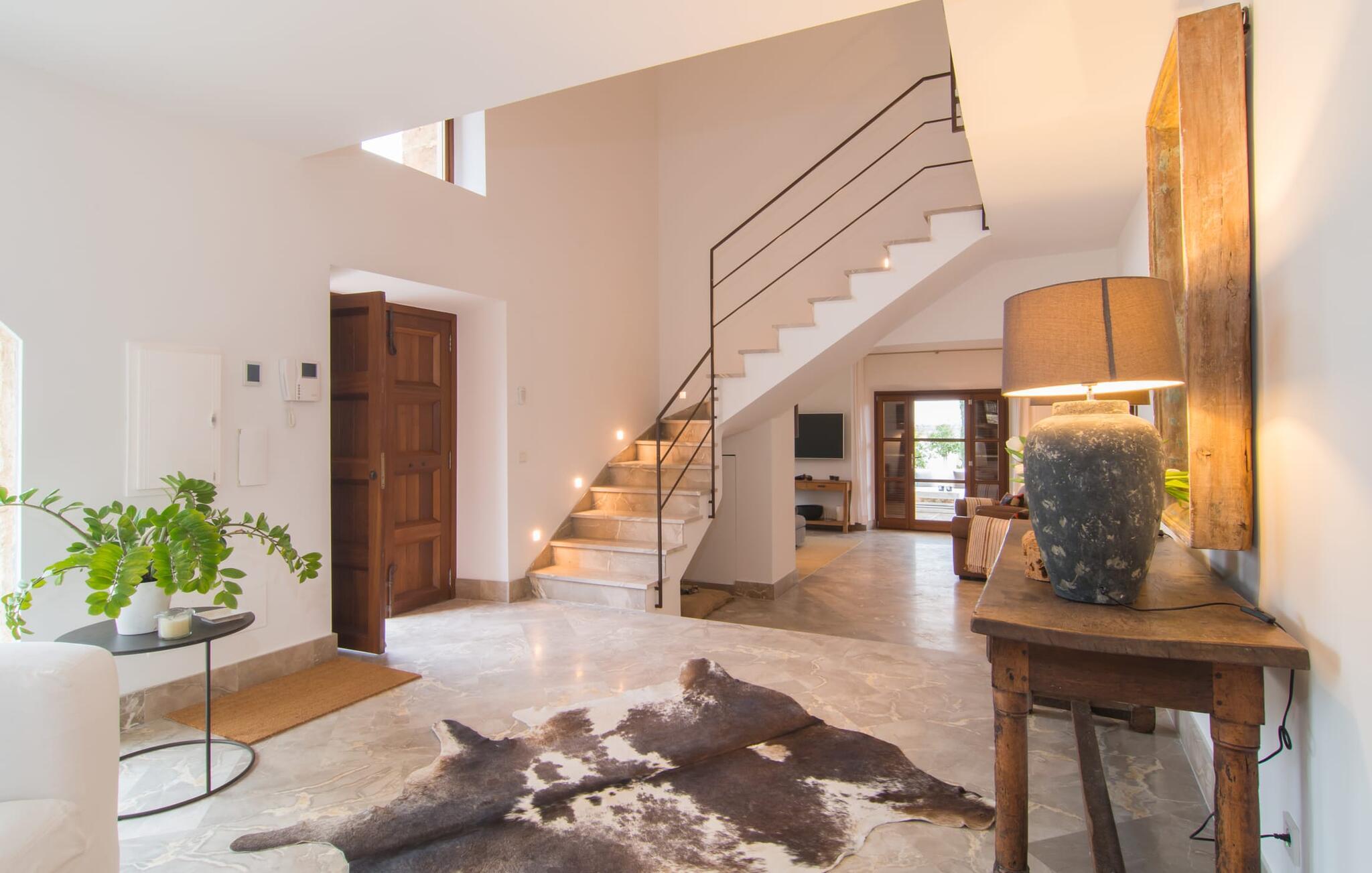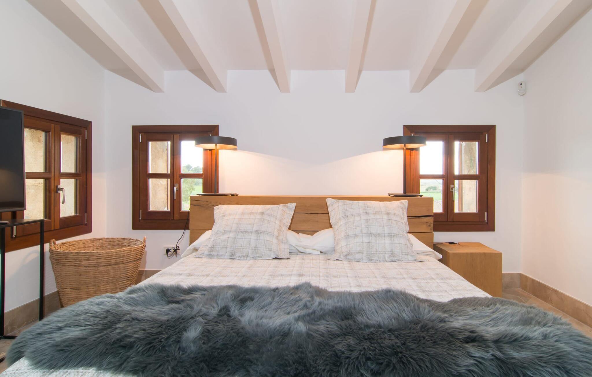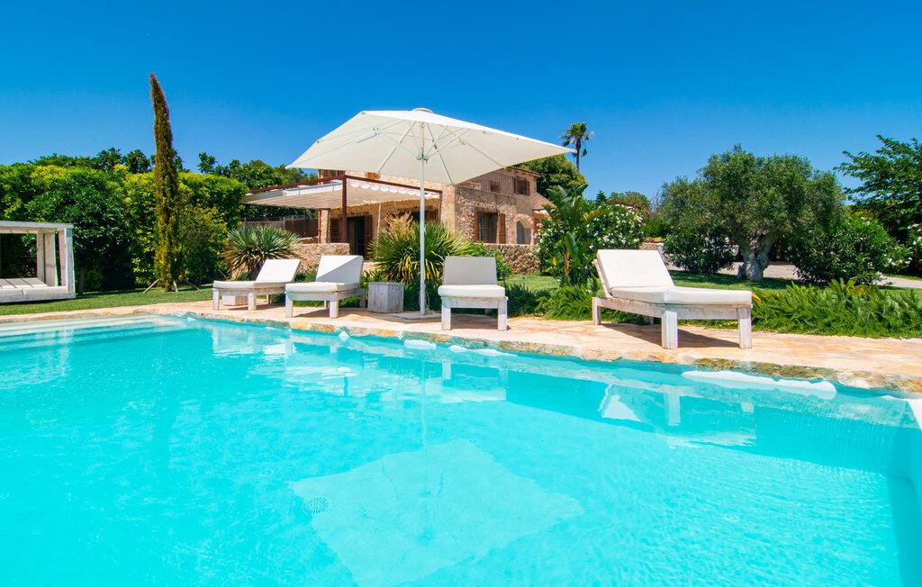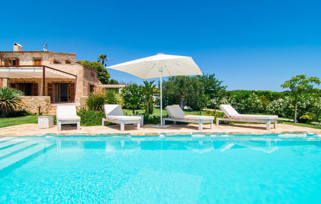 Naturstensvillaen "Son Artigues" er det helt rigtige for jer, hvis I leder efter en hjemmebase af oase-agtig skønhed til jeres udforskninger på den varierede østkyst. Den landlige beliggenhed giver mulighed for en befriende 360° udsigt over det smukke, for det meste flade område. I baggrunden kan man se de bølgende bakker, foran dem fører gårdvejene hen over markerne. Et stilleben, der ville få mange malere til at ville trække penslen frem, når de ser den. Inden I går til den store skærm, kan I nyde de andre muligheder på denne helt igennem afslappende ejendom. Efter en lang svømmetur i poolen kan I så lade tankerne få frit løb på den solrige terrasse. Eller I kan flytte ind i en af de udendørs himmelsenge. På varme sommernætter er de det ideelle sted at se op på de smukke stjerner. Spredte palmer, buske og andre træer giver ejendommen en parkagtig atmosfære. Fire stentrappe fører jer til en overdækket terrasse, som giver skygge ved frokosttid, og på hvis loungesofa I kan nyde en cocktail om aftenen. Eller I kan tænde for gasgrillen og tilberede noget lækkert. På den modsatte side, ved indgangen, er der et fortelt, så man kan trække sig tilbage her om dagen til et festmåltid. De brede glasbuer lader masser af naturligt lys strømme ind i opholdsrum og køkken, så de lyse, venlige farver er synlige og ser godt ud. I indgangspartiet inviterer en behagelig lænestol jer til at blive hængende. I kan også sætte jer ned i stuen på den enorme chaiselong-sofa eller to brune lænestole og fordybe jer i eventyrlige verdener foran fladskærms-tv'et eller læse rejseguider og planlægge jeres kommende ferie ved pejsen. Ideelt set vil en anden begynde at lave mad i mellemtiden, så I på et tidspunkt vil høre det længe ventede kald: "Middagen er klar." Så kan I samles i den smarte spisestue, tage plads ved langbordet under tropen -looking lamp og få et socialt måltid start aftenen. Begge soveværelser er på øverste etage, som I kan nå via den særligt oplyste trappe. Den ene har en stilfuld træseng og direkte udgang til tagterrassen, hvorfra udsigten strækker sig endnu længere. Vi var særligt imponerede over husets kompakte arkitektur og indretning, og vi er sikre på, at I ved at vælge denne ejendom vil få en helt afslappende og vellykket ferie. Derudover er beliggenheden på øen meget attraktiv. Villaen er godt forbundet med øens vejnet, selvom landevejen af og til kan høres afhængig af vindretningen. I kan hurtigt nå det smarte Manacor, som kun ligger 8 km væk. Navnet på øens næststørste by betyder "hånden på hjertet"; og byens særlige charme kan virkelig røre folk. Udover perler er byen også berømt for sit udsøgte keramik, lækre vine og meget mere. I er sikker på at finde en passende souvenir her. Der er et frugt- og grøntsagsmarked hver dag (undtagen søndage) på Placa Constitucio. Landsbyen Son Macia, som ligger lidt tættere på, er også et besøg værd. Derudover bør I prøve havneatmosfæren i Porto Christo og prøve de maritime forlystelser i Porto Colom (begge omkring 19 km væk). Til stranddage anbefaler vi Cala Varques, 17 km væk, med fint sand og behagelig lavvandet adgang til havet. Naturstensvillaen "Son Artigues" er omgivet af grønne områder, men ligger også kun 5 km fra den smukke by Son Macia. Der kan I gøre alle jeres indkøb og se byens travlhed fra en café. For en shoppingtur er det også værd at besøge Manacor, 8 km væk, som er kendt for sine fortryllende smukke perler. Fantastiske naturlige strande som Cala Varques ligger kun 17 km væk.