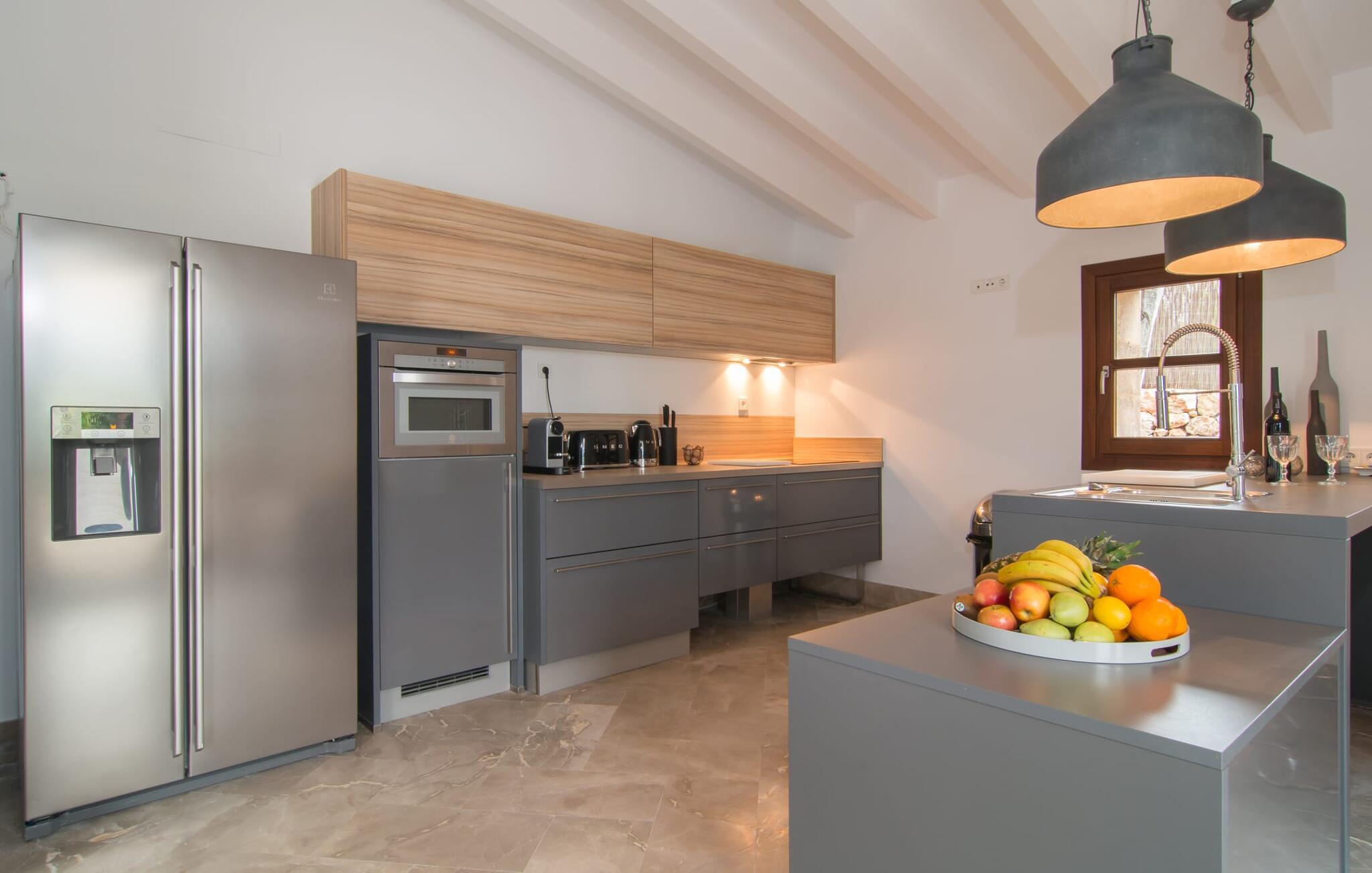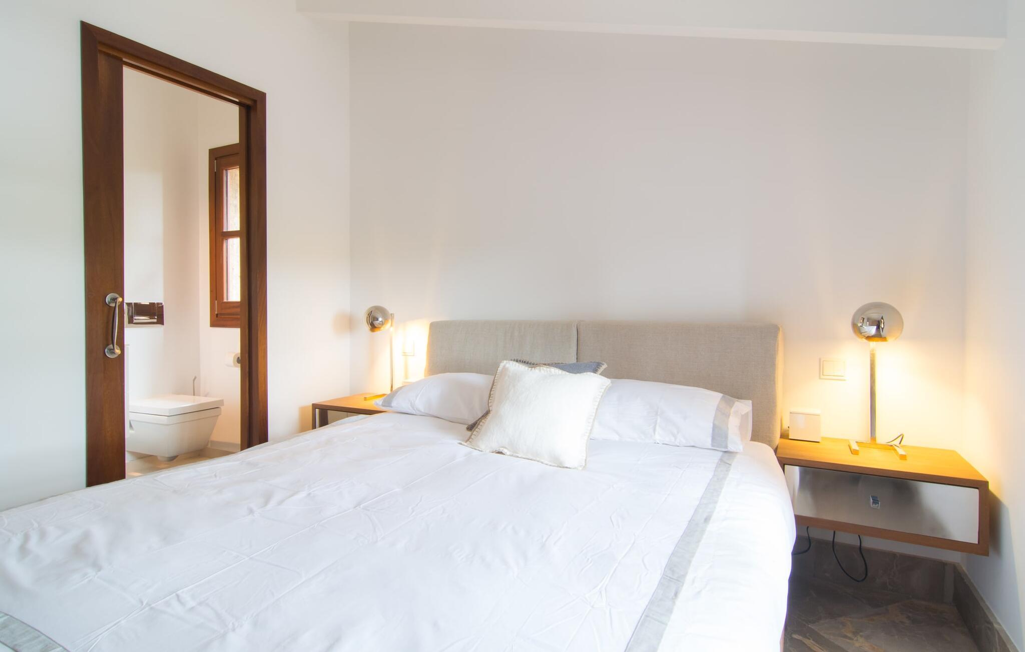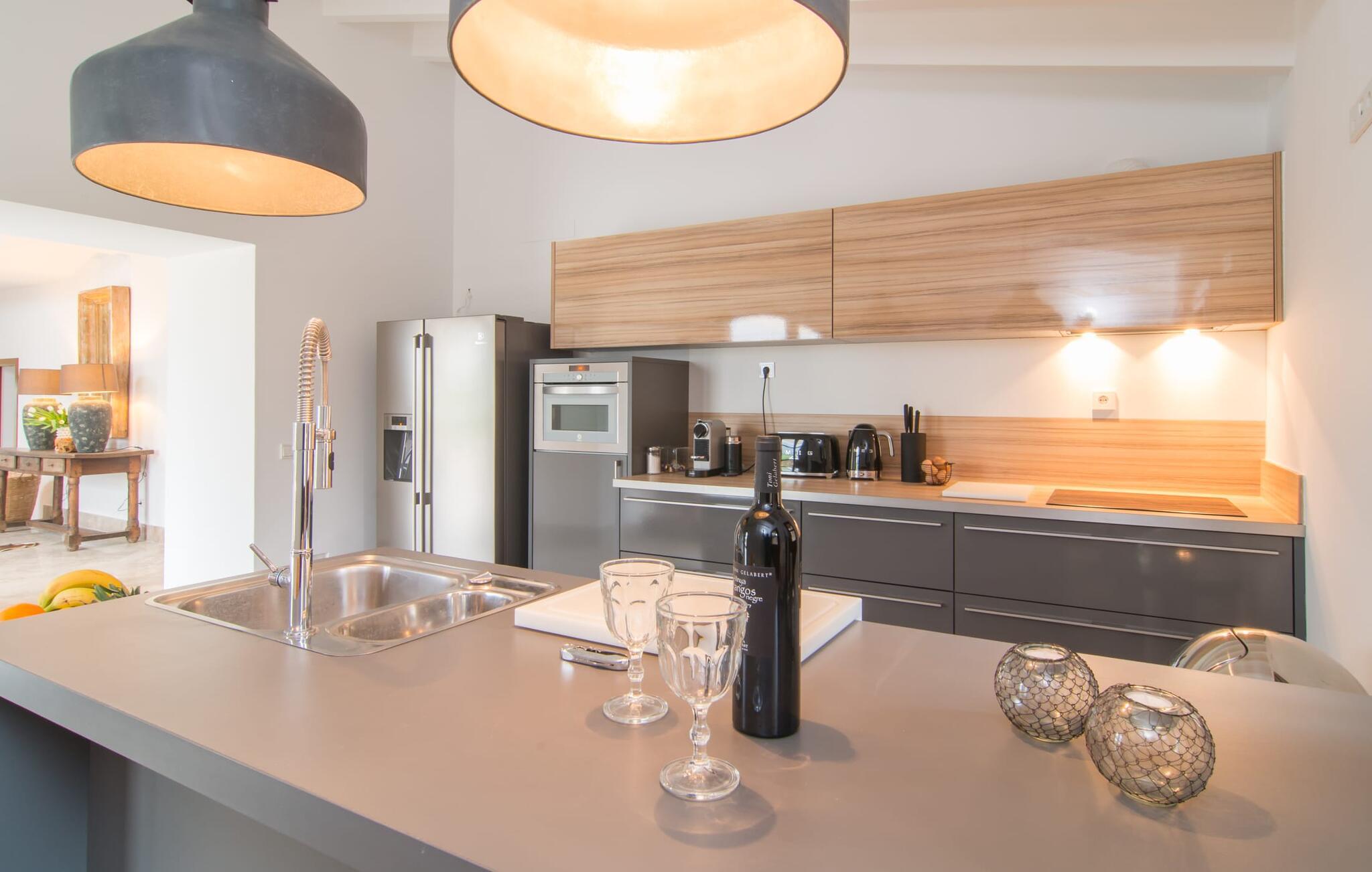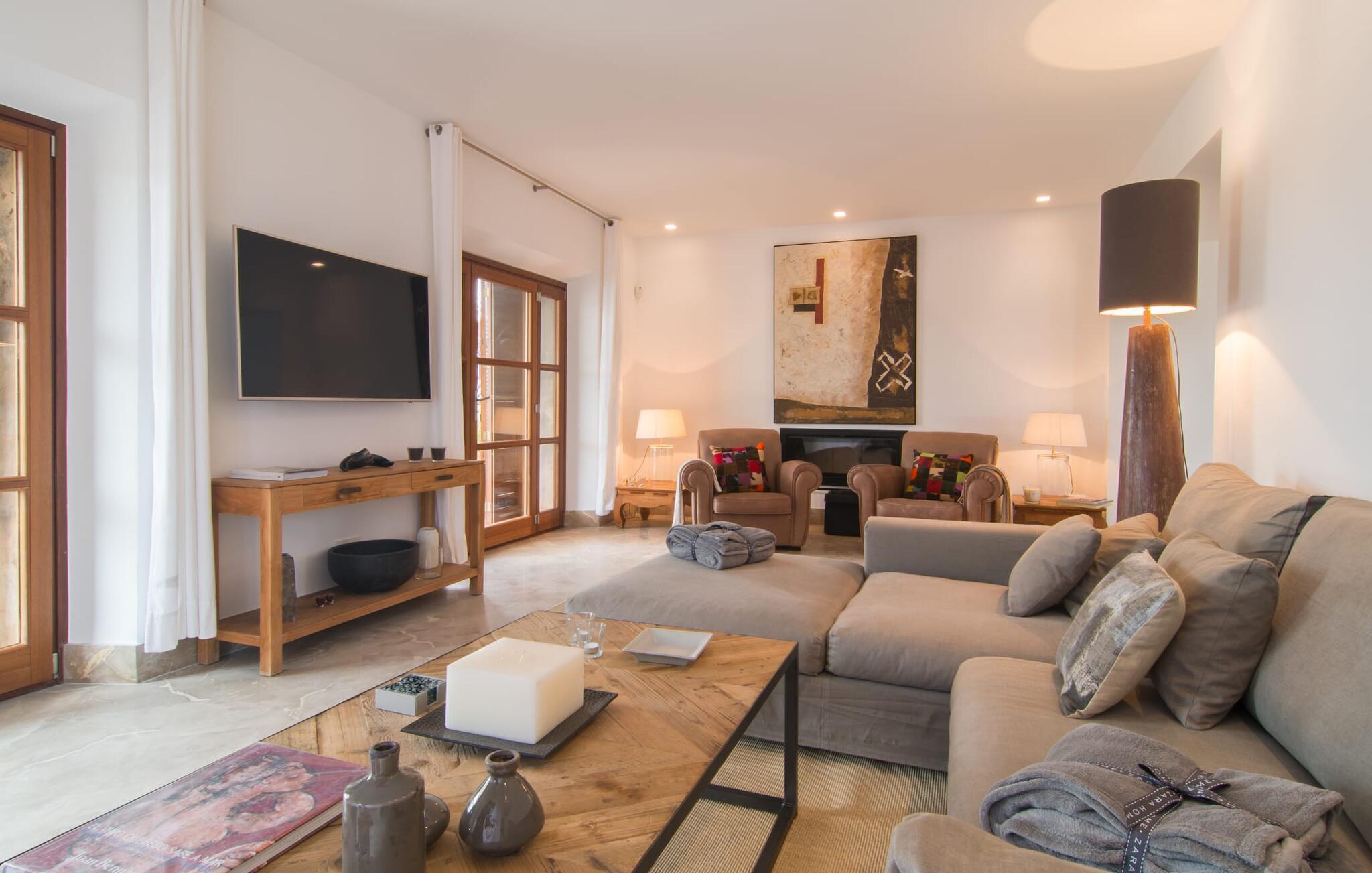 Naturstensvillaen "Son Artigues" er det helt rigtige for jer, hvis I leder efter en hjemmebase af oase-agtig skønhed til jeres udforskninger på den varierede østkyst. Den landlige beliggenhed giver mulighed for en befriende 360° udsigt over det smukke, for det meste flade område. I baggrunden kan man se de bølgende bakker, foran dem fører gårdvejene hen over markerne. Et stilleben, der ville få mange malere til at ville trække penslen frem, når de ser den. Inden I går til den store skærm, kan I nyde de andre muligheder på denne helt igennem afslappende ejendom. Efter en lang svømmetur i poolen kan I så lade tankerne få frit løb på den solrige terrasse. Eller I kan flytte ind i en af de udendørs himmelsenge. På varme sommernætter er de det ideelle sted at se op på de smukke stjerner. Spredte palmer, buske og andre træer giver ejendommen en parkagtig atmosfære. Fire stentrappe fører jer til en overdækket terrasse, som giver skygge ved frokosttid, og på hvis loungesofa I kan nyde en cocktail om aftenen. Eller I kan tænde for gasgrillen og tilberede noget lækkert. På den modsatte side, ved indgangen, er der et fortelt, så man kan trække sig tilbage her om dagen til et festmåltid. De brede glasbuer lader masser af naturligt lys strømme ind i opholdsrum og køkken, så de lyse, venlige farver er synlige og ser godt ud. I indgangspartiet inviterer en behagelig lænestol jer til at blive hængende. I kan også sætte jer ned i stuen på den enorme chaiselong-sofa eller to brune lænestole og fordybe jer i eventyrlige verdener foran fladskærms-tv'et eller læse rejseguider og planlægge jeres kommende ferie ved pejsen. Ideelt set vil en anden begynde at lave mad i mellemtiden, så I på et tidspunkt vil høre det længe ventede kald: "Middagen er klar." Så kan I samles i den smarte spisestue, tage plads ved langbordet under tropen -looking lamp og få et socialt måltid start aftenen. Begge soveværelser er på øverste etage, som I kan nå via den særligt oplyste trappe. Den ene har en stilfuld træseng og direkte udgang til tagterrassen, hvorfra udsigten strækker sig endnu længere. Vi var særligt imponerede over husets kompakte arkitektur og indretning, og vi er sikre på, at I ved at vælge denne ejendom vil få en helt afslappende og vellykket ferie. Derudover er beliggenheden på øen meget attraktiv. Villaen er godt forbundet med øens vejnet, selvom landevejen af og til kan høres afhængig af vindretningen. I kan hurtigt nå det smarte Manacor, som kun ligger 8 km væk. Navnet på øens næststørste by betyder "hånden på hjertet"; og byens særlige charme kan virkelig røre folk. Udover perler er byen også berømt for sit udsøgte keramik, lækre vine og meget mere. I er sikker på at finde en passende souvenir her. Der er et frugt- og grøntsagsmarked hver dag (undtagen søndage) på Placa Constitucio. Landsbyen Son Macia, som ligger lidt tættere på, er også et besøg værd. Derudover bør I prøve havneatmosfæren i Porto Christo og prøve de maritime forlystelser i Porto Colom (begge omkring 19 km væk). Til stranddage anbefaler vi Cala Varques, 17 km væk, med fint sand og behagelig lavvandet adgang til havet. Naturstensvillaen "Son Artigues" er omgivet af grønne områder, men ligger også kun 5 km fra den smukke by Son Macia. Der kan I gøre alle jeres indkøb og se byens travlhed fra en café. For en shoppingtur er det også værd at besøge Manacor, 8 km væk, som er kendt for sine fortryllende smukke perler. Fantastiske naturlige strande som Cala Varques ligger kun 17 km væk.