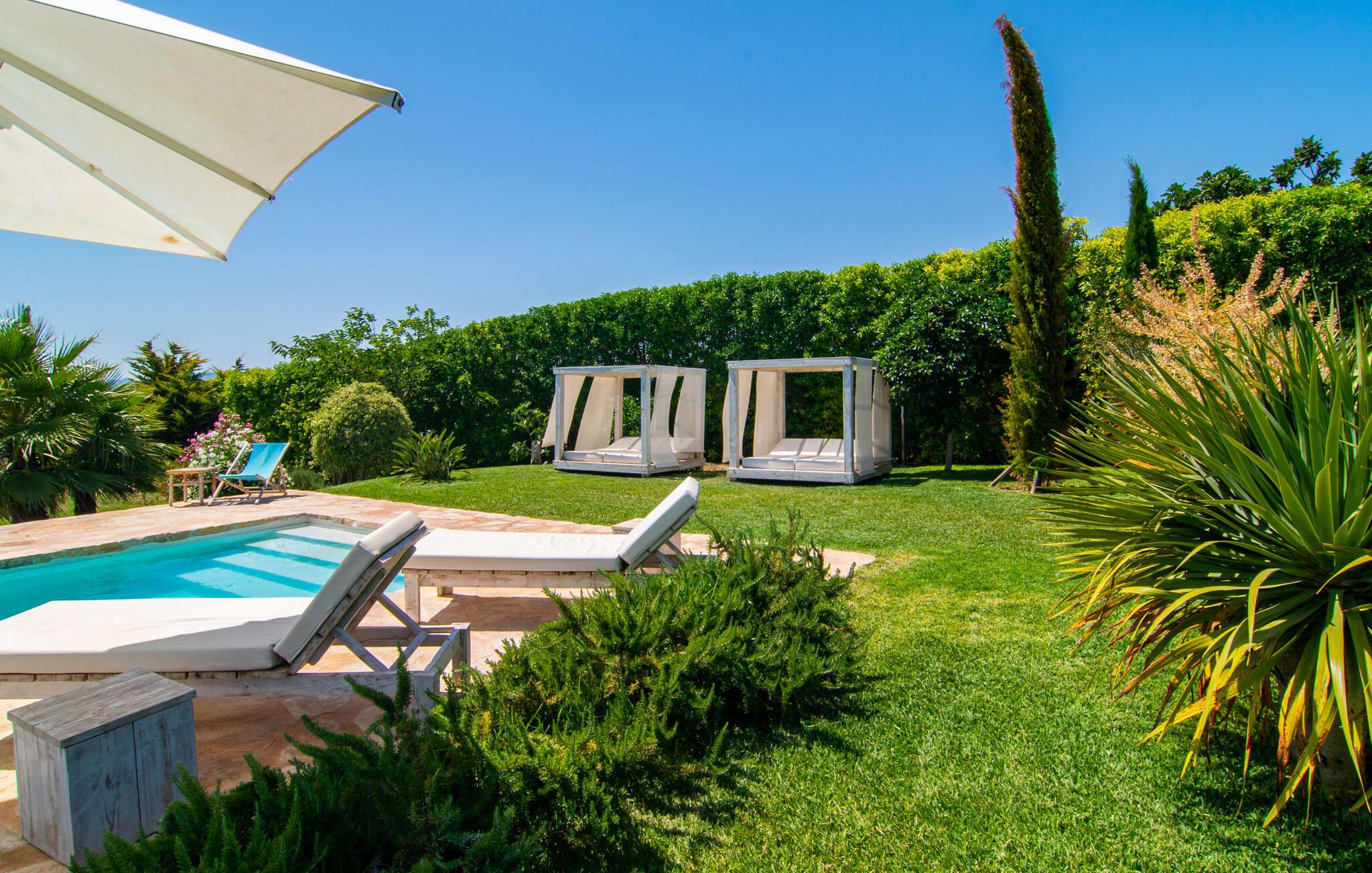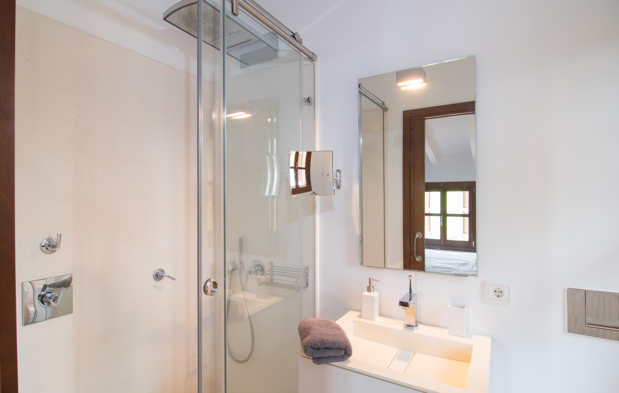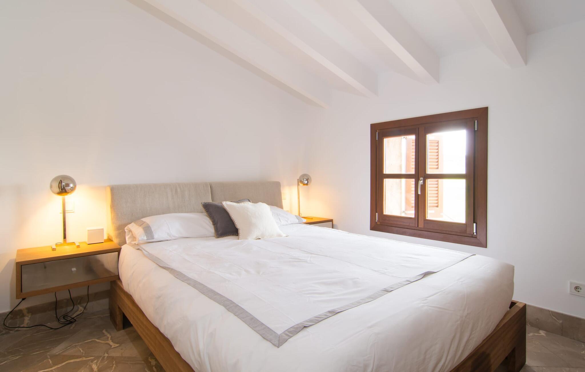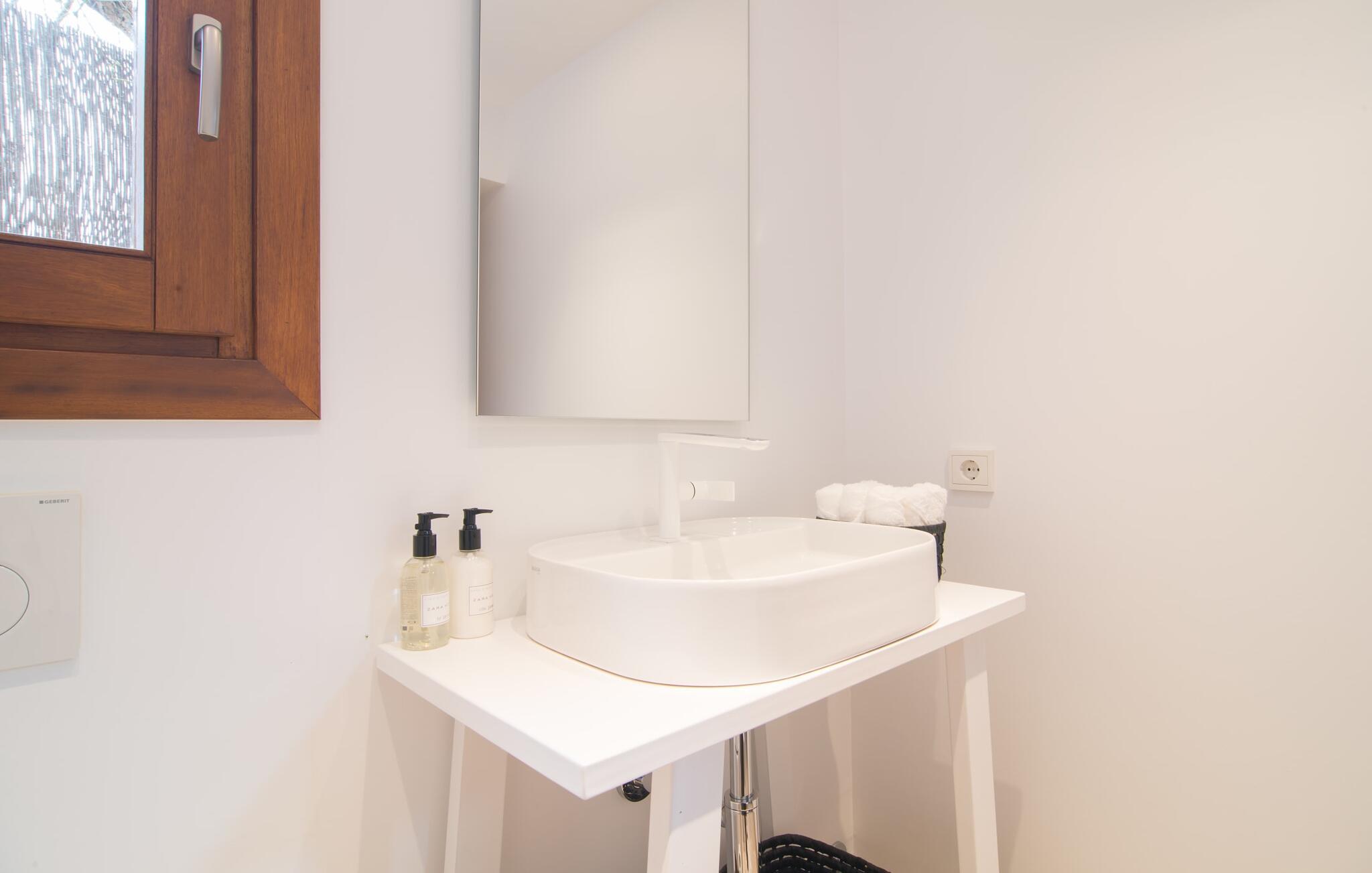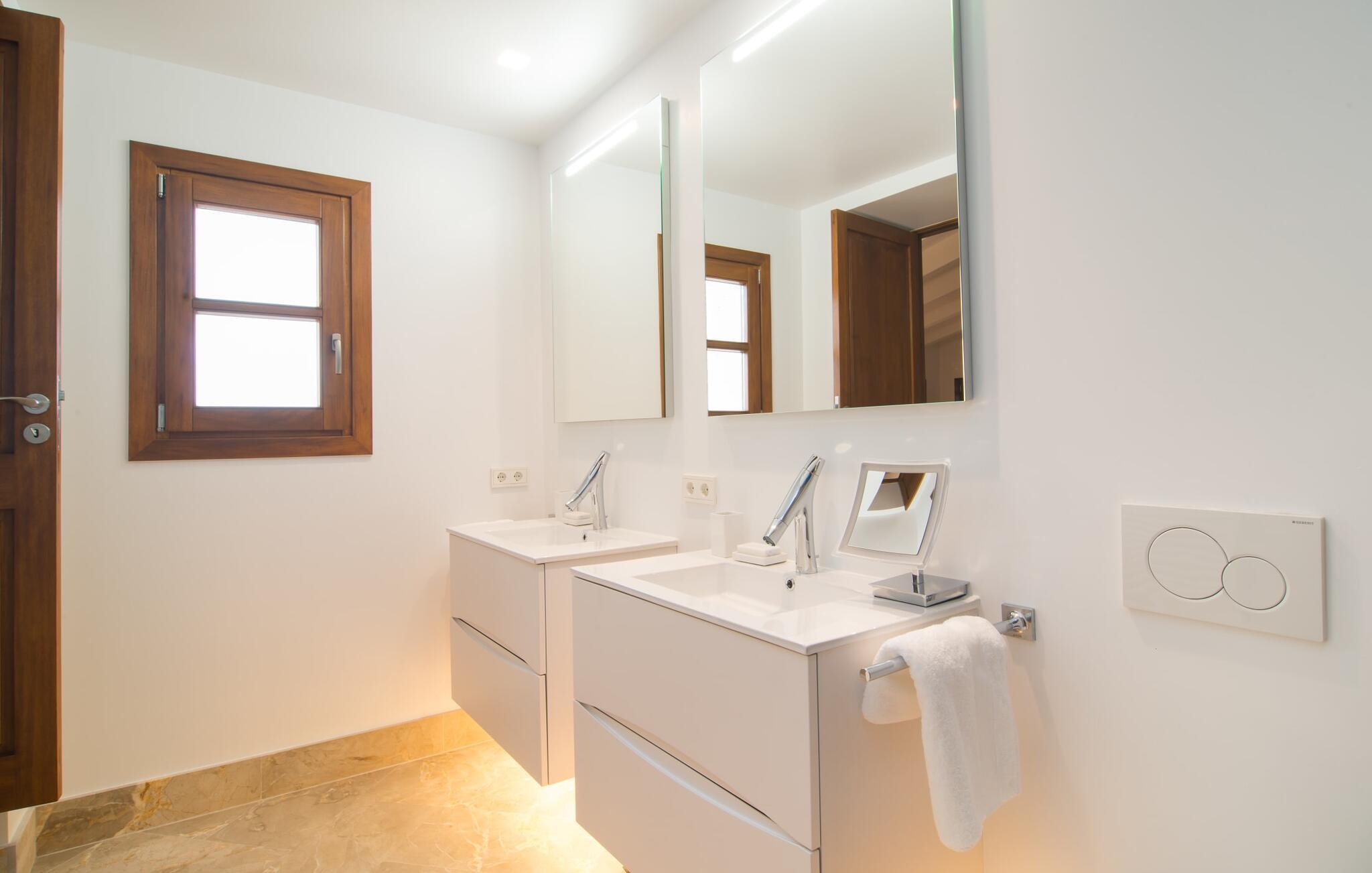 Naturstensvillaen "Son Artigues" er det helt rigtige for jer, hvis I leder efter en hjemmebase af oase-agtig skønhed til jeres udforskninger på den varierede østkyst. Den landlige beliggenhed giver mulighed for en befriende 360° udsigt over det smukke, for det meste flade område. I baggrunden kan man se de bølgende bakker, foran dem fører gårdvejene hen over markerne. Et stilleben, der ville få mange malere til at ville trække penslen frem, når de ser den. Inden I går til den store skærm, kan I nyde de andre muligheder på denne helt igennem afslappende ejendom. Efter en lang svømmetur i poolen kan I så lade tankerne få frit løb på den solrige terrasse. Eller I kan flytte ind i en af de udendørs himmelsenge. På varme sommernætter er de det ideelle sted at se op på de smukke stjerner. Spredte palmer, buske og andre træer giver ejendommen en parkagtig atmosfære. Fire stentrappe fører jer til en overdækket terrasse, som giver skygge ved frokosttid, og på hvis loungesofa I kan nyde en cocktail om aftenen. Eller I kan tænde for gasgrillen og tilberede noget lækkert. På den modsatte side, ved indgangen, er der et fortelt, så man kan trække sig tilbage her om dagen til et festmåltid. De brede glasbuer lader masser af naturligt lys strømme ind i opholdsrum og køkken, så de lyse, venlige farver er synlige og ser godt ud. I indgangspartiet inviterer en behagelig lænestol jer til at blive hængende. I kan også sætte jer ned i stuen på den enorme chaiselong-sofa eller to brune lænestole og fordybe jer i eventyrlige verdener foran fladskærms-tv'et eller læse rejseguider og planlægge jeres kommende ferie ved pejsen. Ideelt set vil en anden begynde at lave mad i mellemtiden, så I på et tidspunkt vil høre det længe ventede kald: "Middagen er klar." Så kan I samles i den smarte spisestue, tage plads ved langbordet under tropen -looking lamp og få et socialt måltid start aftenen. Begge soveværelser er på øverste etage, som I kan nå via den særligt oplyste trappe. Den ene har en stilfuld træseng og direkte udgang til tagterrassen, hvorfra udsigten strækker sig endnu længere. Vi var særligt imponerede over husets kompakte arkitektur og indretning, og vi er sikre på, at I ved at vælge denne ejendom vil få en helt afslappende og vellykket ferie. Derudover er beliggenheden på øen meget attraktiv. Villaen er godt forbundet med øens vejnet, selvom landevejen af og til kan høres afhængig af vindretningen. I kan hurtigt nå det smarte Manacor, som kun ligger 8 km væk. Navnet på øens næststørste by betyder "hånden på hjertet"; og byens særlige charme kan virkelig røre folk. Udover perler er byen også berømt for sit udsøgte keramik, lækre vine og meget mere. I er sikker på at finde en passende souvenir her. Der er et frugt- og grøntsagsmarked hver dag (undtagen søndage) på Placa Constitucio. Landsbyen Son Macia, som ligger lidt tættere på, er også et besøg værd. Derudover bør I prøve havneatmosfæren i Porto Christo og prøve de maritime forlystelser i Porto Colom (begge omkring 19 km væk). Til stranddage anbefaler vi Cala Varques, 17 km væk, med fint sand og behagelig lavvandet adgang til havet. Naturstensvillaen "Son Artigues" er omgivet af grønne områder, men ligger også kun 5 km fra den smukke by Son Macia. Der kan I gøre alle jeres indkøb og se byens travlhed fra en café. For en shoppingtur er det også værd at besøge Manacor, 8 km væk, som er kendt for sine fortryllende smukke perler. Fantastiske naturlige strande som Cala Varques ligger kun 17 km væk.