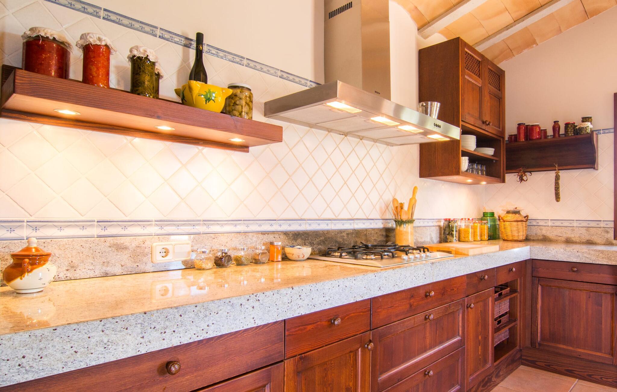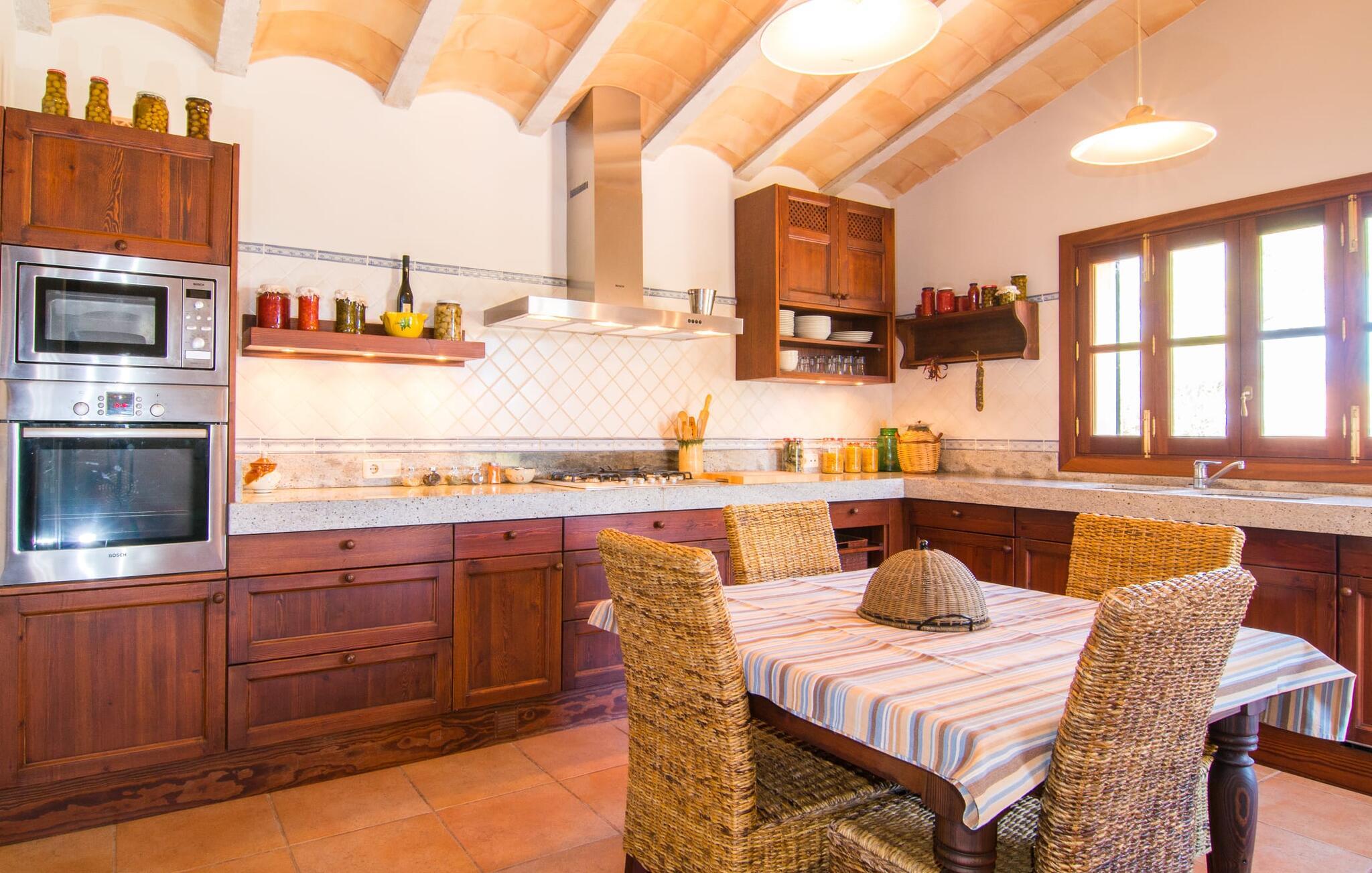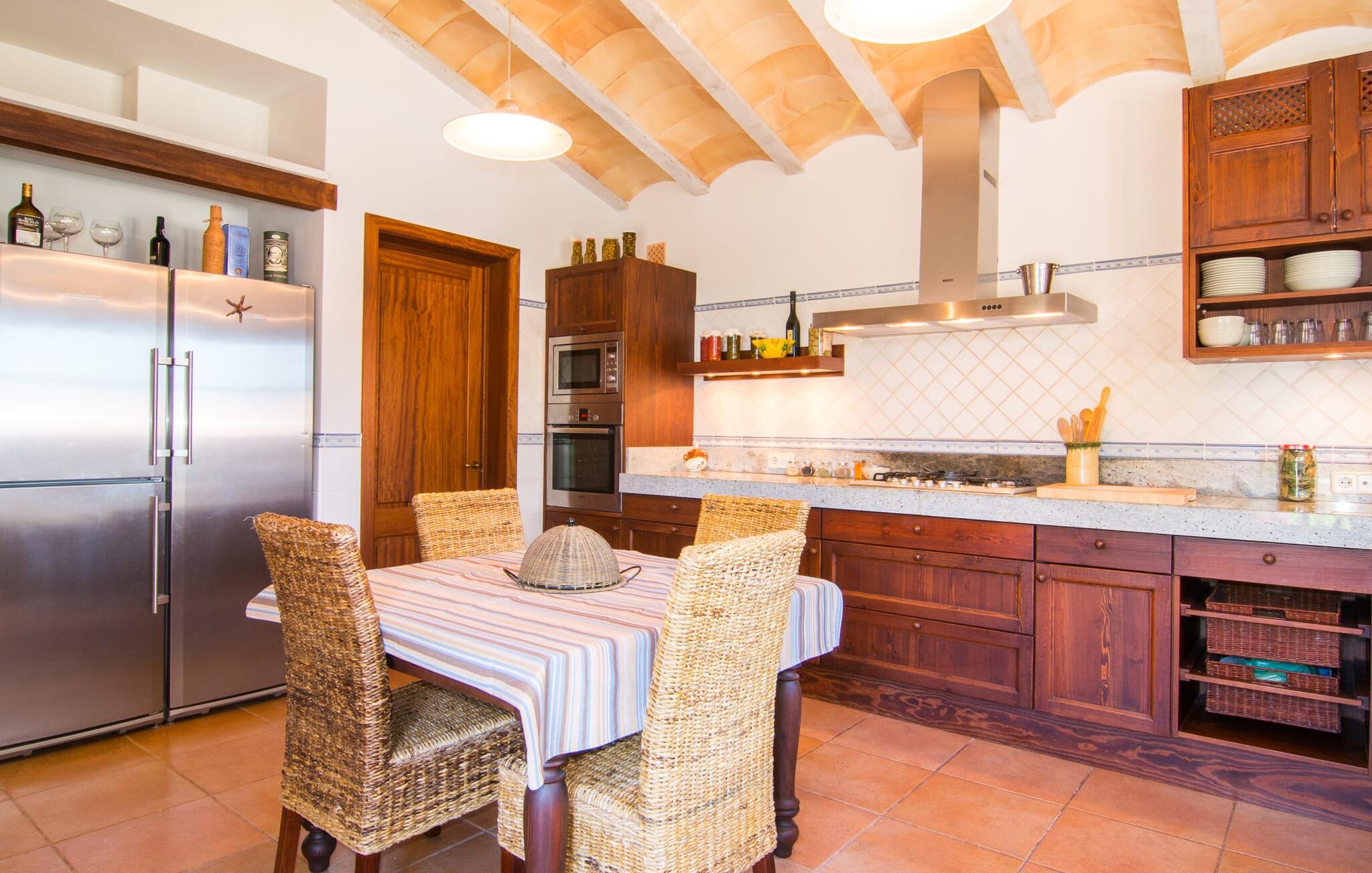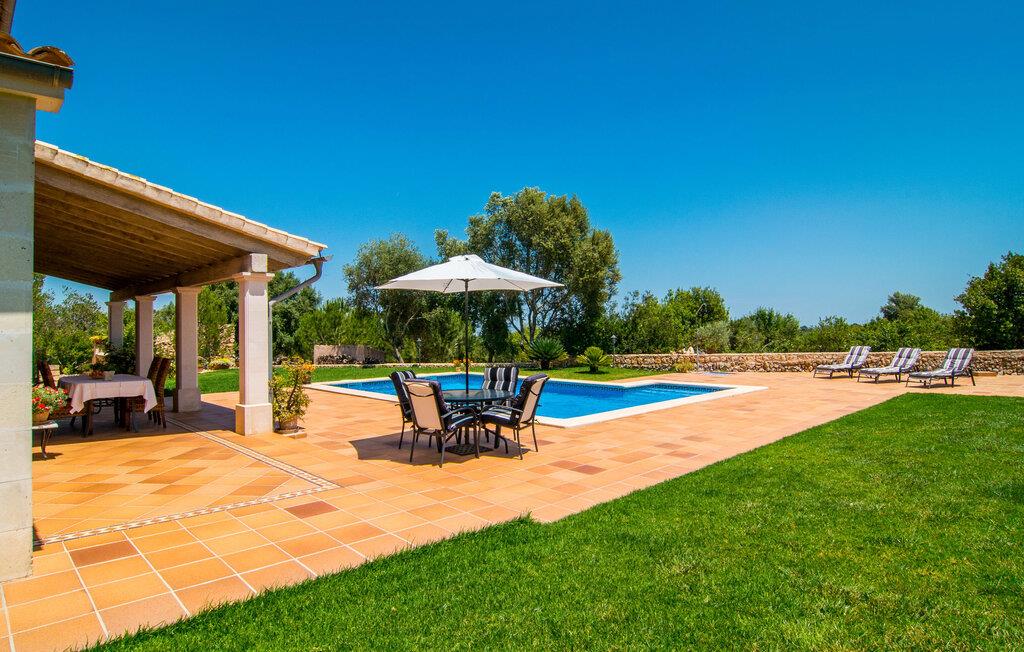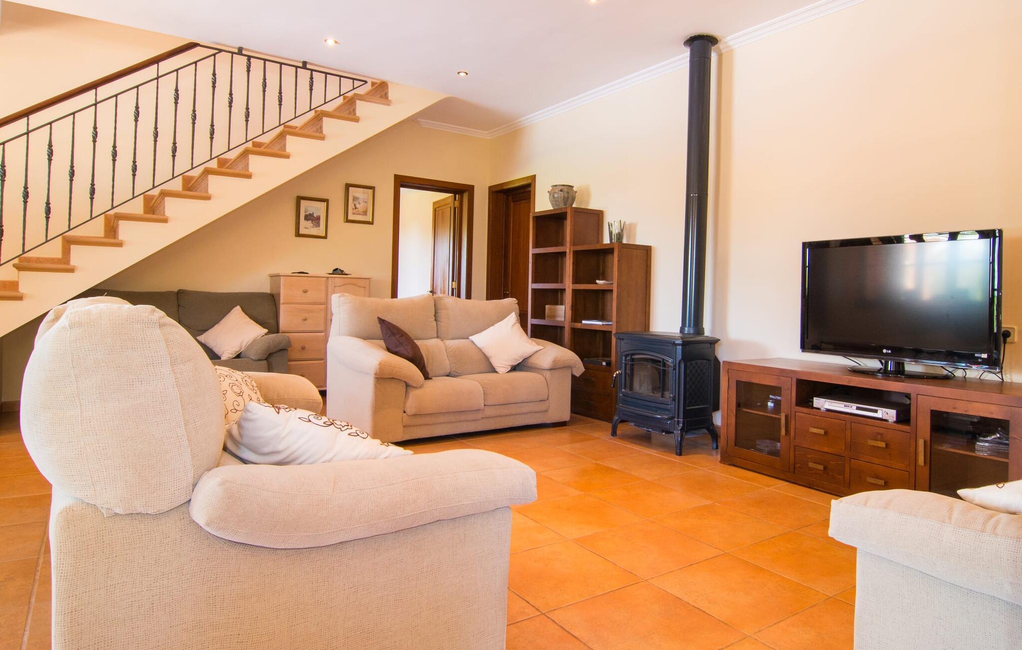 Den familievenlige villa “Son Bielo” imponerer med sin unikke, afsides beliggenhed på en 20.000 m² stor grund, med en meget velholdt have, der er frodigt anlagt alt efter årstiden. Et udvalg af middelhavsplanter, kærligt plantede urtepotter og de lave naturstensvægge giver ejendommen et særligt venligt udseende. Fordi der ikke er høje hegn eller lignende, er følelsen af rummelighed imponerende og kan opleves direkte. Havearealet består stort set af frodige græsplæner og omfattende terrassearealer. Ved at dække huset har I mulighed for at nyde en række skønne steder at slappe af i solen eller i den luftige skygge, alt efter jeres præferencer. Komfortable liggestole inviterer jer til at slappe af, og det samme gør elegante loungesiddeområder. Poolen med sin usædvanlige L-form harmonerer perfekt med villaen, som også ser legende og munter ud takket være dens let sammenlåsende struktur. Udformningen af den verandalignende terrasse lige ved siden af huset fremstår herligt rustikt og elegant. Her er fliserne og naturstensfacaden i kombination med de buede vinduer perfekt afstemt. Når vejret er godt, kan I blot spise alle jeres måltider udendørs og nyde den uhindrede udsigt til den dybblå morgenhimmel under morgenmaden og en tilfredsstillende ferie om aftenen. Villaens indre byder også på møbler af høj kvalitet, som er synlige ved første øjekast. Husets centrum er den kombinerede stue/spisestue, som både rummer en flot spisegruppe og et lyst indrettet sofahjørne med TV og behagelige siddepladser. På køligere aftener kan I endda slappe af ved en hyggelig pejs og varmen fra et bål. Smagfuld udsmykning blev brugt sparsomt og dygtigt, så rummene ikke mistede den klarhed og elegance, som de naturligt udstråler. En ekstra spiseplads er placeret i det yderst rummelige og stilfulde køkken, som er fuldt udstyret og tilbyder gæsterne køleskab, ovn, komfur, mikroovn, opvaskemaskine/kaffemaskine og masser af opbevaringsplads. Smukt designede soveværelser med et meget hjemligt præg inviterer jer til en afslappende nattesøvn. Lyse farver kombineret med elegante møbler i massivt træ skaber en meget varm atmosfære. Det tredje soveværelse forklarer muligheden for belægning af syv personer: her er der en dobbeltseng og en ekstra enkeltseng, så rummet kan optages af tre personer, hvis det er nødvendigt. To til tre babysenge og høje stole er også tilgængelige. Tre lyse badeværelser er smagfuldt designet og funktionelt udstyret. I kan også nyde et hydromassagesystem i badekarret. I kan nemt lade jeres hårtørrer og strygejern blive derhjemme. Lloret de Vistalegre er et meget smukt sted og kun fem minutter væk i bil. Hver mandag morgen har I mulighed for at købe friske varer fra lokale landmænd på det ugentlige marked. En tur til Inca vil bestemt være det værd. Inca har en lang tradition inden for læder- og skohåndværk. Området omkring byen er præget af en række kendte virksomheder i skobranchen (f.eks. Camper-mærket). Villaen "Son Bielo" er en moderne og særdeles velholdt ejendom i den nordlige del af Lloret de Vistalegre i centrum af øen. Herfra tager køreturen til Inca kun 20 minutter. Strandene på den nordøstlige kyst, herunder de smukke strande i Alcúdia-bugten, er let tilgængelige med lejebil.