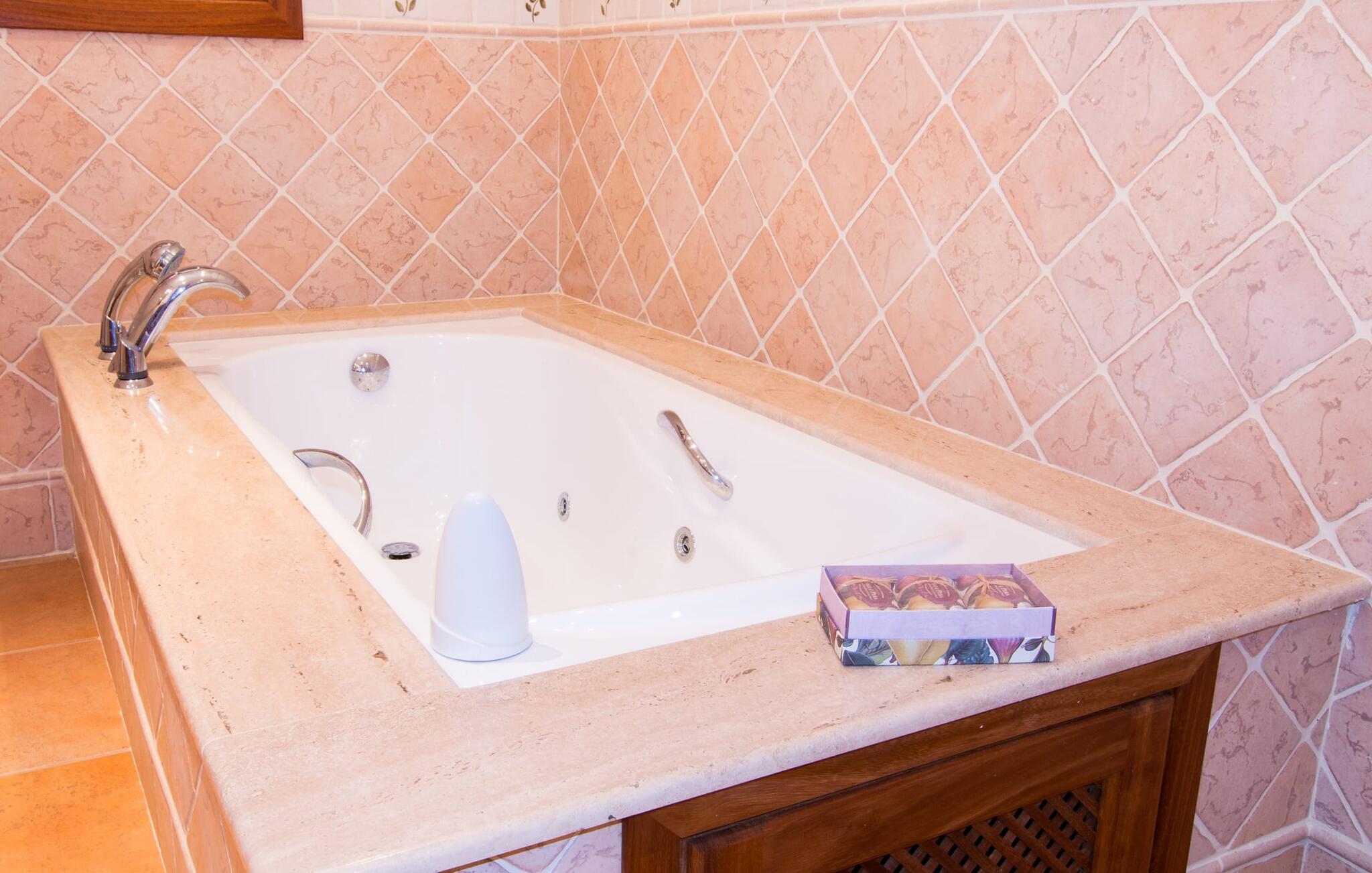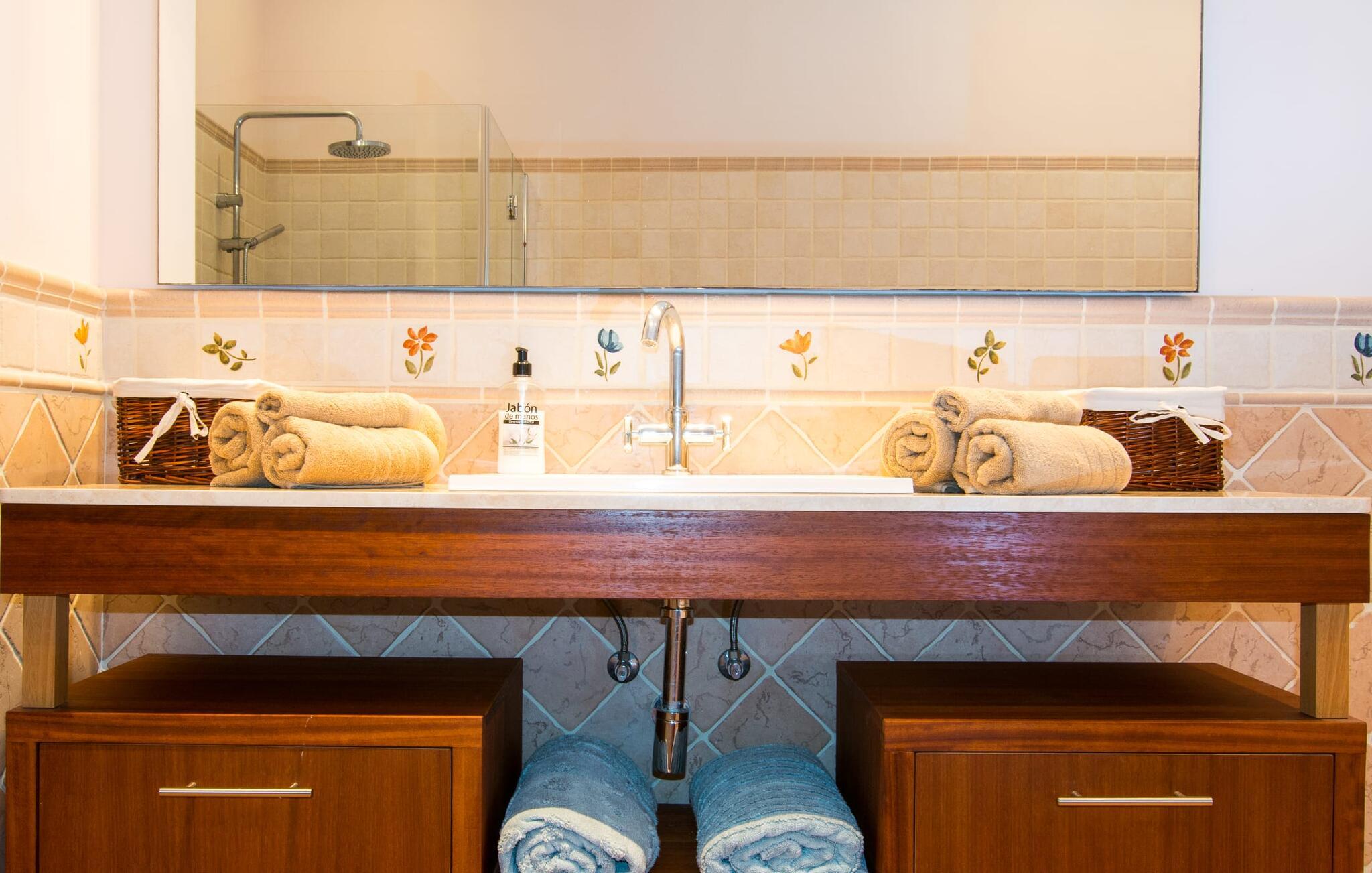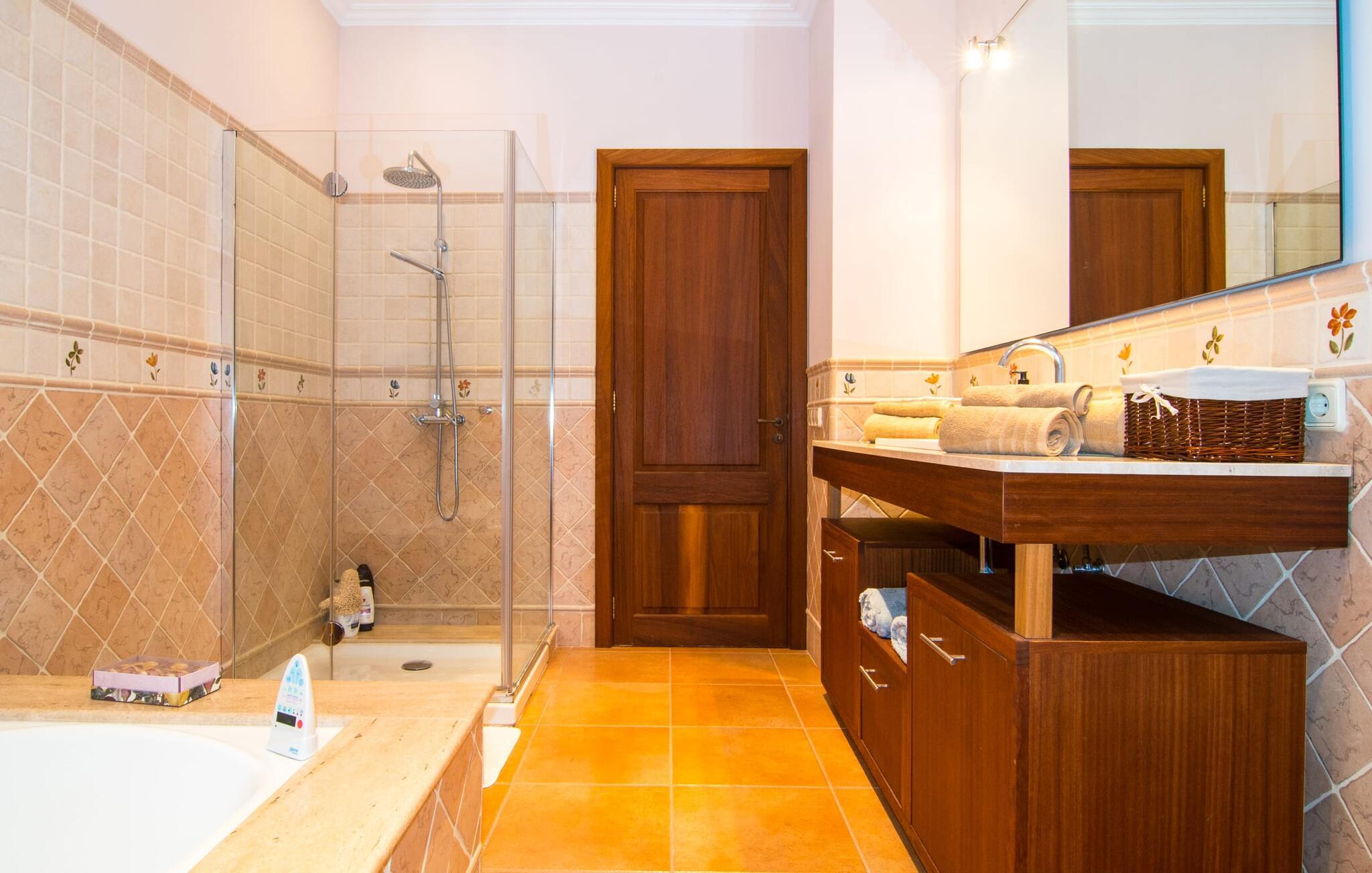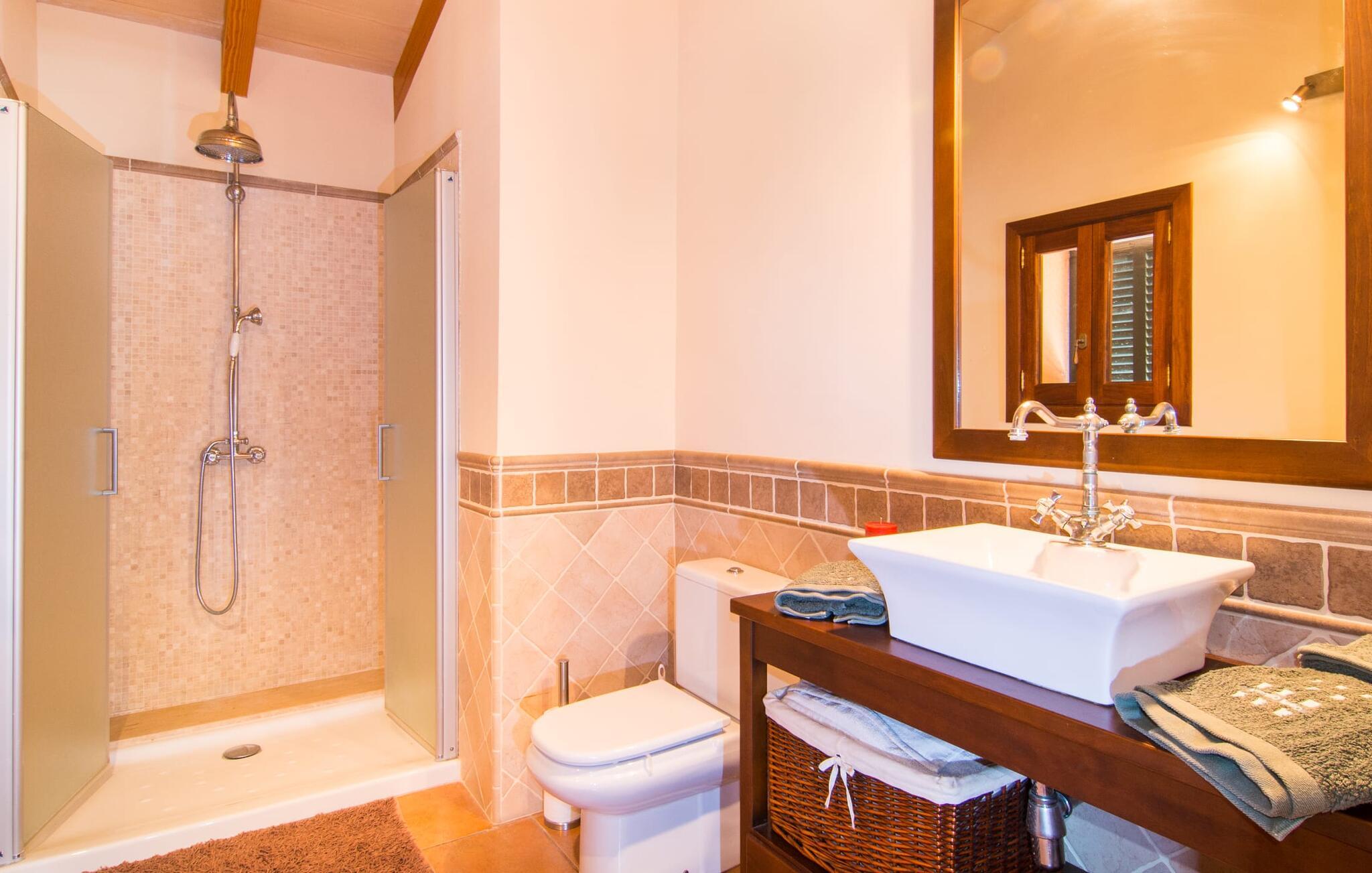 Den familievenlige villa “Son Bielo” imponerer med sin unikke, afsides beliggenhed på en 20.000 m² stor grund, med en meget velholdt have, der er frodigt anlagt alt efter årstiden. Et udvalg af middelhavsplanter, kærligt plantede urtepotter og de lave naturstensvægge giver ejendommen et særligt venligt udseende. Fordi der ikke er høje hegn eller lignende, er følelsen af rummelighed imponerende og kan opleves direkte. Havearealet består stort set af frodige græsplæner og omfattende terrassearealer. Ved at dække huset har I mulighed for at nyde en række skønne steder at slappe af i solen eller i den luftige skygge, alt efter jeres præferencer. Komfortable liggestole inviterer jer til at slappe af, og det samme gør elegante loungesiddeområder. Poolen med sin usædvanlige L-form harmonerer perfekt med villaen, som også ser legende og munter ud takket være dens let sammenlåsende struktur. Udformningen af den verandalignende terrasse lige ved siden af huset fremstår herligt rustikt og elegant. Her er fliserne og naturstensfacaden i kombination med de buede vinduer perfekt afstemt. Når vejret er godt, kan I blot spise alle jeres måltider udendørs og nyde den uhindrede udsigt til den dybblå morgenhimmel under morgenmaden og en tilfredsstillende ferie om aftenen. Villaens indre byder også på møbler af høj kvalitet, som er synlige ved første øjekast. Husets centrum er den kombinerede stue/spisestue, som både rummer en flot spisegruppe og et lyst indrettet sofahjørne med TV og behagelige siddepladser. På køligere aftener kan I endda slappe af ved en hyggelig pejs og varmen fra et bål. Smagfuld udsmykning blev brugt sparsomt og dygtigt, så rummene ikke mistede den klarhed og elegance, som de naturligt udstråler. En ekstra spiseplads er placeret i det yderst rummelige og stilfulde køkken, som er fuldt udstyret og tilbyder gæsterne køleskab, ovn, komfur, mikroovn, opvaskemaskine/kaffemaskine og masser af opbevaringsplads. Smukt designede soveværelser med et meget hjemligt præg inviterer jer til en afslappende nattesøvn. Lyse farver kombineret med elegante møbler i massivt træ skaber en meget varm atmosfære. Det tredje soveværelse forklarer muligheden for belægning af syv personer: her er der en dobbeltseng og en ekstra enkeltseng, så rummet kan optages af tre personer, hvis det er nødvendigt. To til tre babysenge og høje stole er også tilgængelige. Tre lyse badeværelser er smagfuldt designet og funktionelt udstyret. I kan også nyde et hydromassagesystem i badekarret. I kan nemt lade jeres hårtørrer og strygejern blive derhjemme. Lloret de Vistalegre er et meget smukt sted og kun fem minutter væk i bil. Hver mandag morgen har I mulighed for at købe friske varer fra lokale landmænd på det ugentlige marked. En tur til Inca vil bestemt være det værd. Inca har en lang tradition inden for læder- og skohåndværk. Området omkring byen er præget af en række kendte virksomheder i skobranchen (f.eks. Camper-mærket). Villaen "Son Bielo" er en moderne og særdeles velholdt ejendom i den nordlige del af Lloret de Vistalegre i centrum af øen. Herfra tager køreturen til Inca kun 20 minutter. Strandene på den nordøstlige kyst, herunder de smukke strande i Alcúdia-bugten, er let tilgængelige med lejebil.