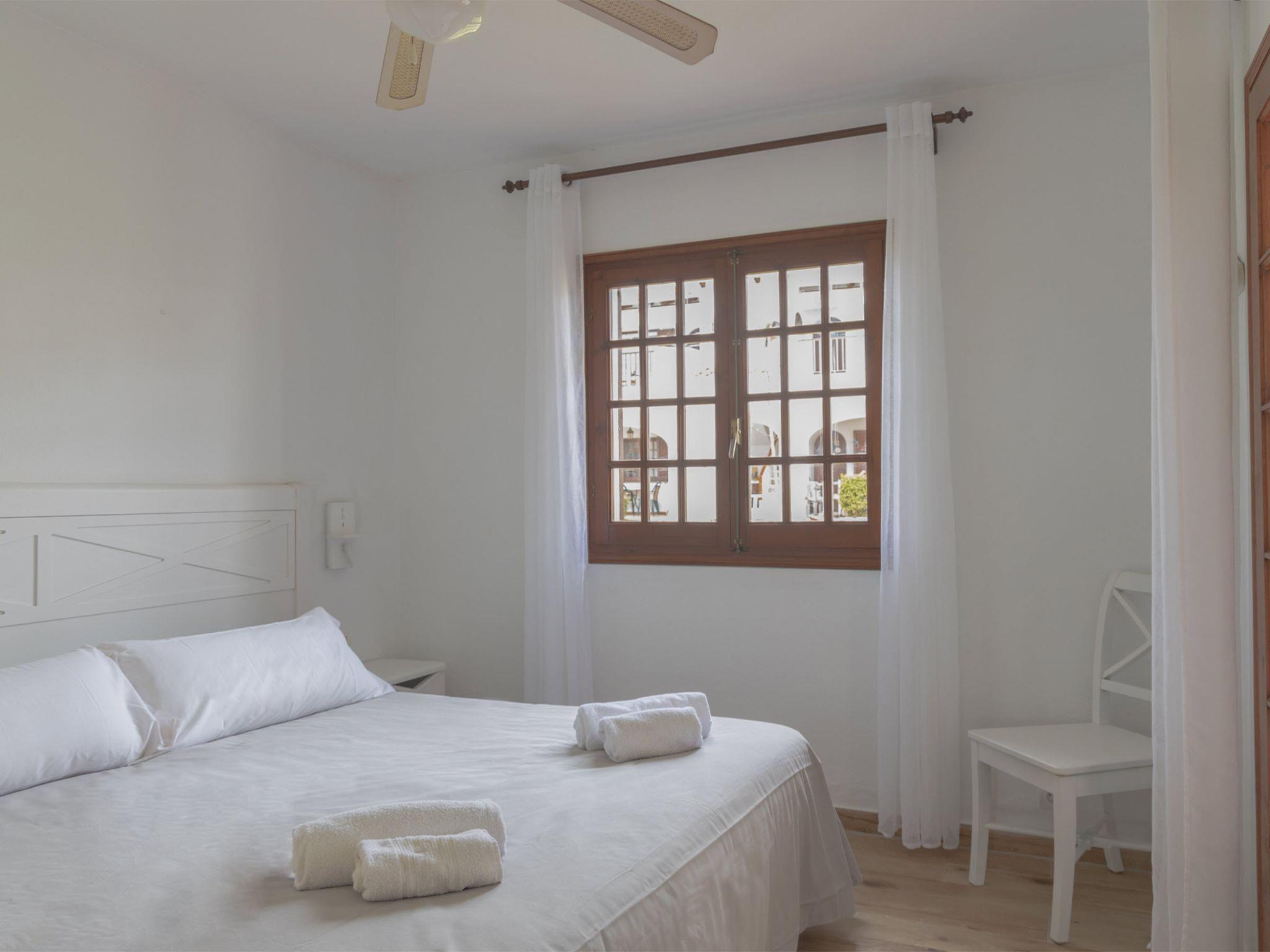 "Son Bou Gardens Plus", 3-room apartment 45 m2. Object suitable for 4 adults. Simple and cosy furnishings: living/dining room with digital TV. 1 double bedroom with 1 bed (150 cm, length 200 cm). 1 double bedroom with 2 beds (90 cm, length 200 cm). Kitchenette (4 hot plates, oven, toaster, microwave, freezer) with dining table. Shower/WC. Terrace furniture. View of the swimming pool, the garden and the countryside. Facilities: iron, children's high chair, baby cot for up to 2 year olds, hair dryer. Internet (WiFi, free). Please note: suitable for families. Non-smokers only. APM1880