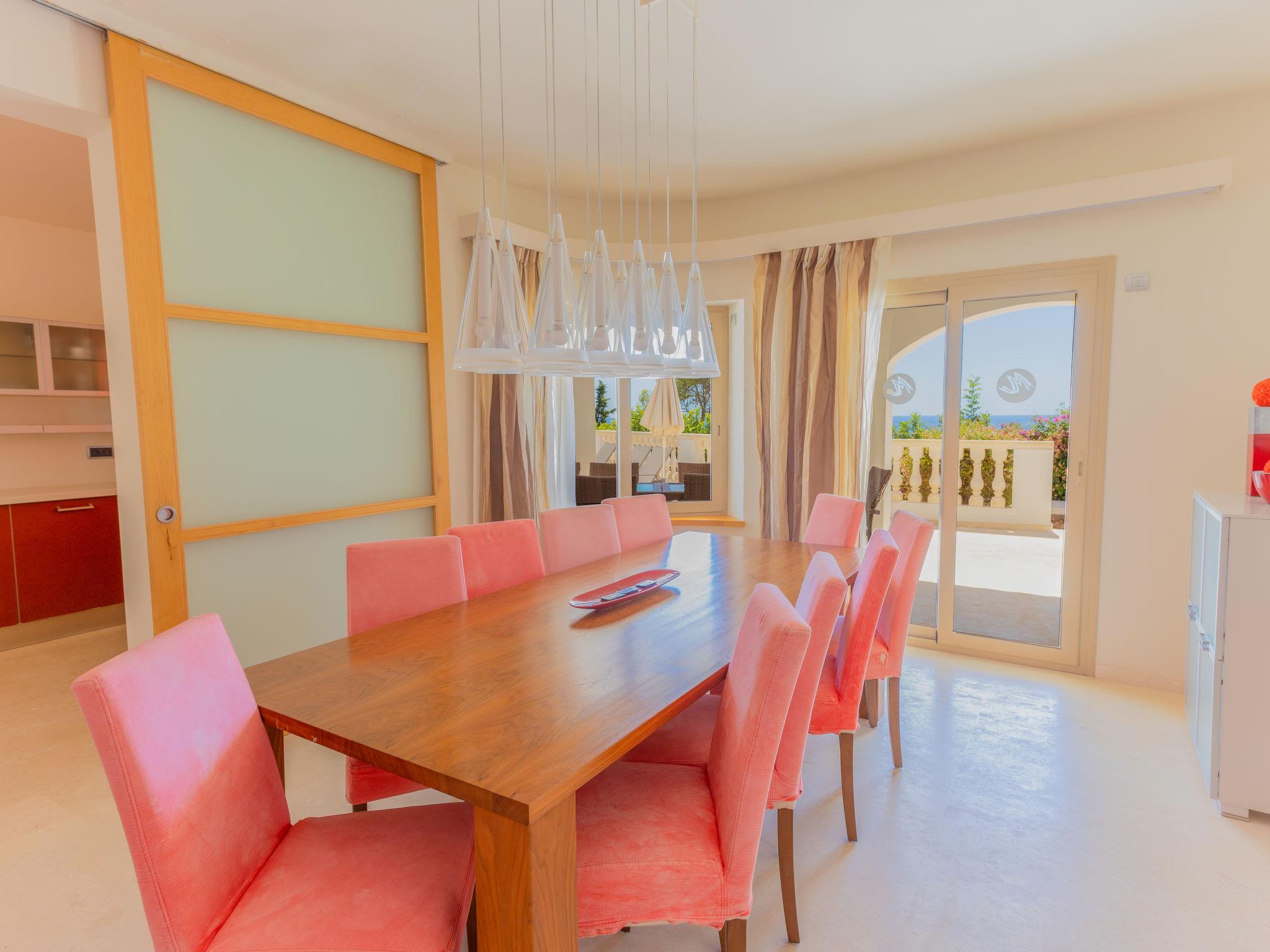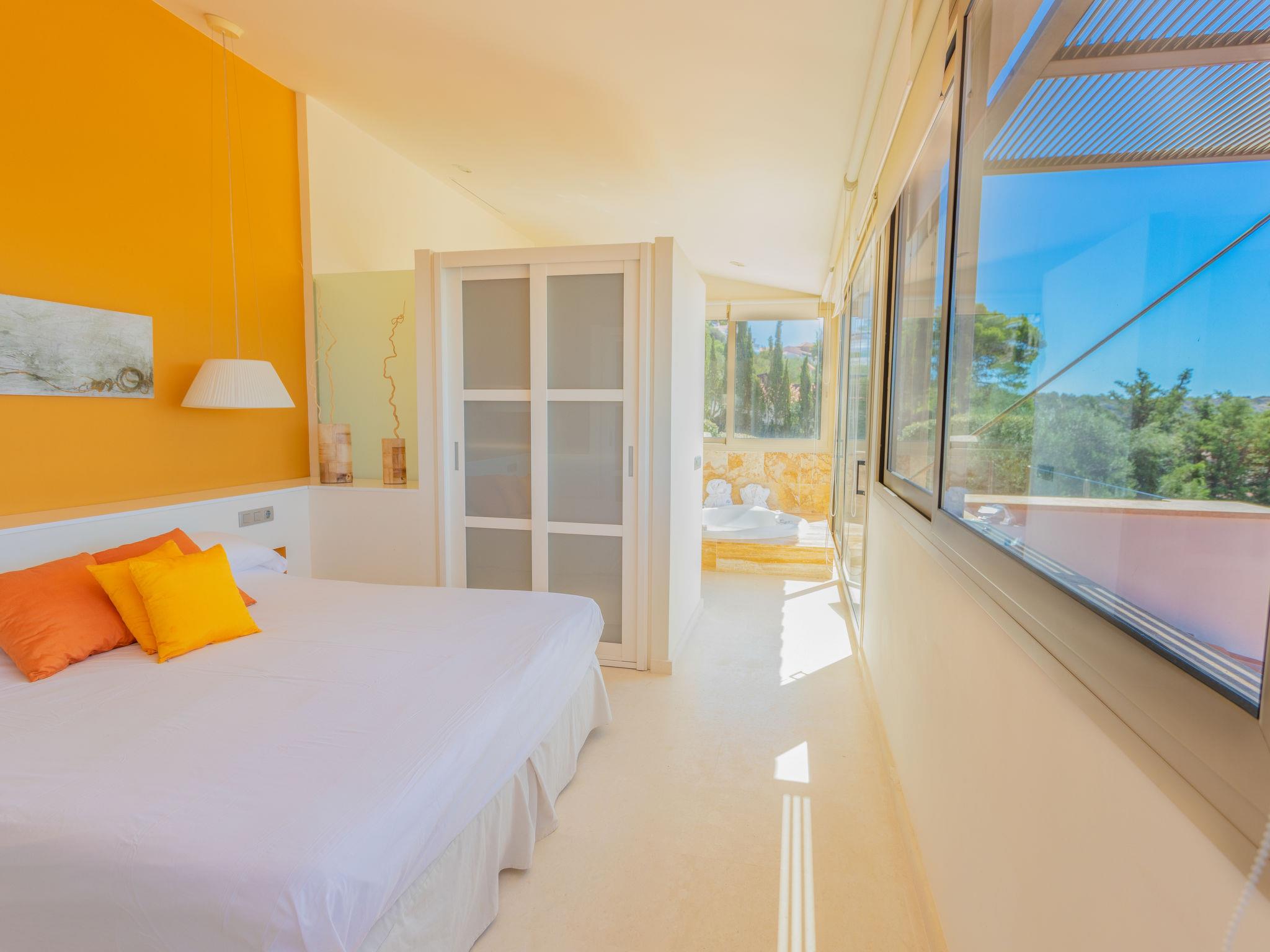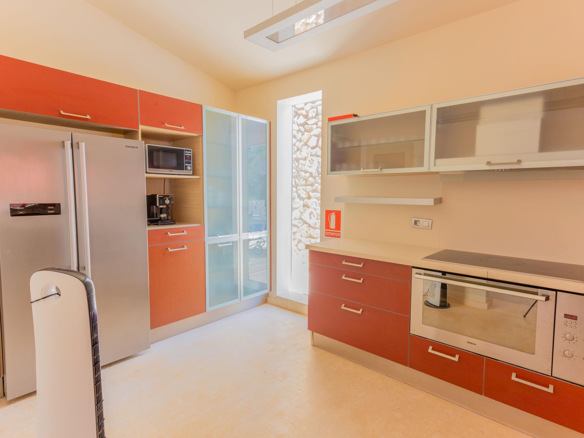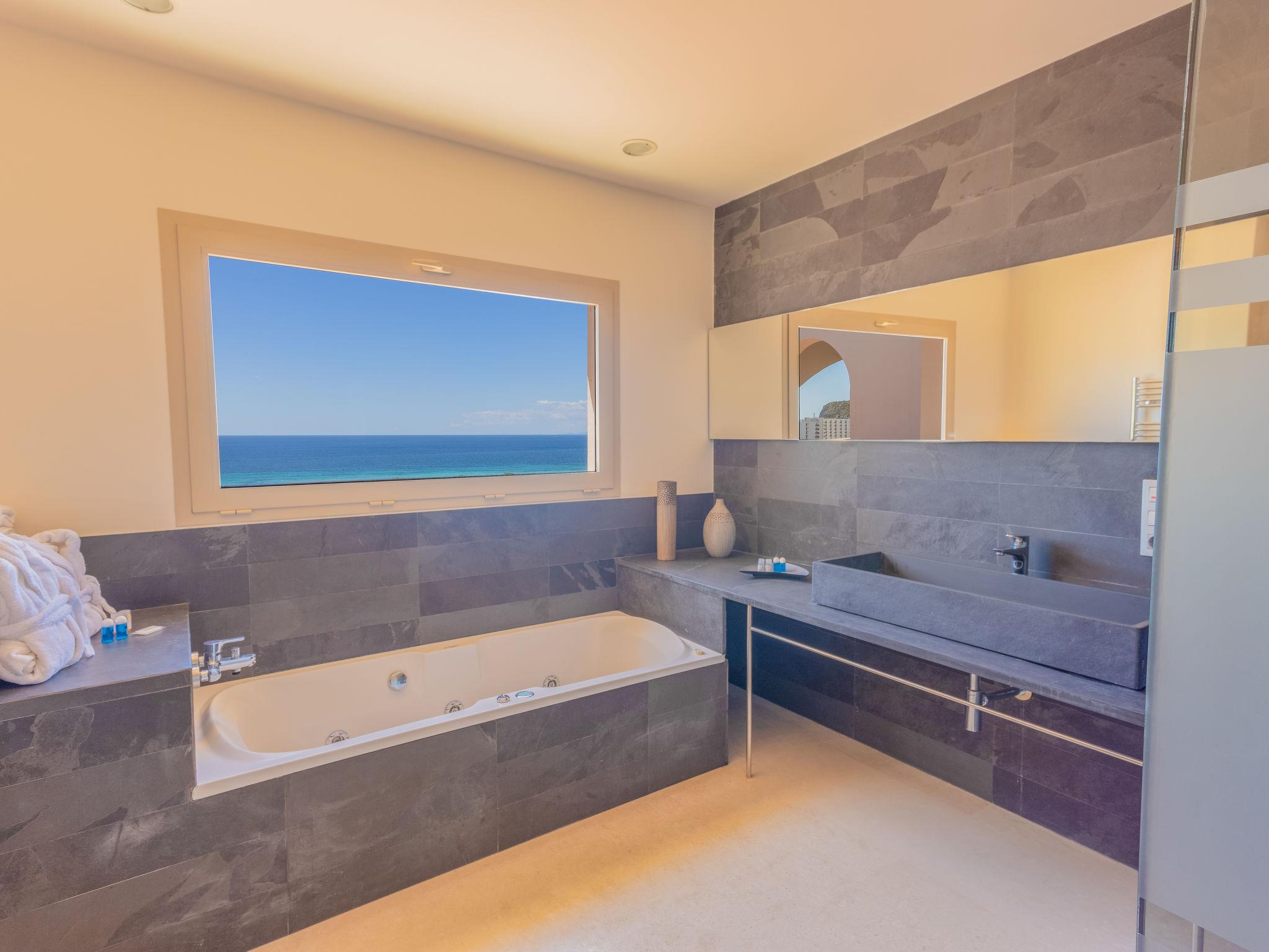 "Villa Maitreya", 7-room villa 470 m2 on 2 levels. Object suitable for 12 adults. Comfortable and cosy furnishings: open large living/dining room with open-hearth fireplace (only for decoration), dining table, satellite TV, digital TV, international TV channels and flat screen. Exit to the patio, to the swimming pool. 1 large double bedroom with 2 beds (90 cm, length 200 cm), hydro massage shower, TV and air conditioning. Exit to the patio, to the swimming pool. 1 large double bedroom with 2 beds (90 cm, length 200 cm), shower/WC and air conditioning. Exit to the patio, to the swimming pool. 1 large double bedroom with 1 french bed (180 cm, length 200 cm), bath/shower/WC, double hand-basin, hydro massage bath, TV, international TV channels, flat screen and air conditioning. Exit to the patio, to the swimming pool. Kitchen (oven, dishwasher, 4 induction hot plates, toaster, kettle, microwave, freezer, electric coffee machine). Upper floor: 1 large double bedroom 45 m2 with 1 french bed (180 cm, length 200 cm), bath/shower/WC, double hand-basin, hydro massage bath, TV, international TV channels, flat screen and air conditioning. Exit to the balcony, to the terrace. 1 large double bedroom with 1 french bed (180 cm, length 200 cm), bath/WC, double hand-basin, hydro massage bath and air conditioning. Exit to the balcony, to the terrace. 1 double bedroom 25 m2 with 1 french bed (160 cm, length 200 cm), bath/WC, hydro massage bath and air conditioning. Patio. Terrace furniture, balcony furniture, barbecue, deck chairs (12), covered balcony, sitting area. Very beautiful view of the sea, the swimming pool, the garden, the countryside and the resort. Facilities: washing machine, dryer, iron, children's high chair, baby cot for up to 2 year olds, hair dryer. Internet (WiFi, free). Please note: suitable for families. Fire extinguisher. VT357ME // Reg. Nr.: ESFCTU000007013000453182000000000000000000000VT357ME5