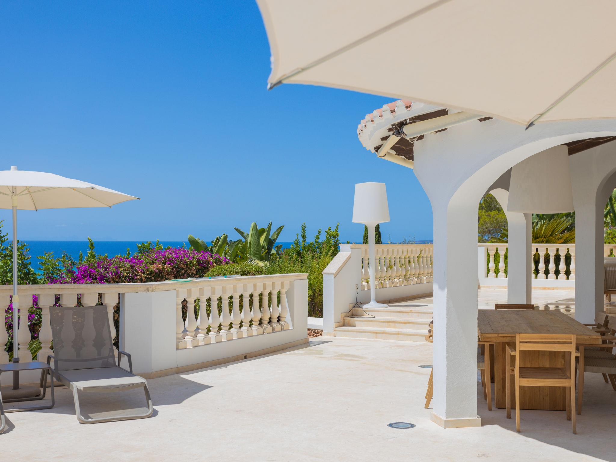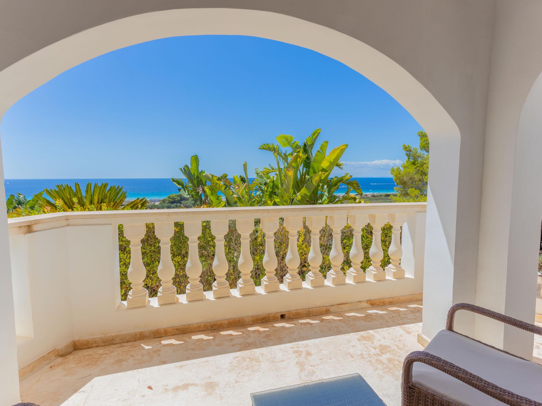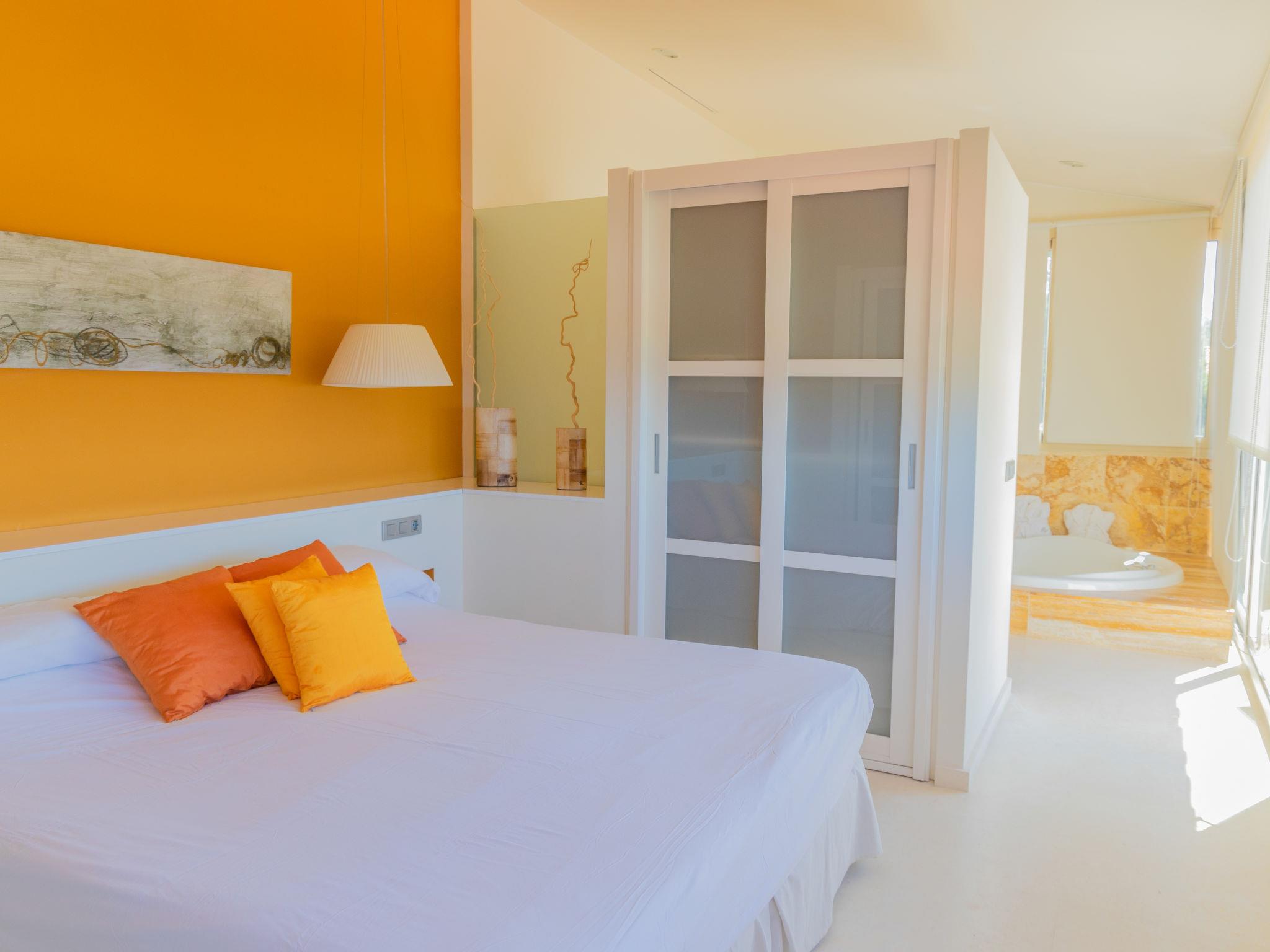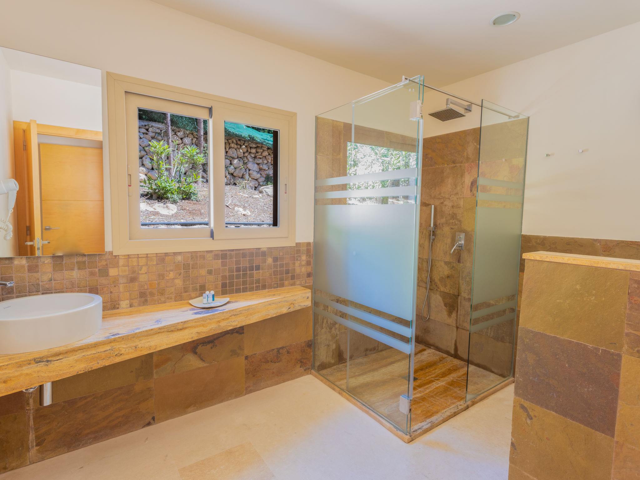 "Villa Maitreya", 7-room villa 470 m2 on 2 levels. Object suitable for 12 adults. Comfortable and cosy furnishings: open large living/dining room with open-hearth fireplace (only for decoration), dining table, satellite TV, digital TV, international TV channels and flat screen. Exit to the patio, to the swimming pool. 1 large double bedroom with 2 beds (90 cm, length 200 cm), hydro massage shower, TV and air conditioning. Exit to the patio, to the swimming pool. 1 large double bedroom with 2 beds (90 cm, length 200 cm), shower/WC and air conditioning. Exit to the patio, to the swimming pool. 1 large double bedroom with 1 french bed (180 cm, length 200 cm), bath/shower/WC, double hand-basin, hydro massage bath, TV, international TV channels, flat screen and air conditioning. Exit to the patio, to the swimming pool. Kitchen (oven, dishwasher, 4 induction hot plates, toaster, kettle, microwave, freezer, electric coffee machine). Upper floor: 1 large double bedroom 45 m2 with 1 french bed (180 cm, length 200 cm), bath/shower/WC, double hand-basin, hydro massage bath, TV, international TV channels, flat screen and air conditioning. Exit to the balcony, to the terrace. 1 large double bedroom with 1 french bed (180 cm, length 200 cm), bath/WC, double hand-basin, hydro massage bath and air conditioning. Exit to the balcony, to the terrace. 1 double bedroom 25 m2 with 1 french bed (160 cm, length 200 cm), bath/WC, hydro massage bath and air conditioning. Patio. Terrace furniture, balcony furniture, barbecue, deck chairs (12), covered balcony, sitting area. Very beautiful view of the sea, the swimming pool, the garden, the countryside and the resort. Facilities: washing machine, dryer, iron, children's high chair, baby cot for up to 2 year olds, hair dryer. Internet (WiFi, free). Please note: suitable for families. Fire extinguisher. VT357ME // Reg. Nr.: ESFCTU000007013000453182000000000000000000000VT357ME5