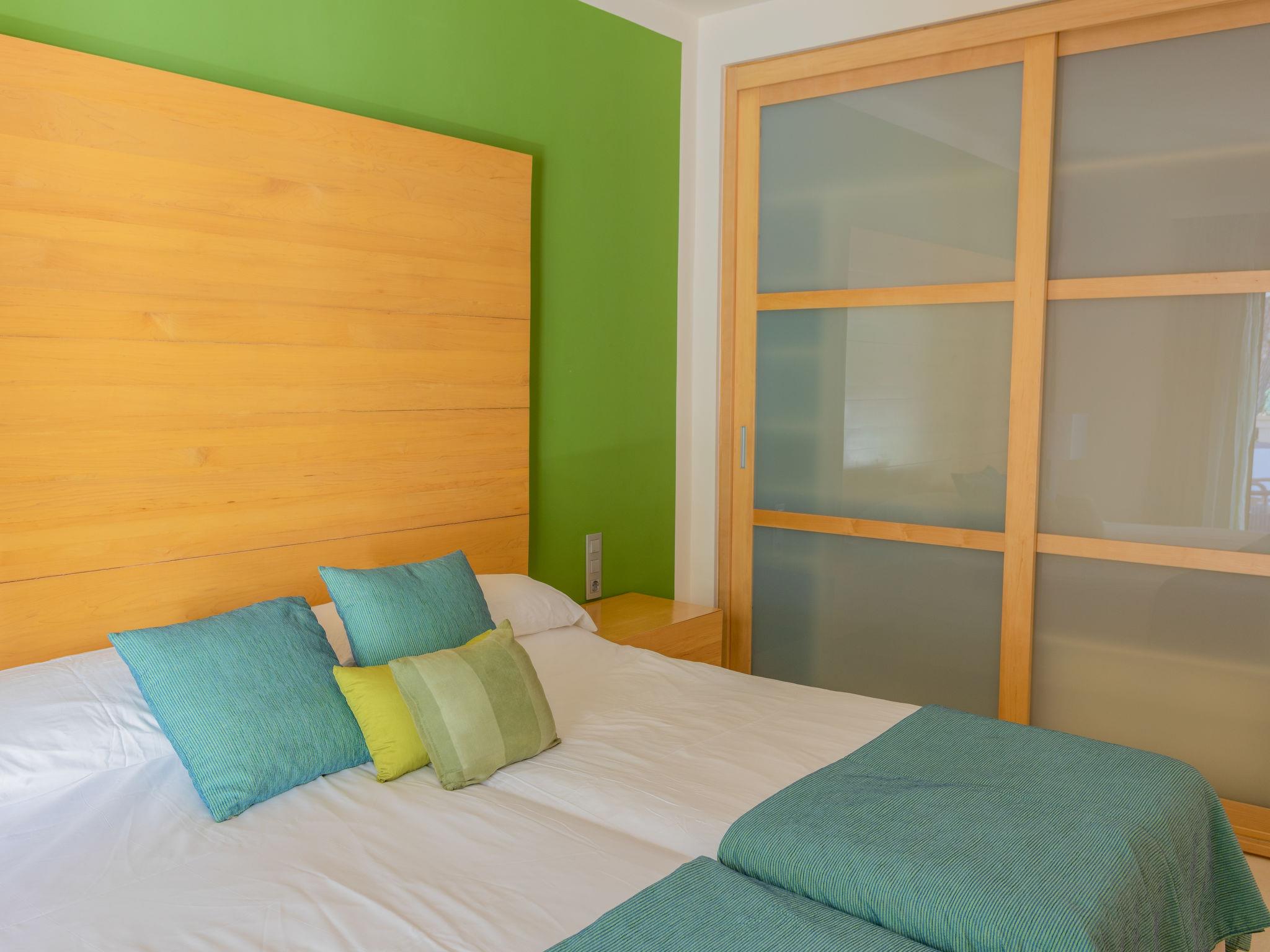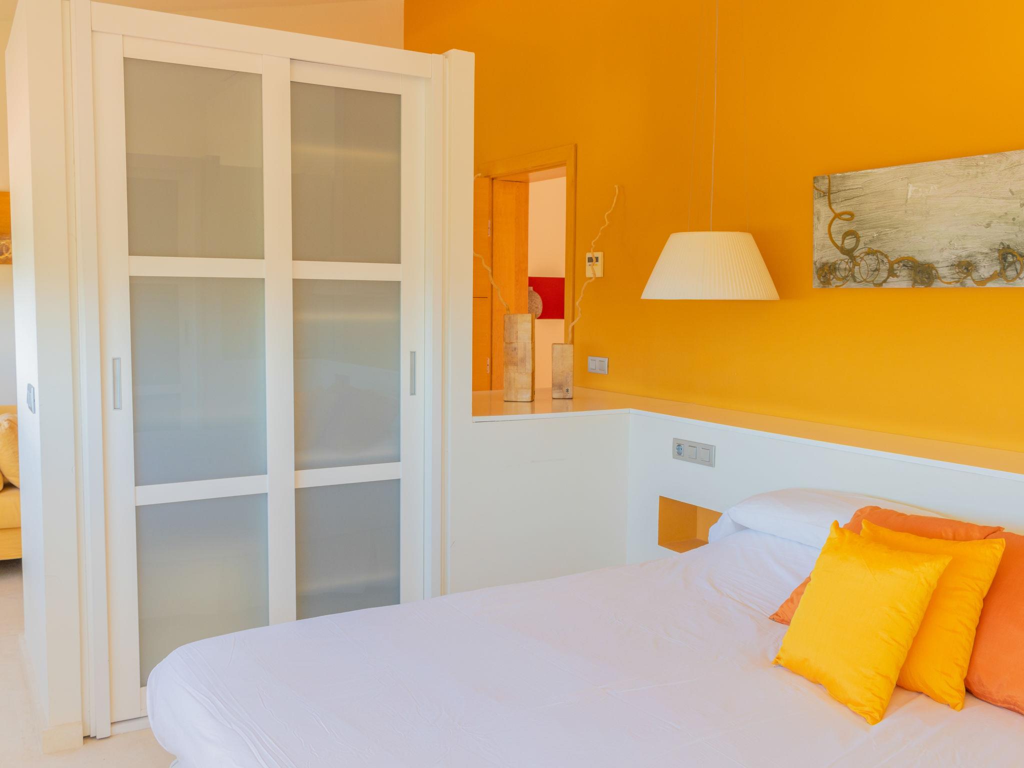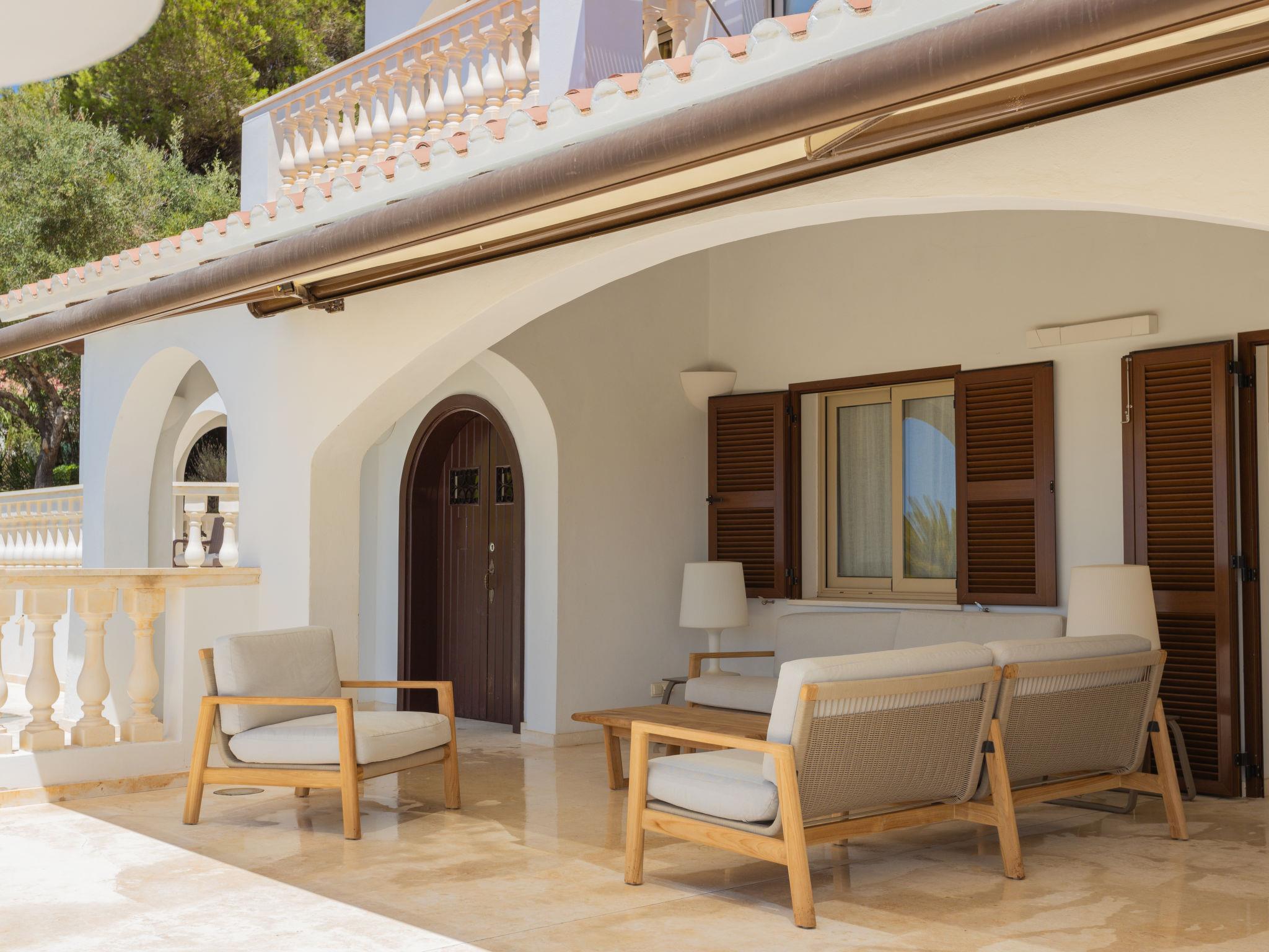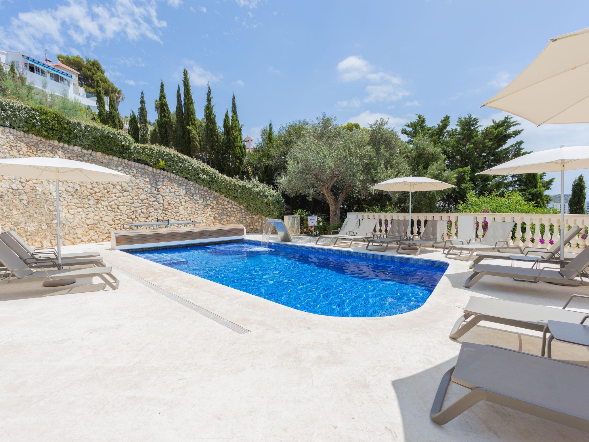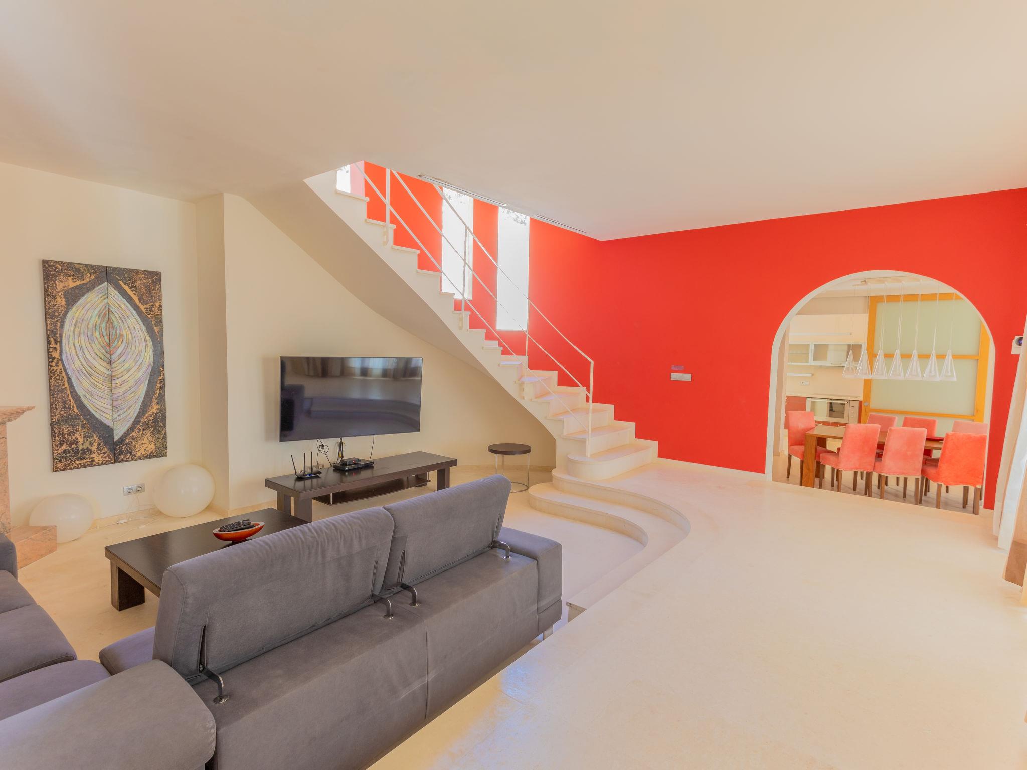Son Bou: Beautiful, cosy, comfortable villa "Villa Maitreya", 2 storeys. In the centre of San Jaime, in an elevated position residential area (villas), 500 m from the sea, 500 m from the beach. Private: beautiful garden to relax, swimming pool angular (10 x 6 m, depth 150 cm, seasonal availability: 01.May. - 31.Oct.). Outdoor shower, patio, arbour, pergola, garden furniture, barbecue. In the house: internet access, WiFi, hot tub, air conditioning, burglar alarm system, washing machine, tumble dryer. Public parking on the road. Shop, grocery, supermarket, restaurant, bar, café 600 m, bus stop "Carrer del Prat" 400 m, sandy beach "Son Bou" 500 m. Please note: car recommended. Baby equipment on request (included). Object suitable for 12 adults. The owner does not accept any youth groups. Airfield 20 km from the property.