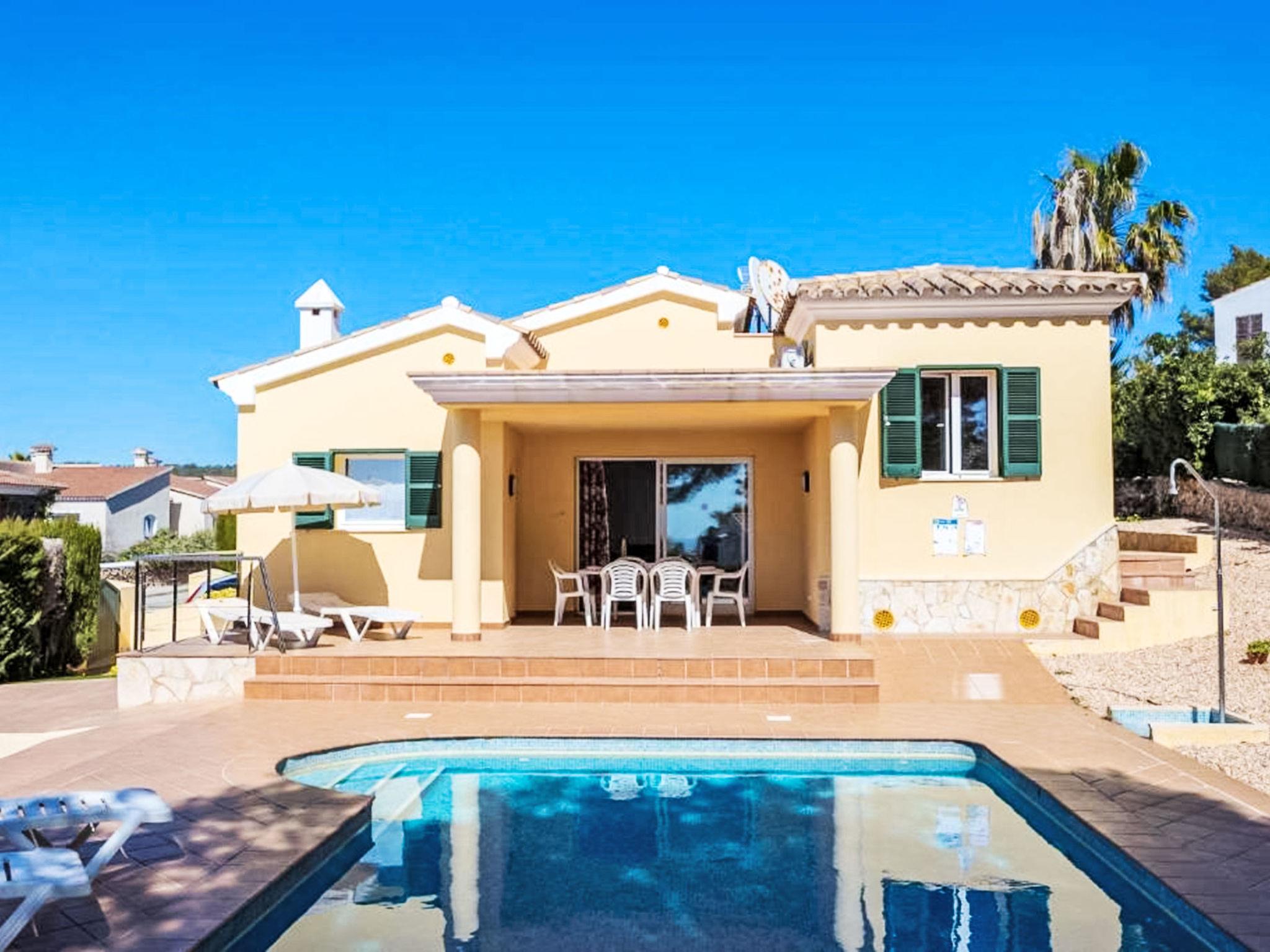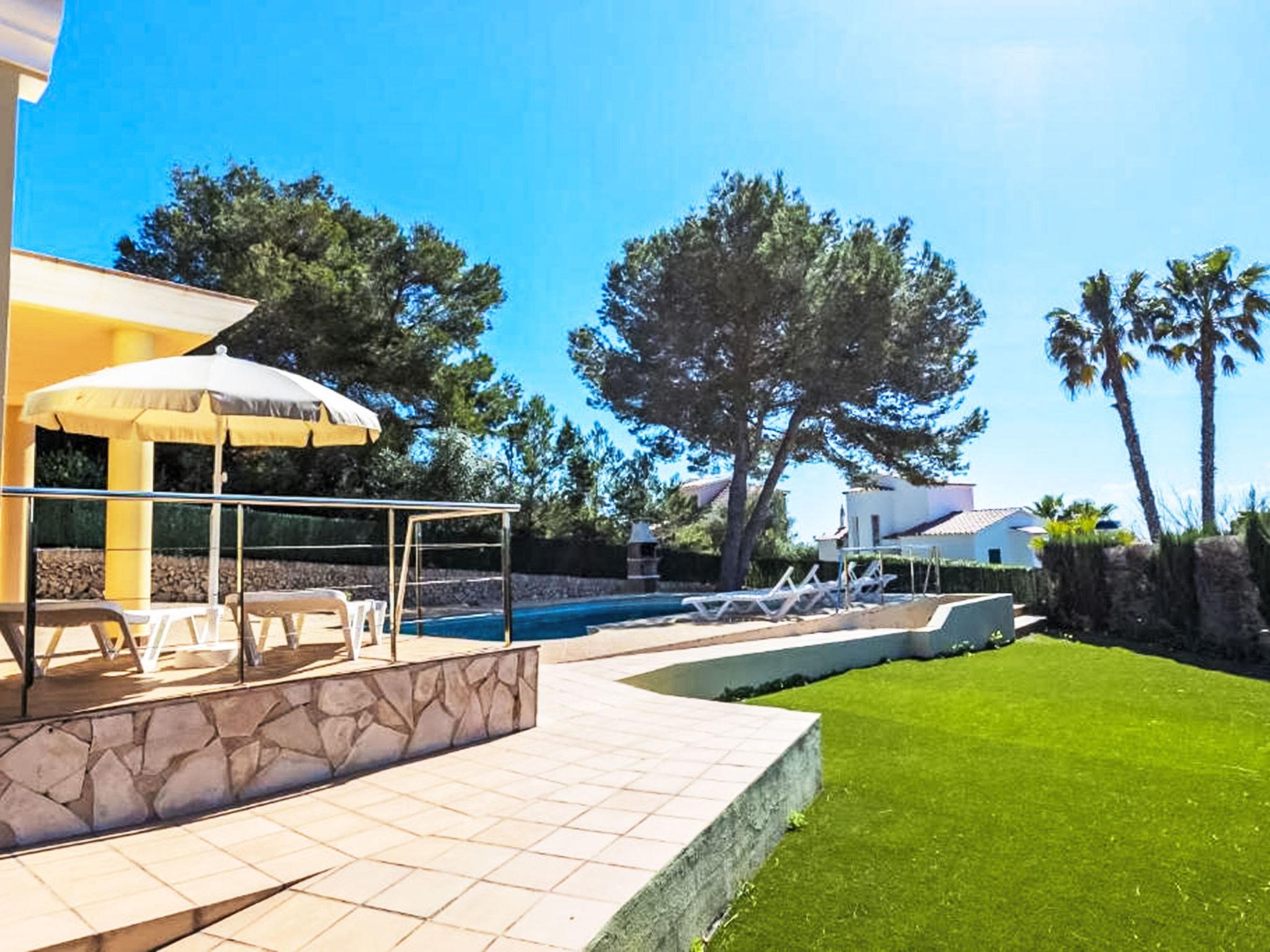 Son Bou: Large, cosy, comfortable villa "Llebeig 155", built in 2002. Residential area (villas), 1 km from the sea, 1 km from the beach. Private: beautiful garden to relax, swimming pool angular (4 x 6 m, depth 100 - 200 cm, seasonal availability: 01.Mar. - 31.Oct.). Outdoor shower, patio, pergola, garden furniture, barbecue. In the house: internet access, WiFi, air conditioning, washing machine. Public parking on the road. Bus stop 1.5 km, sandy beach "Son Bou" 1 km. Please note: car recommended. Baby equipment on request (included). Object suitable for 6 adults. The owner does not accept any youth groups. Loading and unloading of baggage is possible at the holiday house. Airfield 21 km from the property.