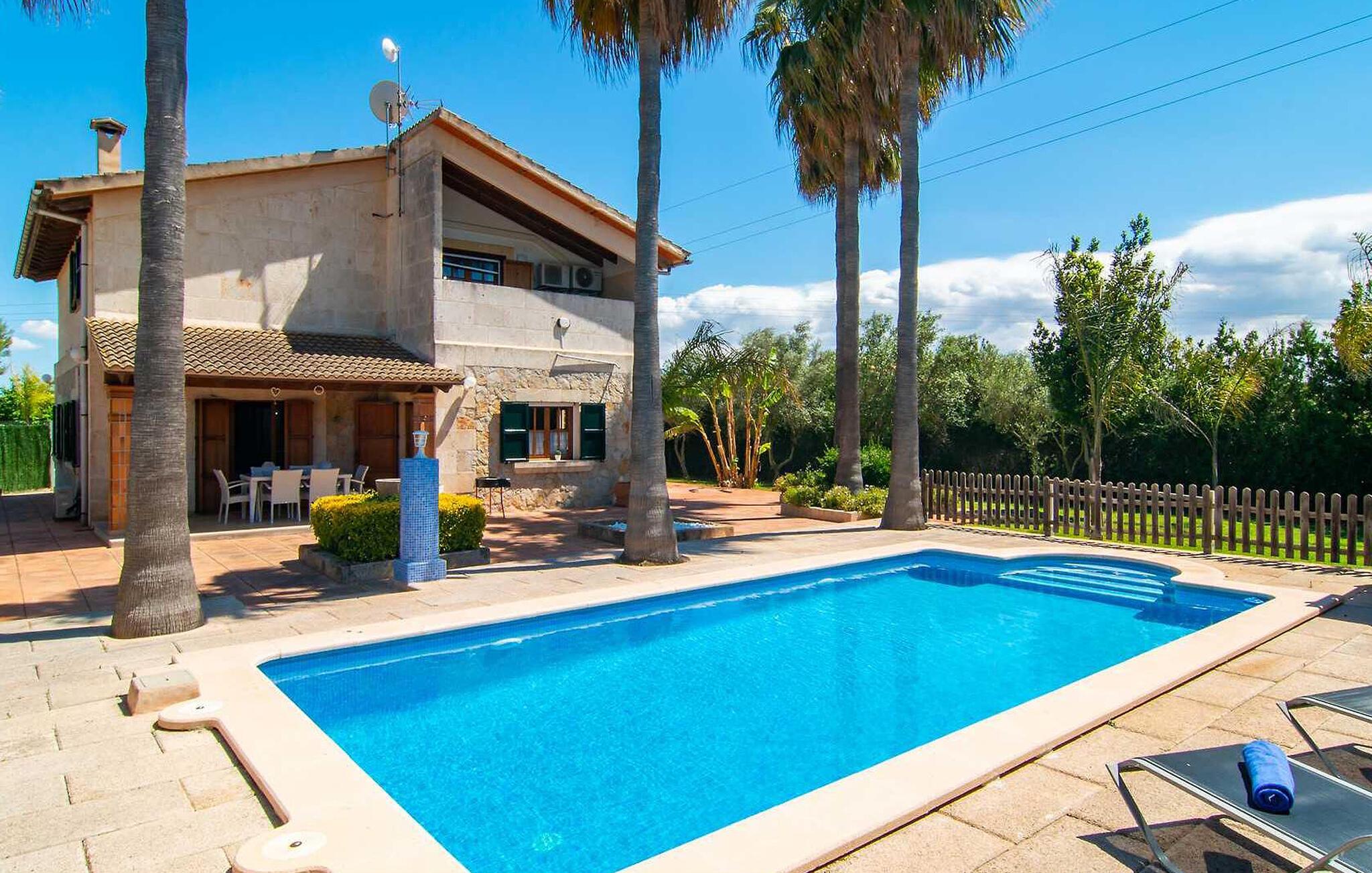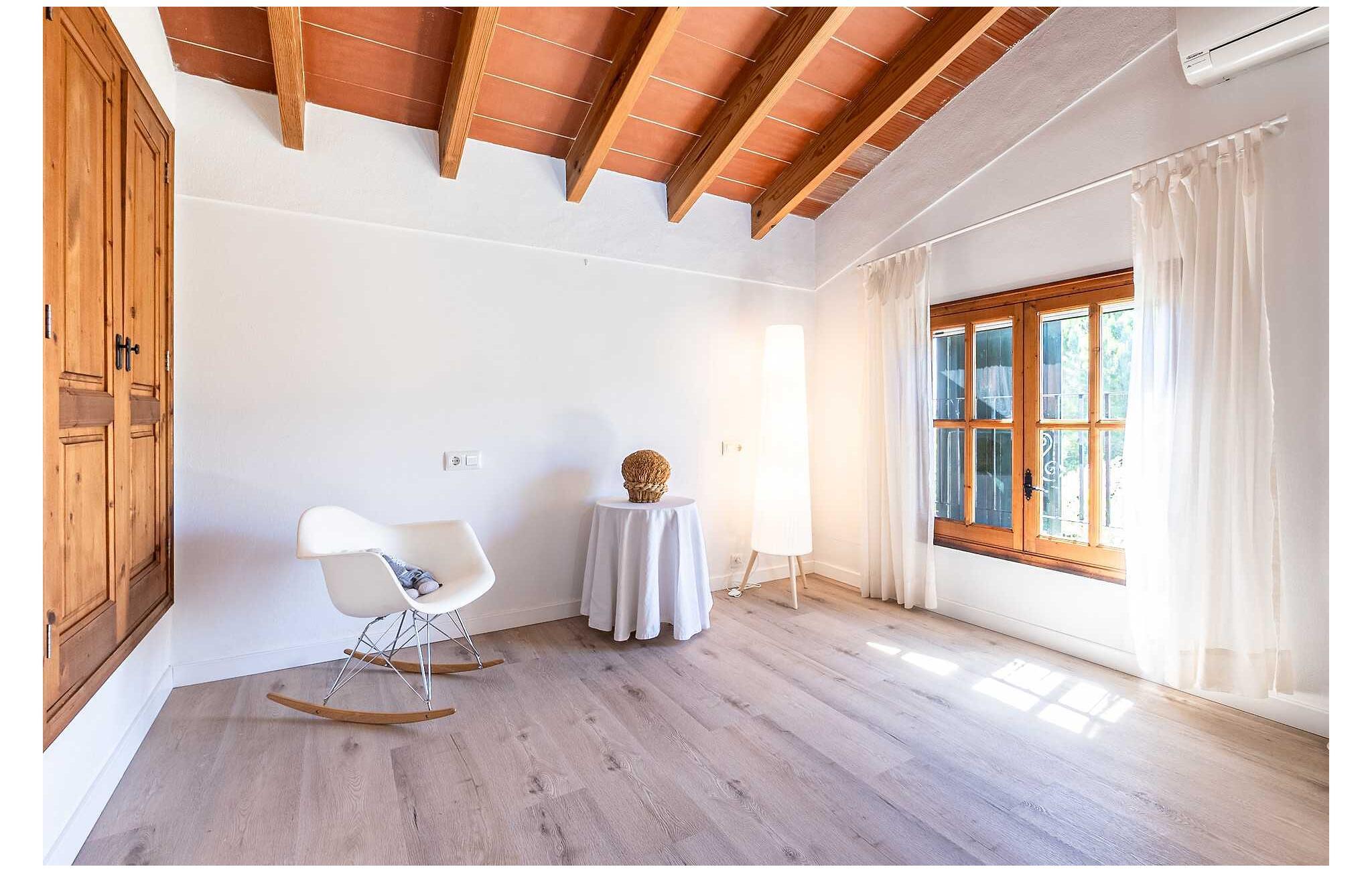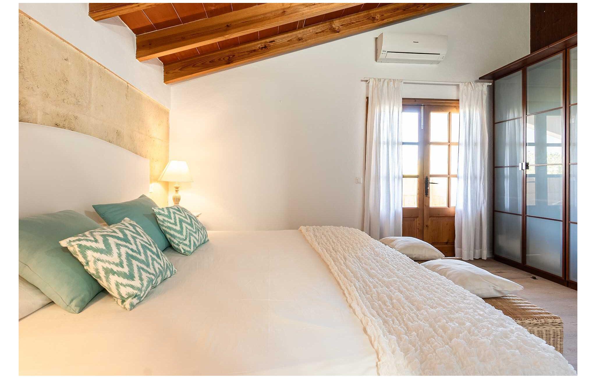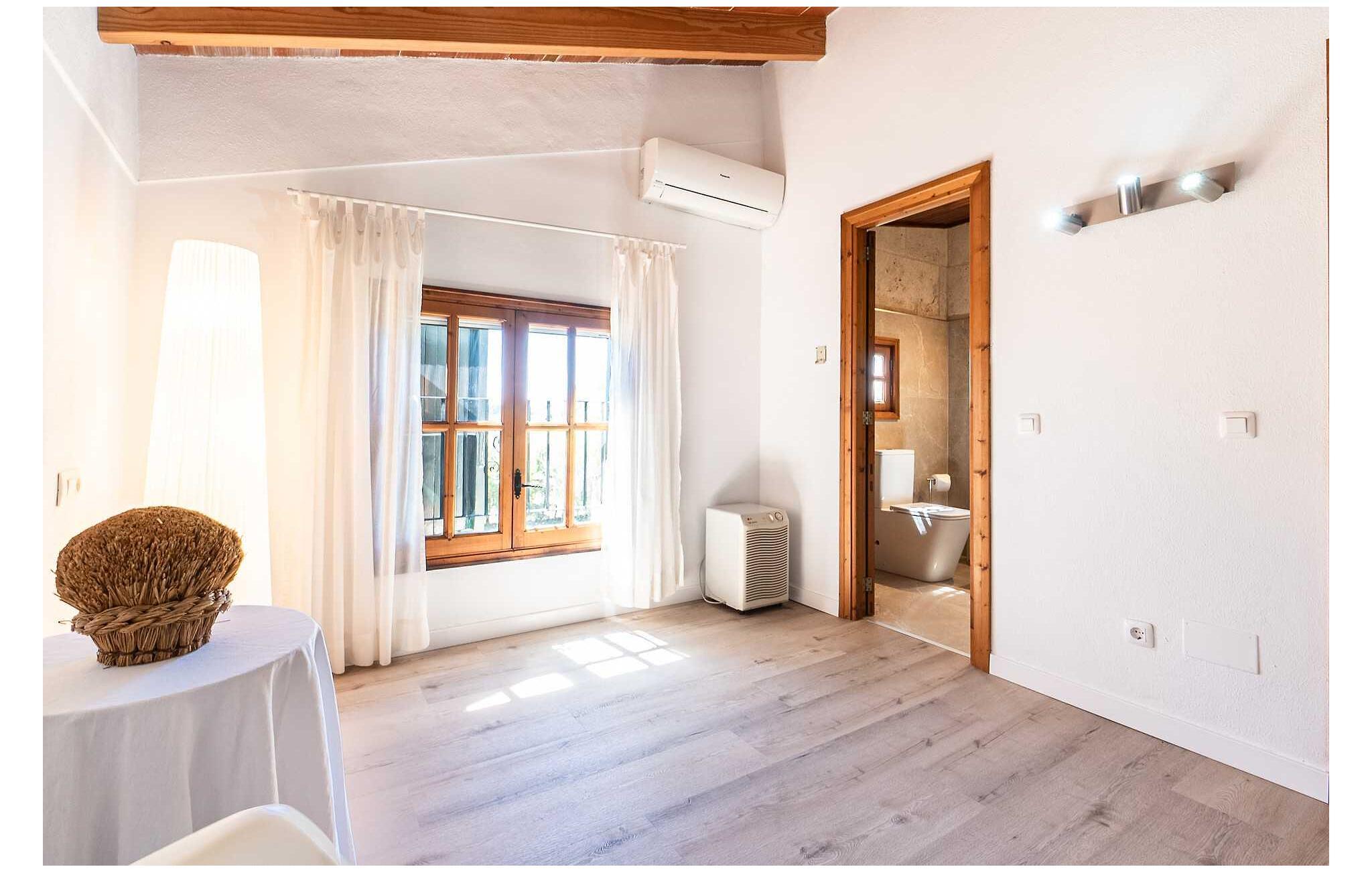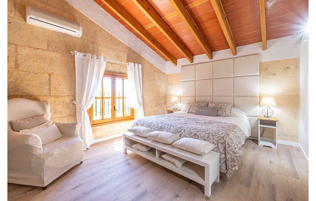 Feriehuset "Son Claret" er en grøn oase på fladt landbrugsområde nær Muro, kun 10 minutter fra sandstranden i Alcúdia-bugten. Ejendommen er helt privat og omgivet af hække og hegn. Poolterrassen har en let skrånende pool med trappeadgang, liggestole og en hyggelig dagseng med høje palmer, der giver skygge. I tilknytning til huset er en skyggefuld spiseplads under en overdækket terrasse med udsigt over poolen. Renoveret i 2024, interiøret omfatter lyse, smagfuldt indrettede værelser. Den åbne planløsning giver nem adgang til terrassen og poolen gennem en glasskydedør. Det rummelige køkken med integreret spiseplads er udstyret med moderne hårde hvidevarer og har egen udgang til det fri. Et badeværelse med bruser fuldender stueetagen. Der er tre komfortable dobbeltværelser på øverste etage; to har ensuite badeværelser og en har en privat balkon. Huset har aircondition og skodder til perfekt mørke. Beliggende omkring 3 km fra Muro og 8 km fra Can Picafort, er "Son Claret" ideel til fjernarbejde, med stabilt internet og god mobilmodtagelse. Den lange sandstrand i Alcúdia-bugten ligger mindre end 10 minutter væk i bil.