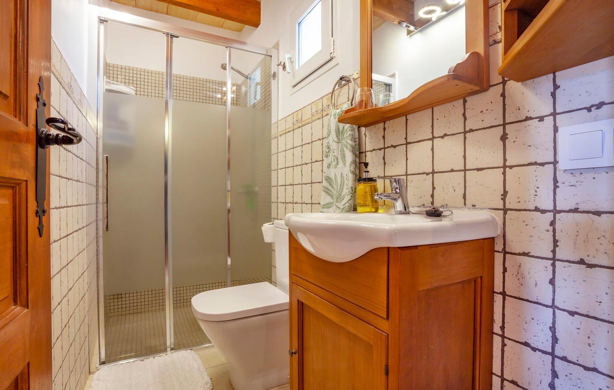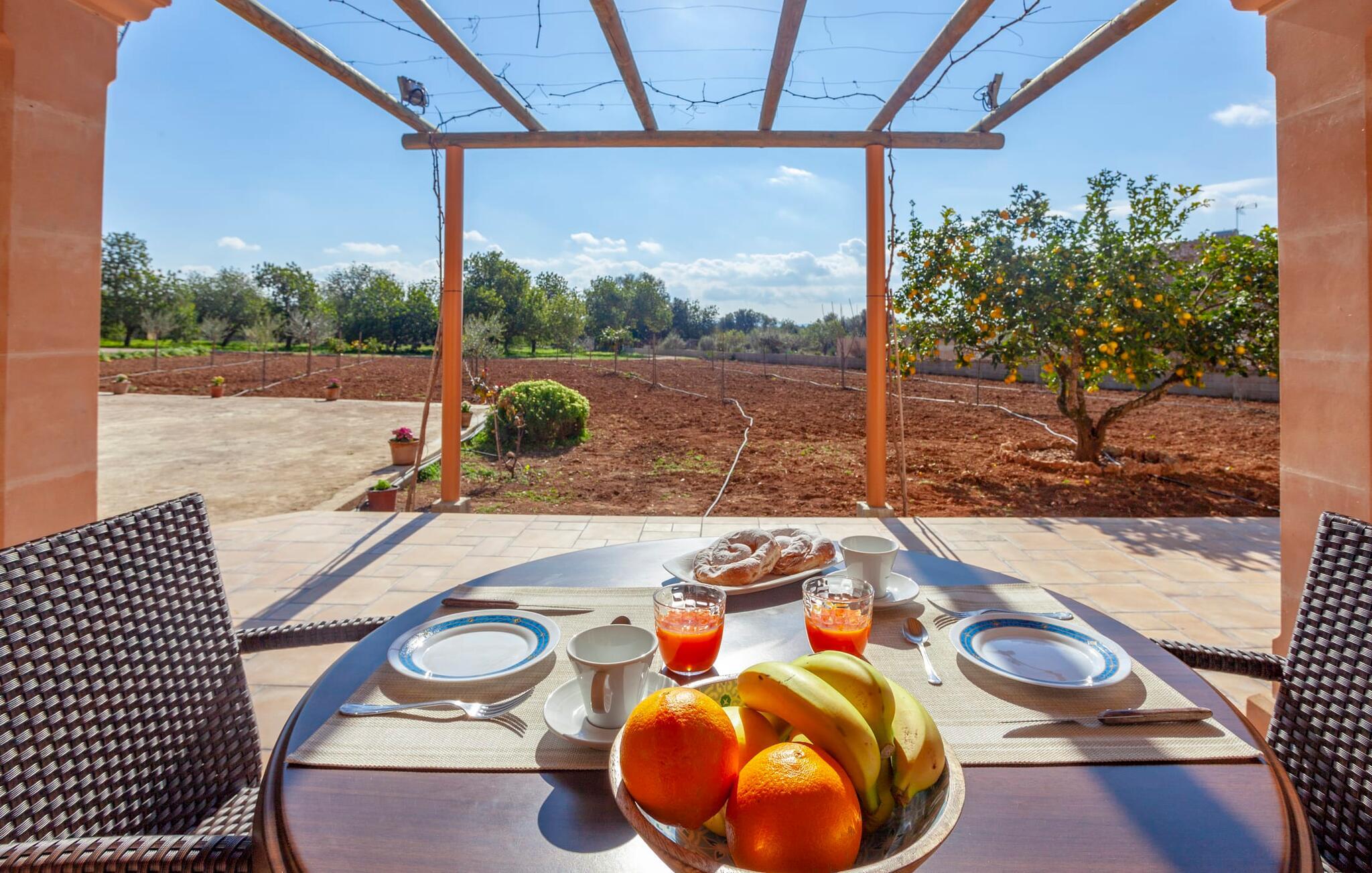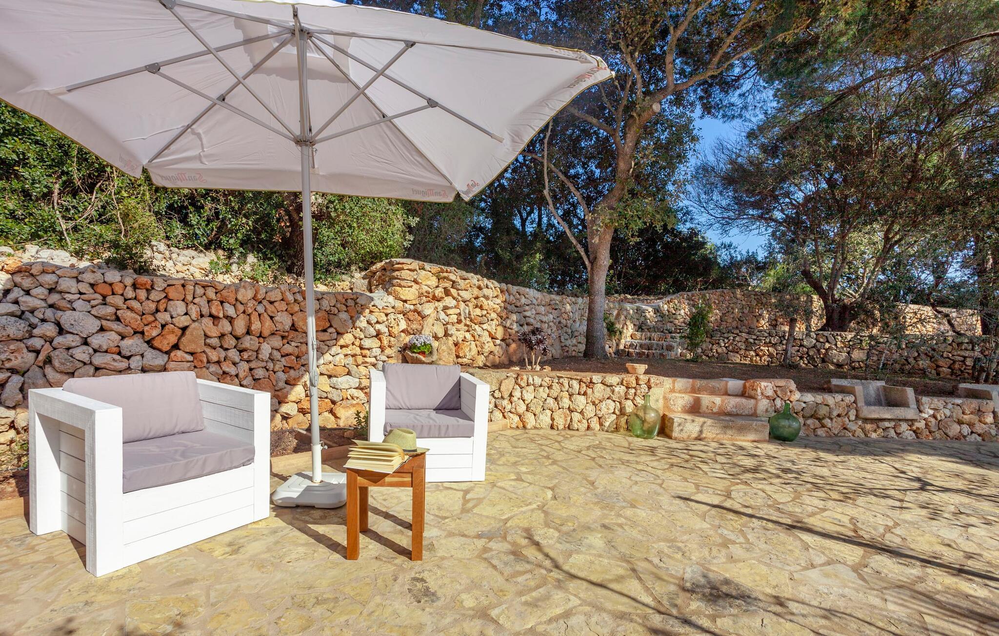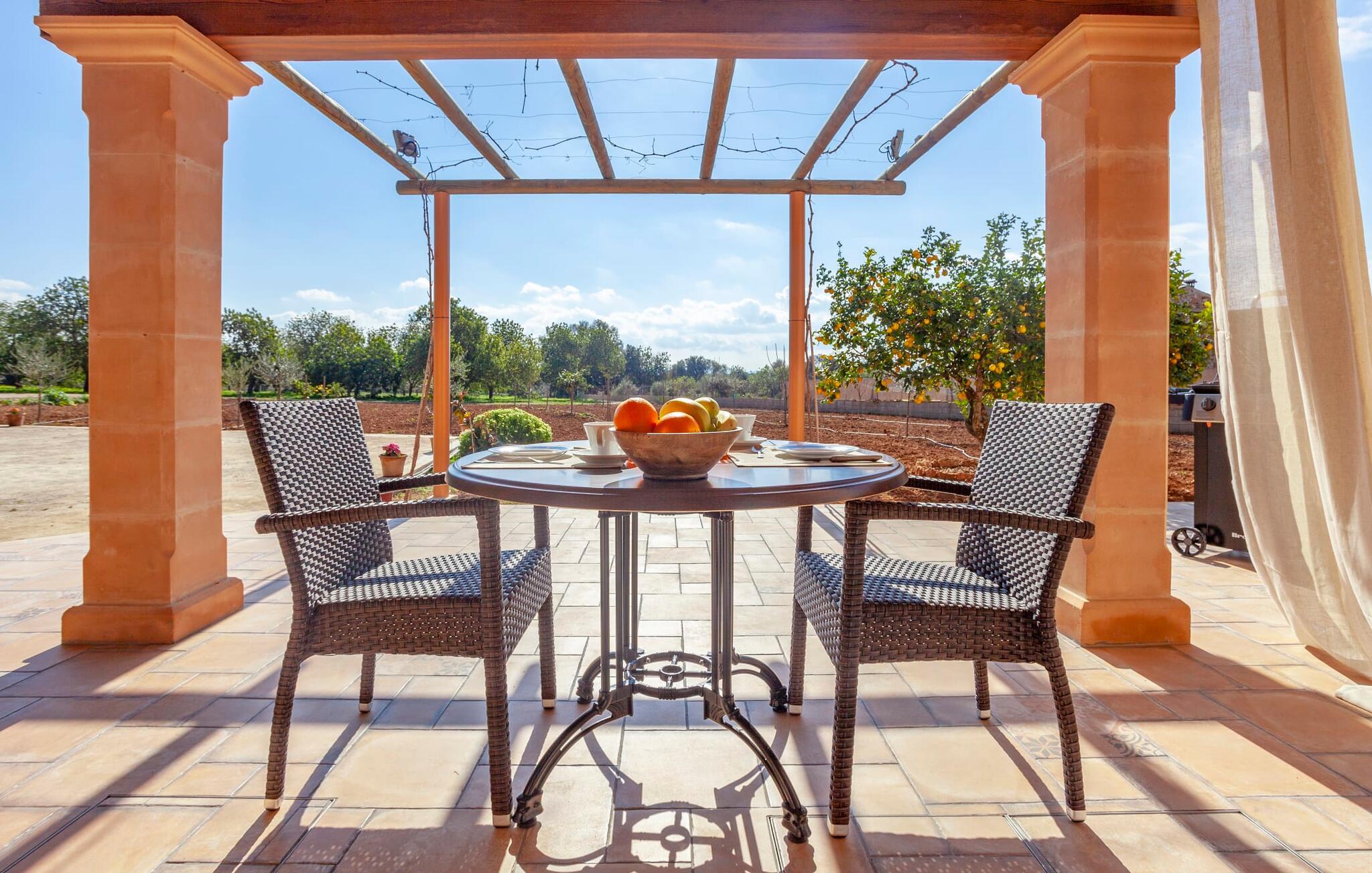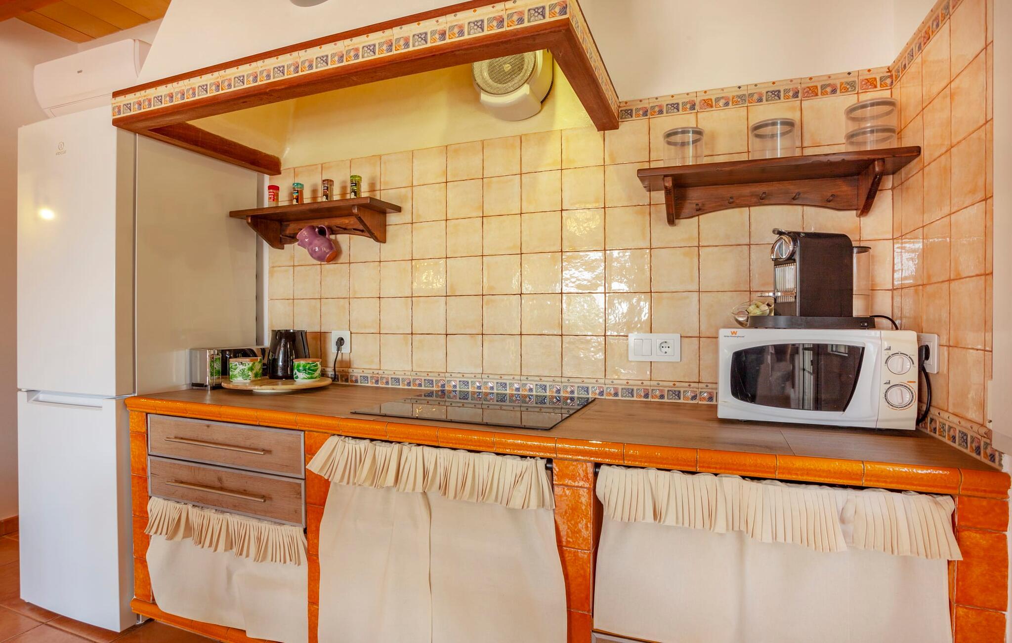 Et hus for to - i en rolig beliggenhed, med en pool (åben fra marts til november) og flair og plads... det er ikke nemt at finde! Især små villaer er en sjældenhed på øen og er samtidig meget populære blandt enlige rejsende og par. Den landlige beliggenhed giver mulighed for en befriende udsigt over det smukke flade til let kuperede område; Ejendommen på over 5.000 m² udstråler en vidunderlig følelse af fred og privatliv. Alt dette kan nydes på de skønne terrasser på flere sider af huset – eller på altanen på øverste etage, som byder på en udsigt, der rækker endnu længere ind i de maleriske omgivelser. Når vejret er godt, kan I gå en tur ad den smukke stensti til poolområdet, som ligger lidt længere fra huset og har en helt unik, idyllisk atmosfære. Omgivet af gamle træer og en asfalteret græsplæne, venter et helt specielt sted at slappe af på jer - glem ikke at tage jeres yndlingsdrink med! I kan køle ned, som I vil, eller vælge noget fysisk aktivitet. Ingen vil spørge her; I alene sætter tonen for jeres personlige feriemelodi. En glasdør fører fra terrassen ind i villaens indre med 45 m² boligareal. I træder først ind i den hyggelige lyse stue og spisestue, som er gjort endnu mere hyggelig ved pejsen og det praktiske tekøkken. Den udfoldelige sofa i naturfarvet stof matcher resten af opholdsstuen med sine terracotta-fliser og synlige træbjælker. Den anden del af køkkenet - vask, opbevaringsplads - er lige om hjørnet, så man nemt kan dele opgaverne op uden at komme i vejen for hinanden. Et badeværelse med bruser på den anden side af gangen fuldender denne etage - og en etage deroppe er der en anden, som også rummer soveværelset med udgang til det fri og altan. Efter I har sovet her, kan I om morgenen se ud over det store landskab – som om I stadig drømmer. I dette venlige og velholdte feriehus er I som par sikre på at finde den fred og ro I har brug for og tid sammen væk fra hverdagens stress. Hvis I ønsker at forlade jeres oase for en kort tid, er der meget at opdage i det omkringliggende område. Den lille, lidt søvnige by Porreres byder på en oplevelse hver tirsdag: halvdelen af landsbyen går til det ugentlige marked. Udover frugt og grønt kan I også finde husholdningsartikler, tøj og sko der. Boderne er spredt ud over hovedtorvet og de mindre gader. Klippeslottet Castell de Santueri og klosteret San Salvador ligger i nærheden af Felanitx og vil hver især belønne jer for jeres indsats med en fantastisk udsigt. Syd- og østkystens strande kan nemt nås med en lejebil - vi anbefaler en model, der er velegnet til landeveje på grund af adgangsvejen - til afslappede, afslappede dage på stranden. Den originale to-personers villa "Son Coix Nou" ligger på en rummelig grund i en afsondret landlig beliggenhed nær Porreres (ca. 5 km), hvor I kan gøre jeres daglige indkøb. Stedet er lidt væk fra hovedvejen mellem Llucmajor og Felanitx. I kan for eksempel tilbringe en smuk dag på kysten i havnebyen Colonia de Sant Jordi. De nærmeste strande som Cala Murada eller Cala Tropicana ligger ca. 24 km væk.