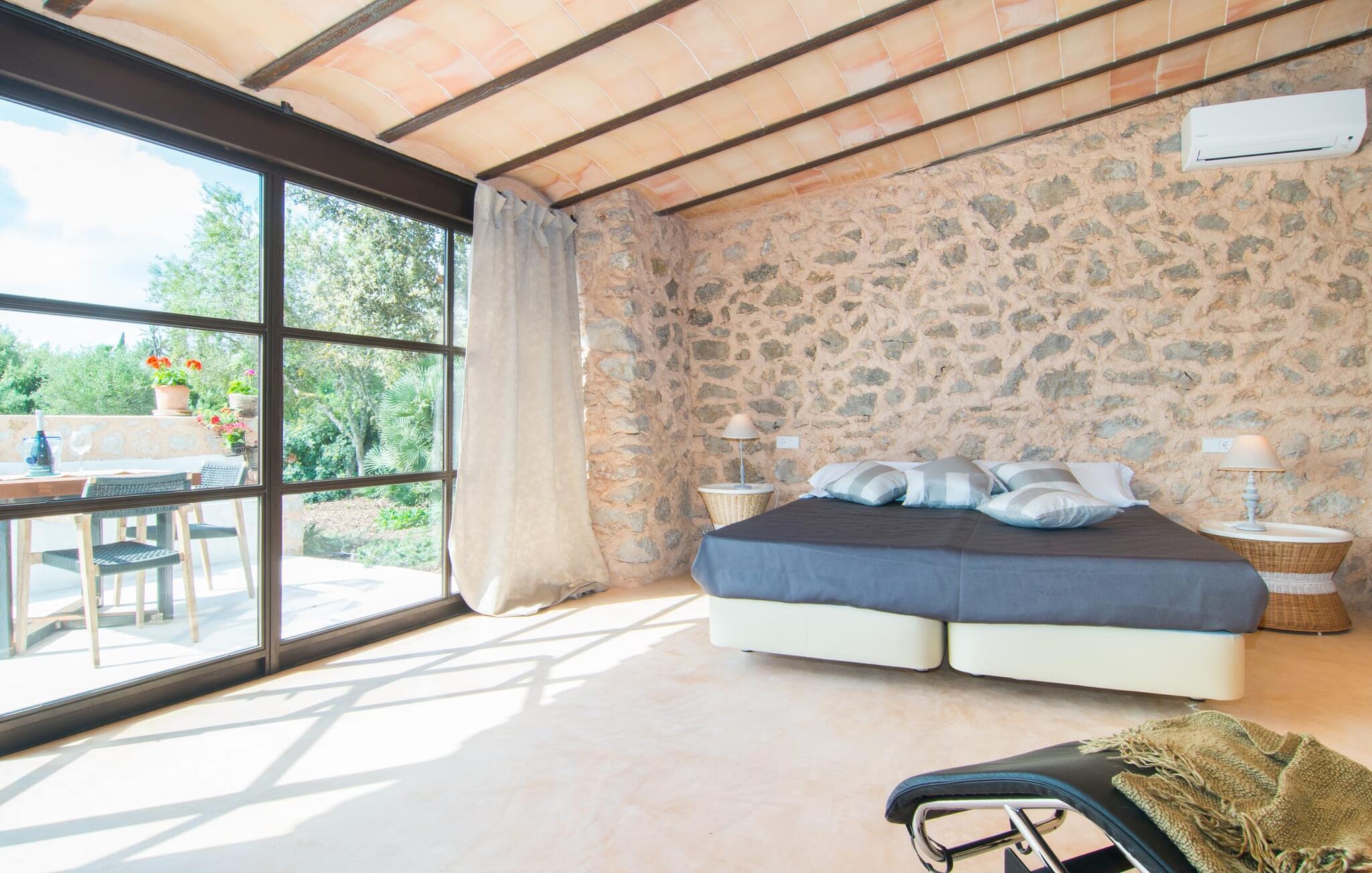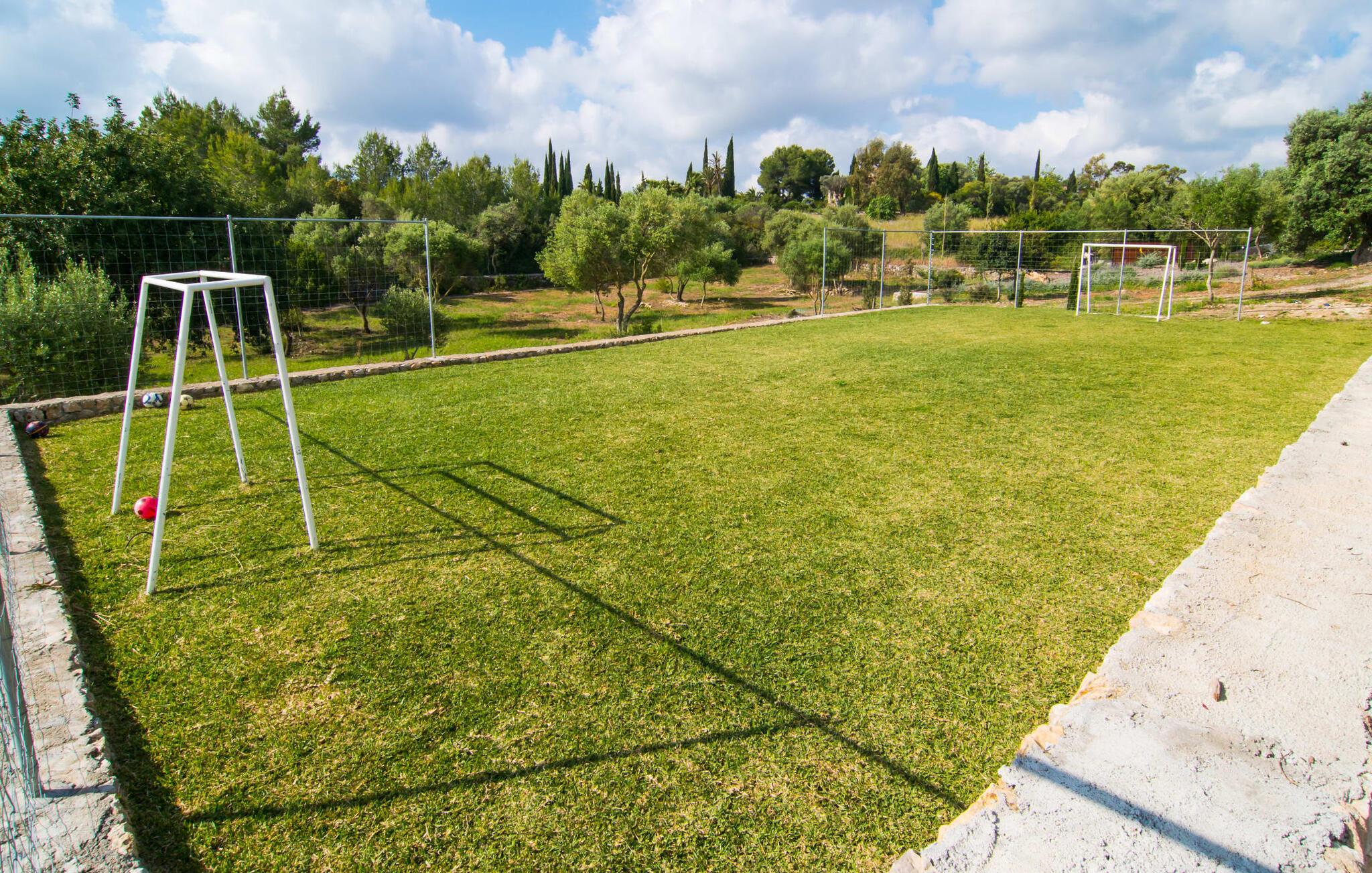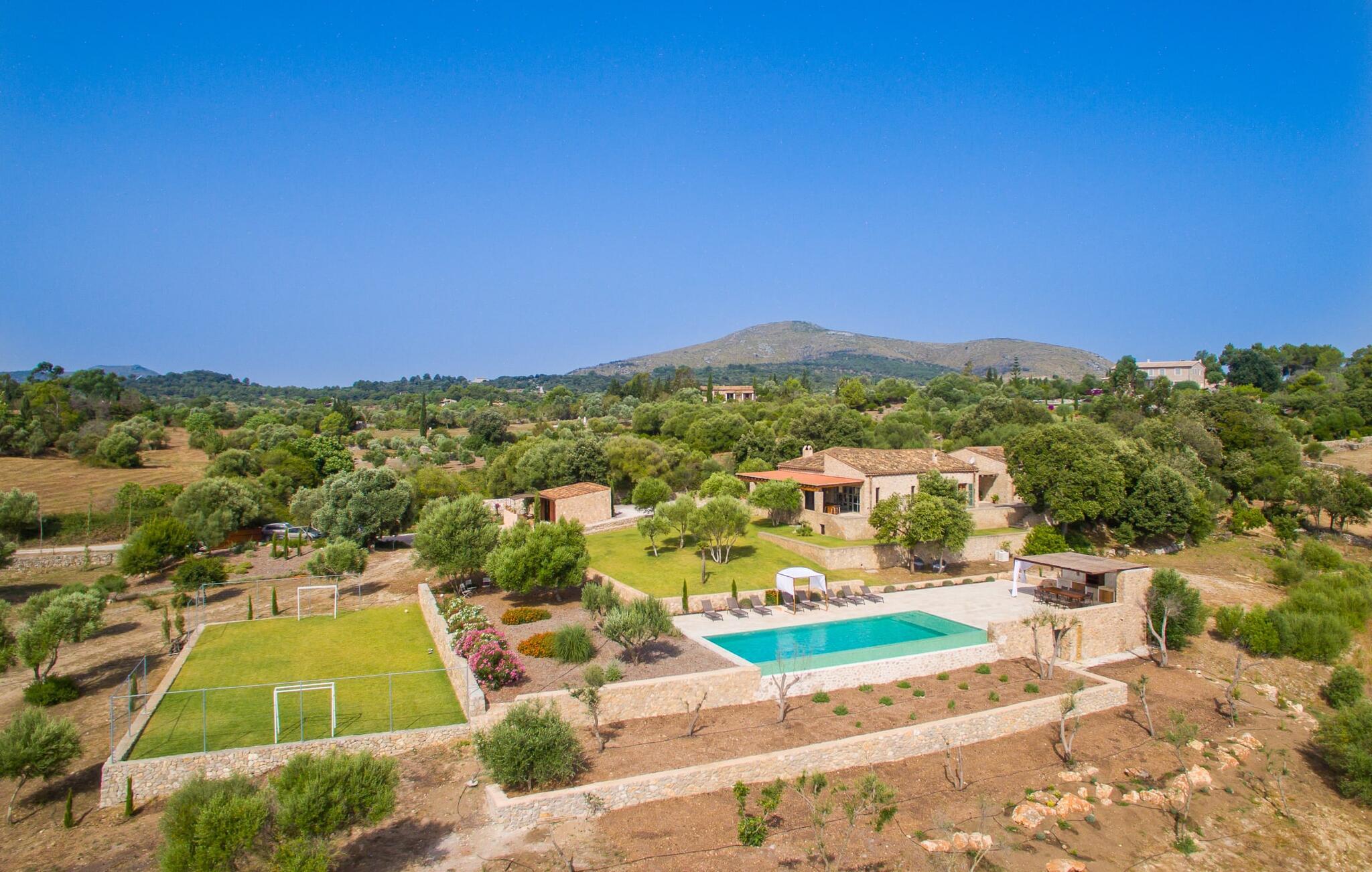 Eksklusiviteten af denne villas beliggenhed er tydelig ved første øjekast: Appelsin- og oliventræslunde, mandeltræer og duftende blomstrende planter præger denne rolige region lige vest for Artà, hvor den smukke villaejendom "Son Cullera" ligger. Idyllisk landskab, ren natur, absolut fred, en fabelagtig panoramaudsigt, alt i moderne stil og kærligt og med meget god smag, en fantastisk infinity pool, fantastisk udendørs siddepladser og endda en fodboldbane med ægte græs - det er alle funktioner, der gør dette Udpeg ejendommen som en premium ejendom. Lad os se på detaljerne sammen. Villaen, der er bygget for et par år siden, ligger på en svag skråning og har derfor en slags rækkehushave. På det nederste niveau er den enorme 15m pool. Poolen, dækket med turkise mosaikfliser, er designet i en uendelig stil, hvilket betyder, at den i den "lange" ende ser ud til at flyde ind i det vidunderlige landskab og de bølgende bakker i horisonten, hvilket giver en virkelig eventyrlig baggrund. I kan også nyde dette panorama fra en af liggestolene på solterrassen. I den "korte" ende af poolen er der en overdækket siddeplads med stort bord og masser af stole samt en slags sommerkøkken, der også kan bruges skønt som poolbar. Huset nås ved at gå fra poolområdet hen over de frodige græsplæner og haven. Der er en overdækket terrasse direkte foran stue og spisestue. Her er god plads til et hyggeligt opholdsområde med to knaldblå træbænke i vintagestil mellem store plantekasser med duftende blomster og et langt spisebord foran en glasvæg med sprøjter. Bag vinduesskydefronten er der en spisestue med et flot, overdimensioneret, rustikt træbord, der kan rumme op til ti personer. Fra dette værelse er der adgang til både køkken og stue, et stort lyst værelse med hyggelig pejs. Som alle rum skinner den med sine hvide vægge og et let, specialforarbejdet betongulv. Et stort sofaområde, blot nogle få møbler med en fantastisk retro karakter, men placeret så meget desto mere effektivt, samt moderne kunst sætter scenen for dette rum og formår samtidig at gøre det behageligt. Køkkenet ser ud som om det kom ud af et indretningsmagasin - et rigtigt drømmekøkken, ikke kun for amatørkokke. Den centrale ø i rustfrit stål med integrerede siddepladser er et rigtigt blikfang. Køkkenskabene er lavet af ægte træ af høj kvalitet, hvilket skaber en meget effektiv, ultramoderne blanding. Her finder I naturligvis al den tekniske komfort, I har brug for til en ferie med selvforplejning. I venstre halvdel af huset fører en korridor til tre dobbeltværelser med eget badeværelse, hvoraf de fleste har direkte adgang til det fri. Alle badeværelser har en klar designlinje med trendy brusekabiner. Det store soveværelse med eget badeværelse har et ekstra badekar og et separat påklædningsområde. Landligt-landligt: fred, privatliv og masser af natur præger regionens karakter. Den middelalderlige by Artà ligger kun omkring 4 km væk. Gå en tur gennem det ugentlige marked i gågaden og nyd travlheden ved Placa del Conqueridor. Trænger I til en pause fra shopping i de smukke butikker, kan I stoppe ved en af de mange caféer og gode restauranter. Hvis I kan lide at spille golf, bør I besøge den populære "Capdepera Golf" golfbane, hvis bakkede fairways er blevet integreret i det eksisterende landskab. Sandstrandene i Alcúdia-bugten kan nås lige så hurtigt og nemt som de afsondrede naturstrande, herunder Cala Varques. Vil I opleve lidt af travlheden, så tag til Cala Ratjada, hvor I finder nogle meget attraktive restauranter lige ved stranden og havnepromenaden. Vi hos Fincallorca ønsker jer et vidunderligt ophold i den stærkt anbefalede villa "Son Cullera". Den rummelige villaejendom "Son Cullera" er beliggende i en vidunderlig idyllisk, landlig og rolig beliggenhed midt i grønne bakker omkring middelalderbyen Artà. Til jeres indkøbsbehov er det kun 4 km fra Artà, som også kan kombineres med et besøg på det ugentlige marked omkring Placa del Conqueridor om tirsdagen. For en dag på stranden kan I vælge mellem smukke sandstrande som Sa Marjal eller endda bystrande som Colonia de Sant Pere, som ligger kun 20 minutter væk i bil.
